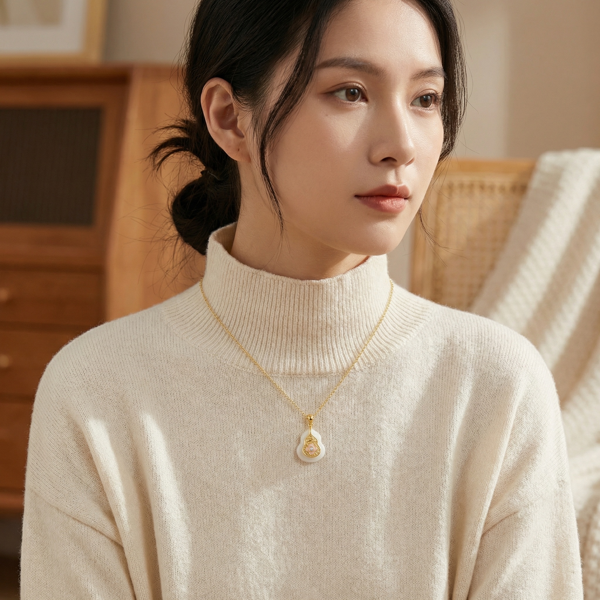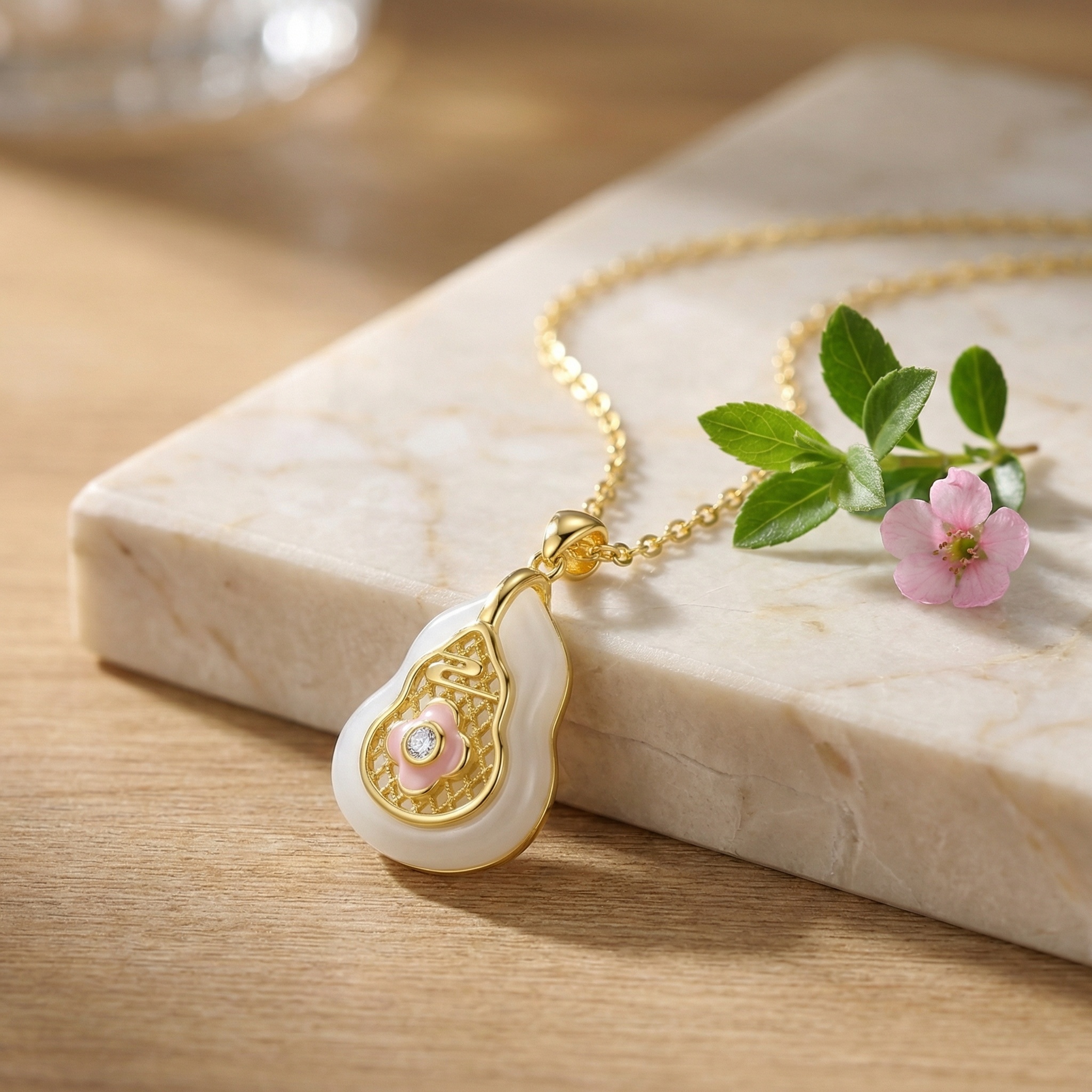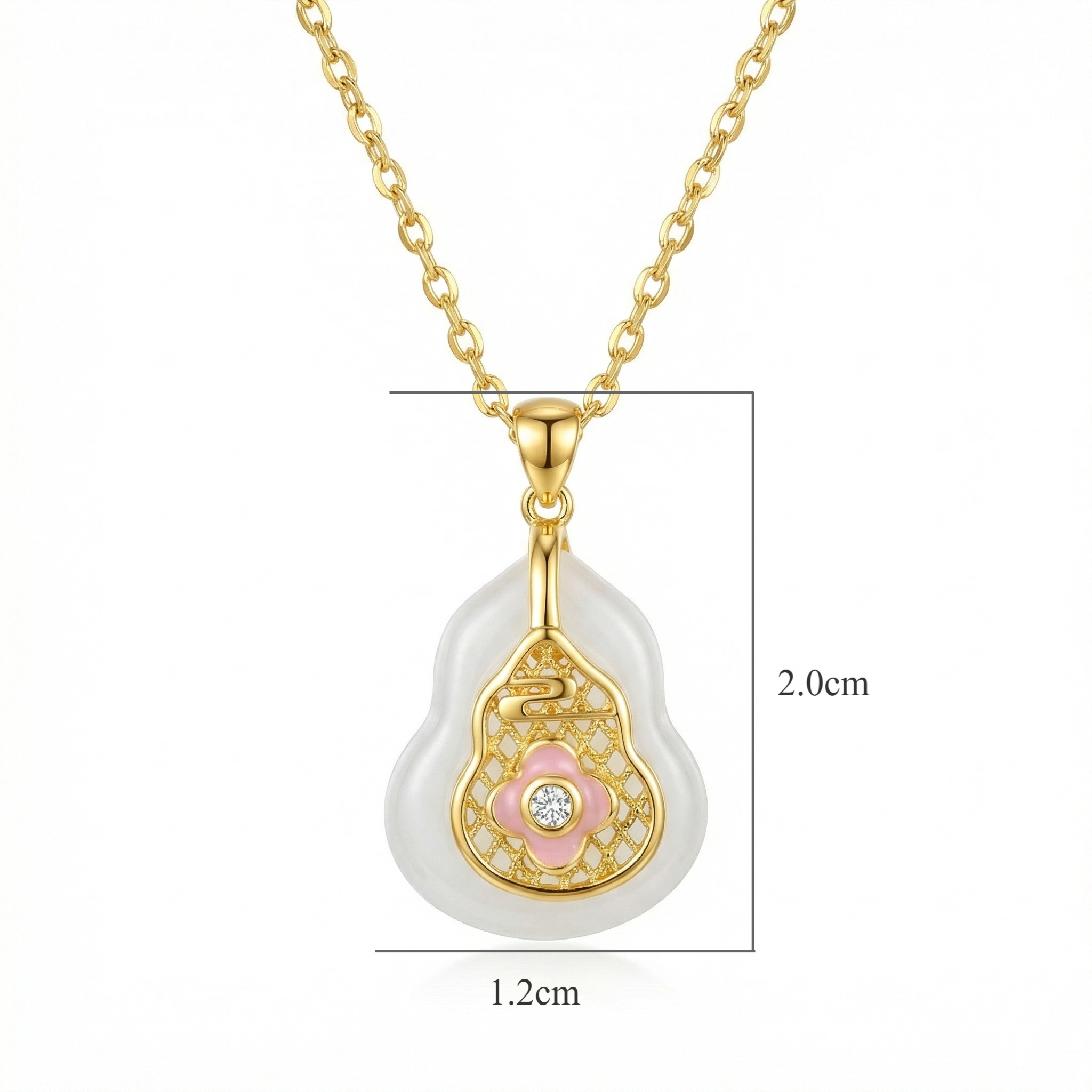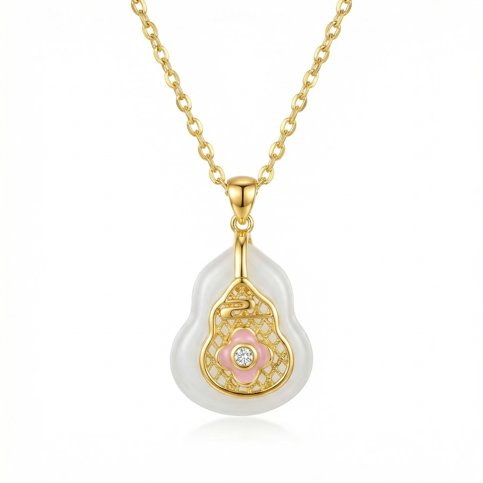 This exquisite necklace features a beautifully crafted gourd-shaped pendant, a traditional symbol of prosperity and longevity. The base is made of a smooth, translucent white stone that provides a serene backdrop for the intricate metallic filigree work on top. At the heart of the design lies a charming pink enamel flower, centered with a brilliant sparkling stone that catches the light beautifully. The delicate chain complements the pendant's sophisticated aesthetic, making it a perfect accessory for both daily wear and special occasions. This piece combines traditional cultural motifs with contemporary elegance, resulting in a timeless treasure that adds a touch of grace to any ensemble. Crafted with precision, the pendant's unique silhouette and vibrant accents create a captivating focal point that is sure to draw admiration. | Brand: jewelryodm