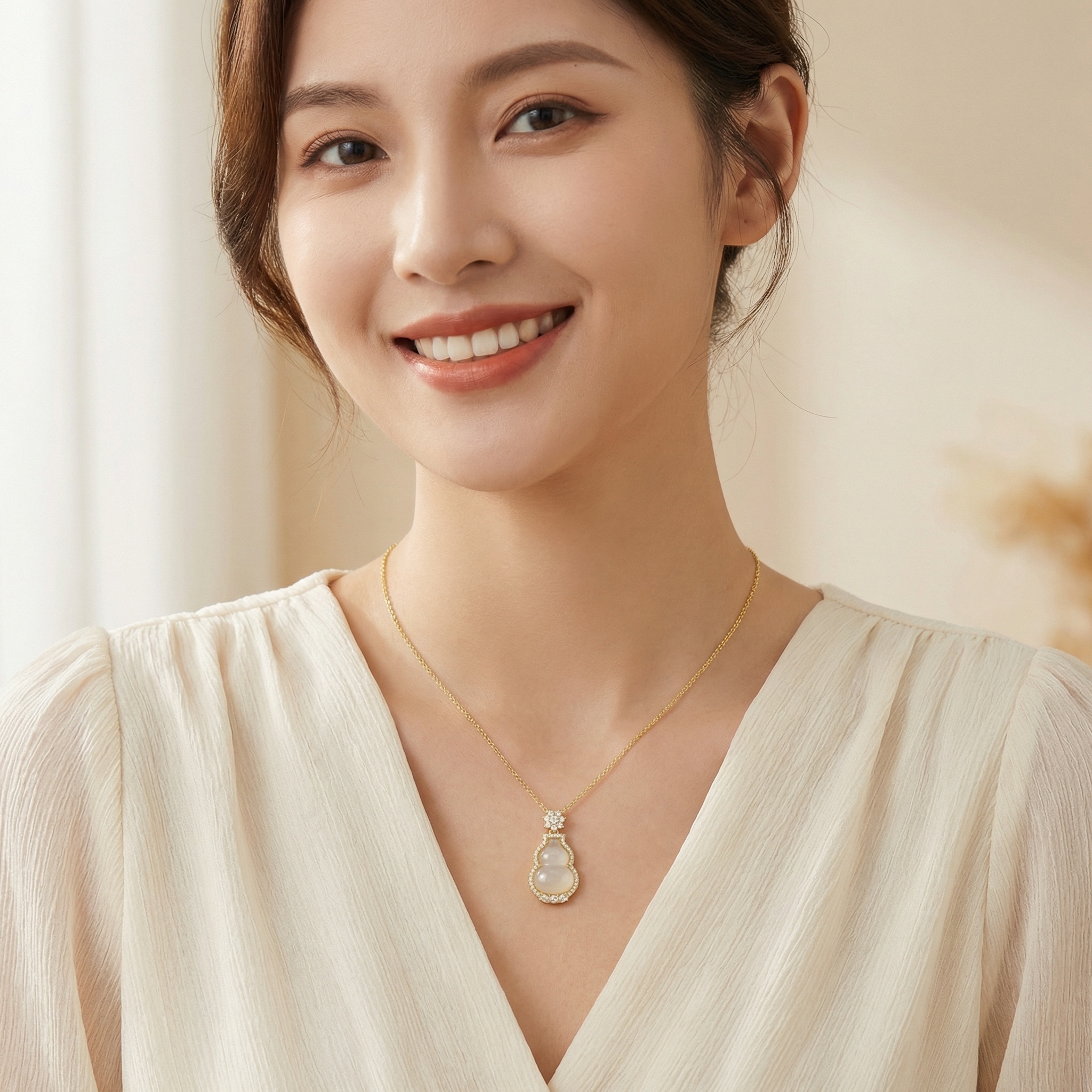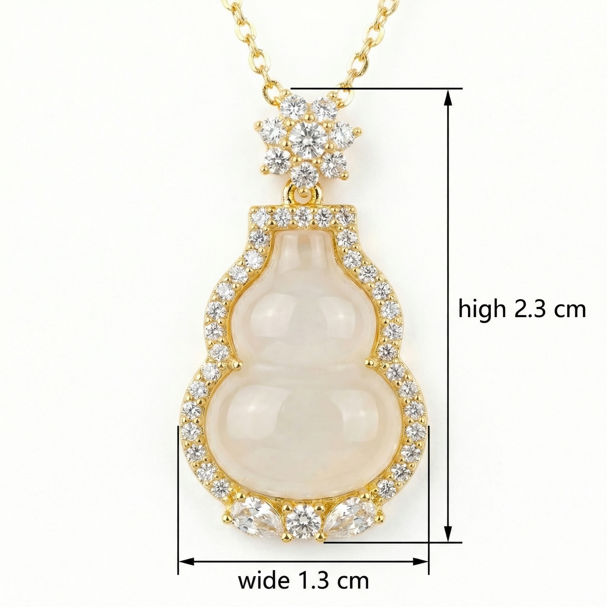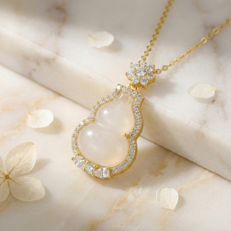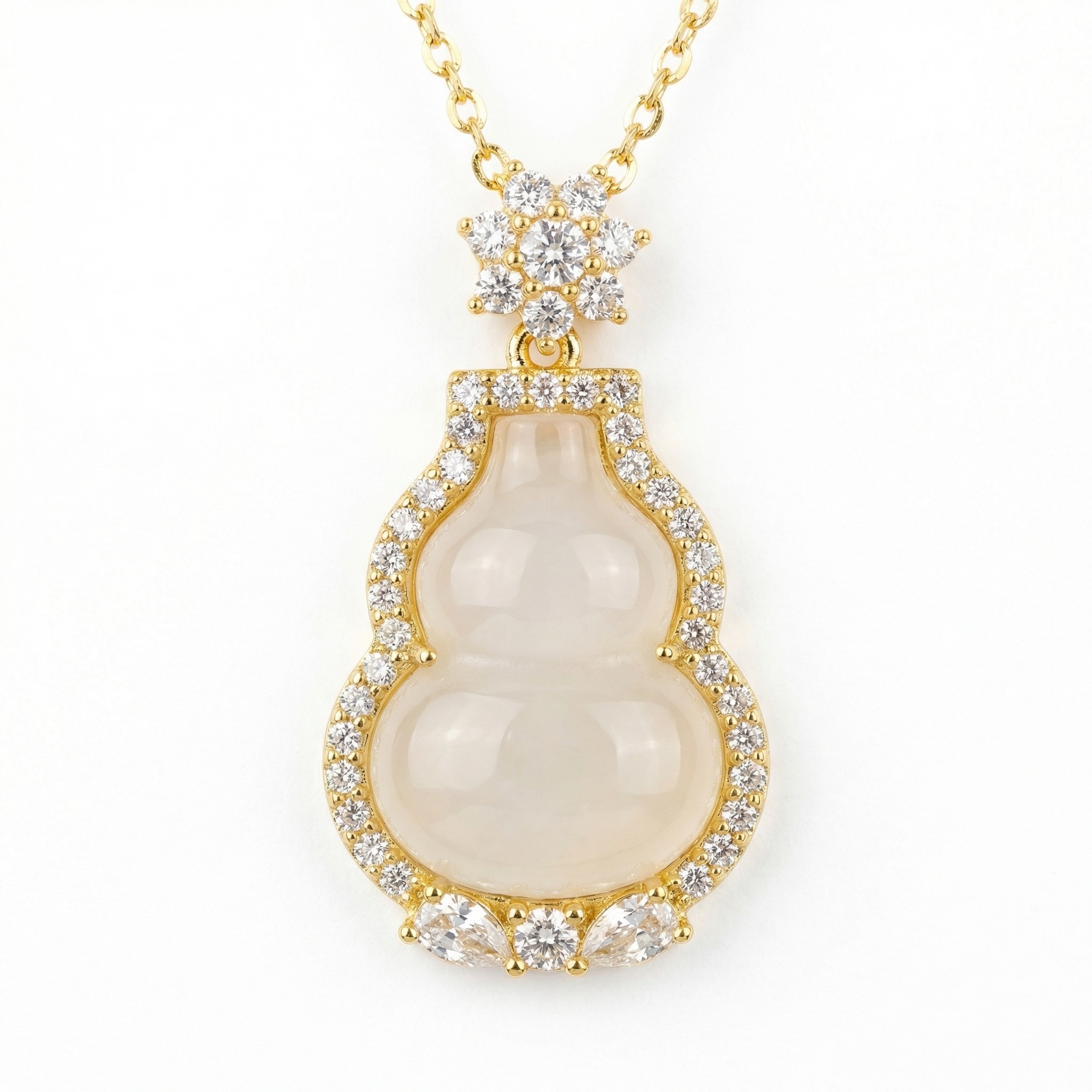 This exquisite necklace features a classic gourd-shaped pendant, traditionally known as a 'hulu,' symbolizing prosperity and long life. At its heart lies a smooth, translucent white stone, beautifully framed by a halo of brilliant round-cut crystals that capture and reflect light from every angle. The top of the pendant is adorned with a delicate floral motif bail, meticulously set with sparkling accents for added sophistication. Suspended from a dainty yellow-toned chain, this piece blends timeless cultural symbolism with contemporary elegance. The bottom of the frame is further detailed with larger pear-shaped and round stones, creating a balanced and luxurious look. Ideal for both special occasions and adding a touch of grace to everyday attire, this pendant is a stunning testament to refined craftsmanship and symbolic jewelry design. | Brand: jewelryodm