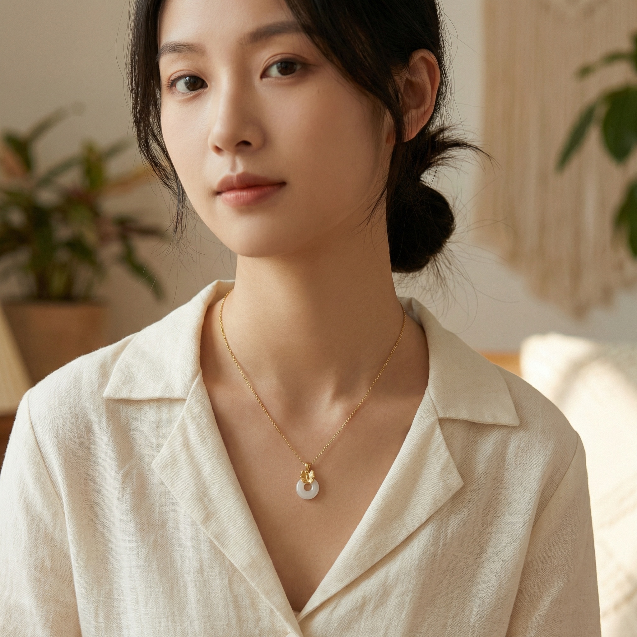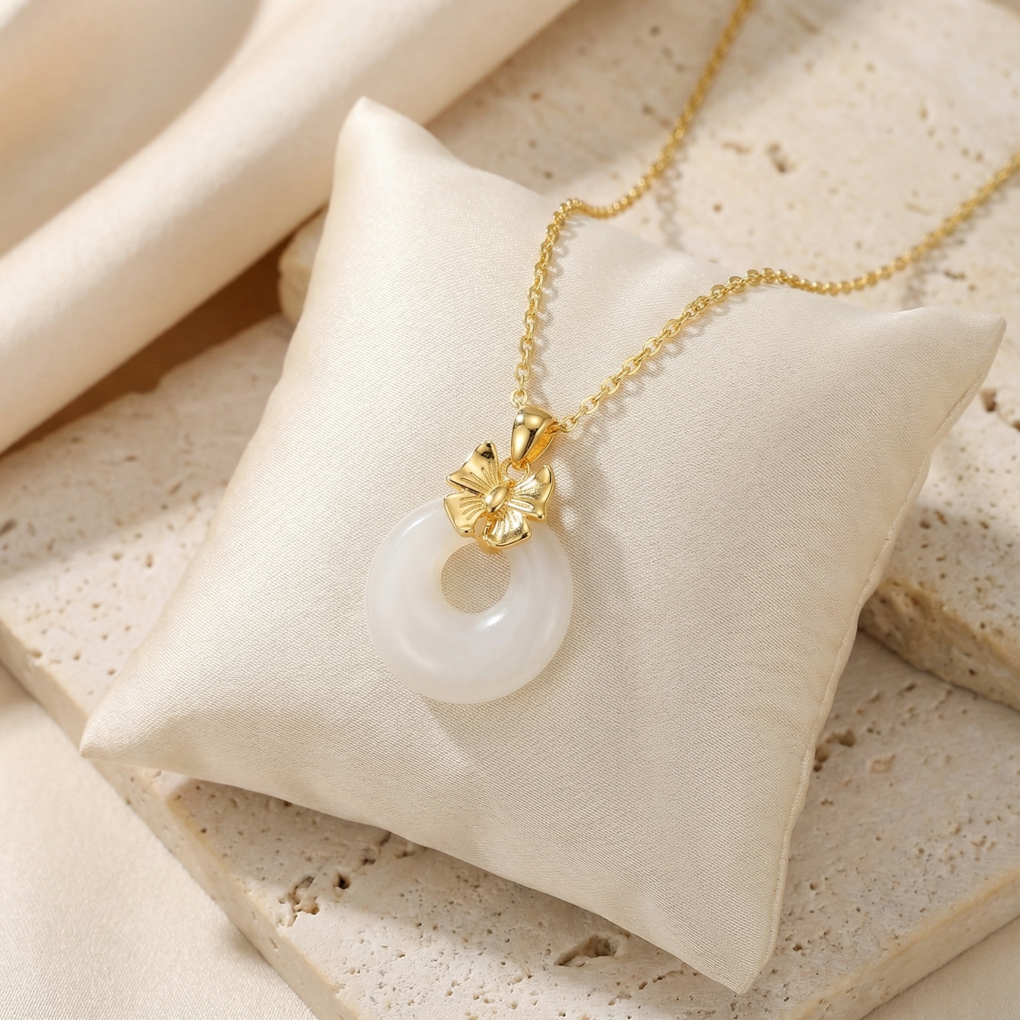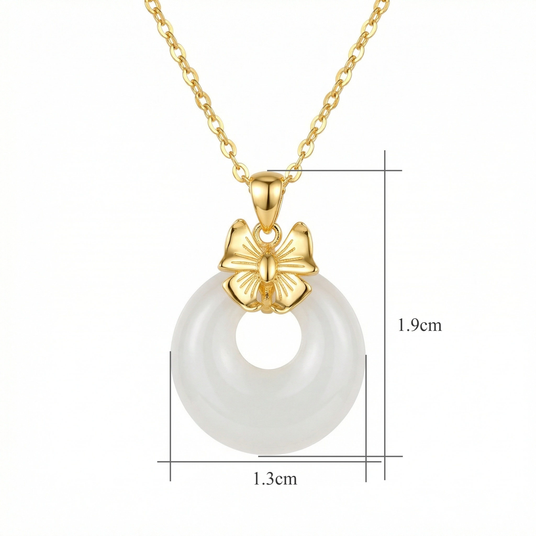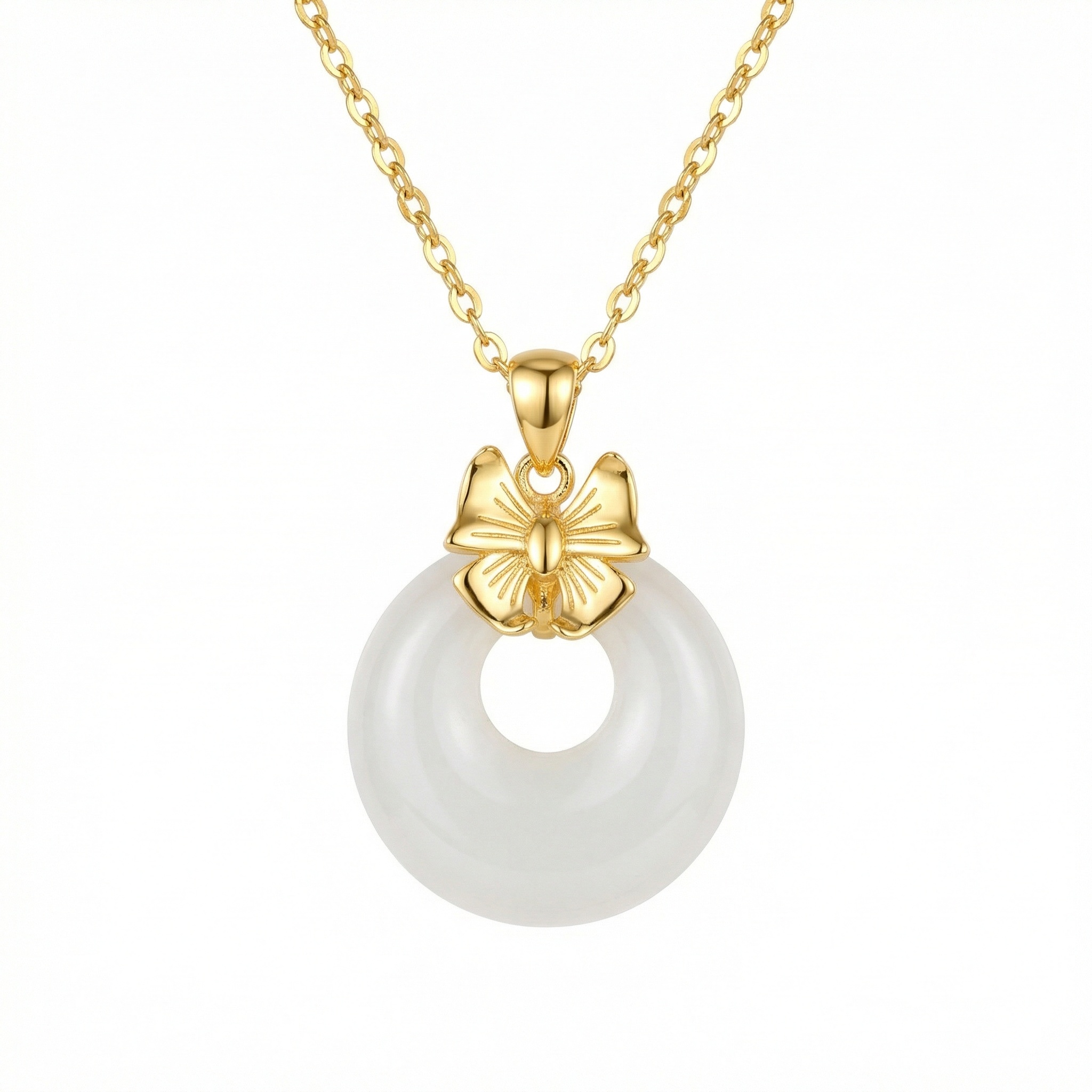 This exquisite necklace features a smooth, milky white jade donut pendant, traditionally known as a "Ping An Kou" or safety buckle, symbolizing peace and protection. Atop the jade sits a finely crafted metallic bow, adding a touch of contemporary femininity to the classic design. The pendant hangs from a matching polished chain, creating a harmonious and sophisticated look. This piece combines cultural significance with modern aesthetics, making it a perfect gift for loved ones or a meaningful addition to your own jewelry collection. The lustrous white stone contrasts beautifully with the warm metallic finish of the bow and chain. | Brand: jewelryodm