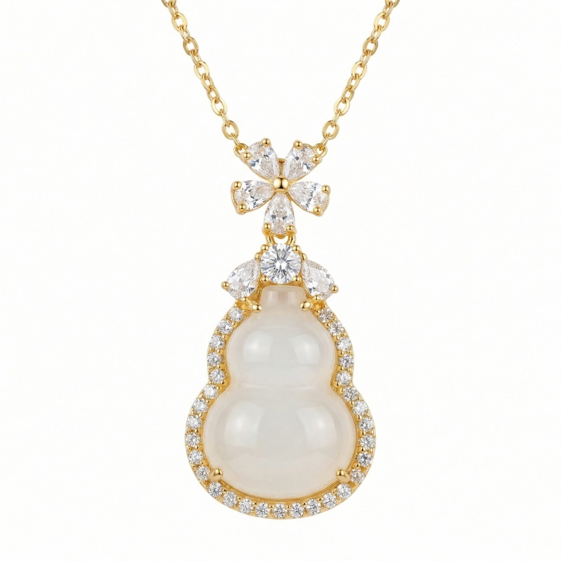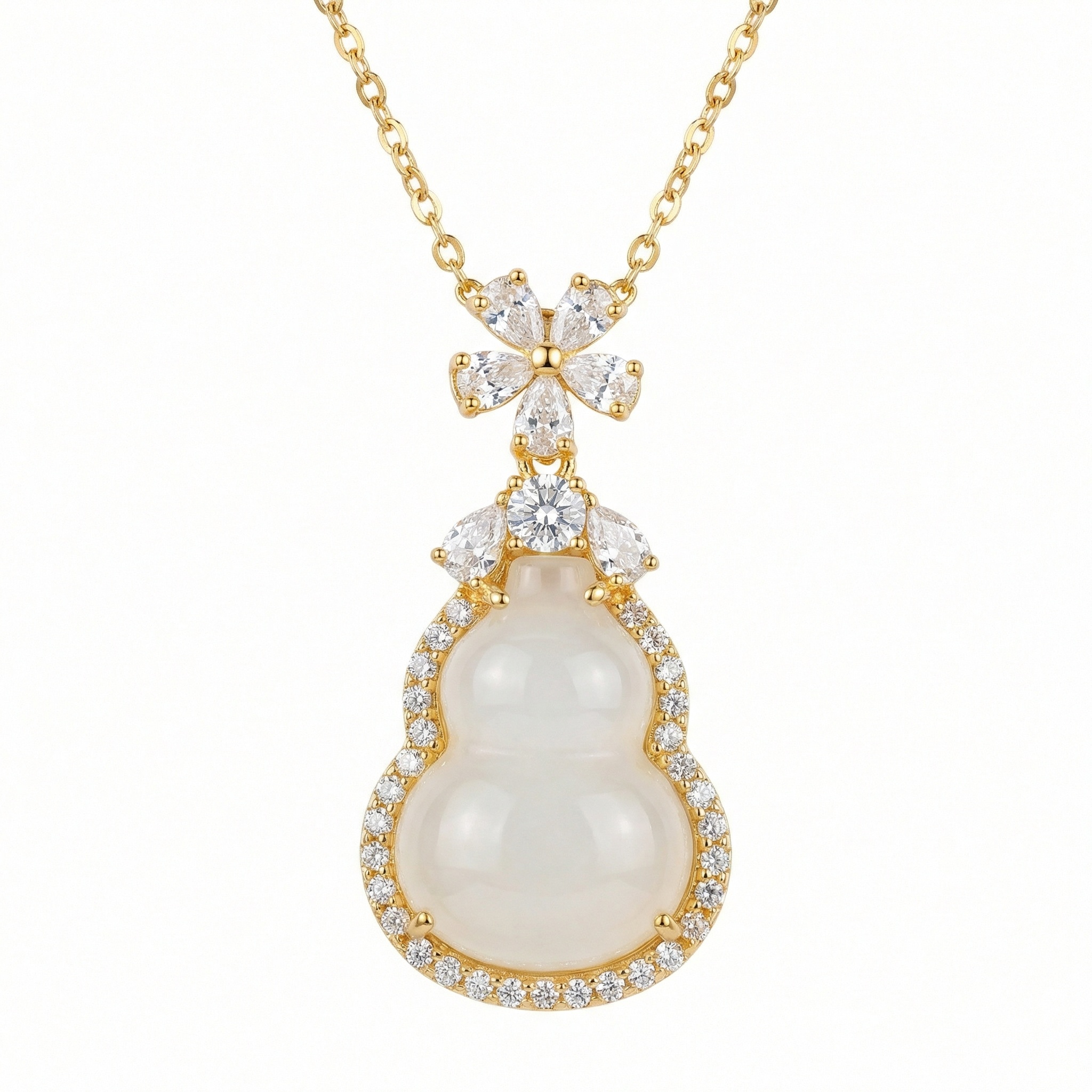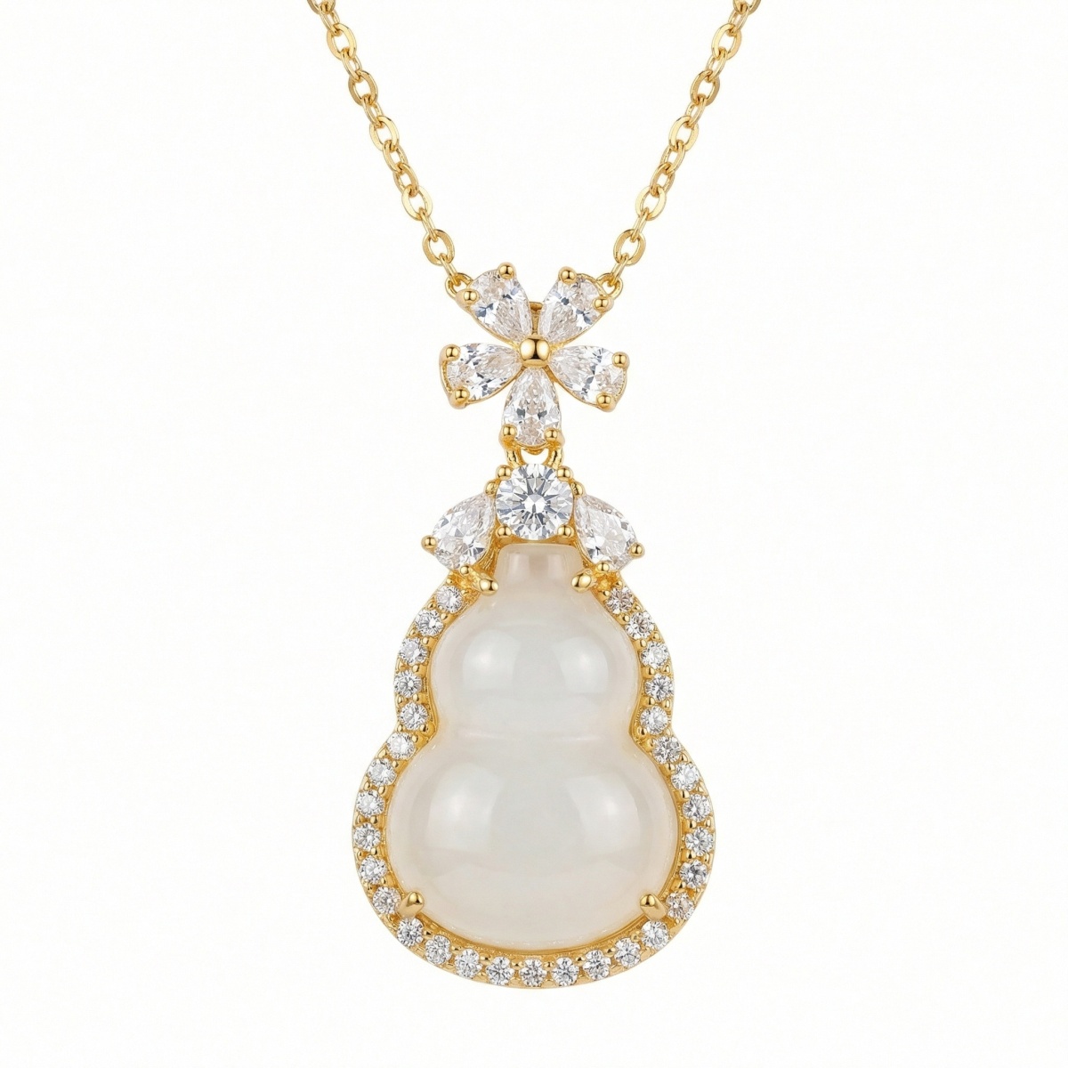 This exquisite necklace showcases a translucent white jadeite gourd pendant, a traditional symbol of prosperity and longevity. The pendant is meticulously framed by a shimmering halo of pavé-set stones that catch the light beautifully. Above the gourd, a charming five-petal flower crafted from pear-cut crystals adds a touch of feminine elegance. Suspended from a delicate metallic chain, this piece offers a harmonious blend of classic symbolism and modern luxury. The smooth, milky finish of the central gemstone provides a sophisticated contrast against the brilliant sparkle of the surrounding accents. Ideal for special occasions or as a meaningful gift, this pendant necklace brings a timeless charm to any jewelry collection, making it a truly versatile and eye-catching accessory for those who appreciate refined craftsmanship and elegant design. | Brand: jewelryodm