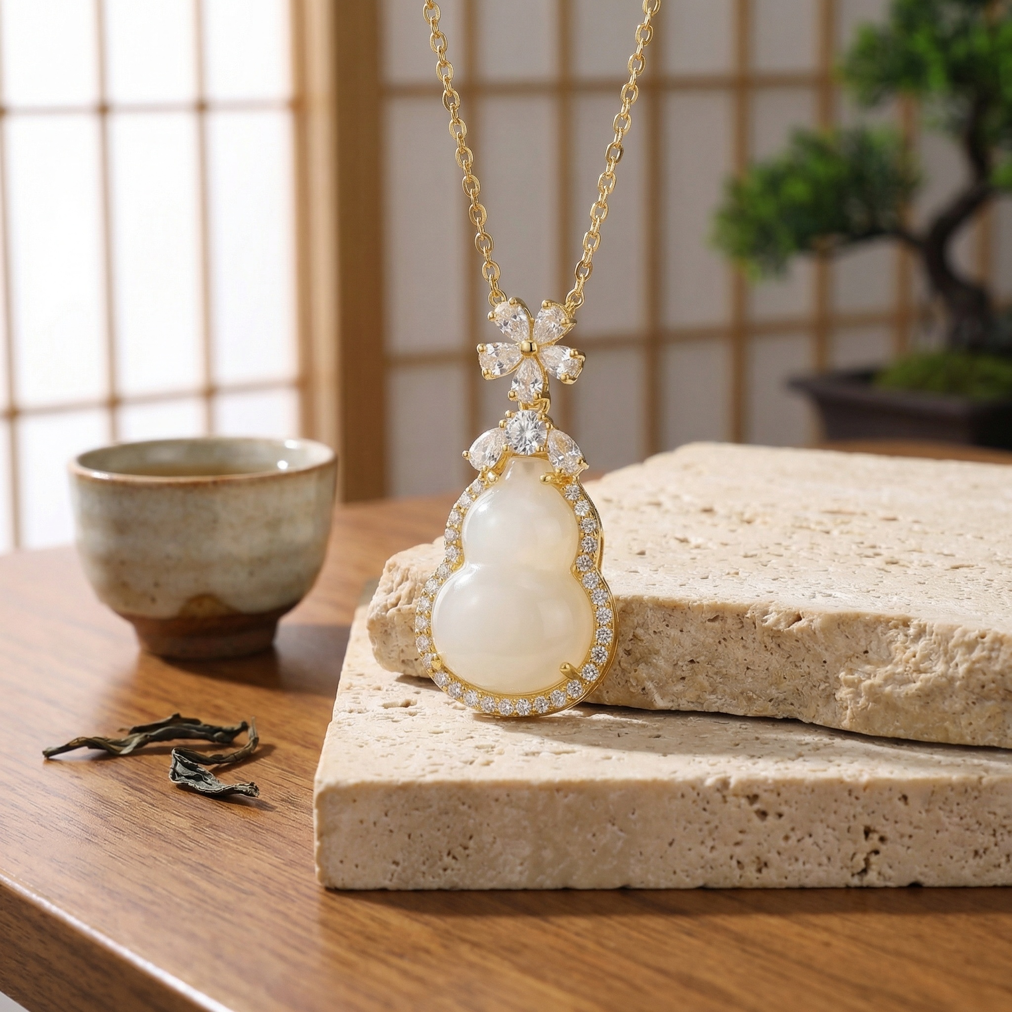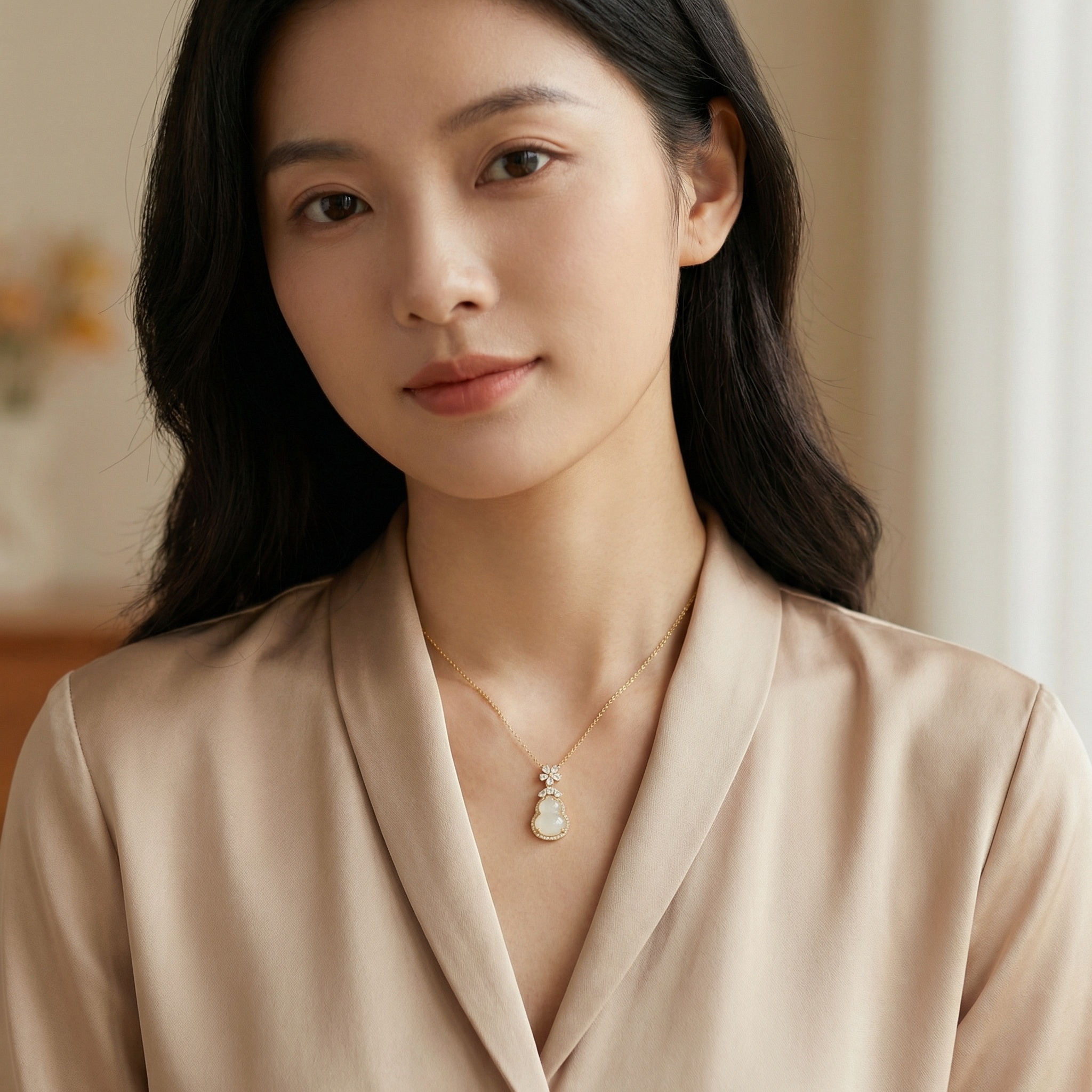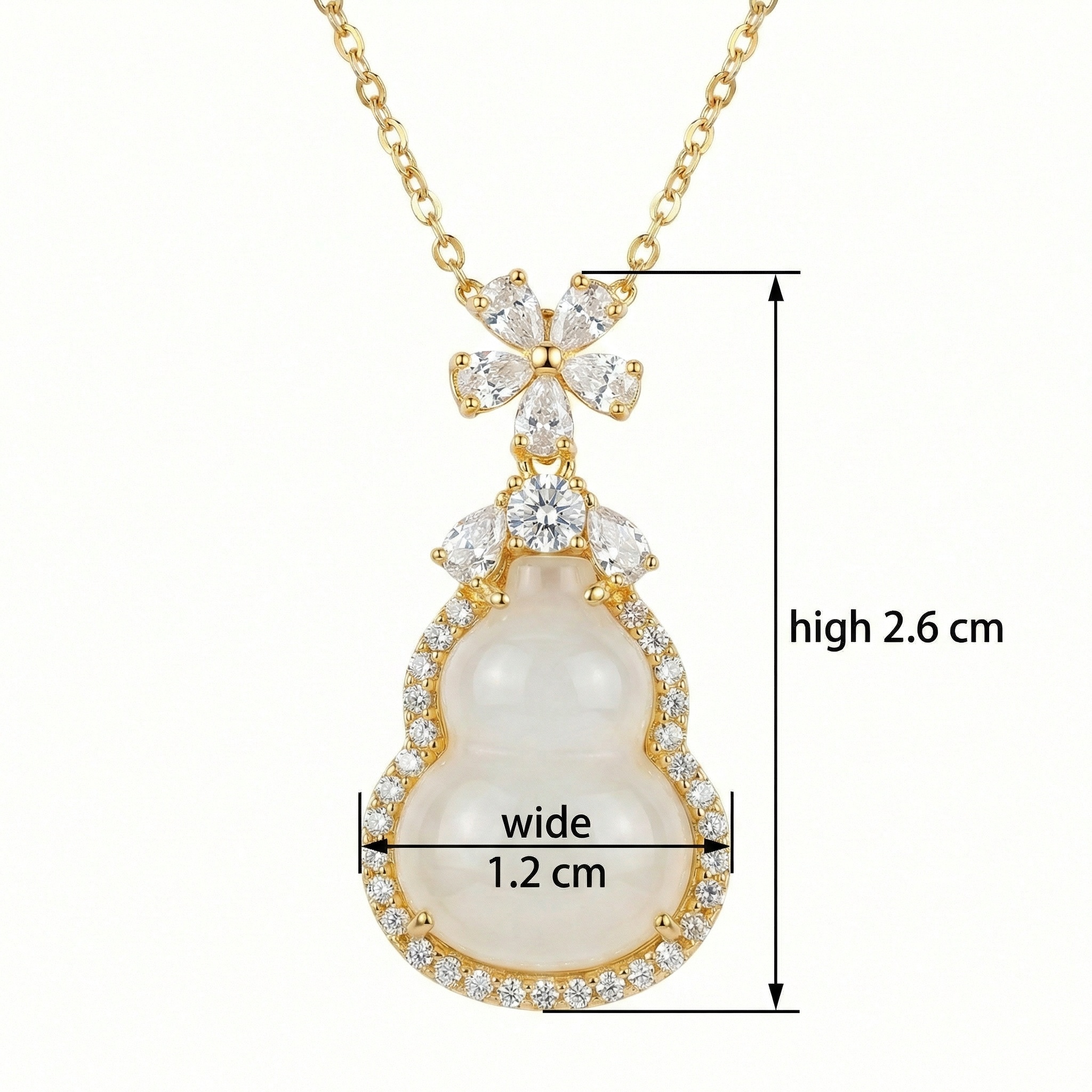 This exquisite necklace showcases a translucent white jadeite gourd pendant, a traditional symbol of prosperity and longevity. The pendant is meticulously framed by a shimmering halo of pavé-set stones that catch the light beautifully. Above the gourd, a charming five-petal flower crafted from pear-cut crystals adds a touch of feminine elegance. Suspended from a delicate metallic chain, this piece offers a harmonious blend of classic symbolism and modern luxury. The smooth, milky finish of the central gemstone provides a sophisticated contrast against the brilliant sparkle of the surrounding accents. Ideal for special occasions or as a meaningful gift, this pendant necklace brings a timeless charm to any jewelry collection, making it a truly versatile and eye-catching accessory for those who appreciate refined craftsmanship and elegant design. | Brand: jewelryodm