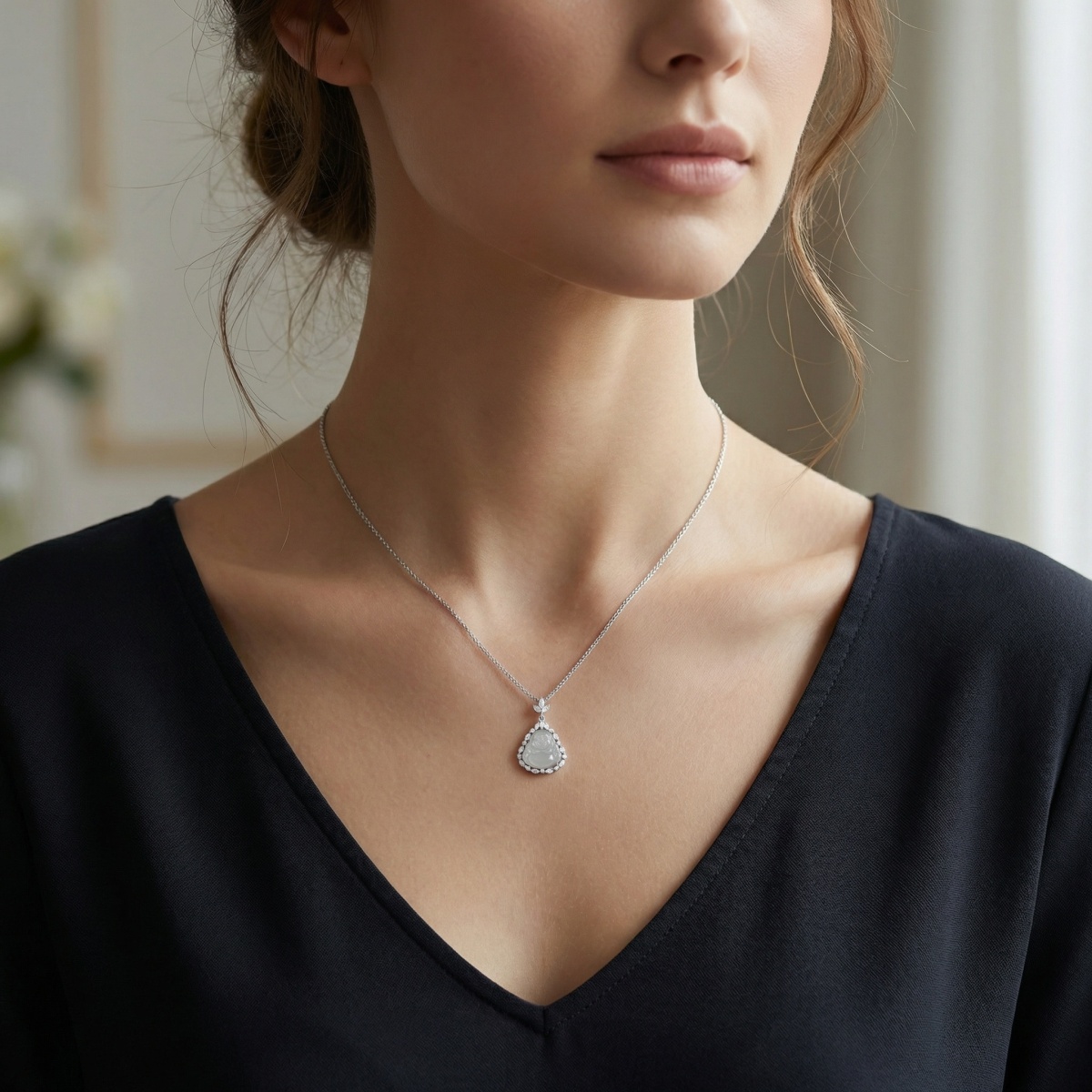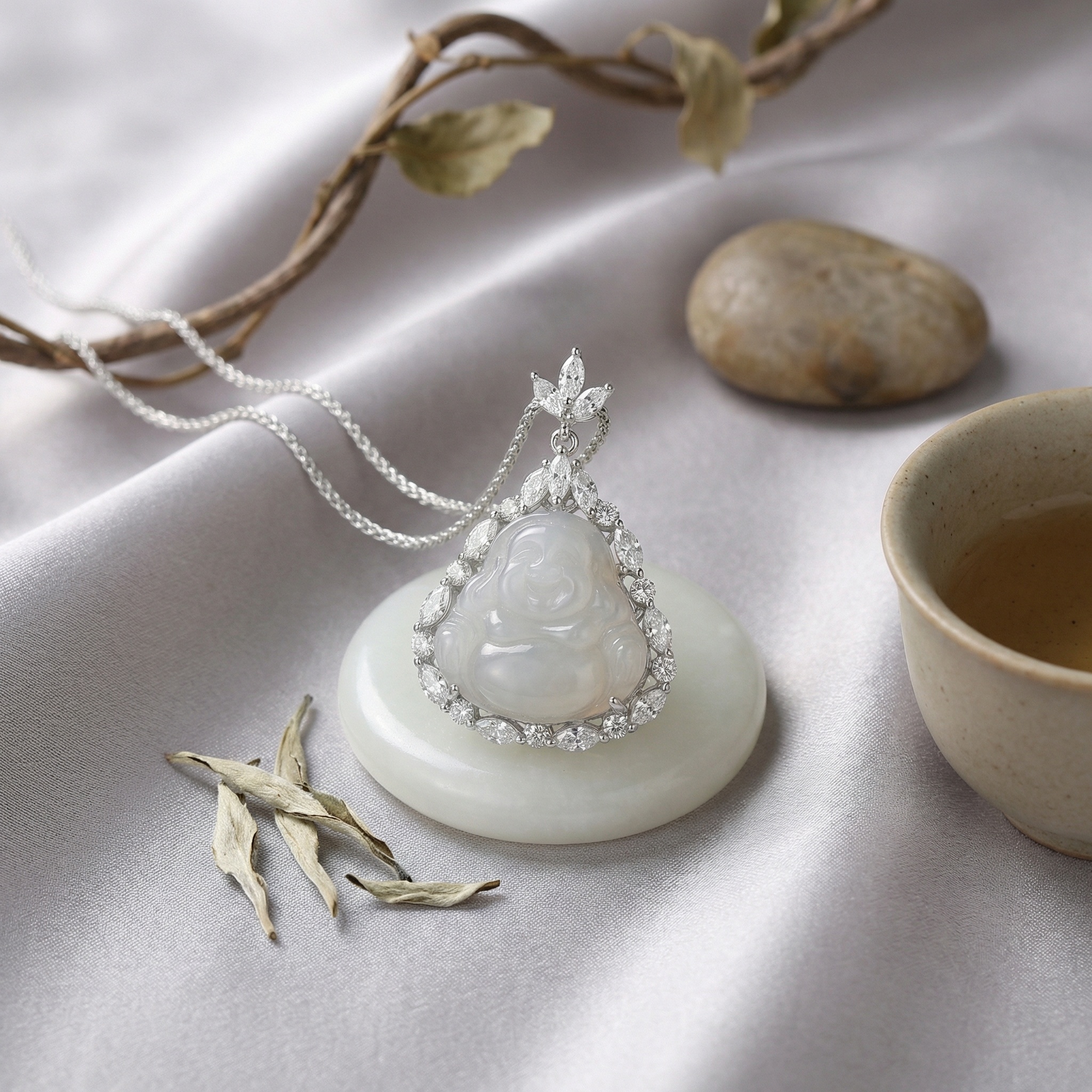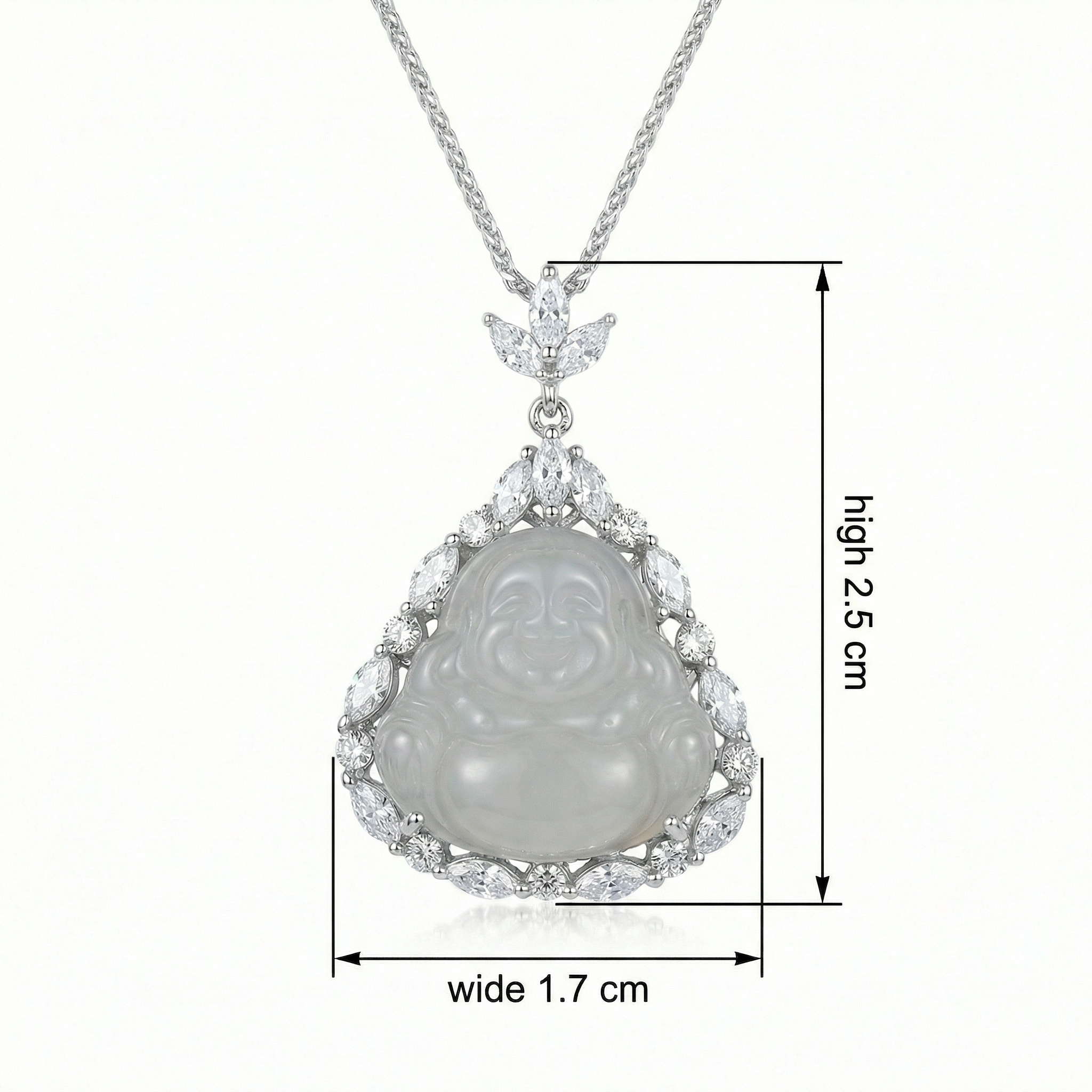 This exquisite necklace features a beautifully hand-carved Laughing Buddha pendant, crafted from high-quality, translucent white jadeite. Symbolizing happiness, prosperity, and good fortune, the serene Buddha is encased in a shimmering halo of marquise and round-cut gemstones, creating a radiant pear-shaped frame. The intricate setting is complemented by a delicate floral-inspired bail, suspended from a fine sterling silver chain. With its blend of spiritual significance and modern elegance, this piece serves as both a powerful talisman and a sophisticated accessory. Whether worn for its cultural meaning or its timeless beauty, this pendant necklace makes a thoughtful gift for someone special or a stunning addition to any jewelry collection. The brilliant contrast between the soft white jade and the sparkling accents ensures it captures the light from every angle. | Brand: jewelryodm