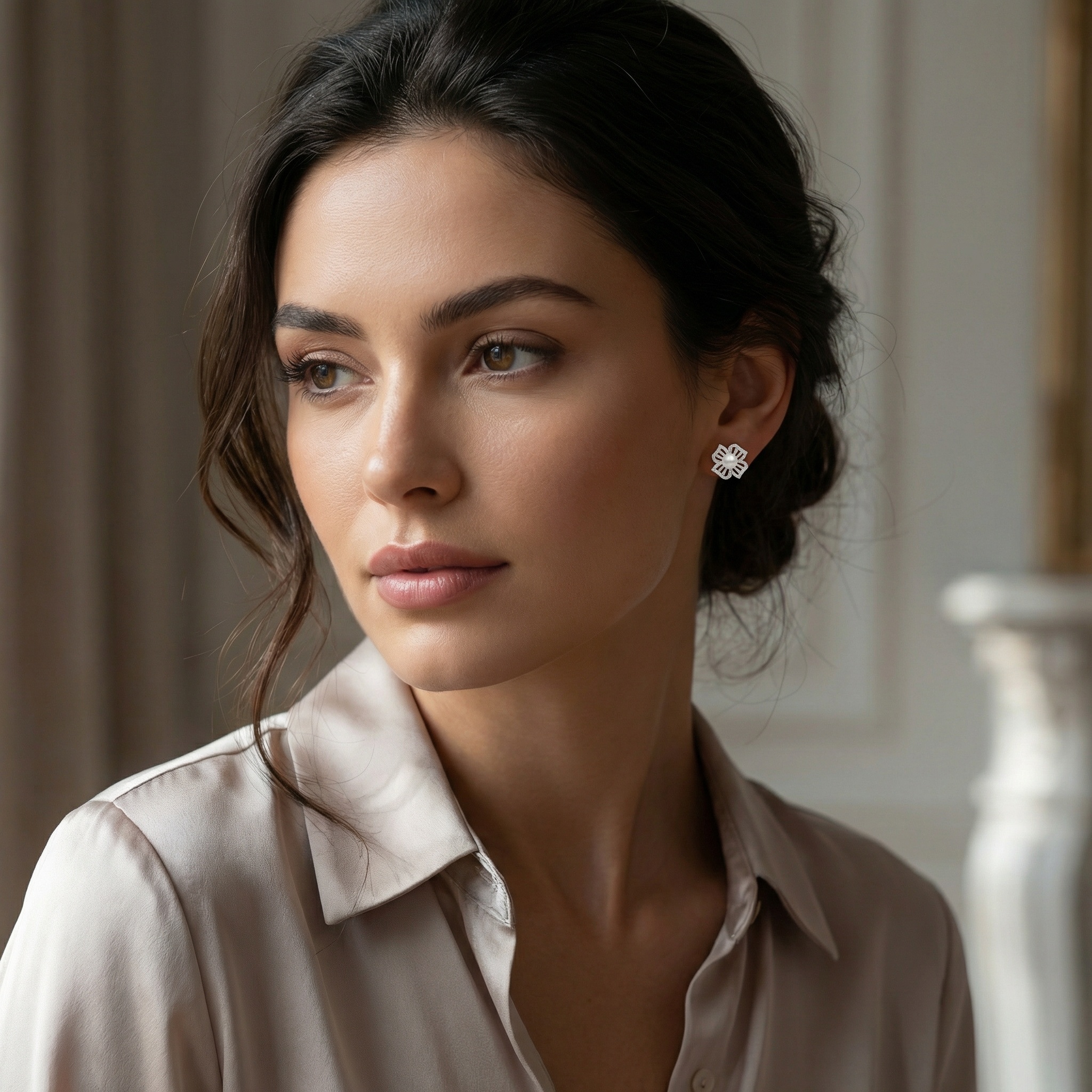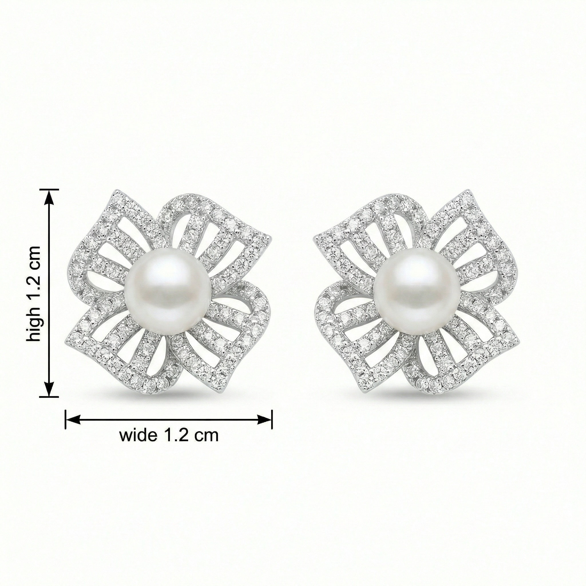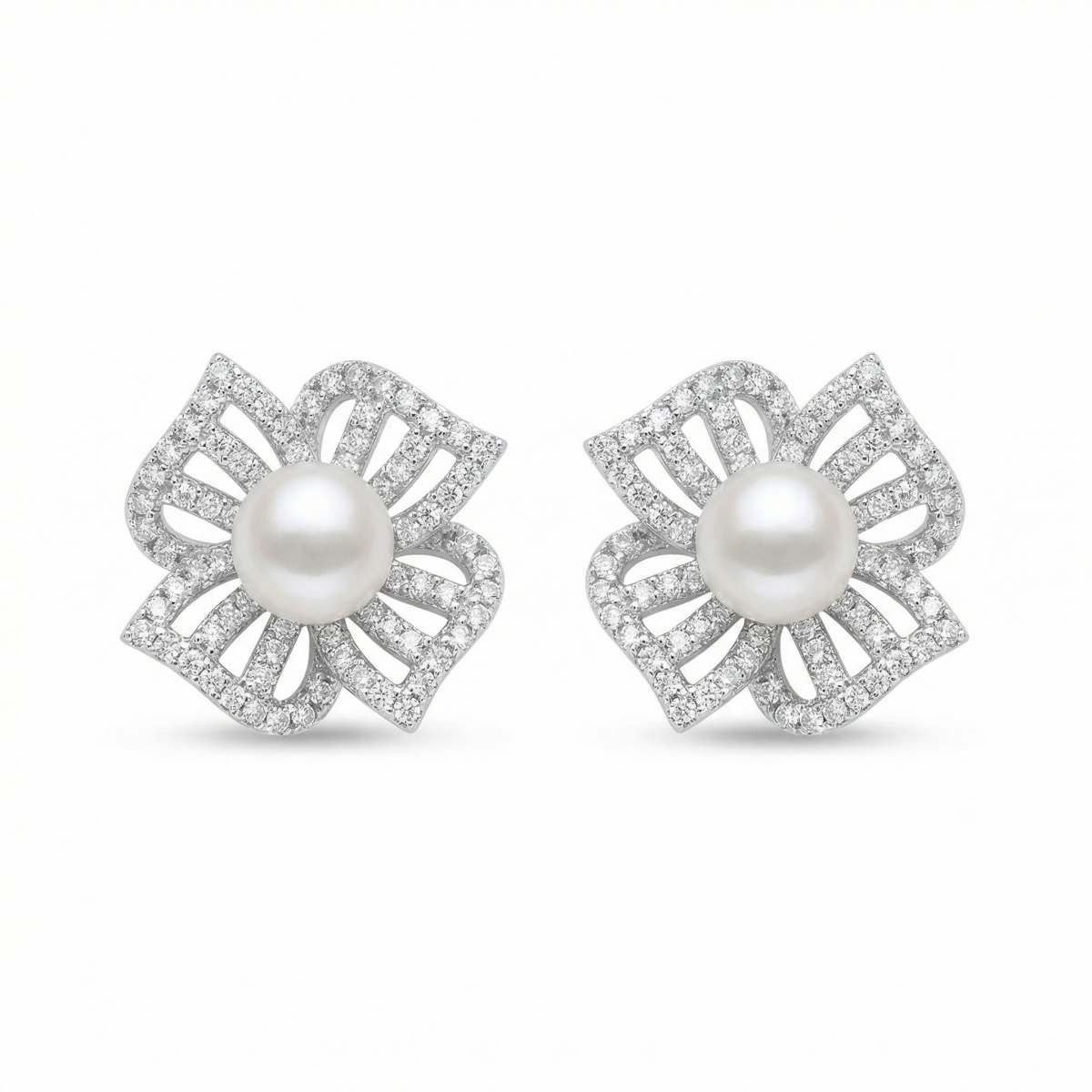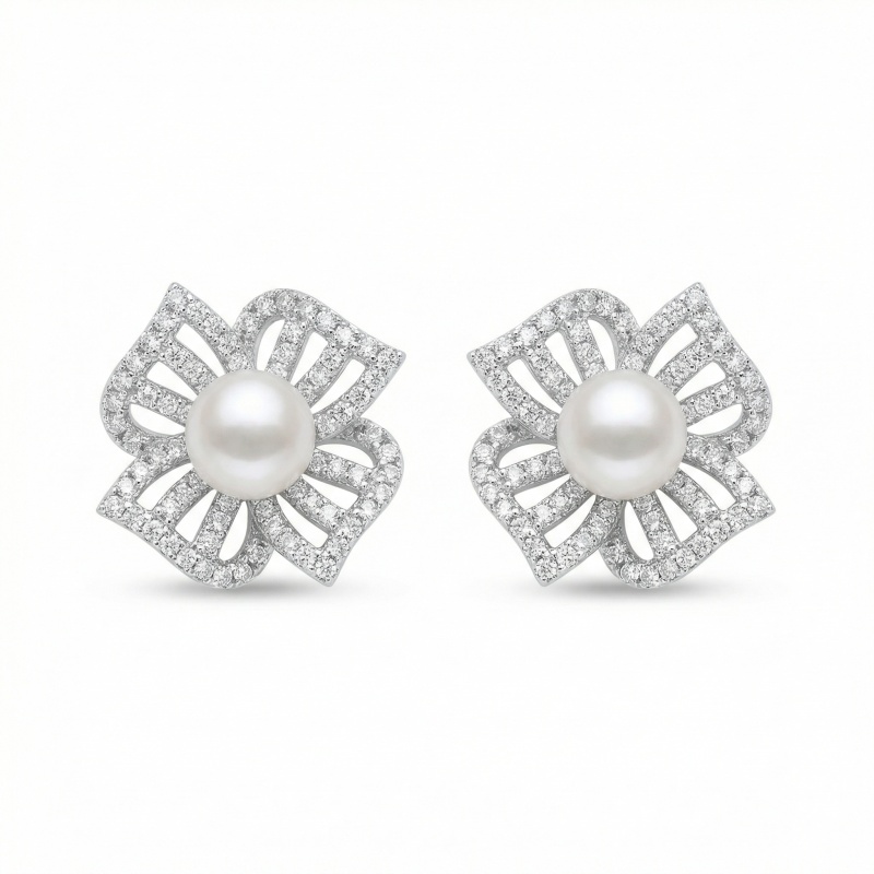 These exquisite earrings feature lustrous white pearls nestled at the center of a sophisticated floral motif. Each earring is meticulously crafted with four openwork petals adorned with shimmering pave-set diamonds, creating a radiant sparkle that beautifully complements the pearl's soft glow. The silver-tone setting provides a modern and polished look, making these studs an ideal choice for weddings, formal galas, or as a cherished gift. With their timeless design and delicate craftsmanship, these earrings offer a perfect blend of classic grace and contemporary style. Designed for comfort and elegance, they secure with traditional posts and backings, ensuring they stay perfectly in place. Elevate any ensemble with the understated luxury and floral charm of these stunning pearl and diamond accessories. | Brand: jewelryodm