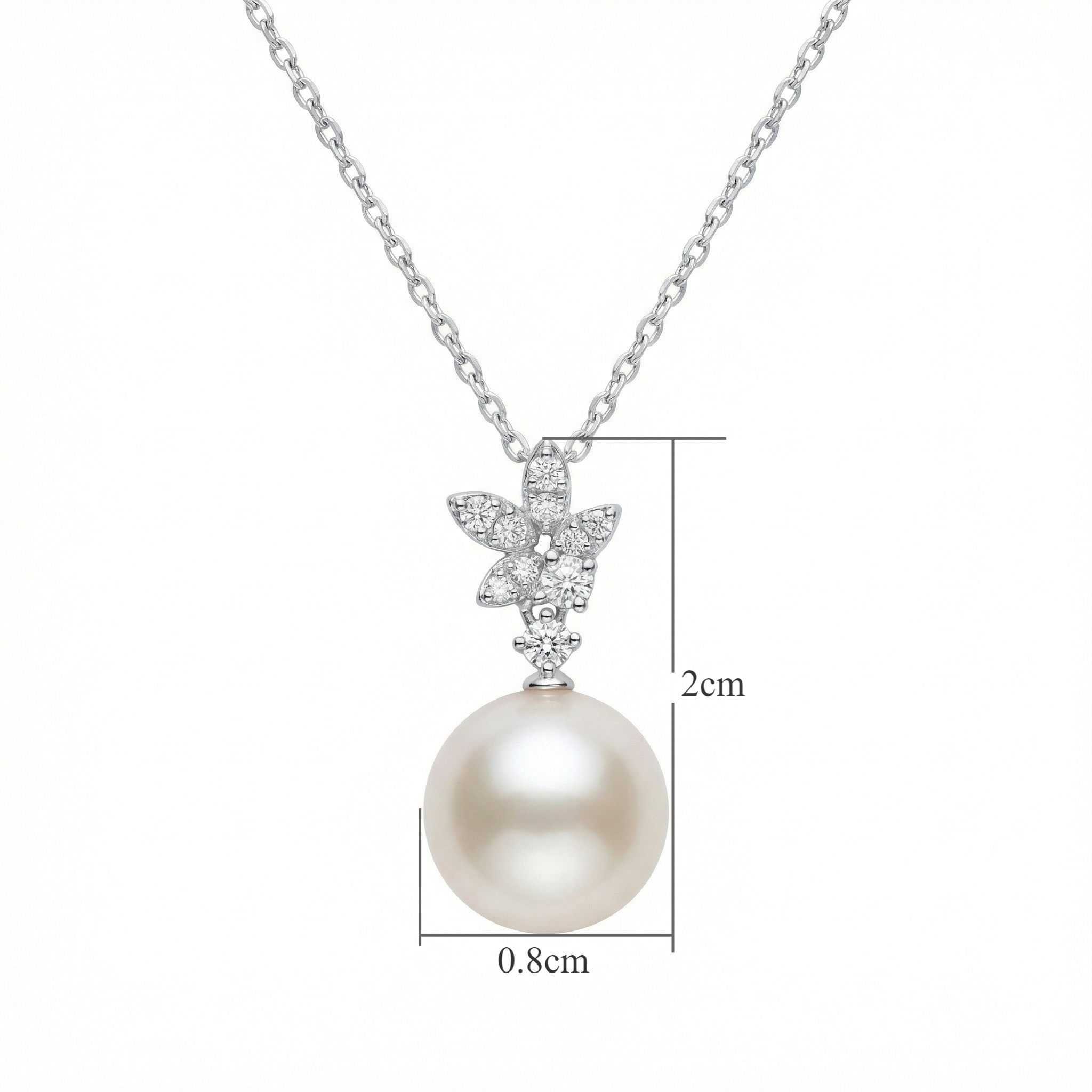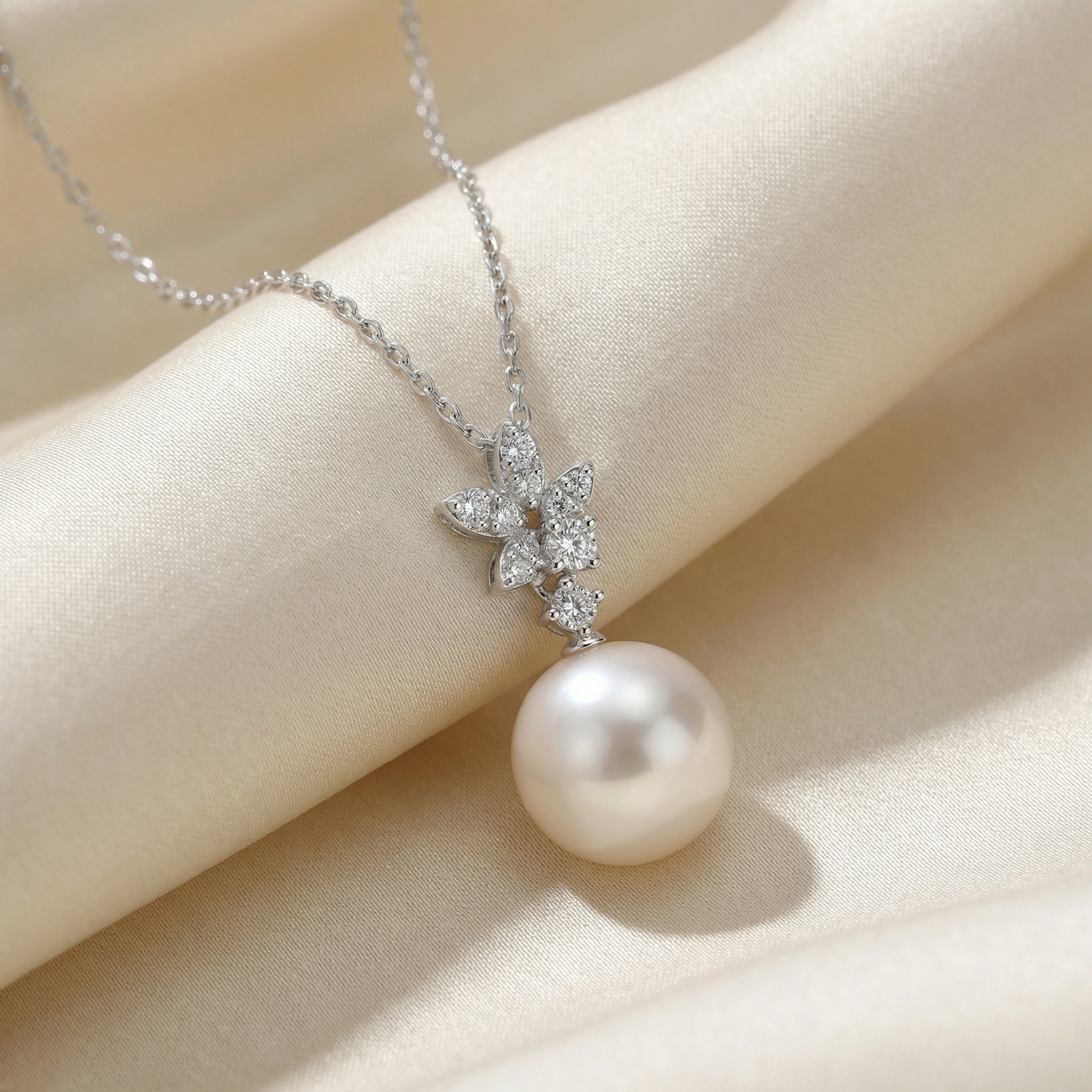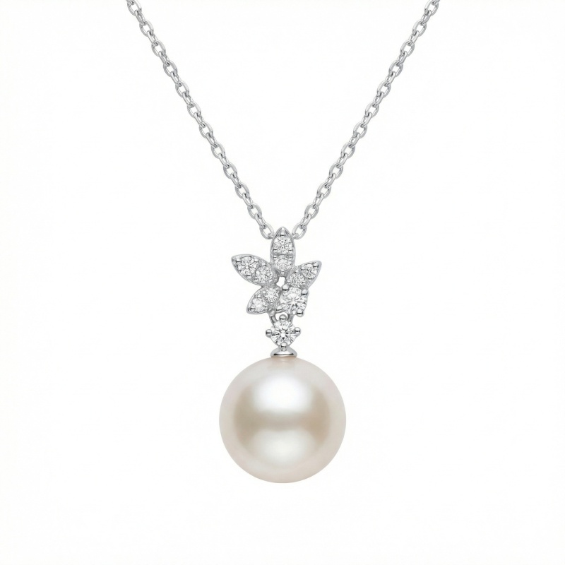This exquisite pendant necklace features a stunning, high-luster white pearl suspended from an intricately designed bail. The bail is crafted in a graceful floral silhouette, encrusted with brilliant-cut diamonds that catch the light from every angle. These shimmering accents add a touch of sparkle, perfectly complementing the soft, iridescent glow of the large round pearl. Set in a sleek, polished white metal finish and suspended from a delicate matching link chain, this piece exudes timeless sophistication. Its nature-inspired design makes it a versatile accessory, ideal for bridal wear, special occasions, or as a luxurious gift. The combination of classic floral motifs and the natural beauty of the pearl creates a breathtaking piece that adds elegance to any attire. | Brand: jewelryodm