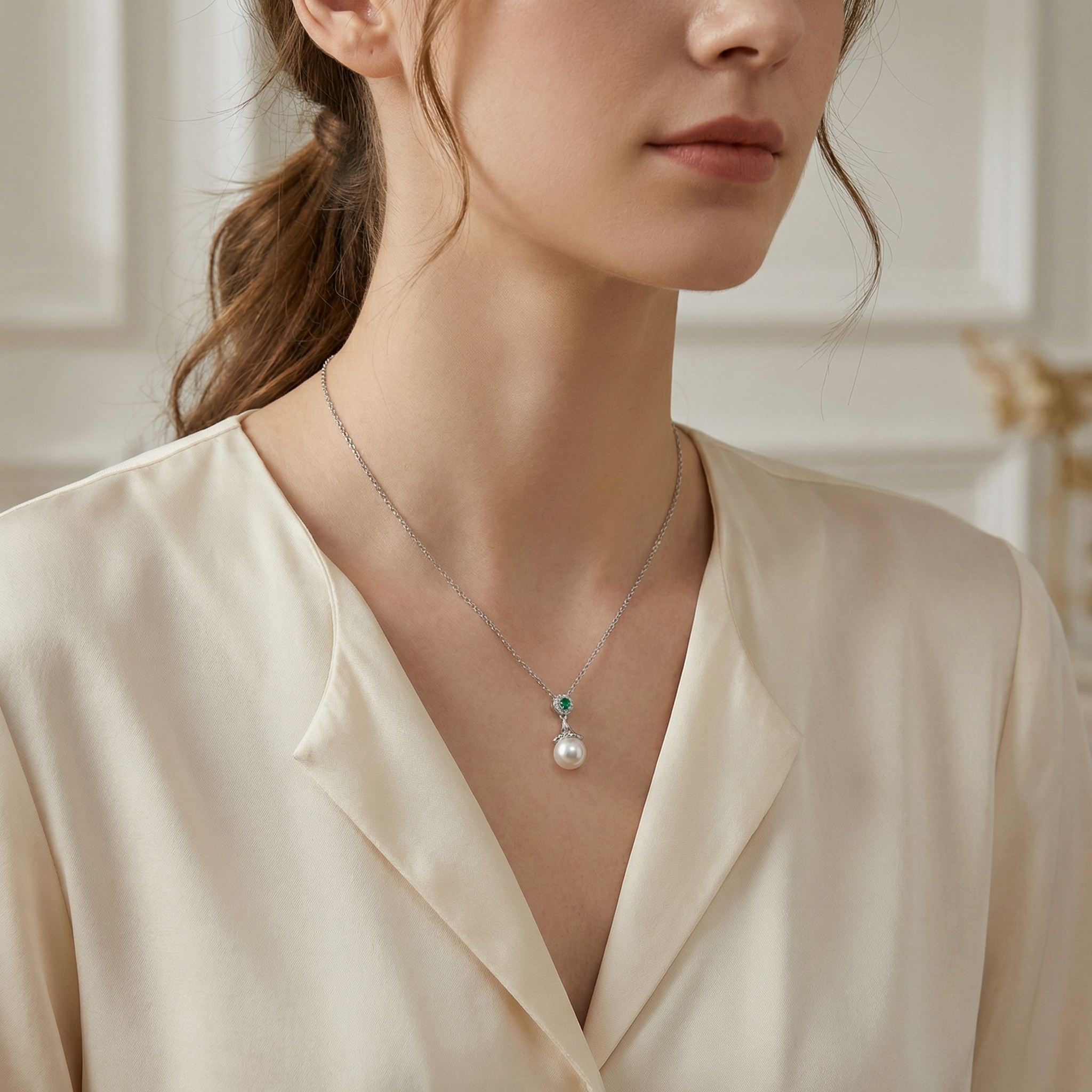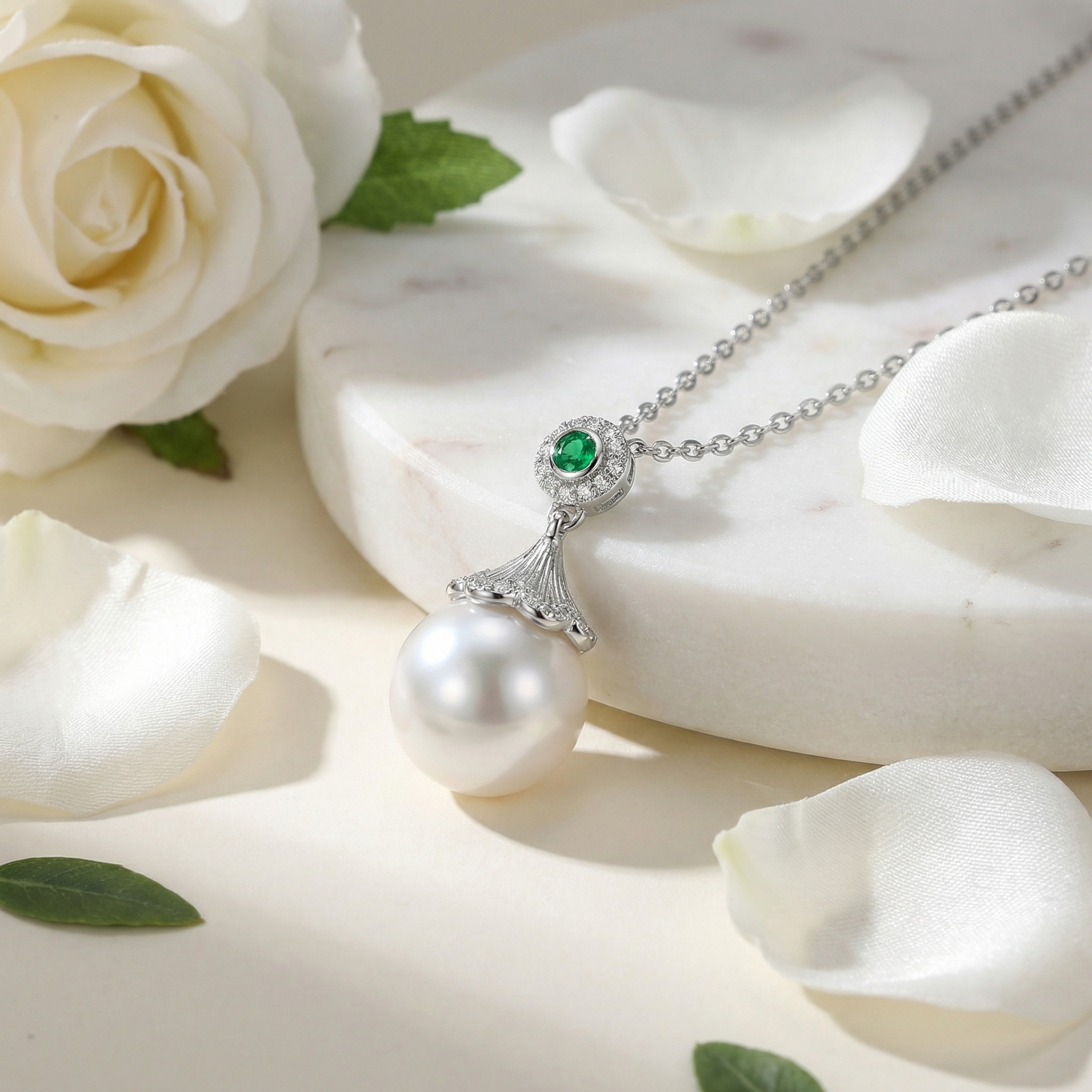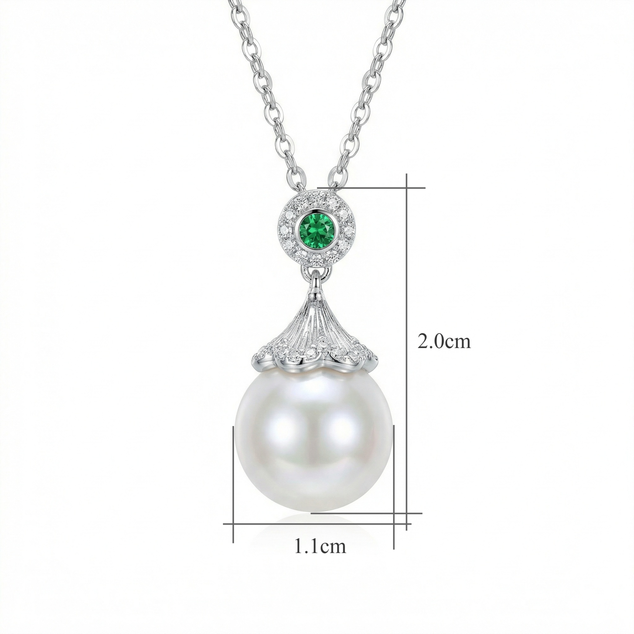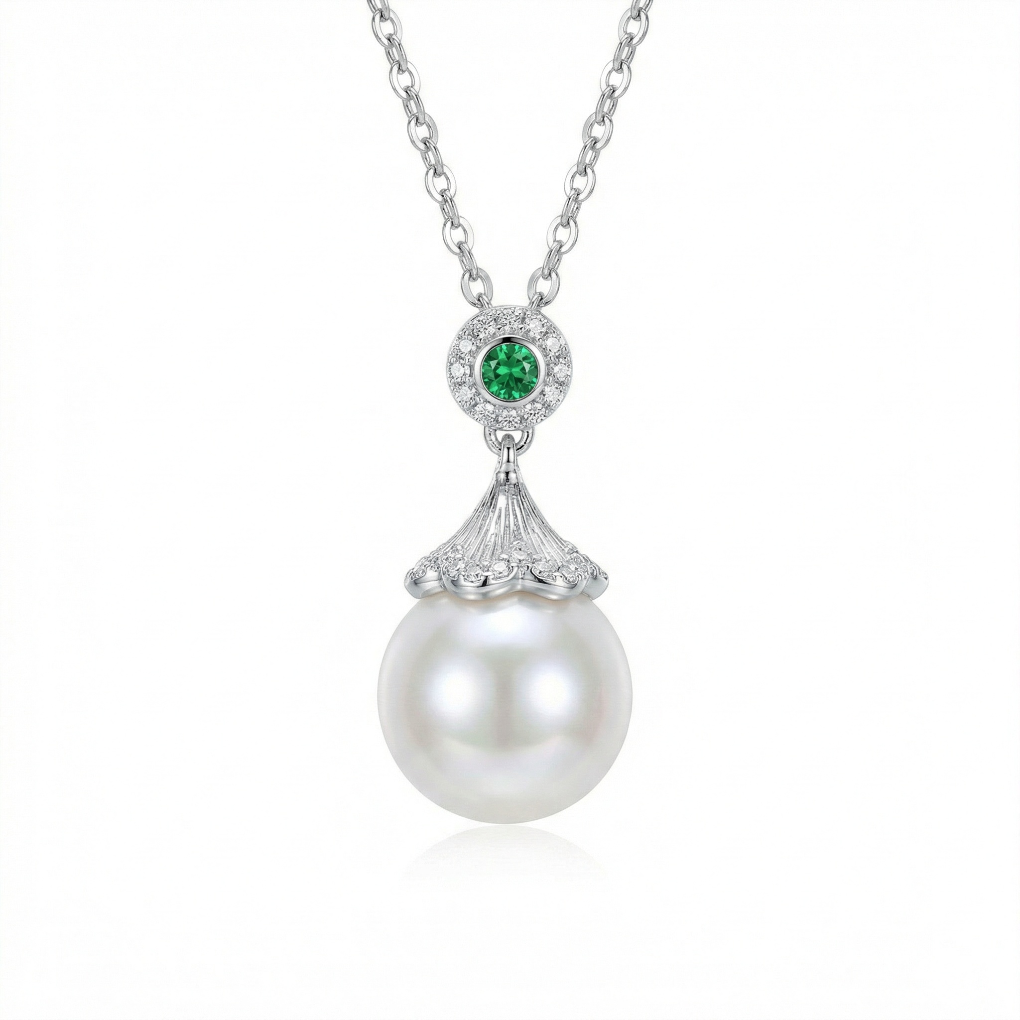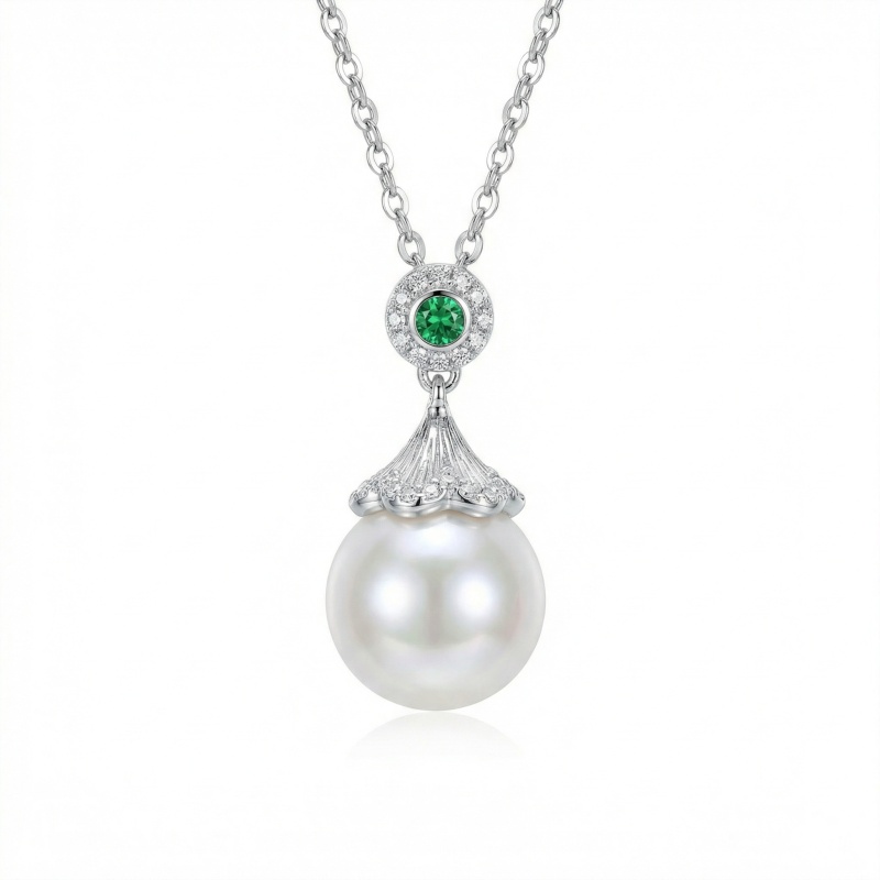 This exquisite pendant necklace features a large, lustrous white pearl with a brilliant, smooth surface. The pearl is crowned by an intricate silver-toned cap, elegantly shaped with delicate vertical ridges and adorned with small, shimmering diamonds along its scalloped edge. Above the pearl, a circular pendant link houses a vibrant, round-cut green gemstone, likely an emerald, which is encircled by a sparkling halo of white diamonds. The entire pendant is suspended from a delicate, high-polish chain, creating a look of timeless sophistication. Combining the classic elegance of a pearl with the vivid pop of a green gemstone, this piece is a perfect statement of luxury and refinement, suitable for formal occasions or as a cherished gift. | Brand: jewelryodm