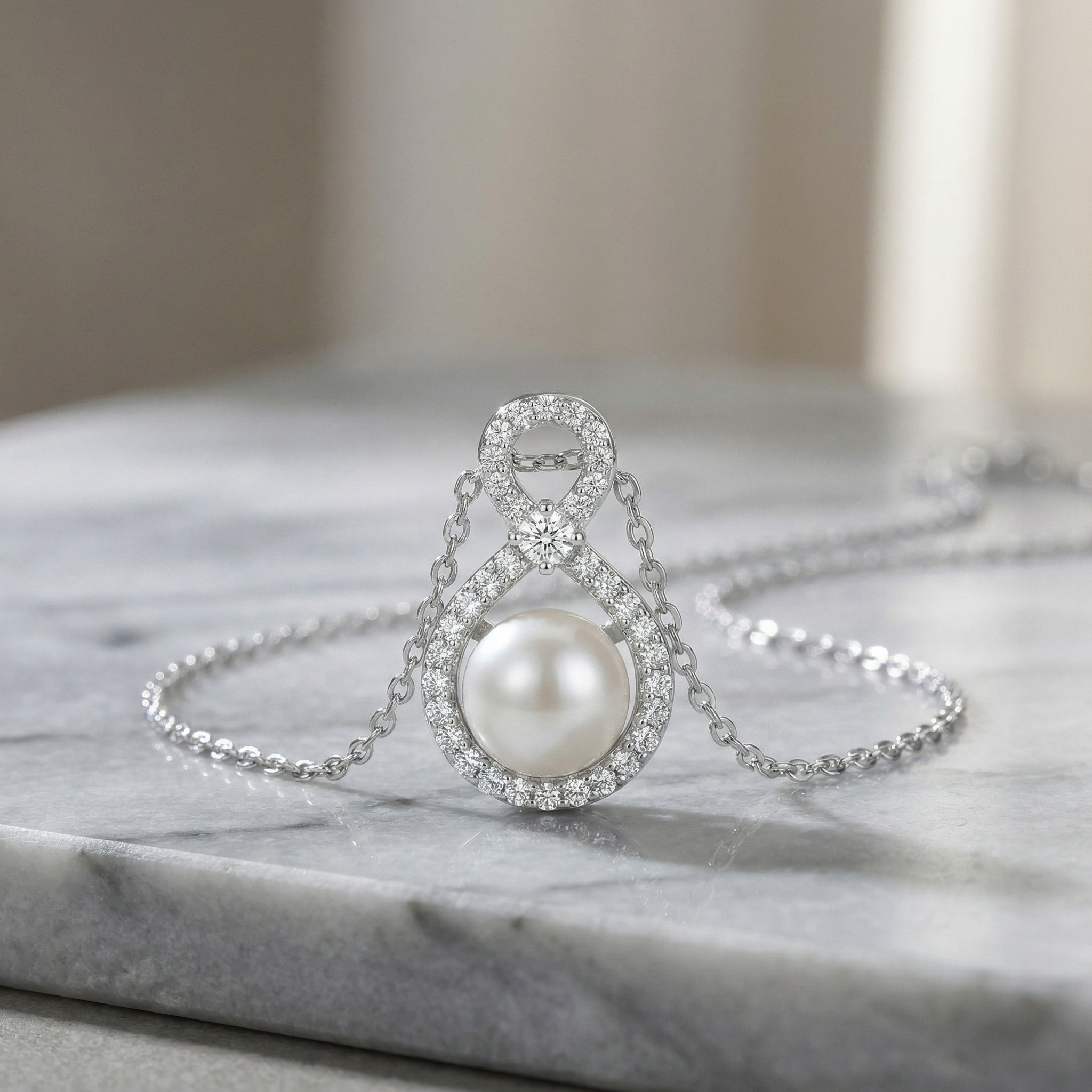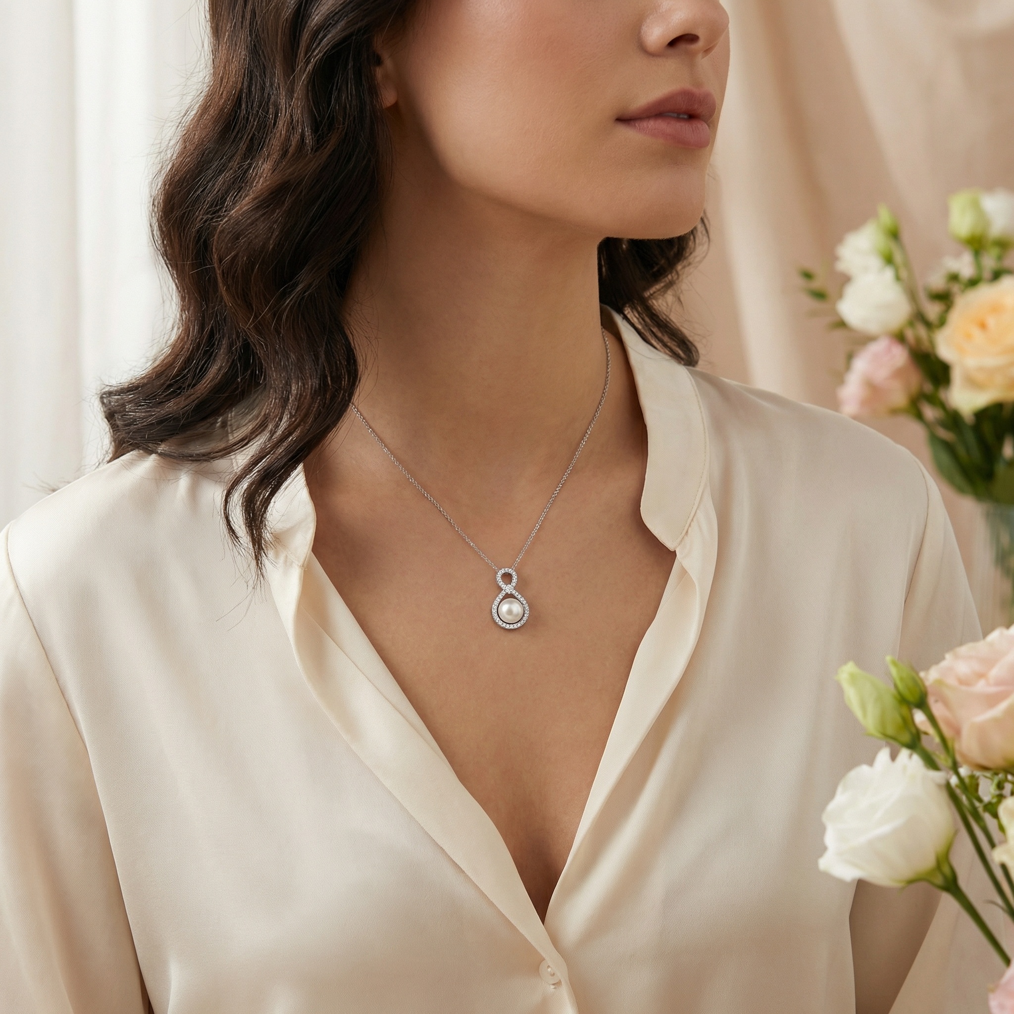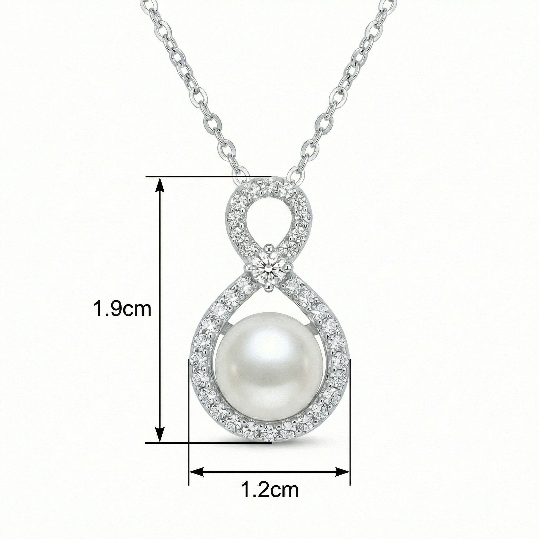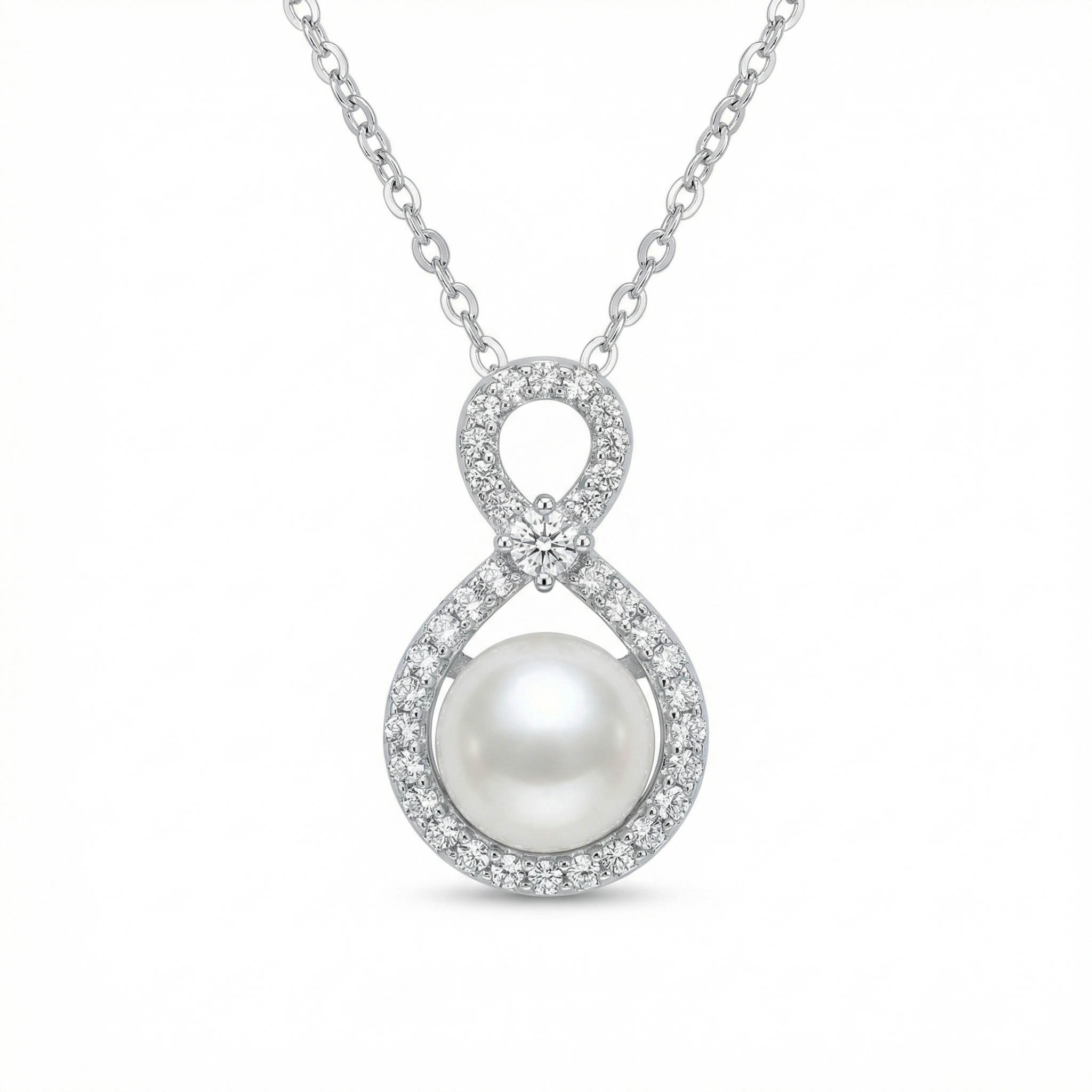 This exquisite necklace features a luminous white cultured pearl, gracefully nestled within a pavé-set infinity frame. Crafted in polished sterling silver, the figure-eight design is adorned with numerous shimmering round-cut diamonds that catch the light from every angle. A prominent center stone sits at the heart of the crossover, adding an extra touch of brilliance. The pendant hangs elegantly from a delicate matching cable chain, making it a timeless symbol of eternal love and sophistication. Perfect for special occasions like weddings or as a luxurious gift, this piece seamlessly blends classic charm with modern elegance. | Brand: jewelryodm