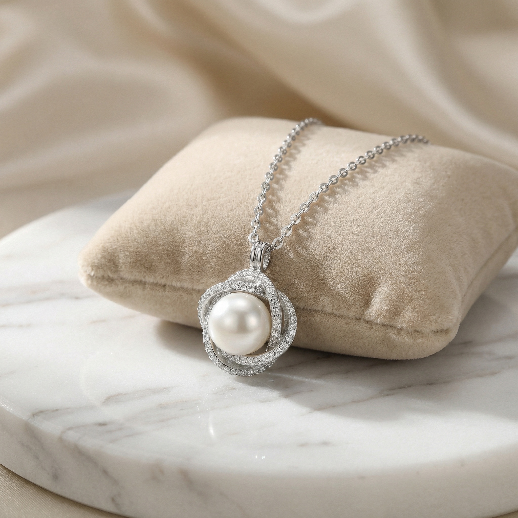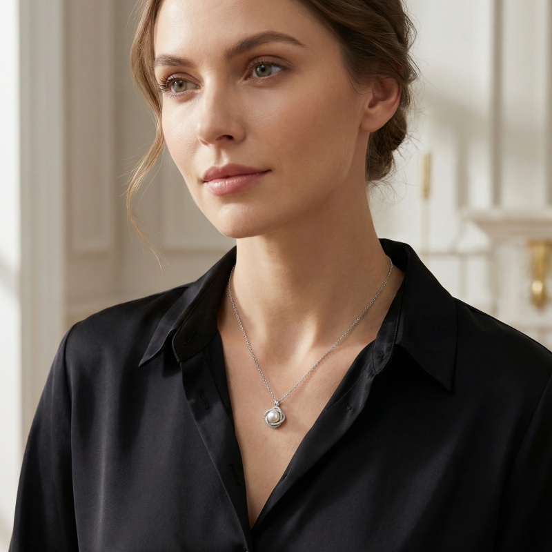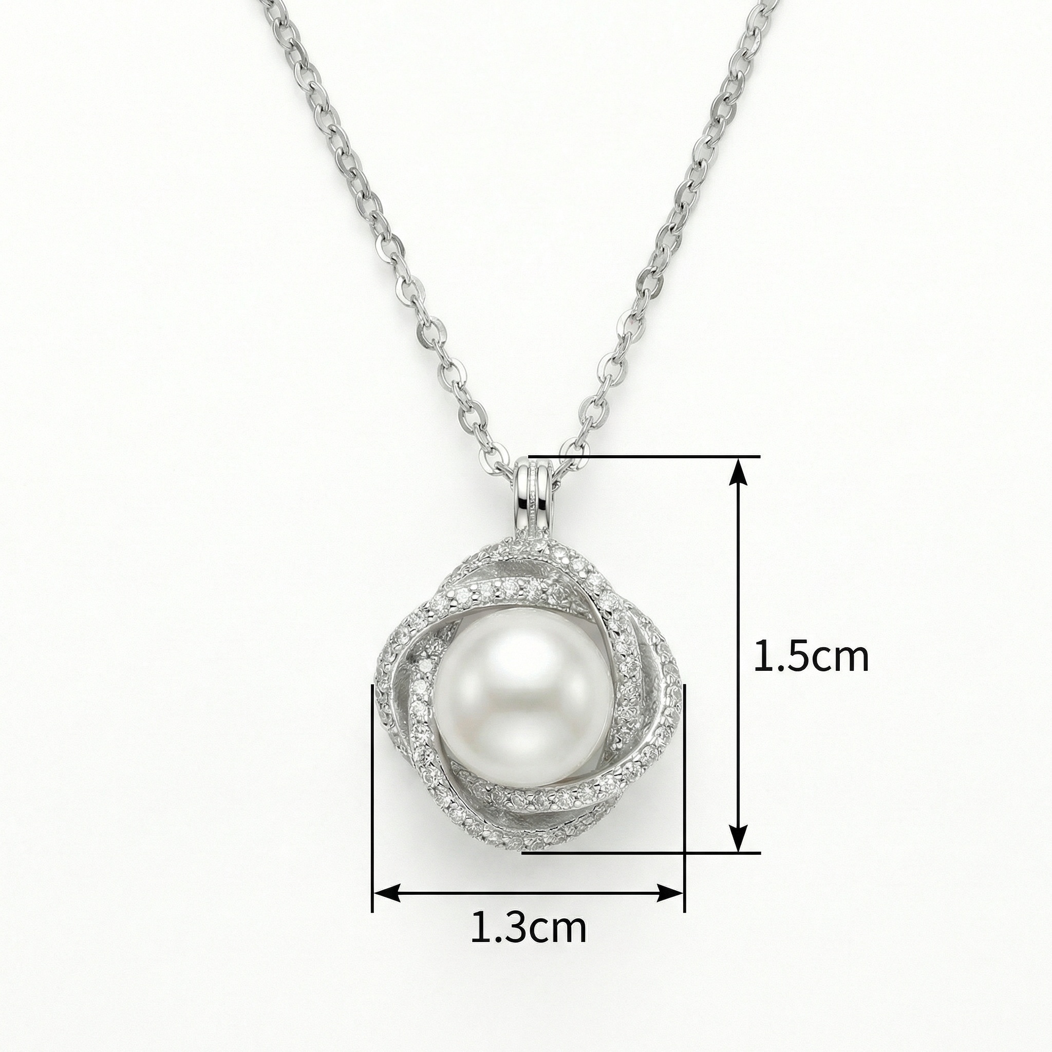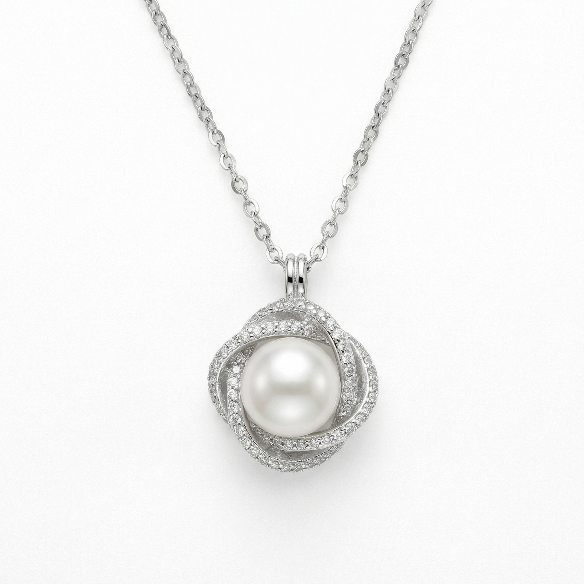This exquisite necklace features a luminous white pearl cradled within a sophisticated swirl of sterling silver. The intricate, interlocking design is meticulously pavé-set with shimmering crystals that catch the light from every angle, creating a halo of brilliance around the central gem. Hanging gracefully from a delicate link chain, this pendant offers a perfect blend of timeless elegance and contemporary flair. Whether worn as a bridal accessory or a statement piece for a special occasion, its refined craftsmanship and classic appeal make it a versatile addition to any jewelry collection. The lustrous sheen of the pearl combined with the sparkling accents ensures it will be a cherished gift or a beautiful personal keepsake for years to come. | Brand: jewelryodm