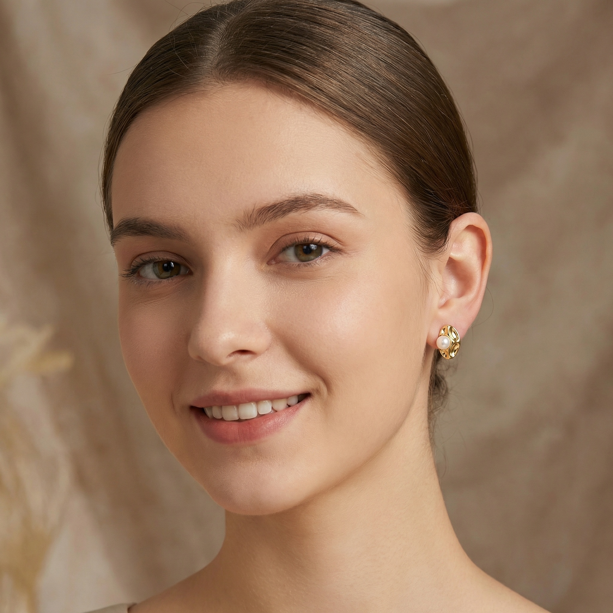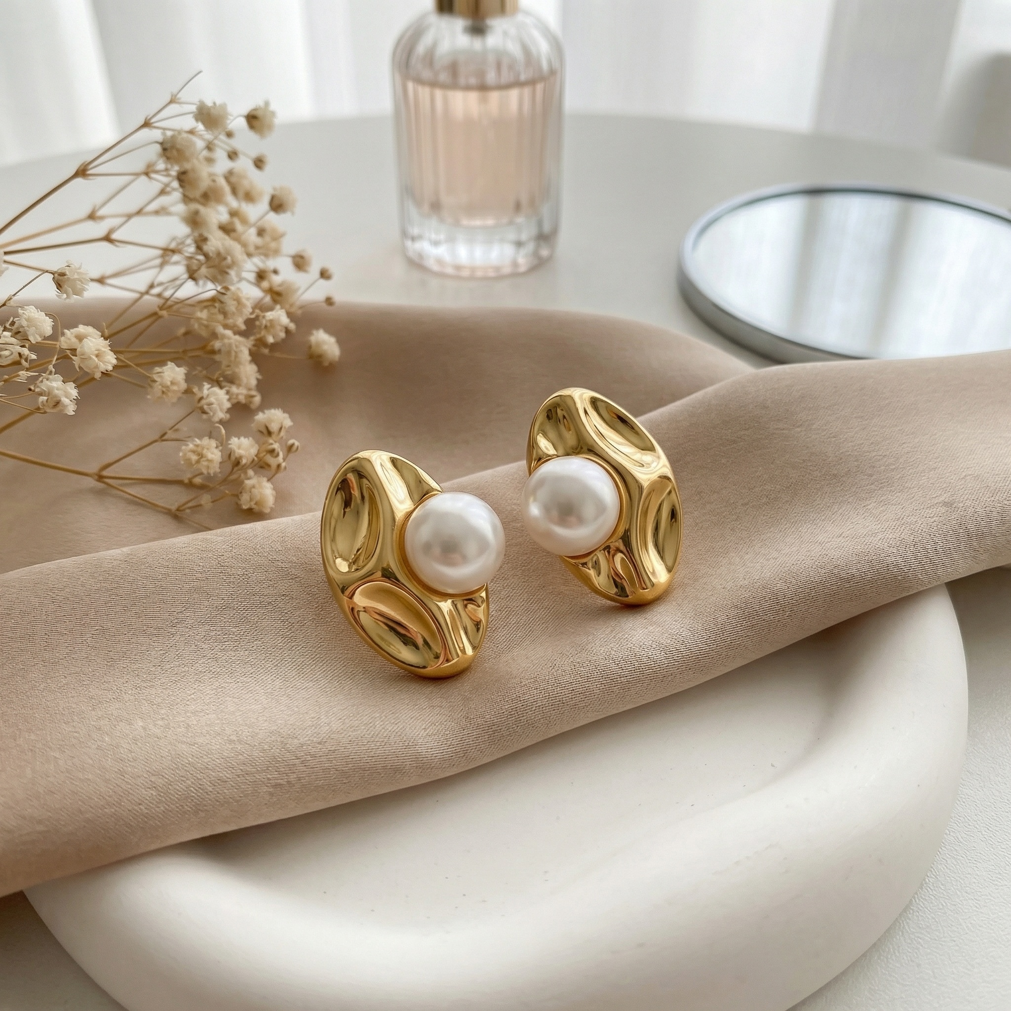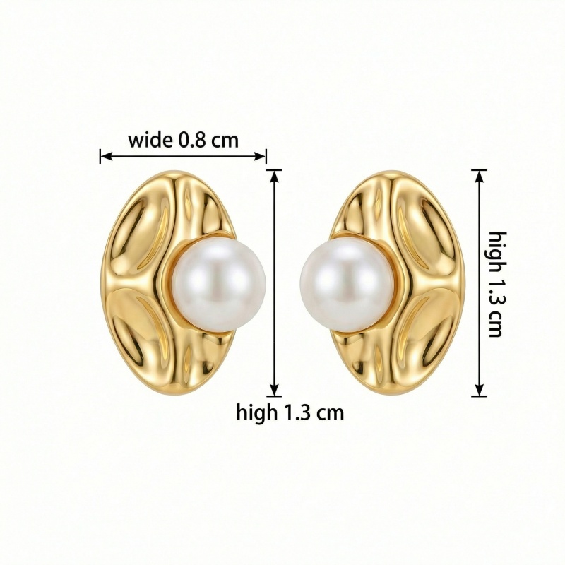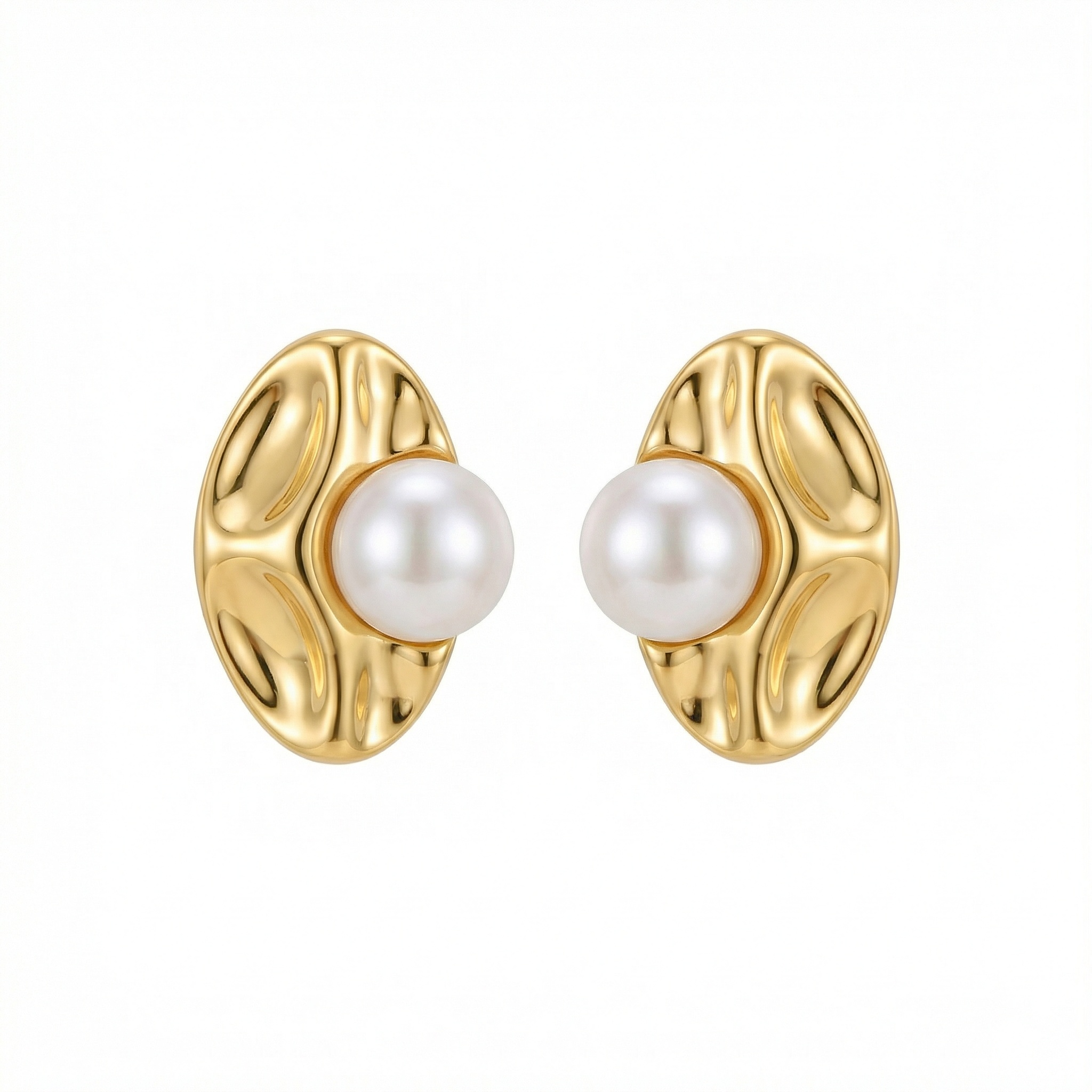 These sophisticated earrings feature a bold oval design with a unique, liquid-like texture. The high-polish metallic finish catches the light beautifully, emphasizing the artistic ripples of the base. At the heart of each piece sits a luminous, perfectly round white pearl, adding a touch of timeless elegance to the modern aesthetic. The contrast between the organic metallic curves and the smooth, iridescent surface of the pearl creates a striking visual balance. Perfect for both formal occasions and elevating everyday ensembles, these statement studs offer a vintage-inspired yet contemporary feel. They are designed to sit comfortably against the ear, providing a luxurious radiance that complements any complexion. Whether paired with a classic little black dress or a casual chic outfit, these earrings are a versatile and eye-catching addition to any jewelry collection. | Brand: jewelryodm