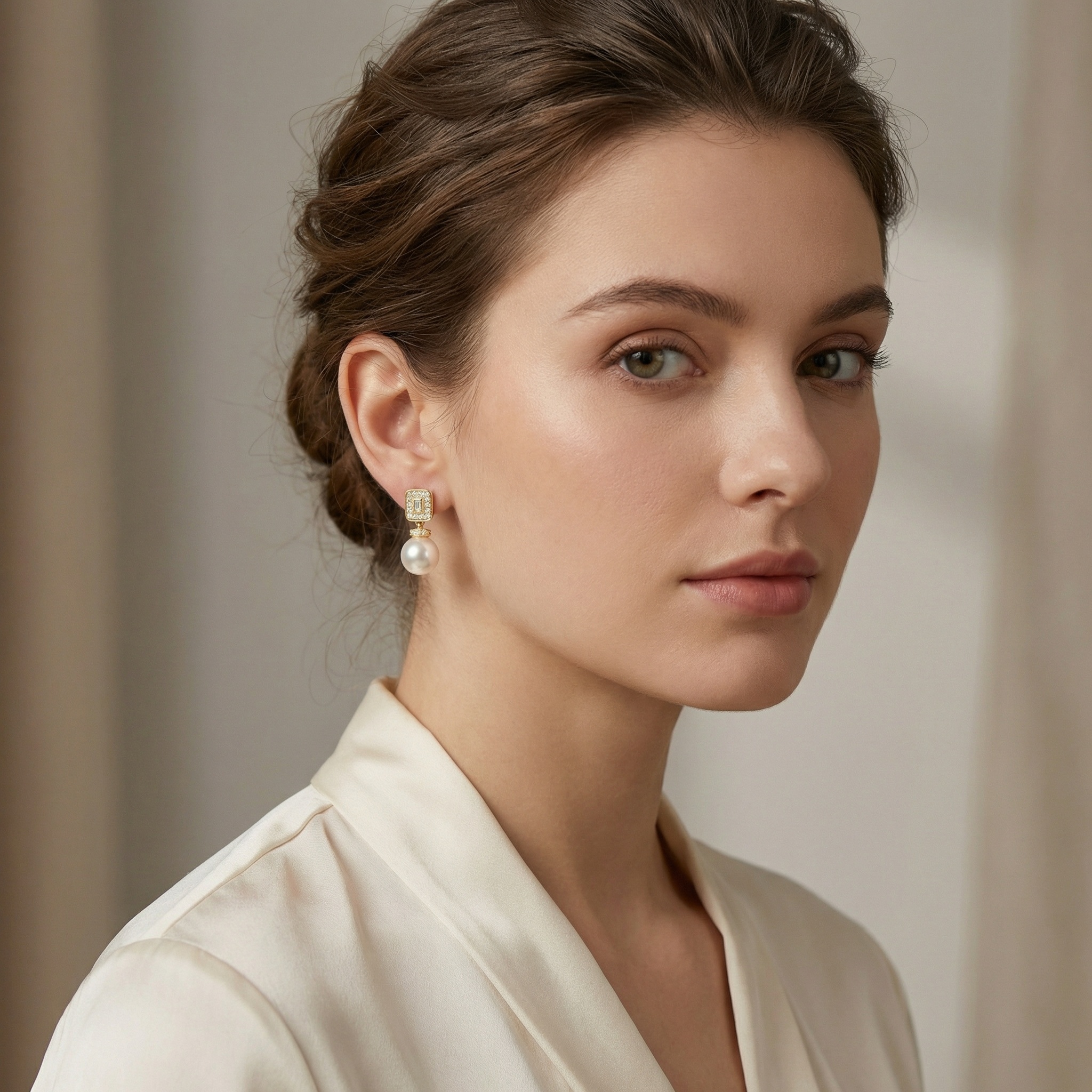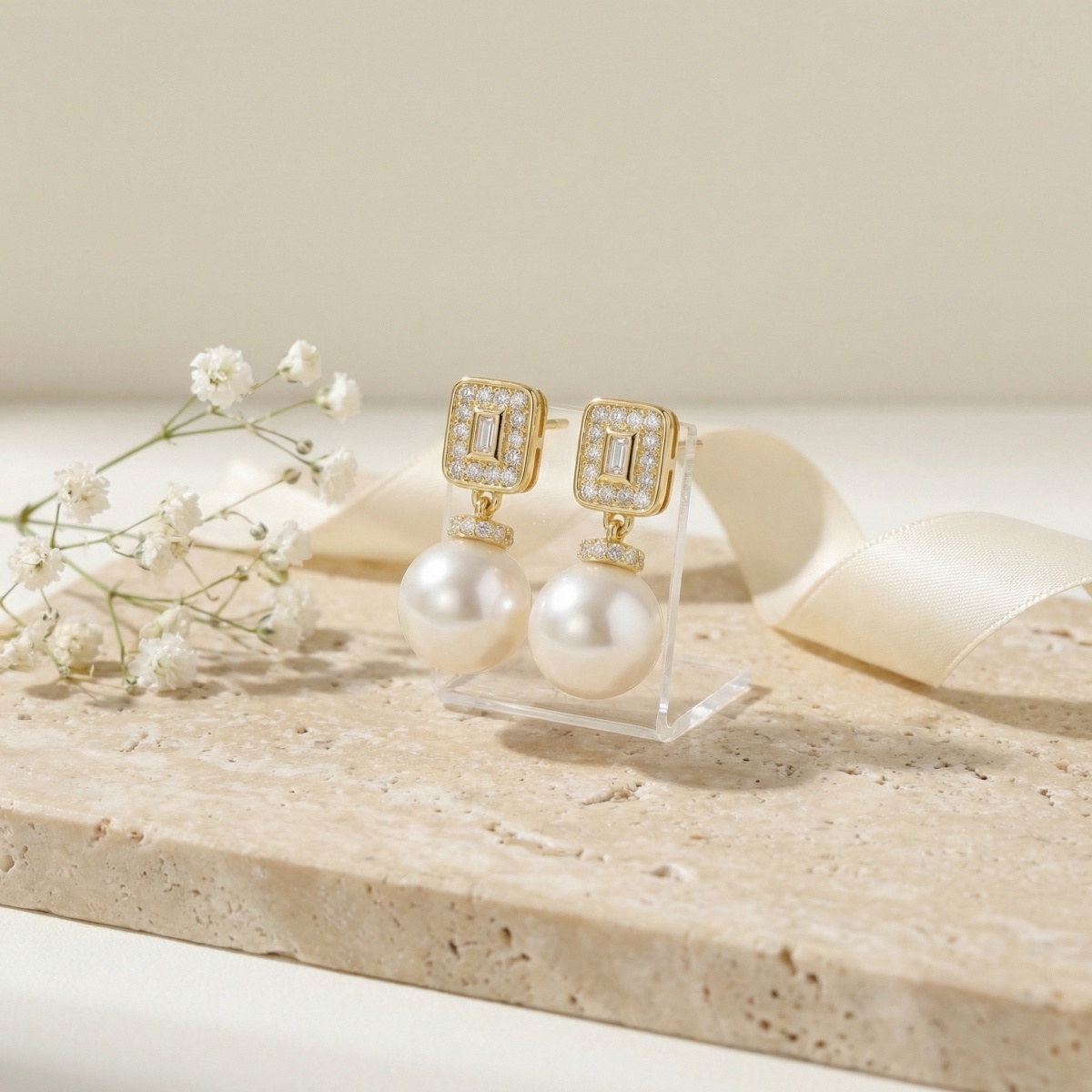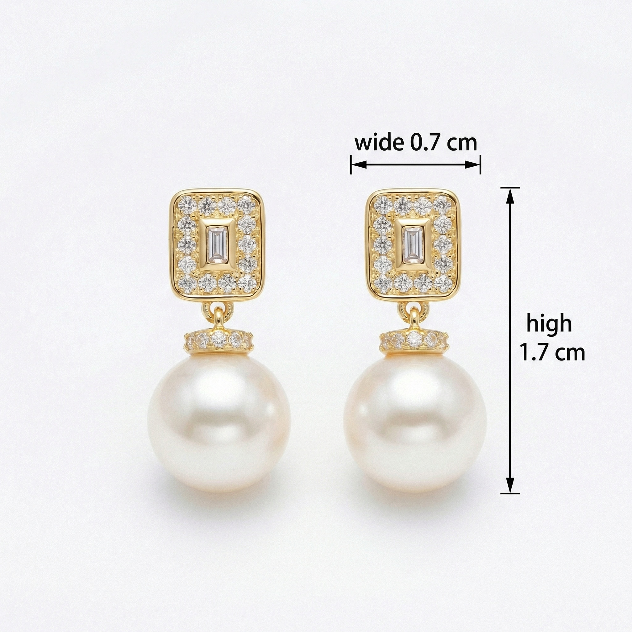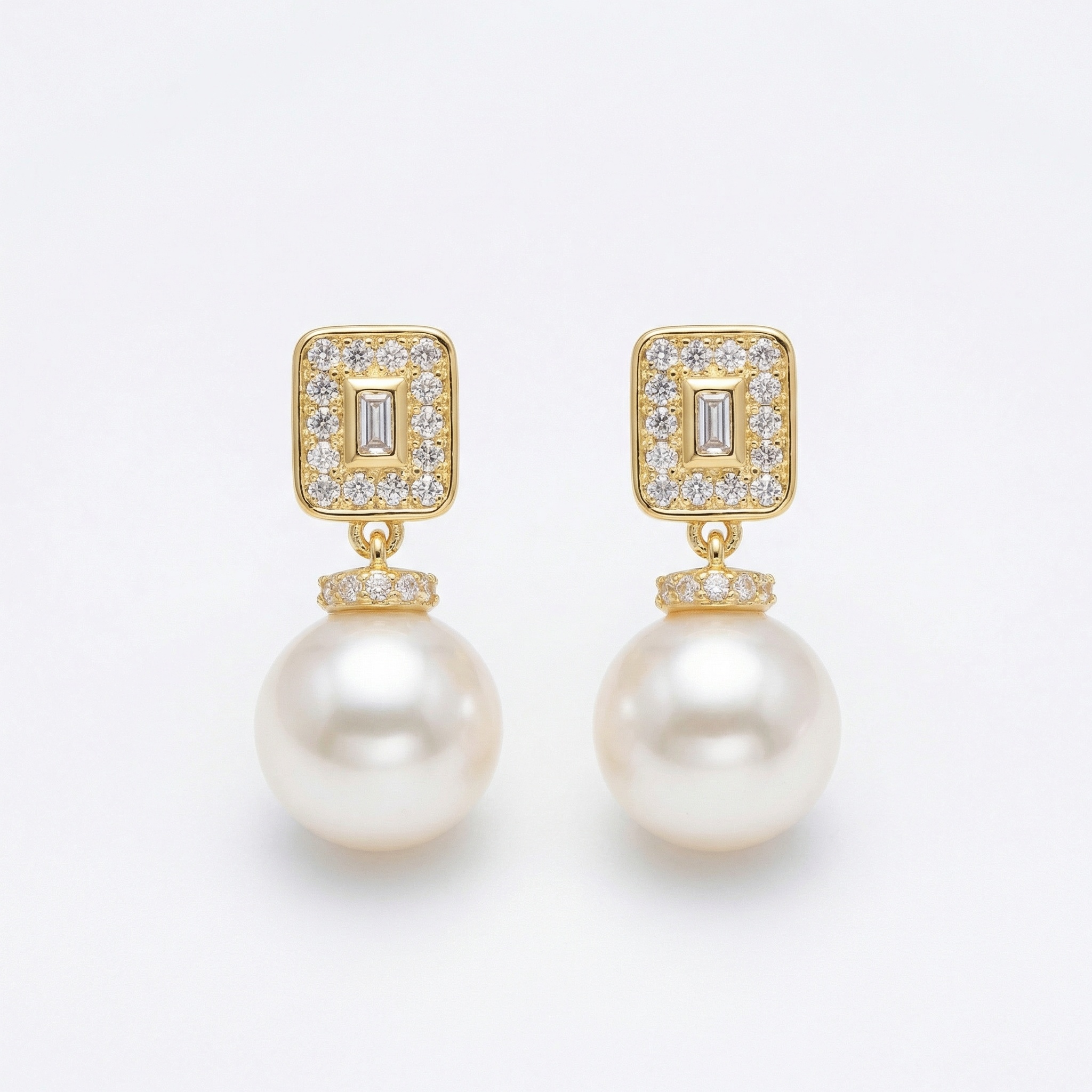 These exquisite drop earrings combine timeless elegance with modern geometric design. Each piece features a lustrous, round white pearl suspended from a sophisticated rectangular stud. The upper setting highlights a central baguette-cut gemstone surrounded by a halo of brilliant round-cut accents. A delicate, stone-encrusted cap meticulously bridges the pearl to the stud, ensuring a seamless and luxurious finish. Crafted in a warm-toned setting, these earrings offer a radiant glow that complements any complexion. Perfect for brides or special occasions, this design balances structured lines with soft, natural curves for a truly refined aesthetic that captures the light from every angle. | Brand: jewelryodm