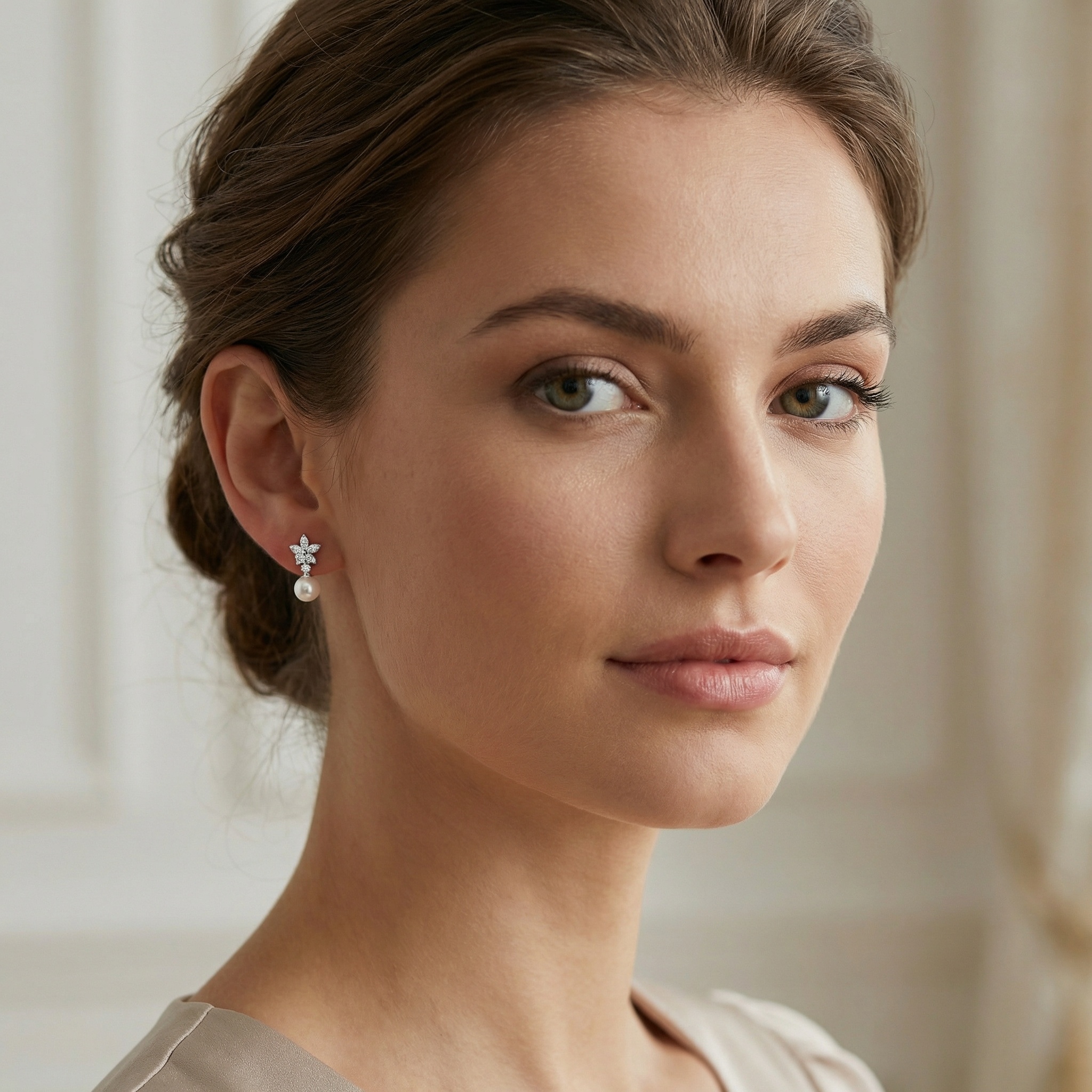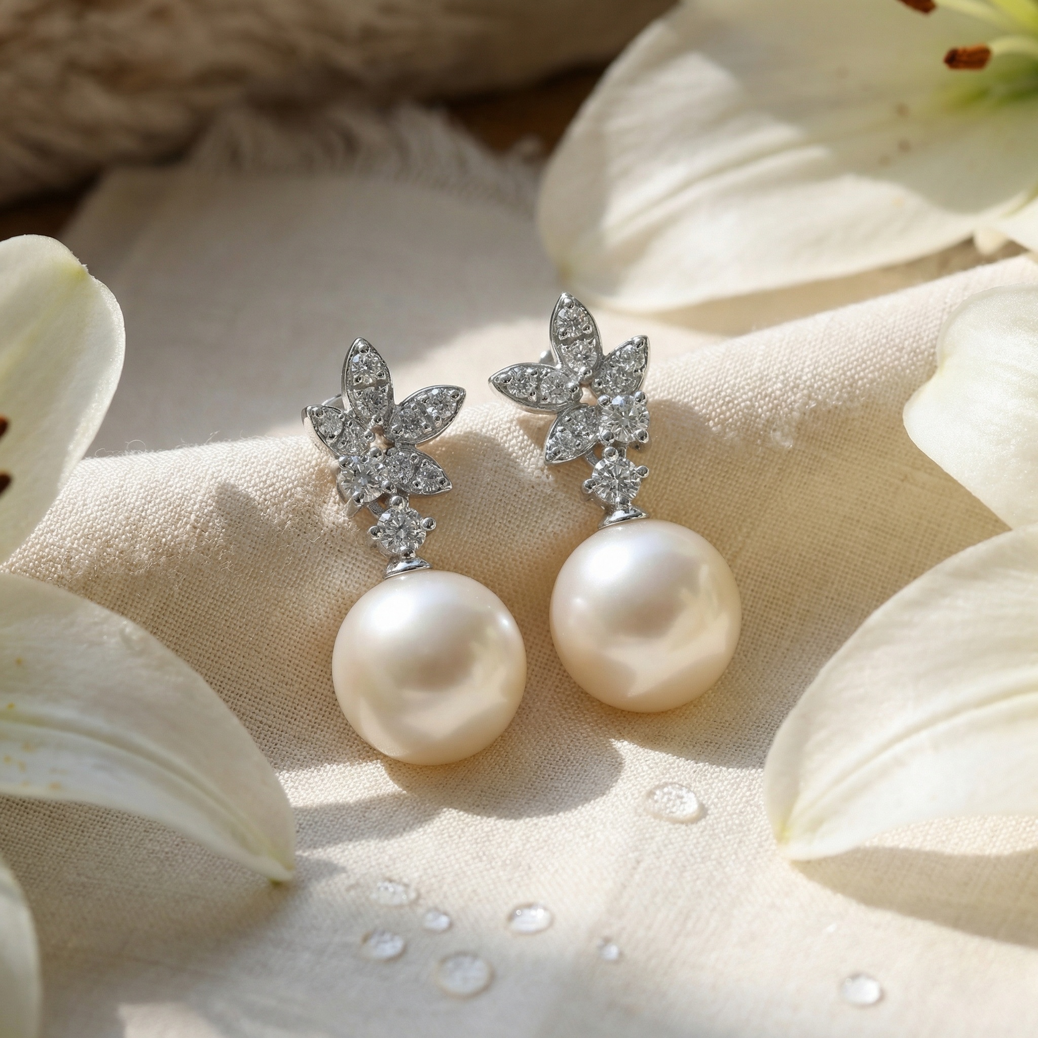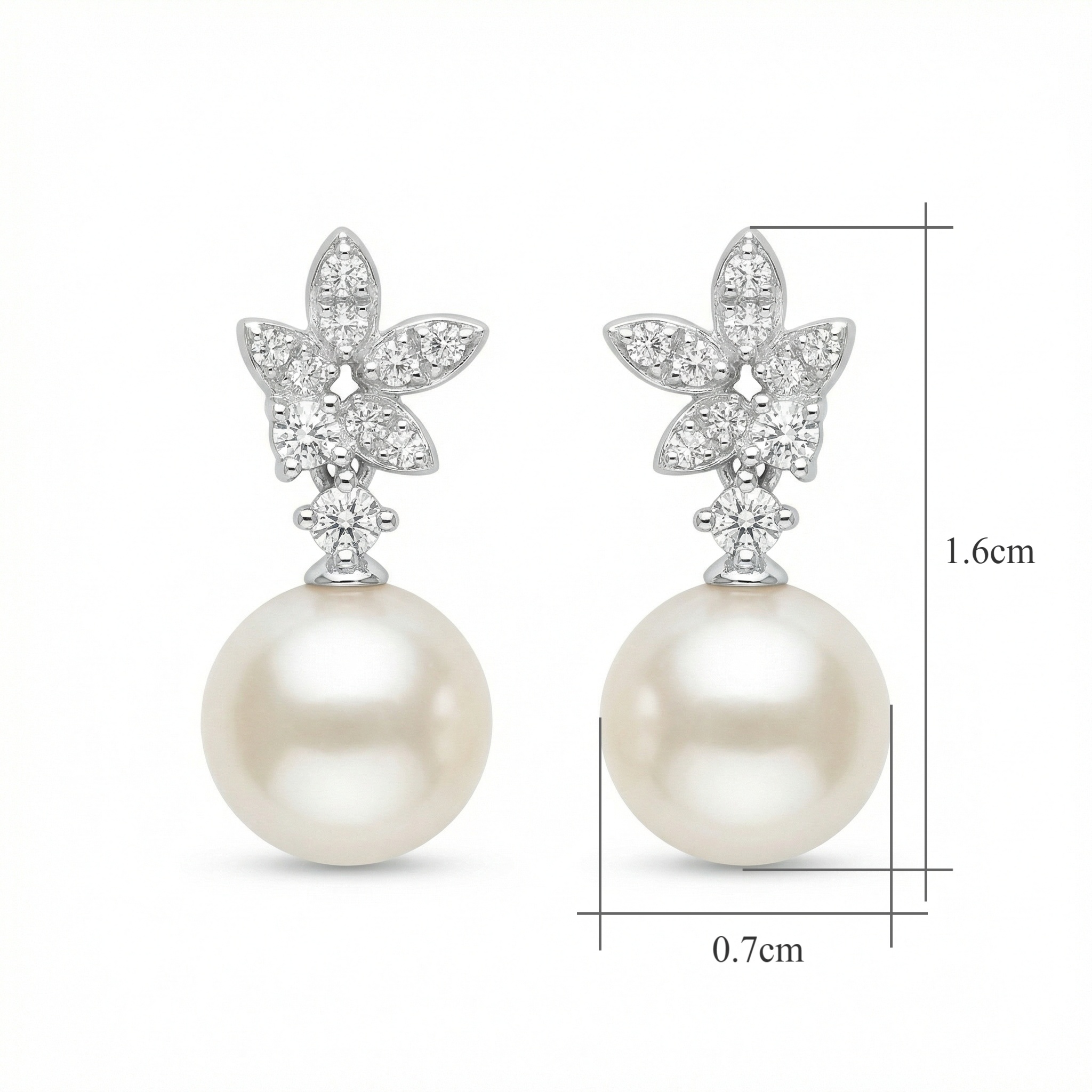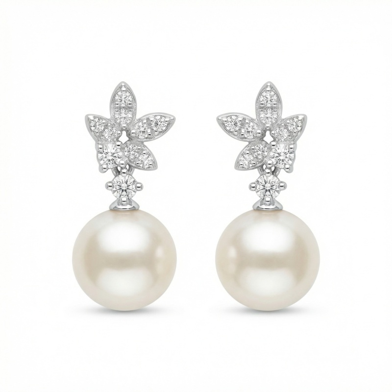 These exquisite earrings feature a pair of lustrous white pearls suspended from a sophisticated diamond-encrusted floral motif. Each delicate leaf-like element is adorned with brilliant-cut round diamonds, creating a radiant sparkle that beautifully complements the soft glow of the pearls. The timeless drop design offers a refined aesthetic, perfect for bridal wear, formal occasions, or as a luxurious statement piece for evening attire. Expertly crafted with a polished silver-toned finish, these earrings strike a perfect balance between classic charm and modern elegance. Designed to capture light and attention, this stunning pair makes an ideal gift for celebrating milestones or enhancing a sophisticated jewelry collection. | Brand: jewelryodm