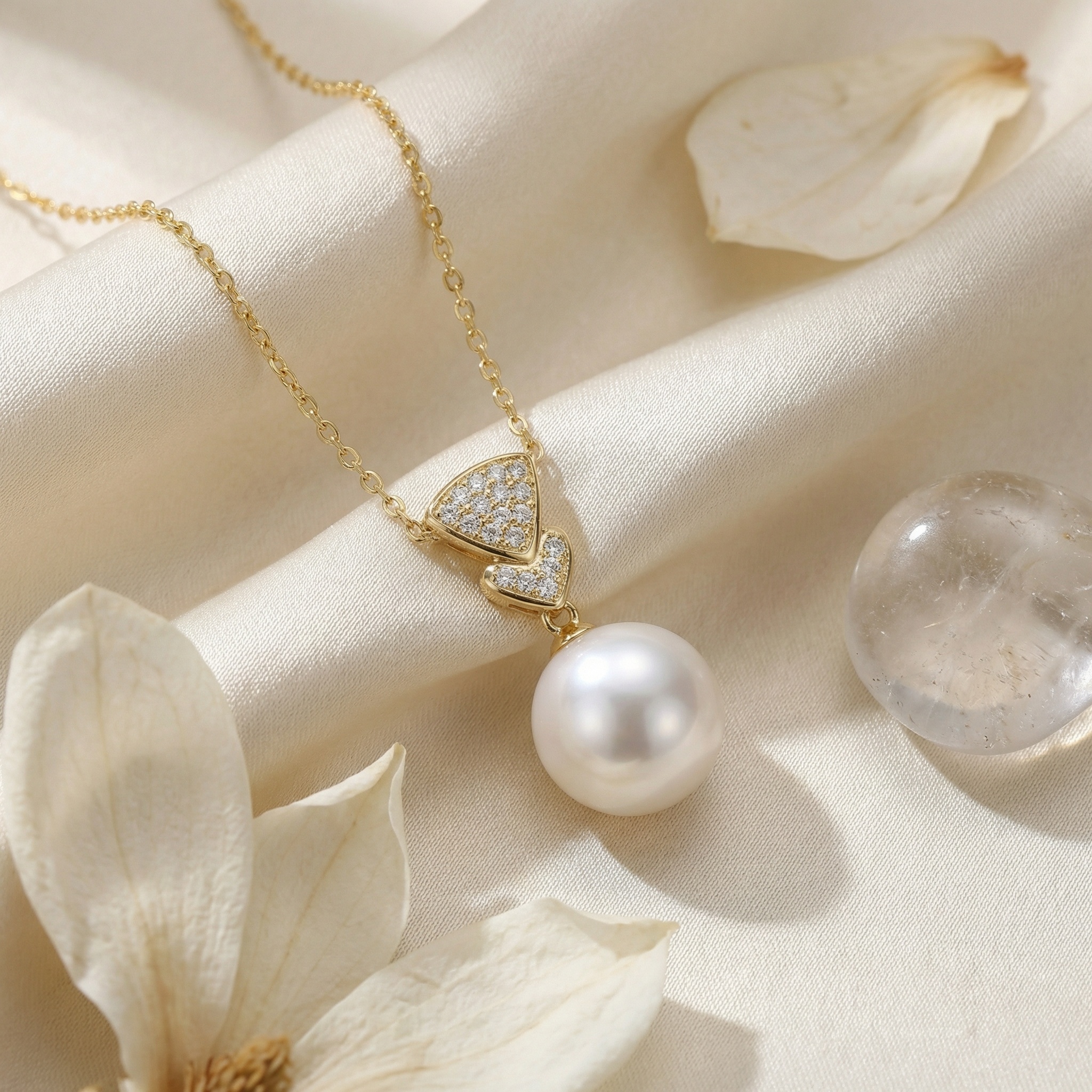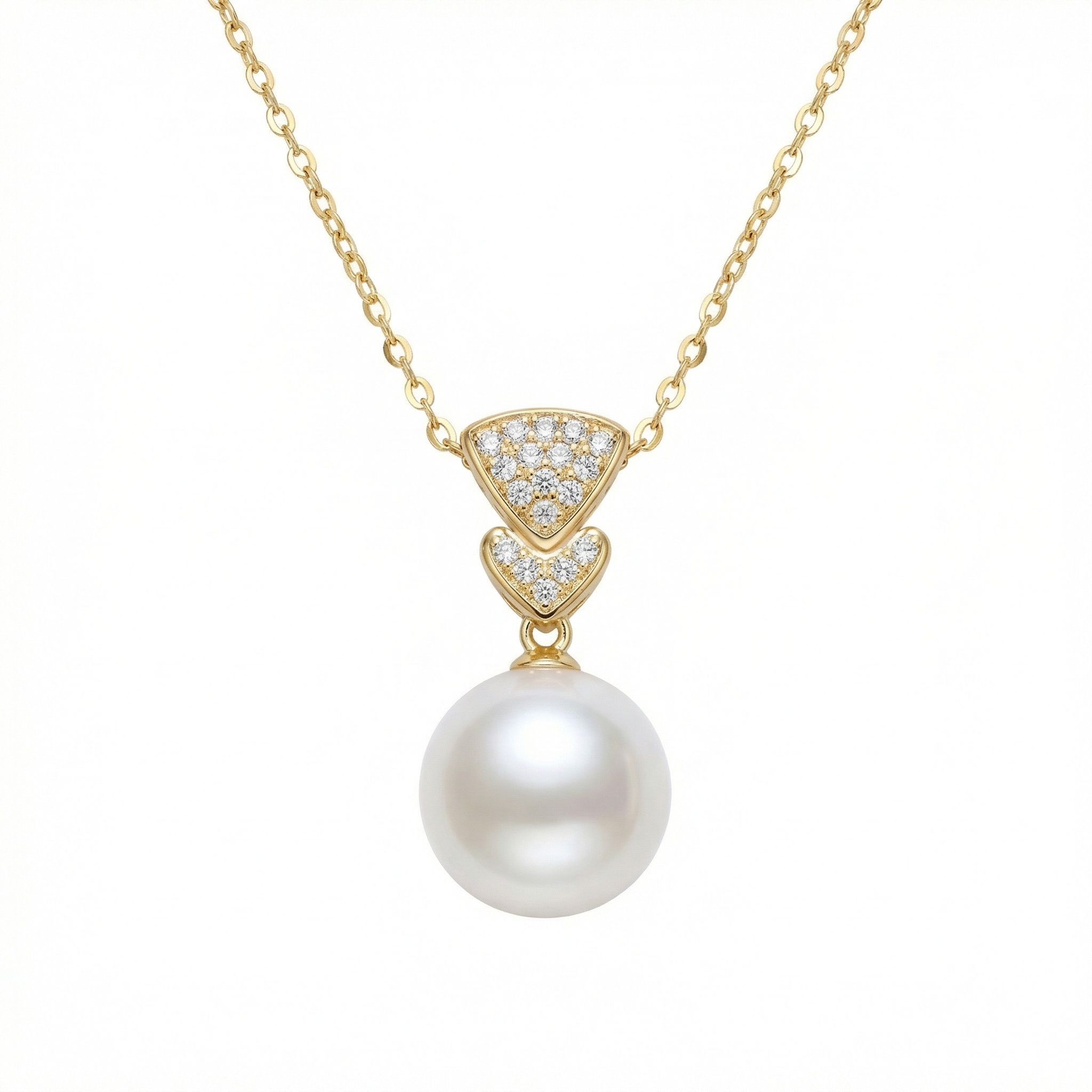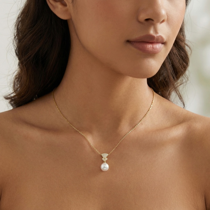 This stunning necklace features a large, luminous white pearl suspended from a sophisticated pendant design. The upper portion showcases a fan-shaped motif encrusted with brilliant-cut diamonds, followed by a smaller diamond-studded chevron piece. Crafted in a warm-toned precious metal, the piece exudes luxury and timeless charm. The high luster of the pearl perfectly complements the sparkle of the small gemstones, making it an ideal choice for special occasions or a refined everyday look. The delicate chain adds a touch of grace to the overall design, ensuring the focus remains on the exquisite centerpiece. Whether worn as a statement piece or as part of a layered ensemble, this necklace is a testament to classic elegance and fine craftsmanship. | Brand: jewelryodm