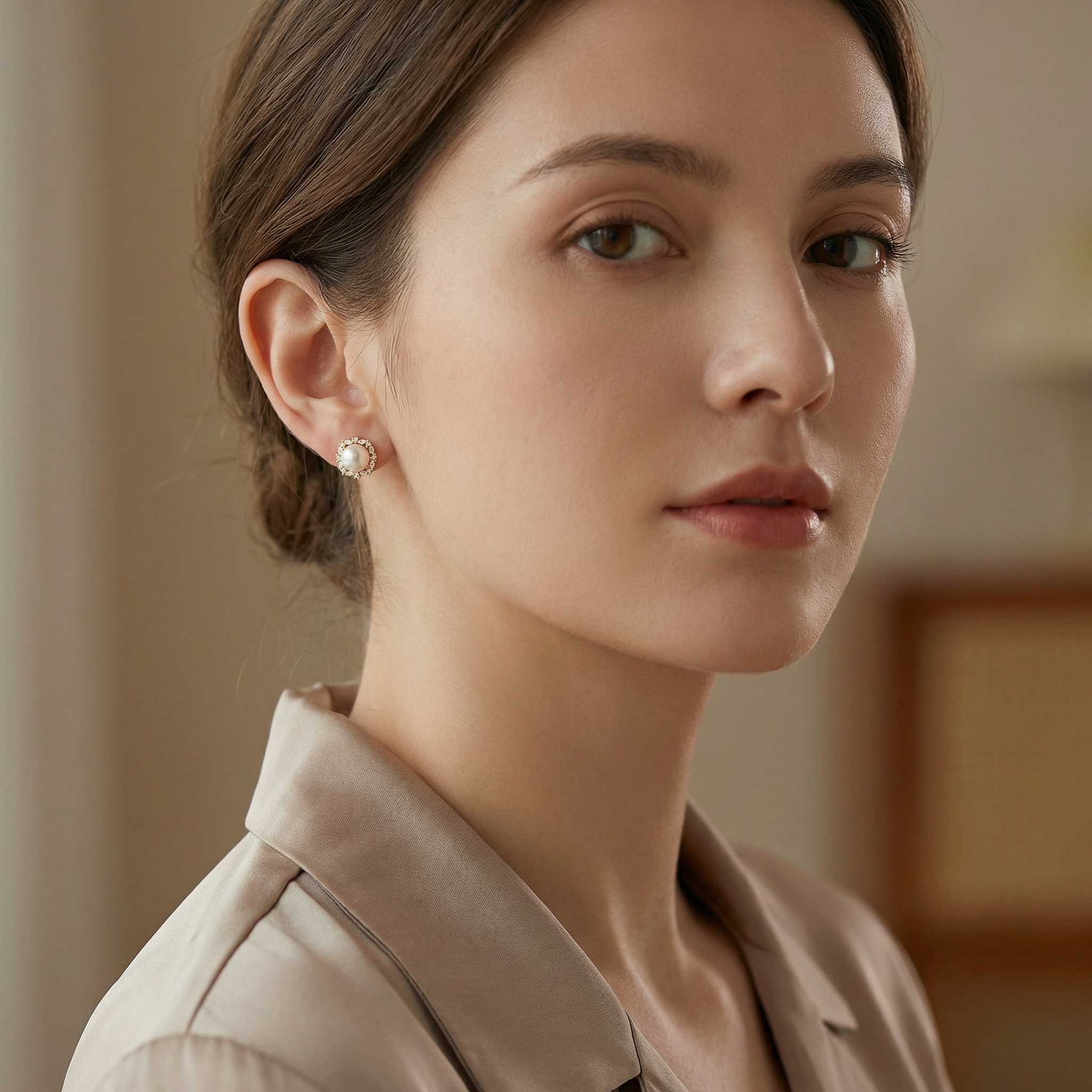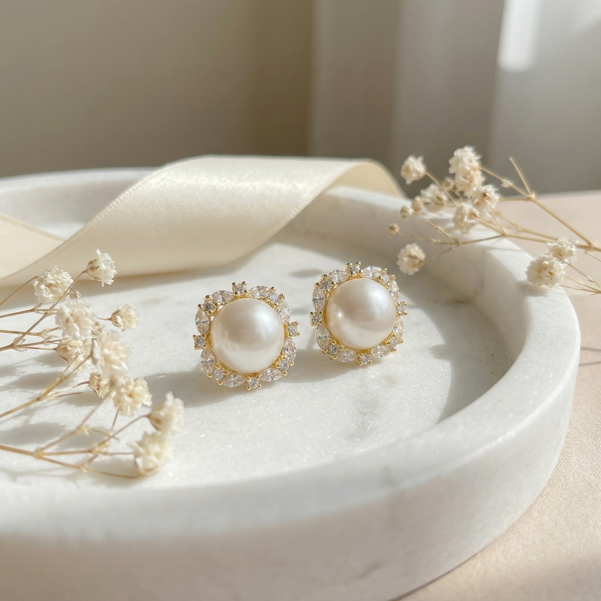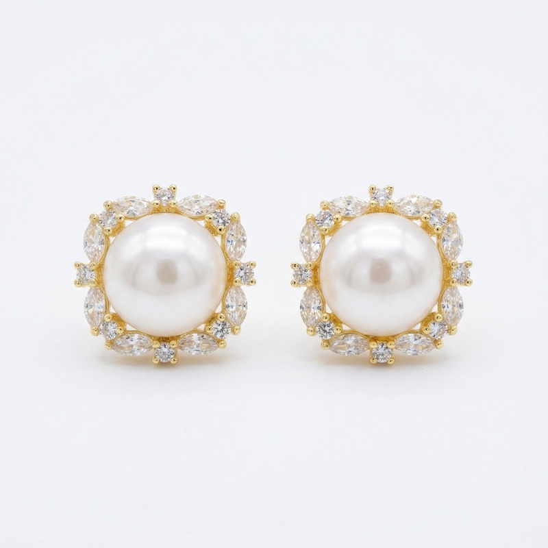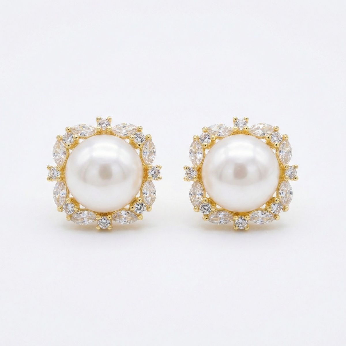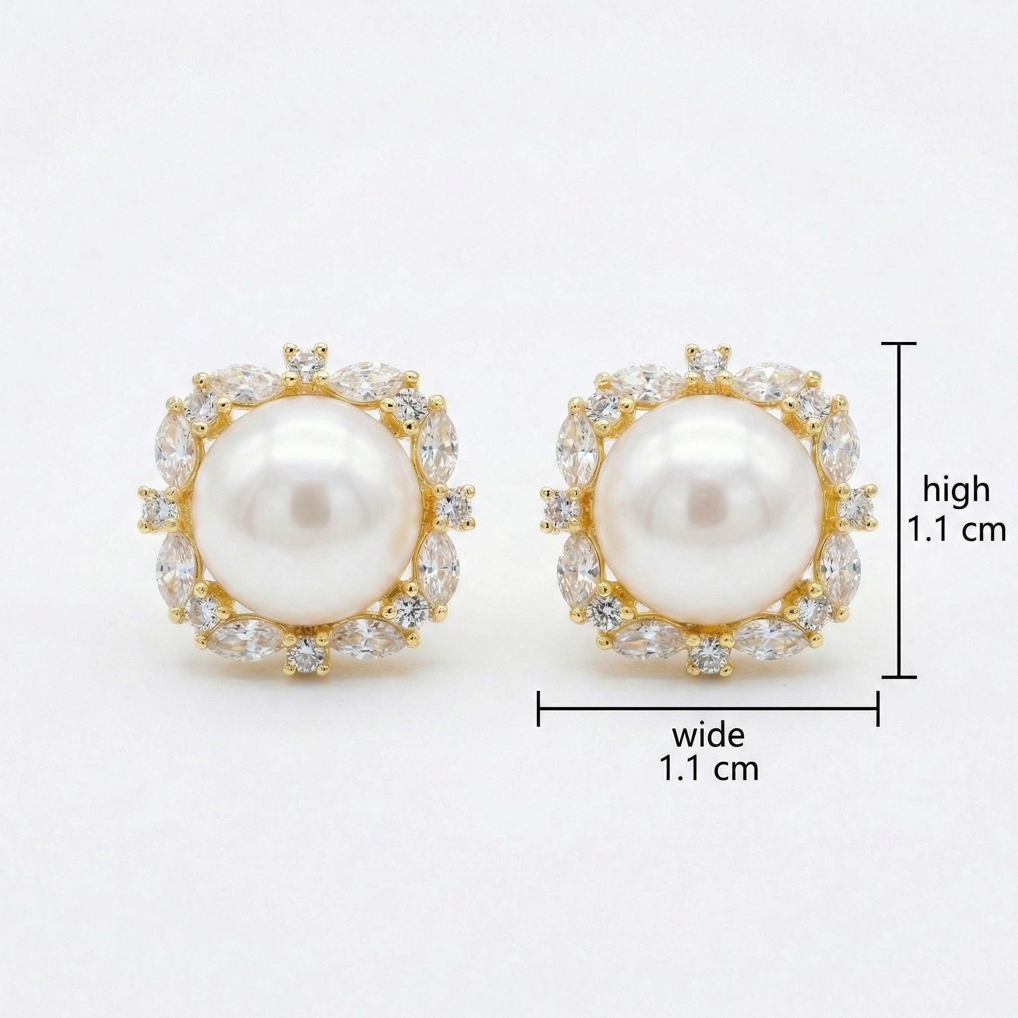 These exquisite stud earrings showcase a stunning central white pearl, renowned for its smooth texture and luminous sheen. Each pearl is meticulously framed by a sophisticated square-shaped halo, artfully arranged with a combination of marquise-cut and brilliant round-cut sparkling stones. The contrast between the soft glow of the pearl and the sharp brilliance of the surrounding accents creates a captivating visual appeal. Crafted with a polished yellow metallic finish, these earrings offer a timeless elegance that complements both formal attire and everyday wear. Their secure backing ensures comfort and stability, making them a perfect gift for special occasions or a luxurious addition to any jewelry collection. Elevate your style with these classic pieces that blend traditional charm with modern geometric design, ensuring you shine from every angle. | Brand: jewelryodm