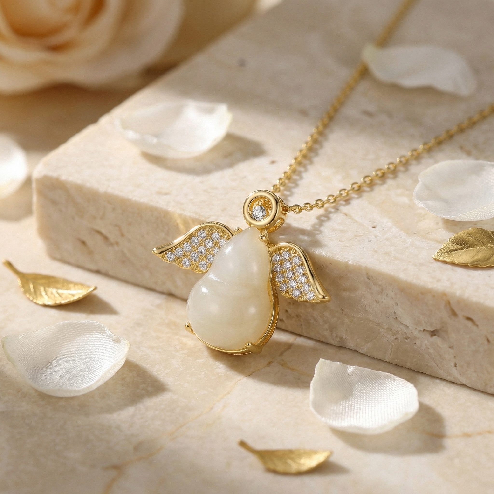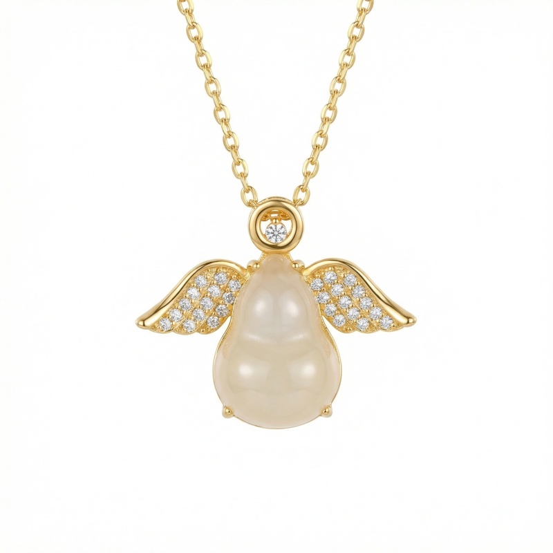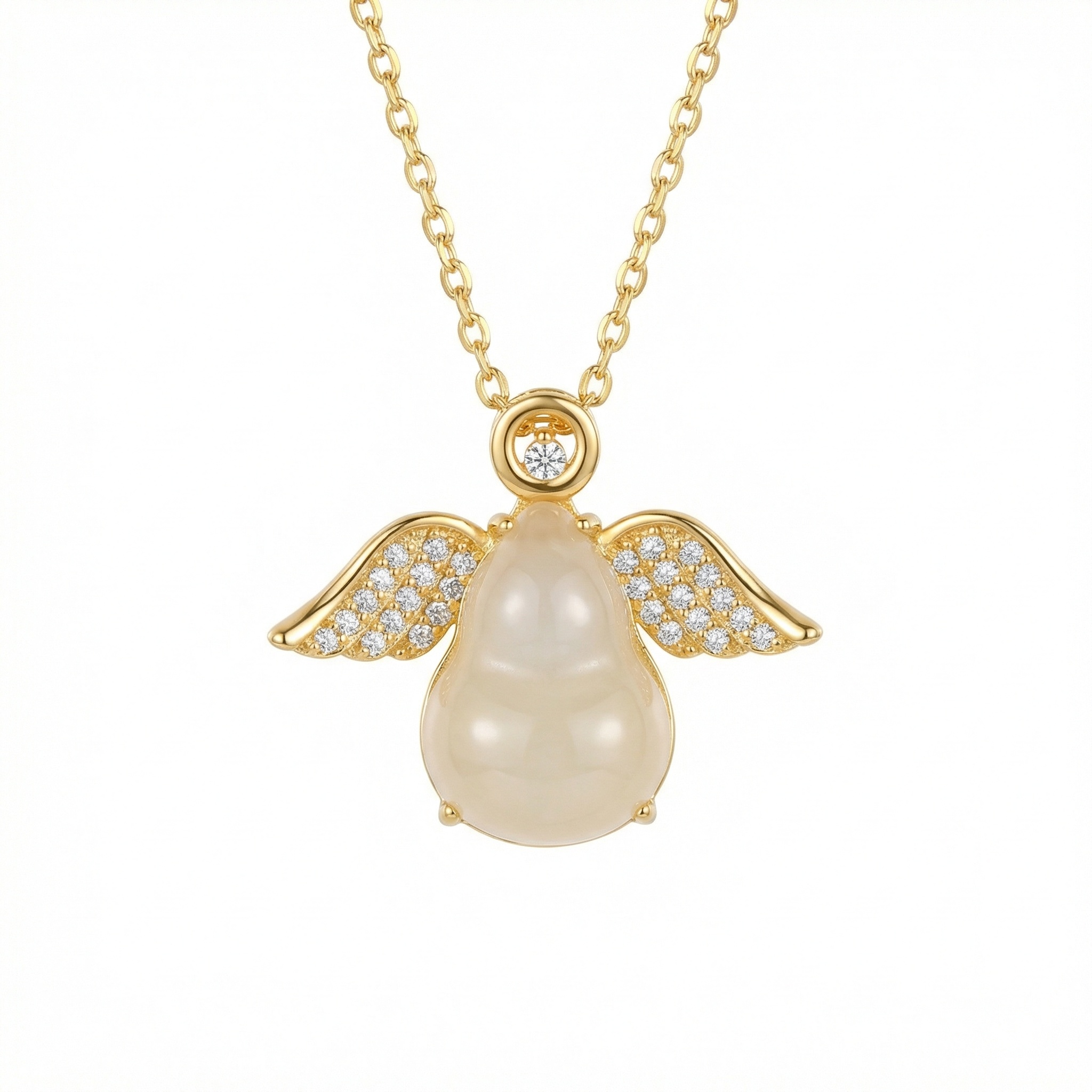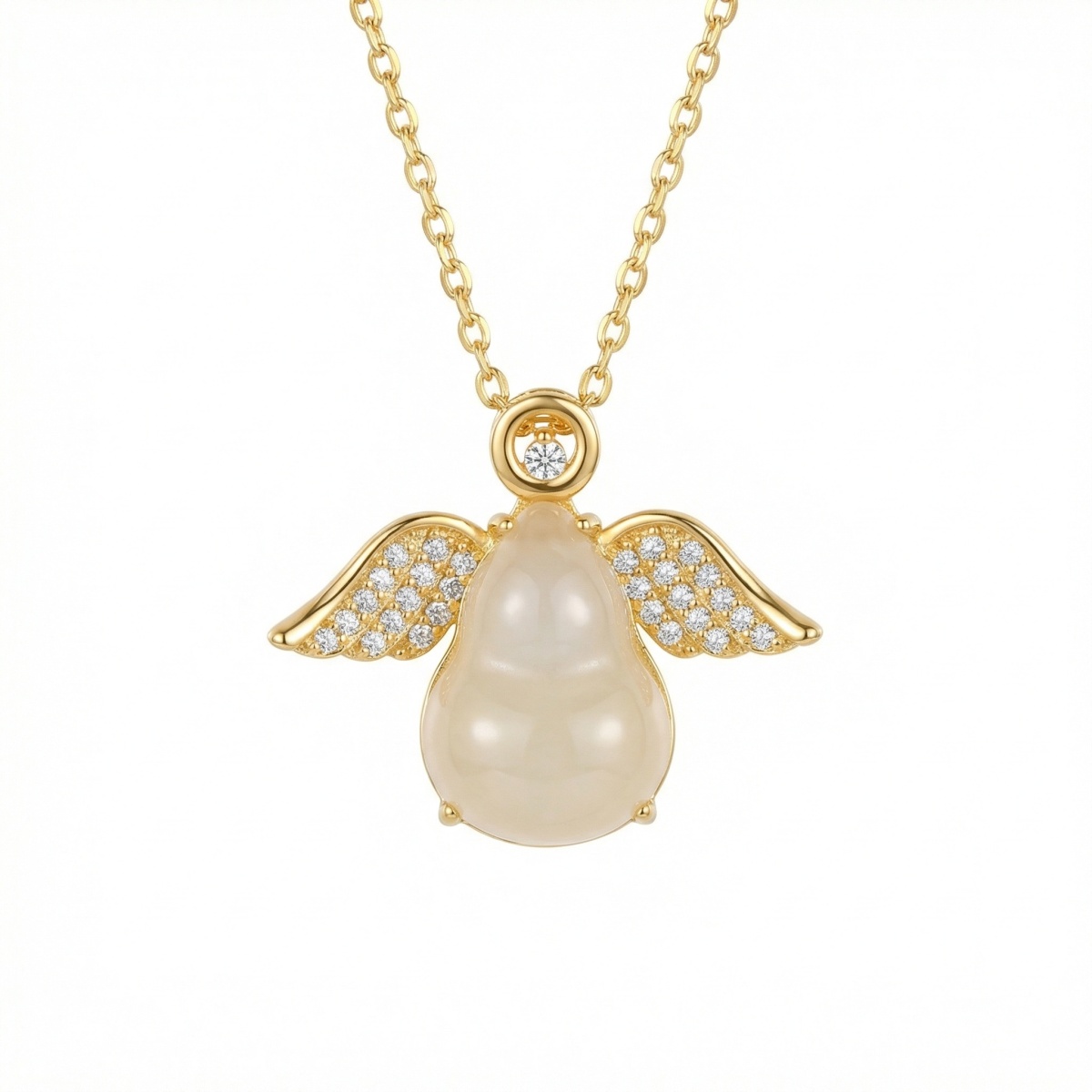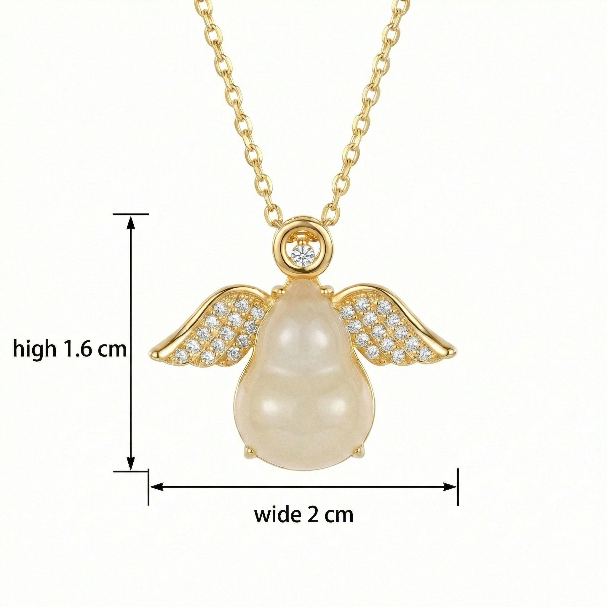 This exquisite necklace showcases a unique design blending tradition and modernity. At its heart lies a beautifully polished, translucent pear-shaped stone, reminiscent of a classic hulu or gourd, symbolizing health and prosperity. Adorning each side are delicate angel wings intricately pavé-set with shimmering crystals that catch the light from every angle. The top features a small, circular bail set with a single sparkling stone, adding an extra touch of brilliance. Suspended from a dainty link chain, this piece offers a timeless and spiritual aesthetic. Crafted with meticulous attention to detail, the warm metallic finish complements the soft glow of the central gemstone perfectly. This pendant is an ideal accessory for those seeking a meaningful piece that combines elegance with symbolic depth, making it a perfect gift or a special addition to any jewelry collection. | Brand: jewelryodm