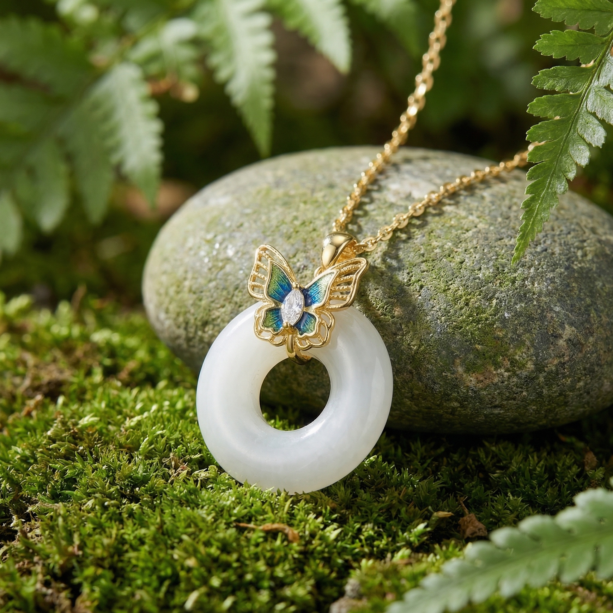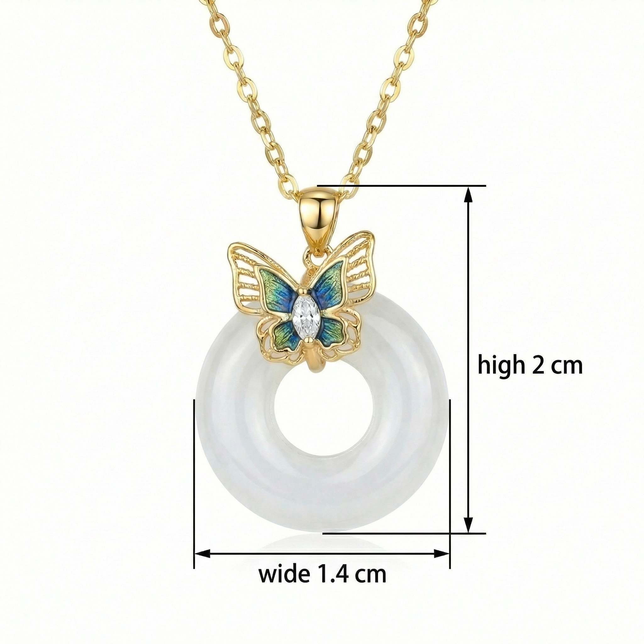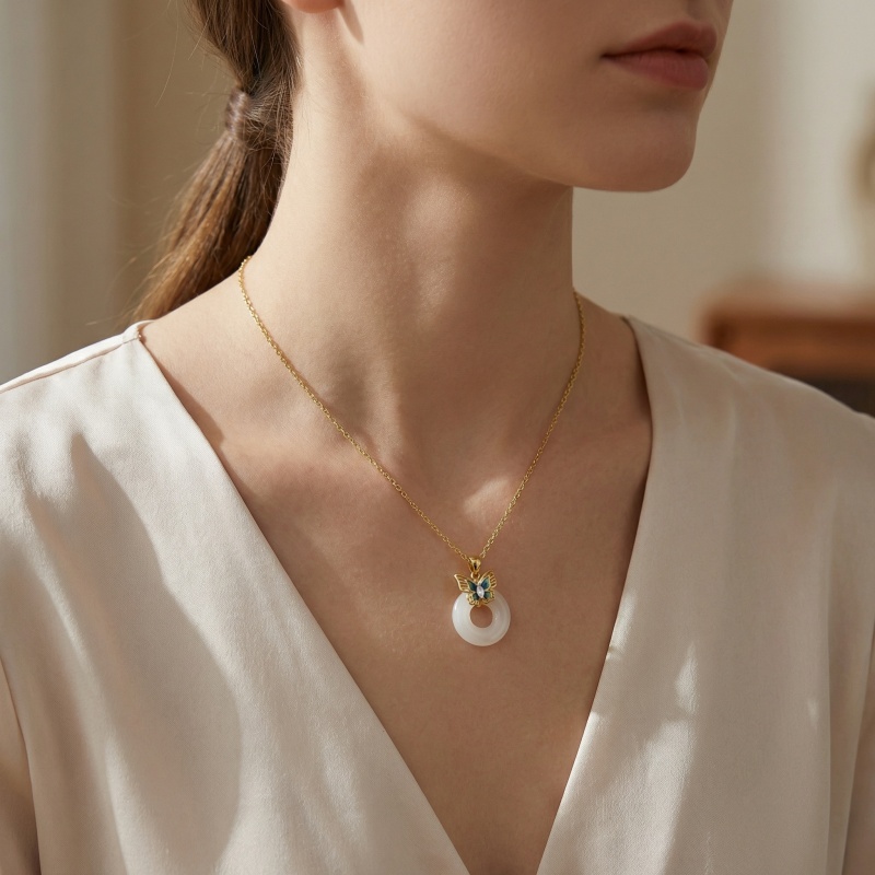 【Delivery Includes】 1 x Butterfly Jade Ring Necklace with Cubic Zirconia Oval Pendant 1 x Elegant Gift Box 1 x Jewelry Cleaning Cloth 【Care Instructions】 1. Store your necklace in a soft pouch or jewelry box to prevent scratches and tarnishing. 2. Avoid contact with harsh chemicals, perfume, and excessive moisture to maintain the necklace's shine. 3. Gently wipe the jewelry with the included cleaning cloth after each wear. 4. Remove the necklace before swimming, bathing, or exercising. 5. Minimize exposure to direct sunlight for long periods to preserve gemstone brilliance. | Brand: jewelryodm
