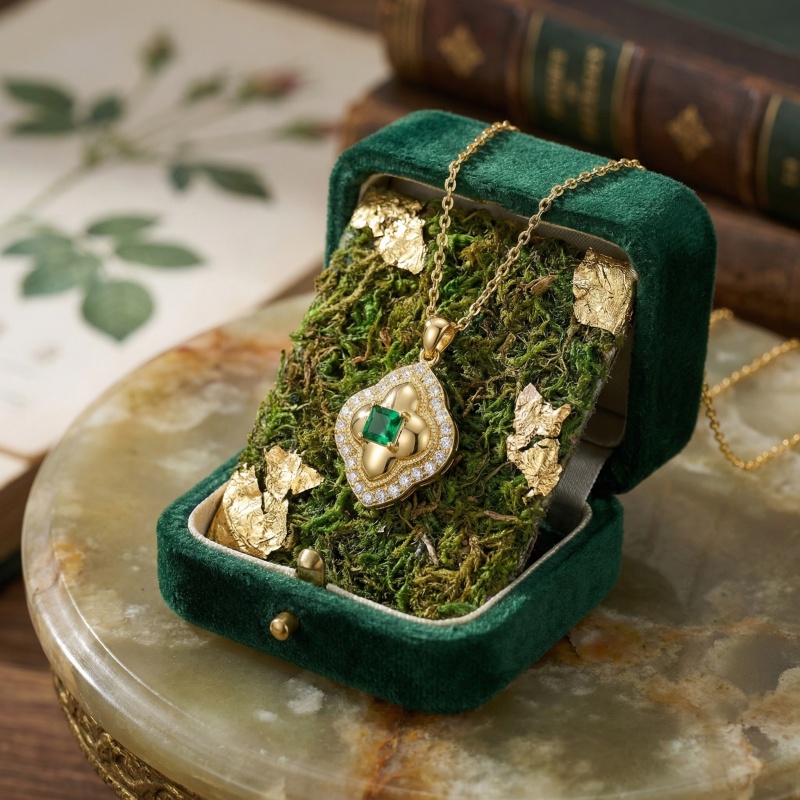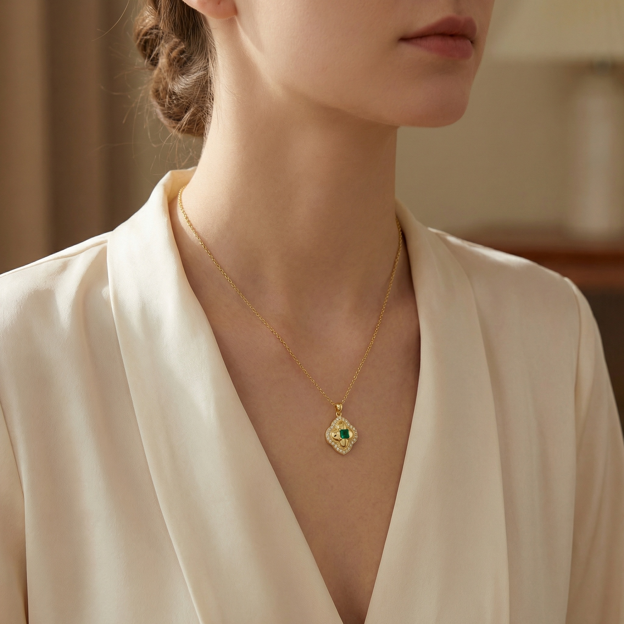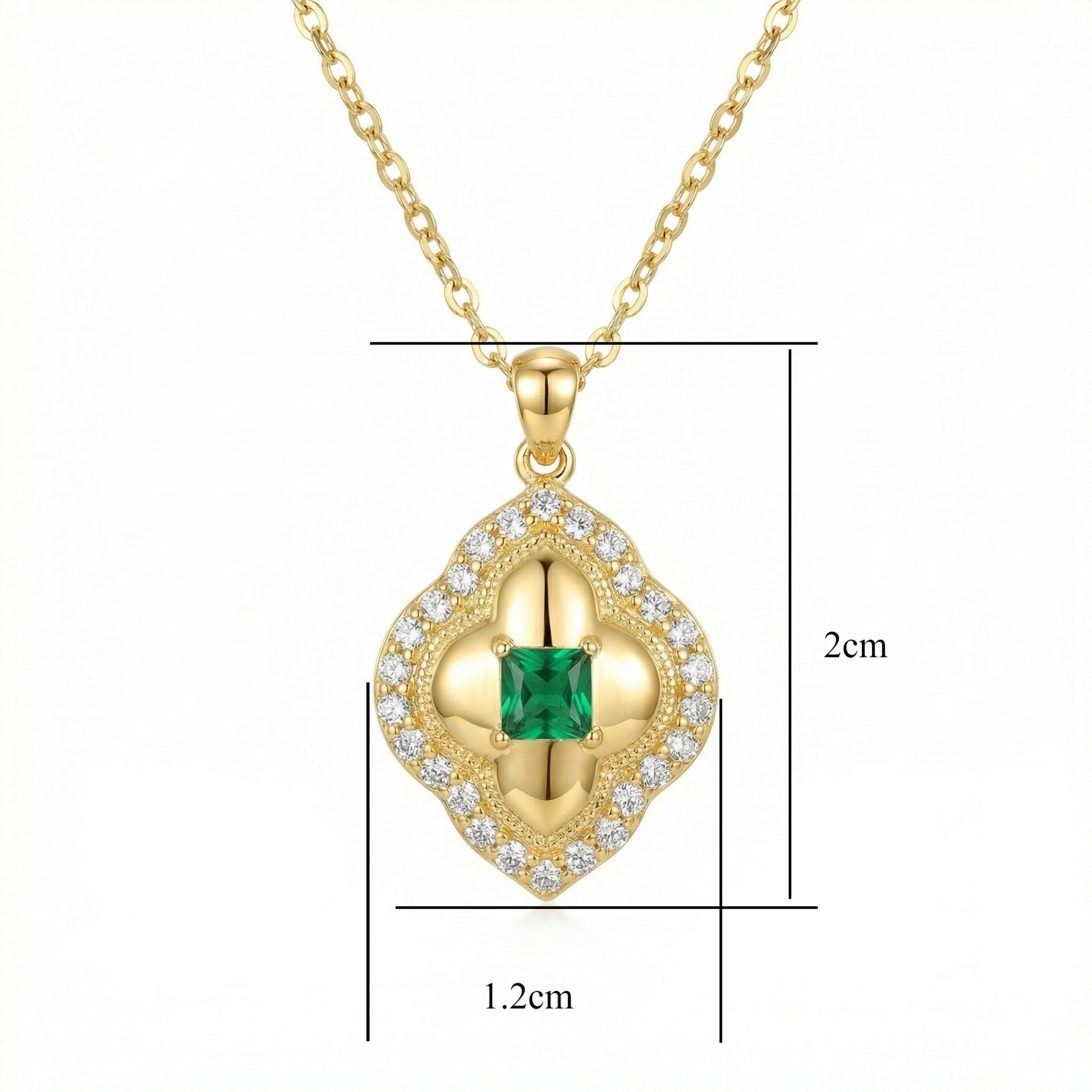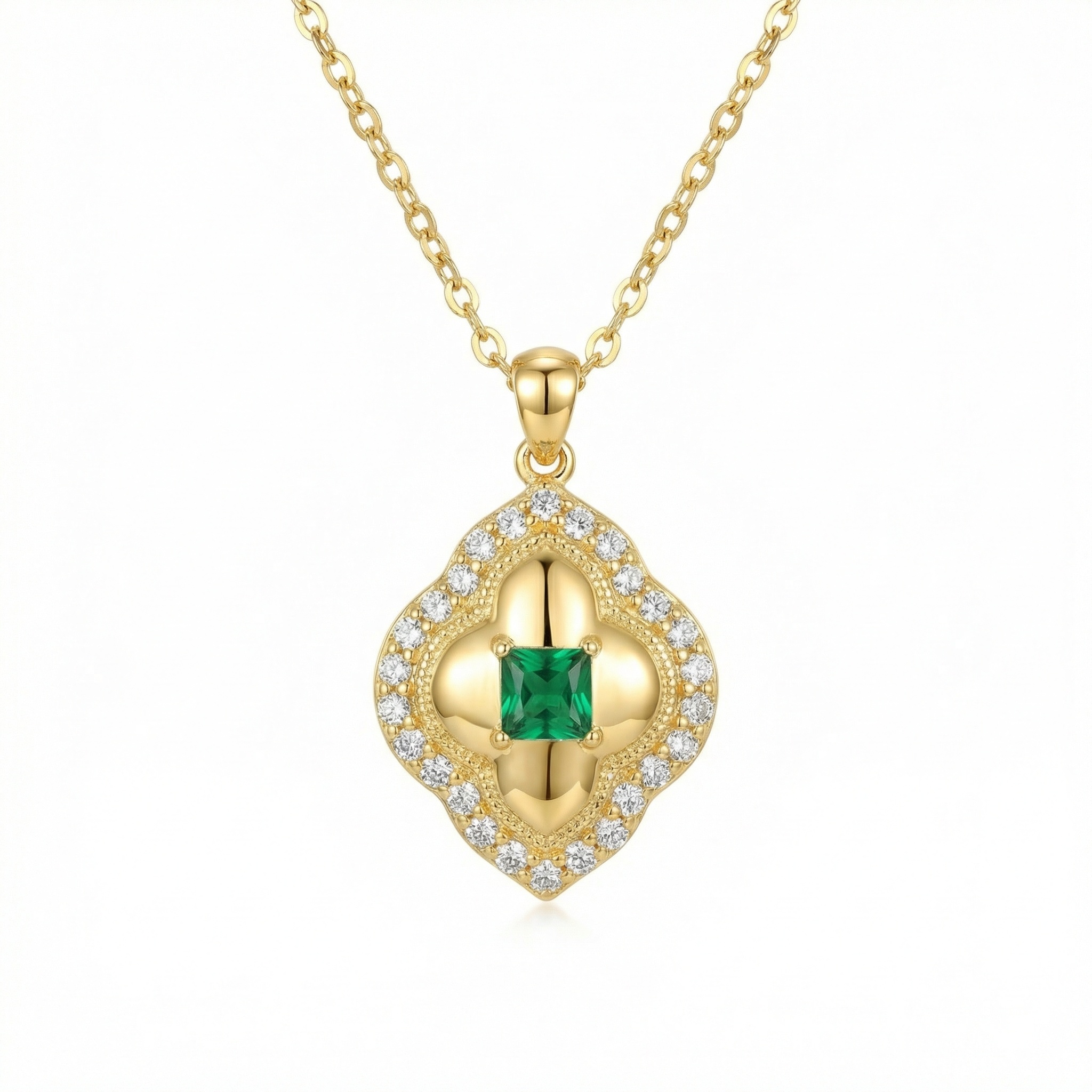 This elegant necklace showcases a vibrant, square-cut green gemstone at its heart, exuding a rich and luxurious aura. The central stone is encased in a beautifully crafted quatrefoil-inspired pendant, featuring a polished warm metallic finish. Surrounding the center are rows of glistening white accent stones that form a brilliant halo along the ornate, scalloped border. Delicate milgrain detailing adds a vintage touch, enhancing the sophisticated craftsmanship of the piece. Suspended from a classic link chain, this pendant offers a perfect blend of timeless style and modern glamour. The striking contrast between the deep emerald green and the sparkling white stones creates a captivating visual appeal, making it an ideal choice for gala events or as a meaningful gift for a loved one. Its refined silhouette ensures it remains a cherished staple in any elegant jewelry collection. | Brand: jewelryodm