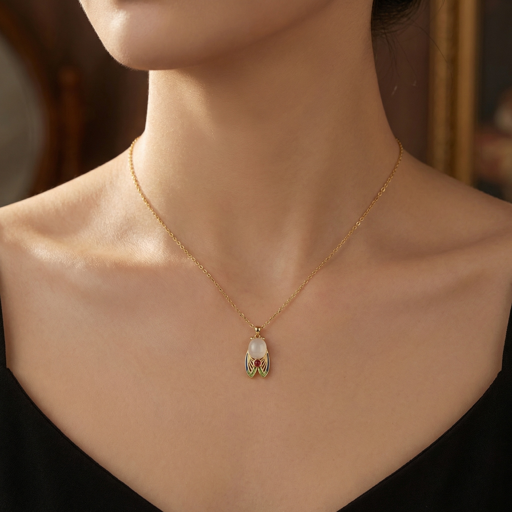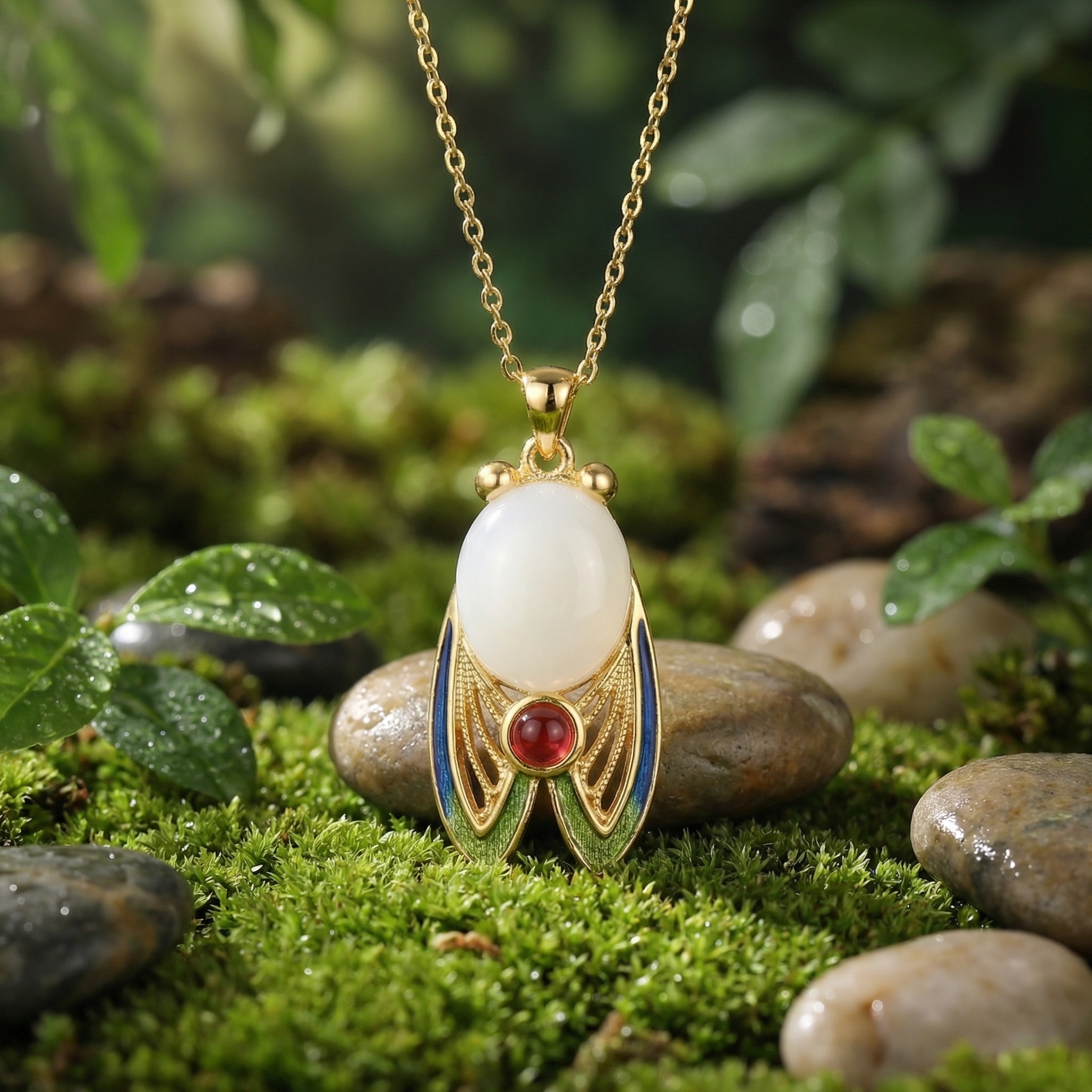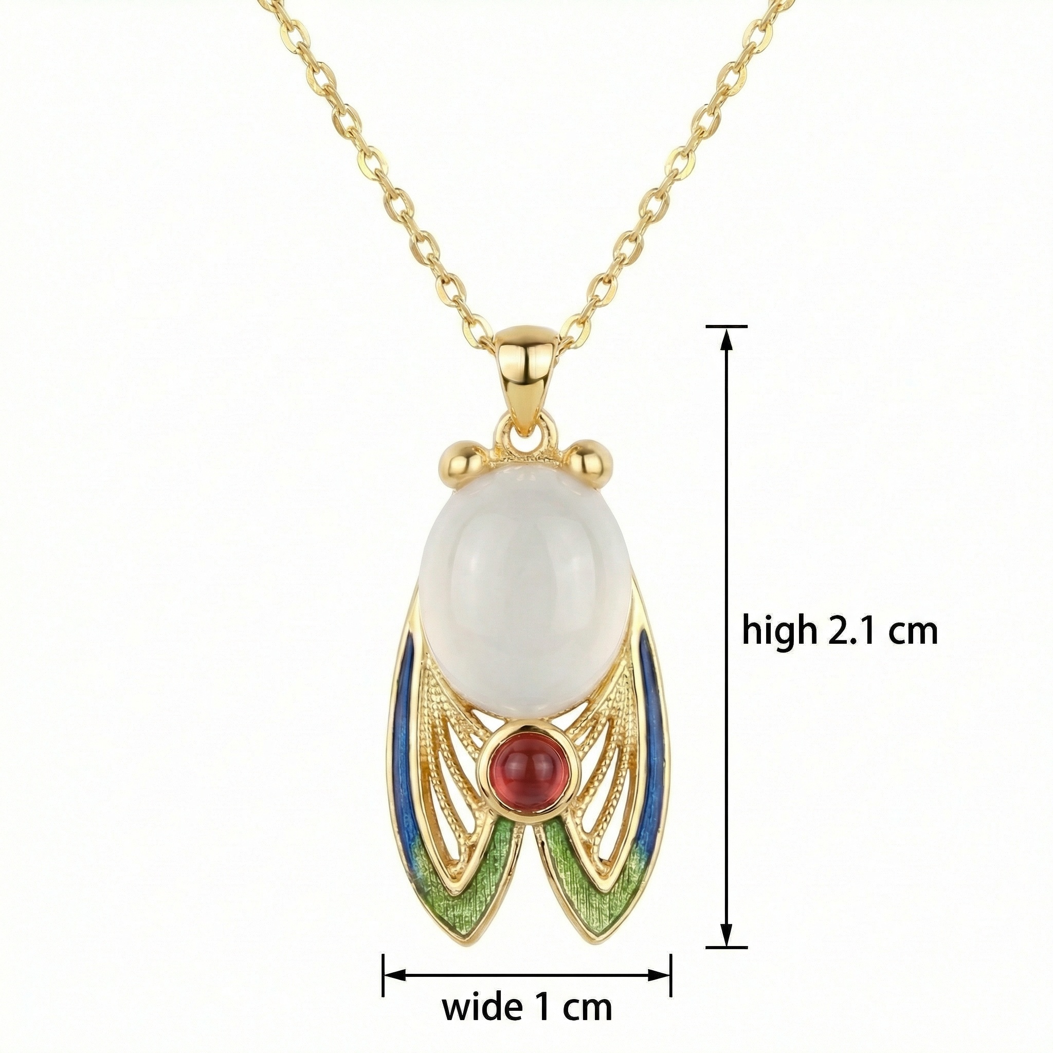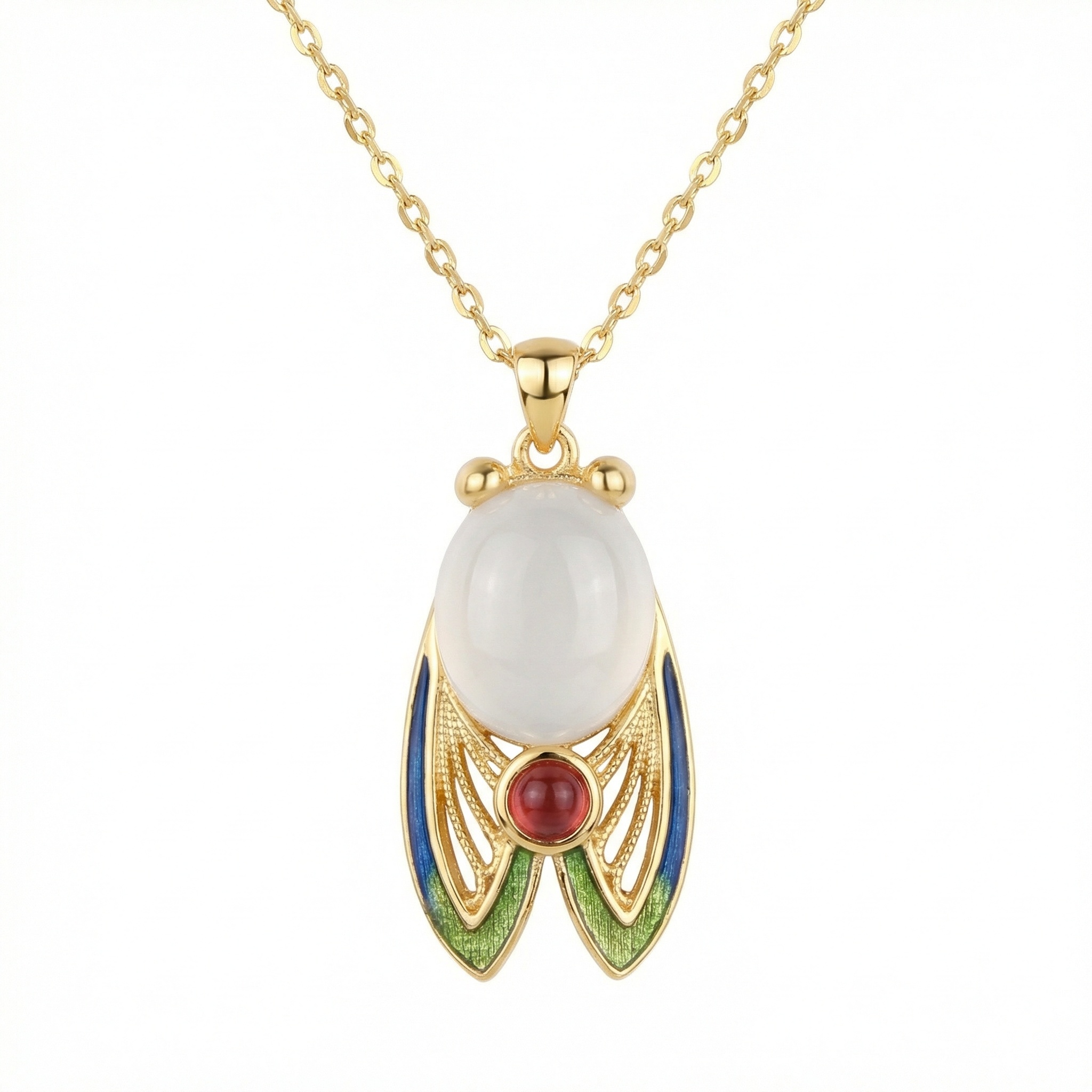 This stunning gold-tone necklace features an intricately designed cicada pendant, blending traditional symbolism with artistic craftsmanship. At its center is a large, smooth, milky-white oval gemstone that forms the cicada's body, complemented by a smaller, vibrant red round stone at the base. The wings are a highlight, showcasing delicate gold filigree work accented with gradients of blue and green enamel for a lifelike, iridescent effect. Two polished gold beads represent the eyes, adding to the charm of this nature-inspired piece. Suspended from a dainty gold-link chain, this necklace serves as a unique statement of elegance and rebirth. | Brand: jewelryodm