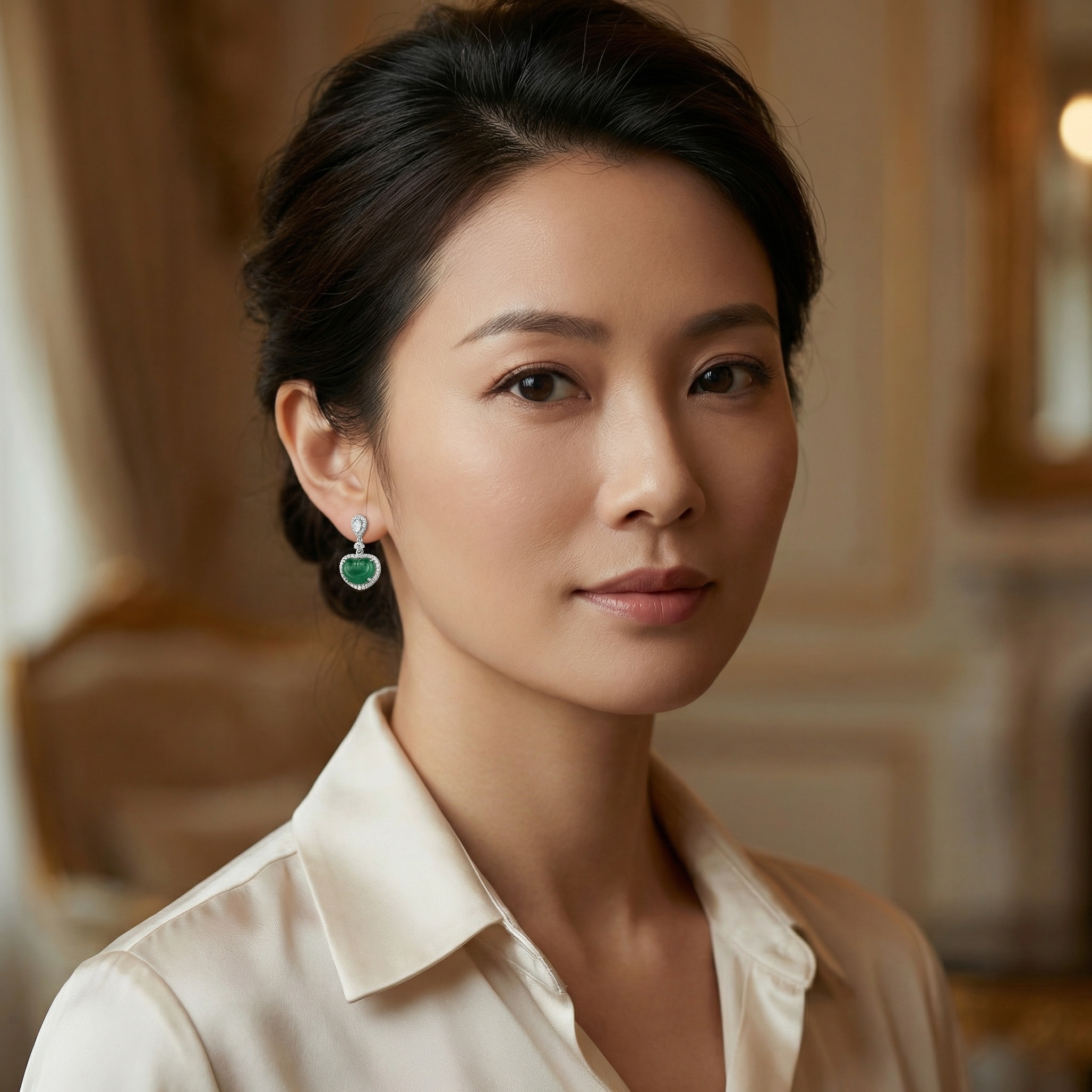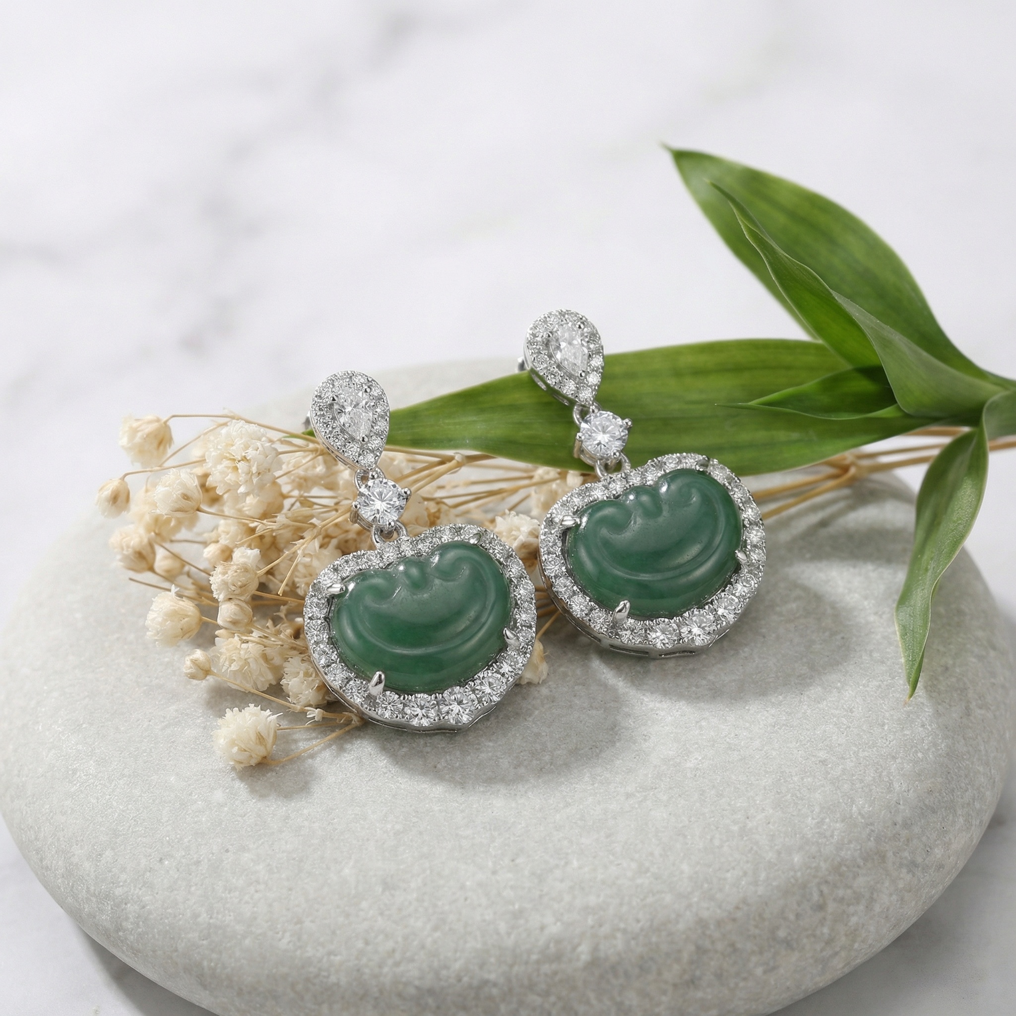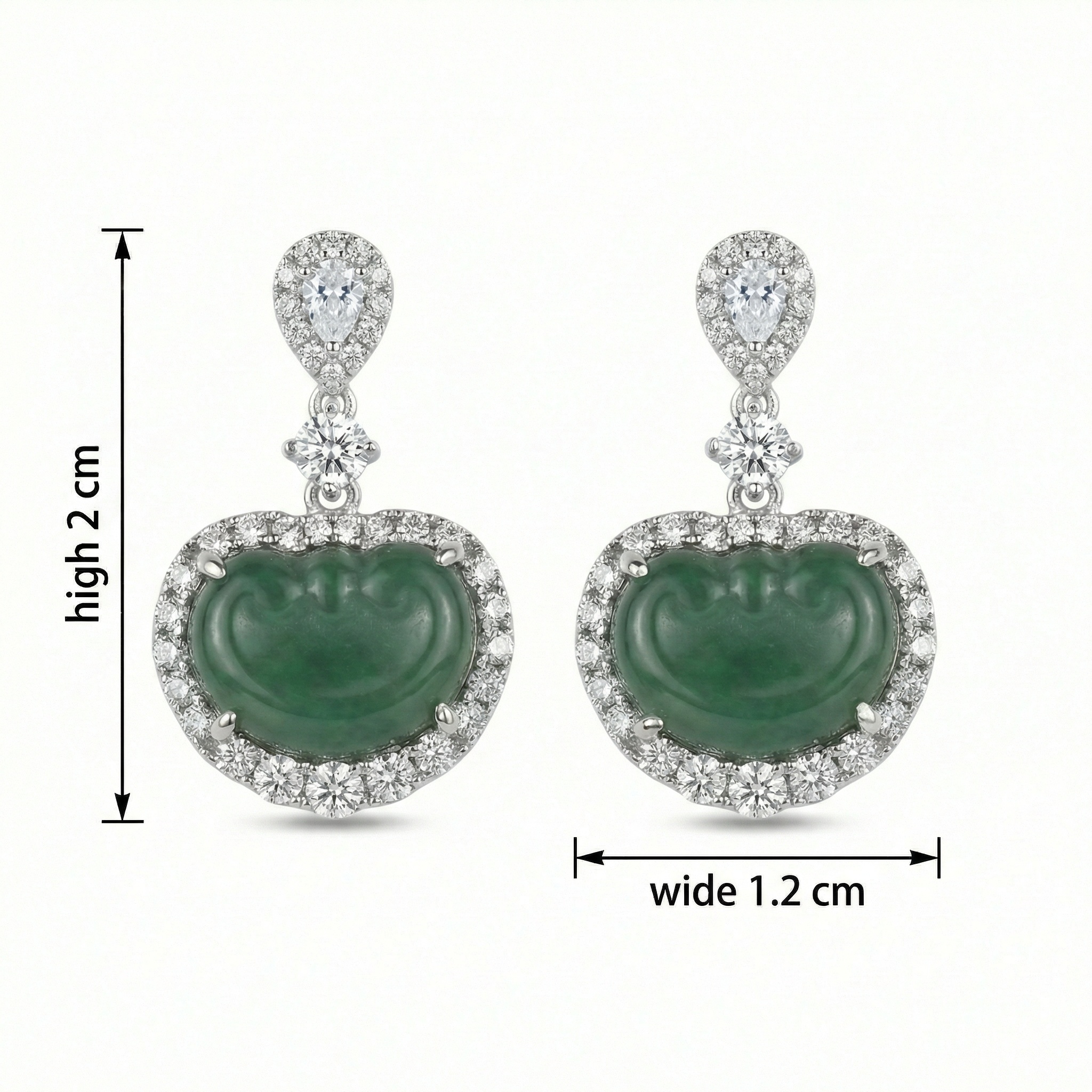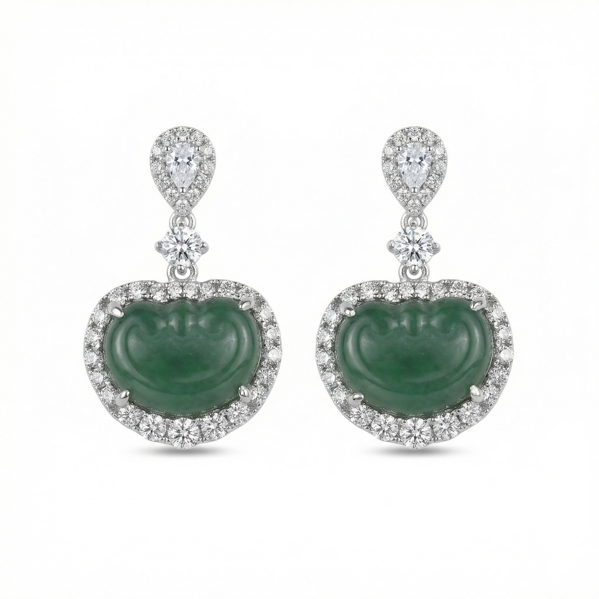 These stunning drop earrings feature two vibrant green jadeite cabochons carved into the auspicious "Ruyi" shape, representing prosperity and good fortune. Each jadeite piece is meticulously framed by a shimmering halo of brilliant-cut diamonds that enhance its deep, rich green hue. The earrings are suspended from a sophisticated diamond-encrusted drop, starting with a sparkling pear-shaped diamond at the top followed by a round brilliant diamond centerpiece. Crafted in a polished white setting, these earrings offer a perfect blend of traditional symbolism and contemporary luxury. The intricate claw settings ensure the stones are secure while allowing maximum light to pass through the diamonds for exceptional brilliance. Ideal for gala events or formal celebrations, these earrings make a timeless statement of elegance and cultural heritage. | Brand: jewelryodm