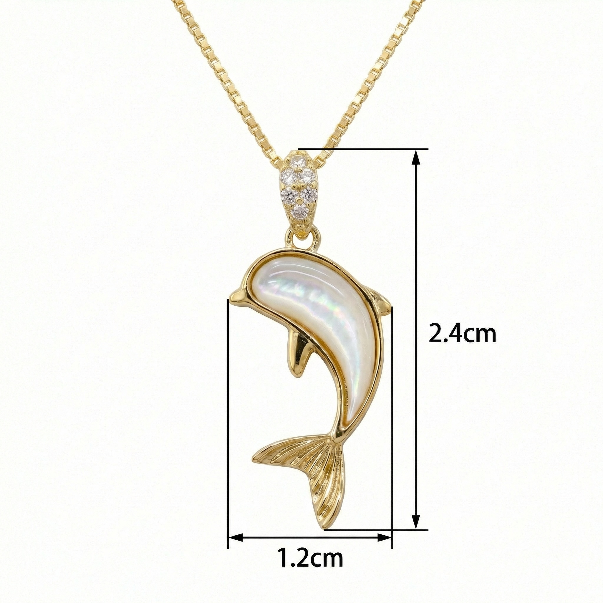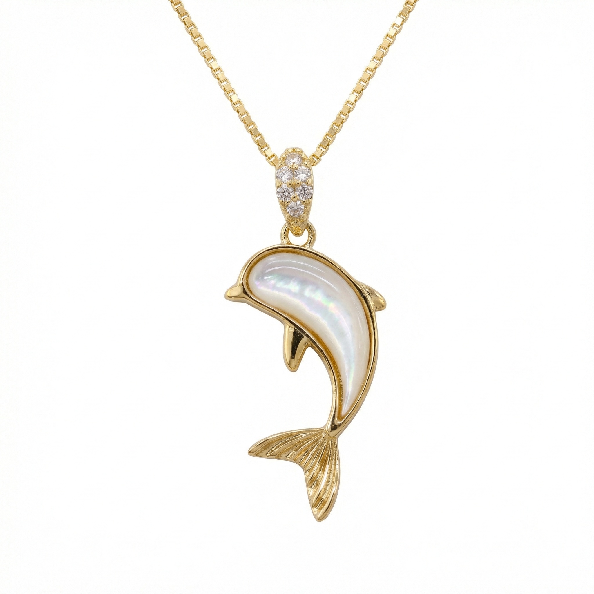 Capture the grace of the sea with this stunning dolphin pendant necklace. The design features a beautifully sculpted dolphin adorned with a lustrous mother of pearl inlay, creating a captivating iridescent effect. The pendant is crowned with a bail embellished with shimmering clear stones, adding a touch of elegance and light to the piece. Hanging from a refined box chain, this necklace offers a timeless and sophisticated silhouette suitable for any attire. The warm yellow finish of the metal provides a vibrant backdrop for the natural pearl, making it a standout accessory for nature lovers and jewelry enthusiasts alike. Whether as a treat for yourself or a thoughtful gift for someone special, this enchanting dolphin necklace brings a playful yet refined touch to any look, symbolizing joy and freedom in every detail. | Brand: jewelryodm