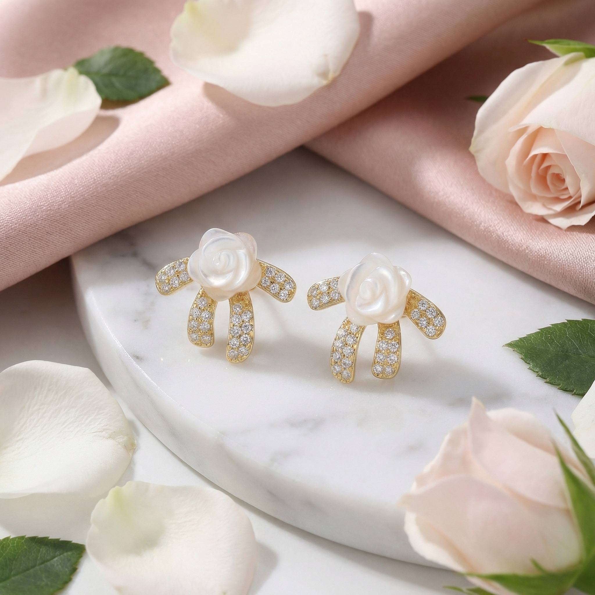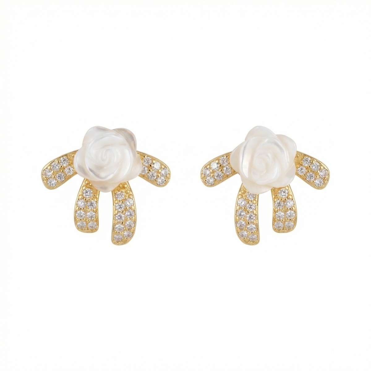 These elegant stud earrings showcase a beautifully carved white mother-of-pearl rose, capturing a sense of timeless romance. The floral centerpiece is set atop a graceful ribbon design crafted in a warm yellow-toned metal. Each section of the stylized bow is encrusted with brilliant, clear pavé-set stones that provide a sophisticated sparkle. The combination of the soft, iridescent shell and the shimmering accents creates a luxurious look that elevates any outfit. Designed with a feminine and vintage-inspired aesthetic, these earrings are perfect for adding a touch of charm to your jewelry collection. Whether worn for a special occasion or as a refined everyday accessory, they offer a perfect balance of whimsical style and classic elegance. Their secure backing ensures they stay comfortably in place throughout the day. | Brand: jewelryodm