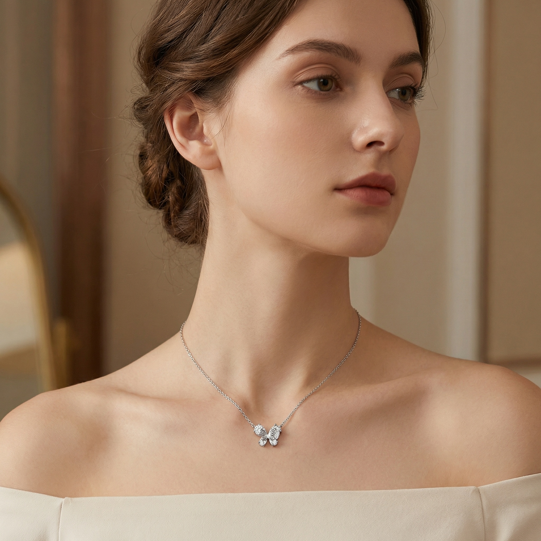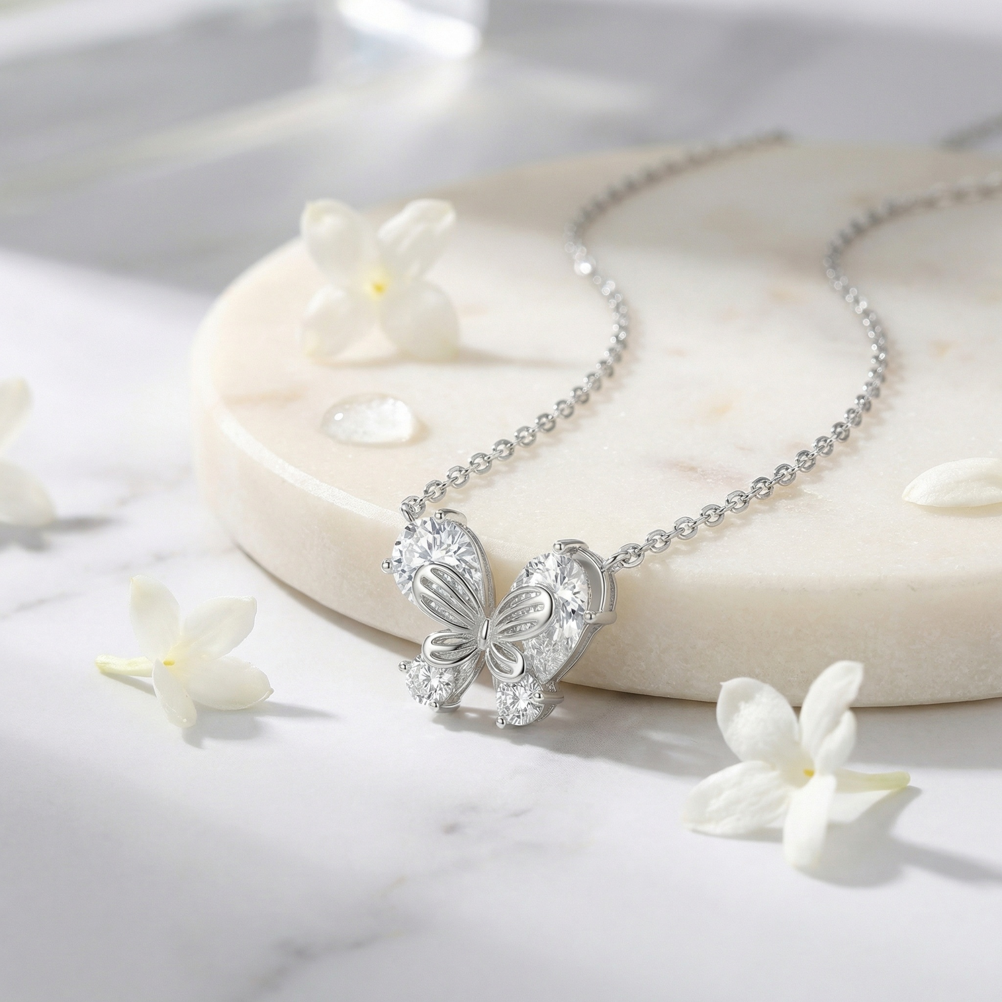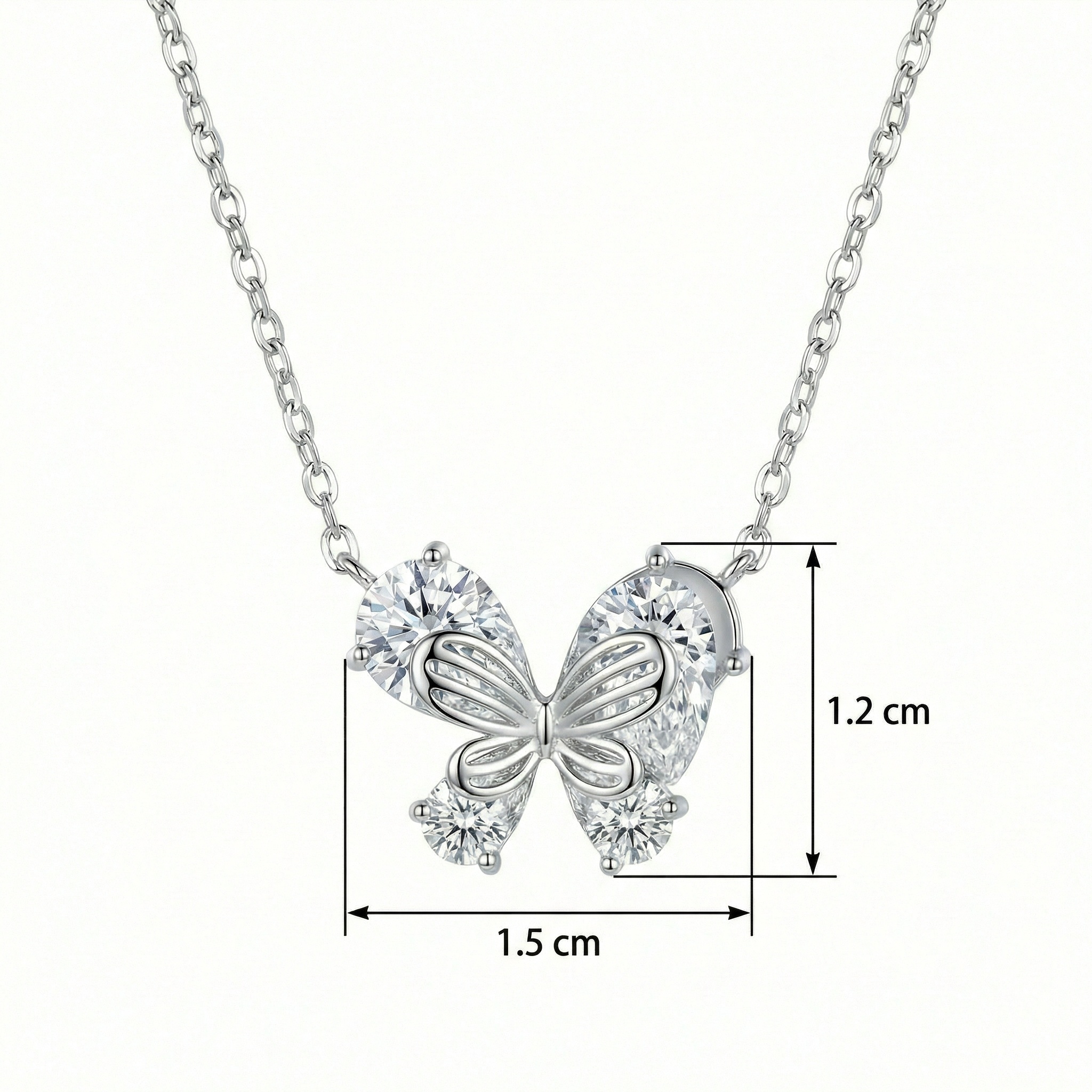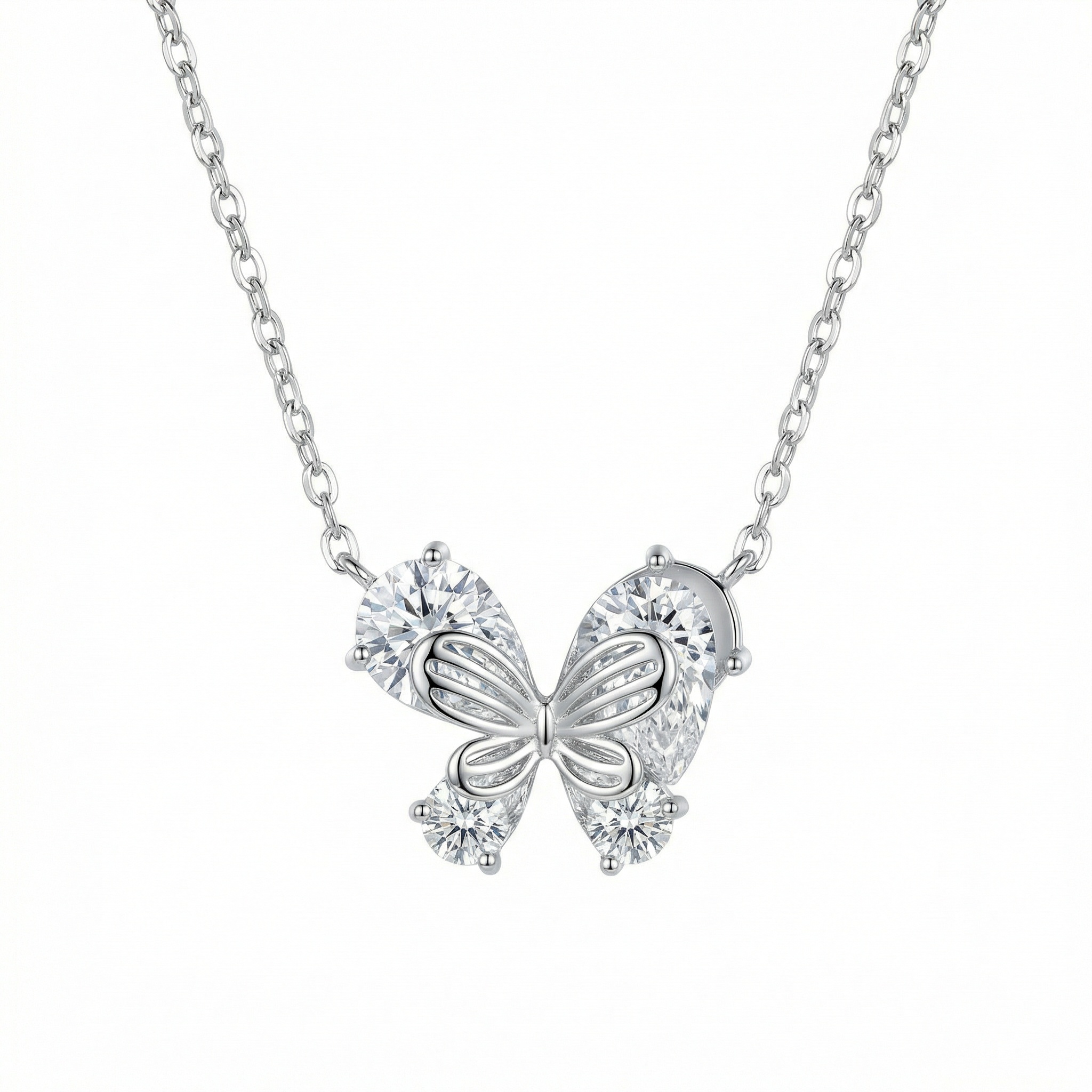 This stunning necklace features a delicate butterfly pendant, meticulously crafted from high-quality silver-toned metal. The butterfly's wings are elegantly formed by four brilliant pear-cut clear gemstones that capture and reflect light from every angle, creating a dazzling shimmer. At the heart of the pendant lies a smaller, intricately detailed silver butterfly silhouette, adding a layered and sophisticated touch to the design. Suspended from a classic, fine-link chain, this piece balances modern glamour with timeless charm. Its ethereal beauty makes it a perfect accessory for both everyday wear and special occasions, symbolizing grace, transformation, and elegance. Whether as a thoughtful gift for a loved one or a treat for yourself, this necklace adds a touch of whimsical brilliance to any jewelry collection. The secure clasp ensures comfortable and safe wear throughout the day. | Brand: jewelryodm