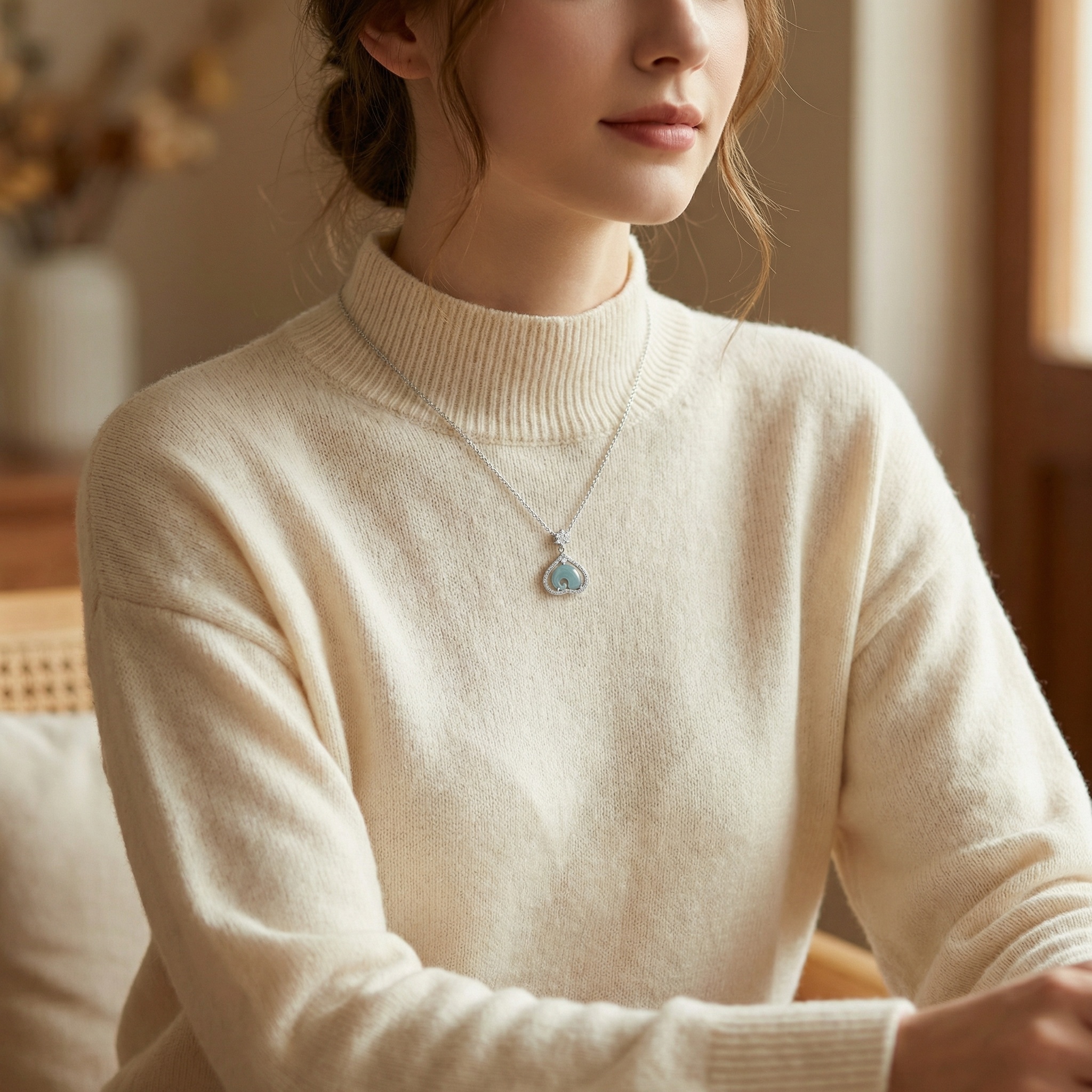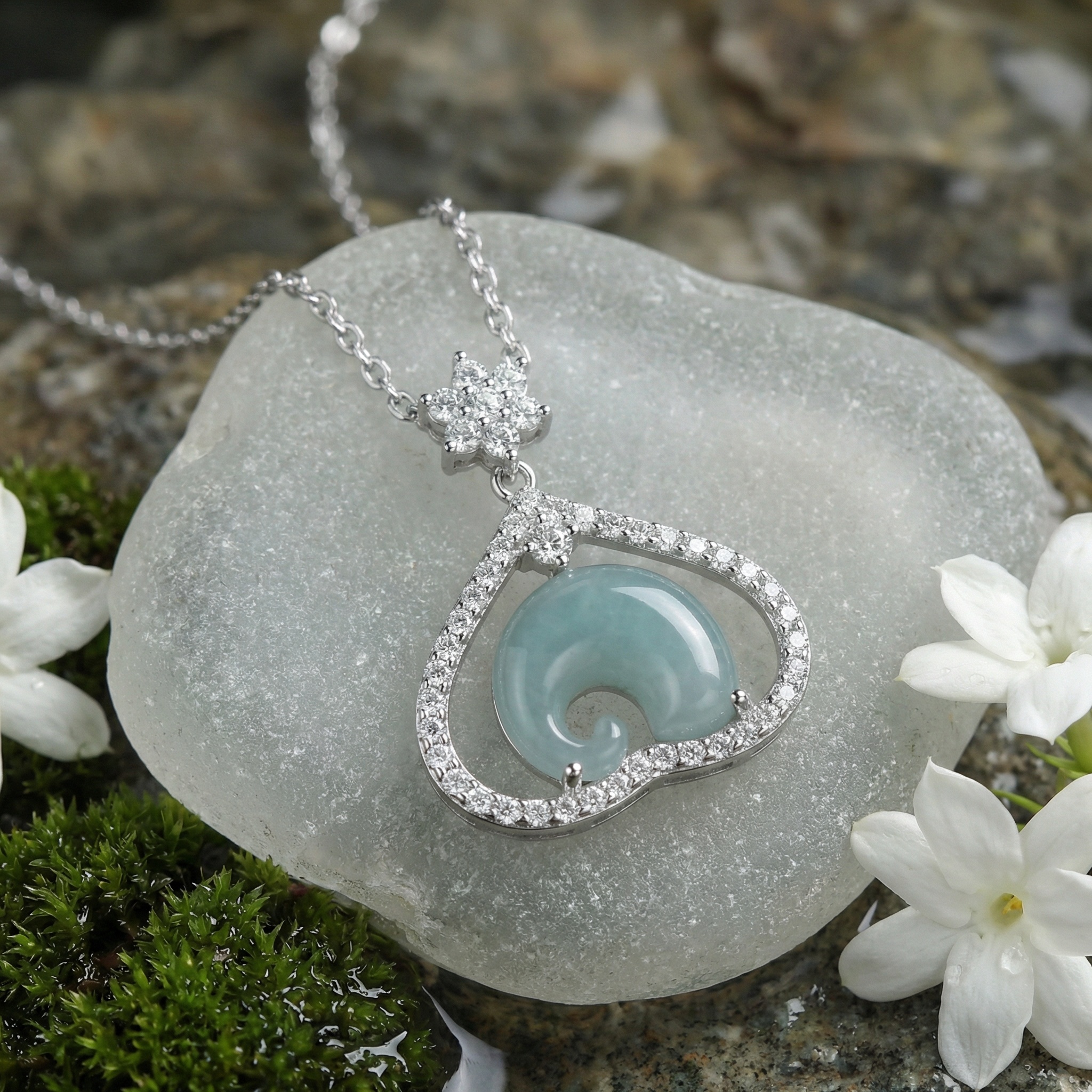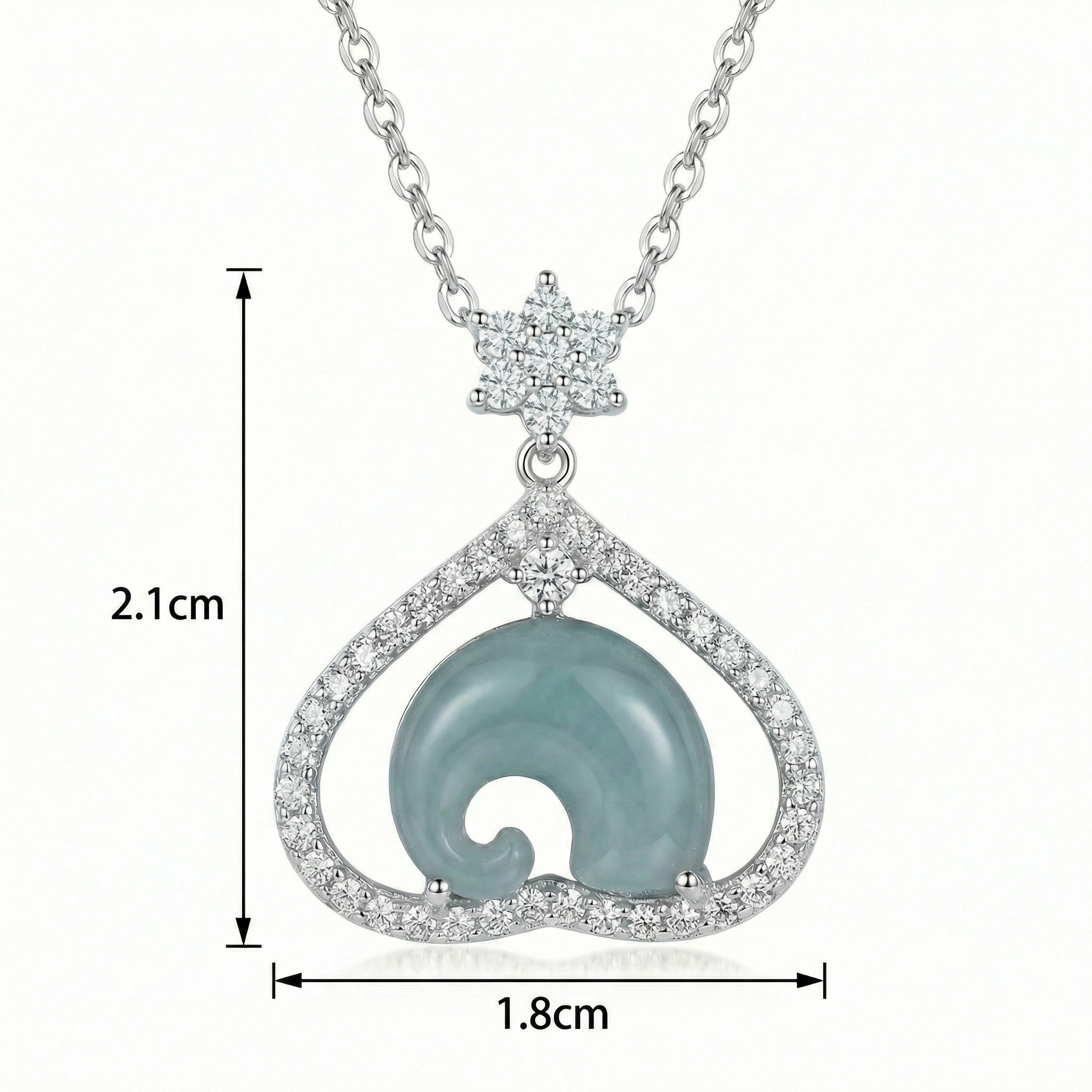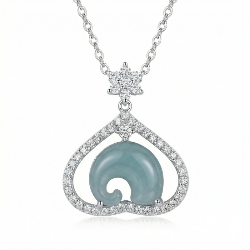 925 Sterling Silver Exquisite Sterling Silver Heart Pendant Necklace with Curved Blue Jadeite and Sparkling Accents