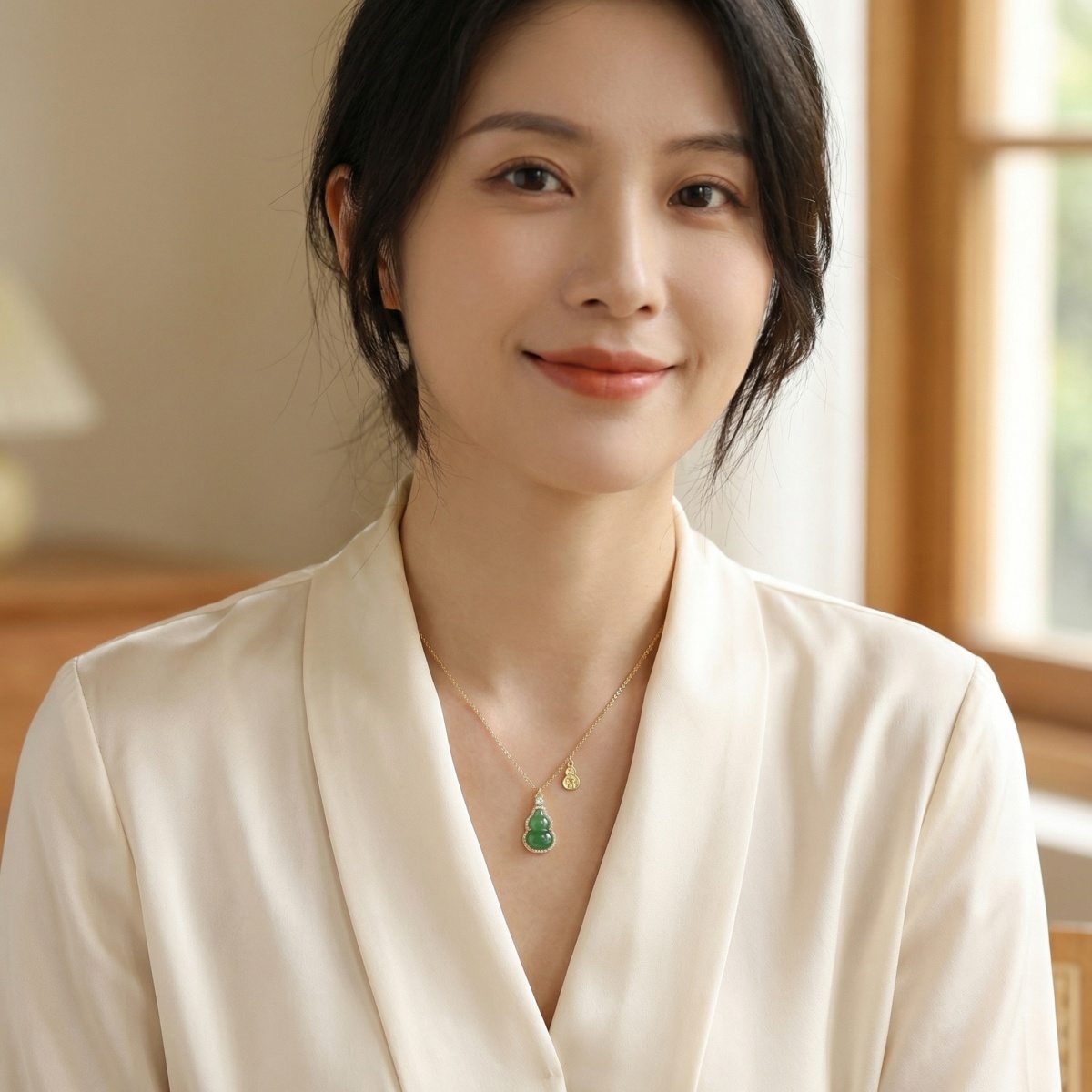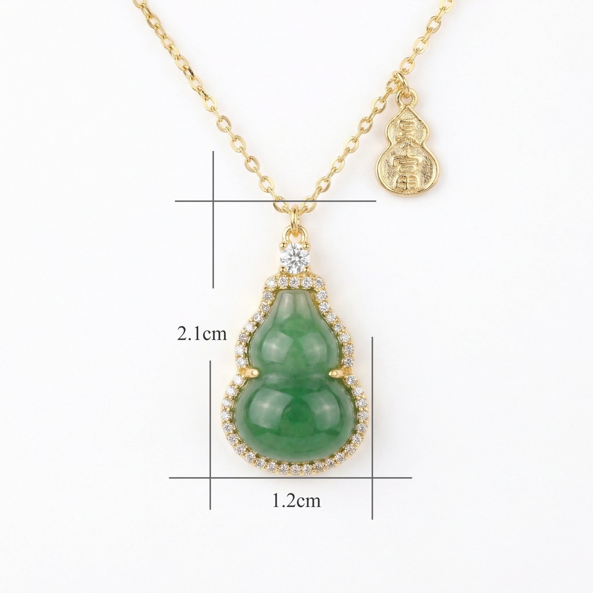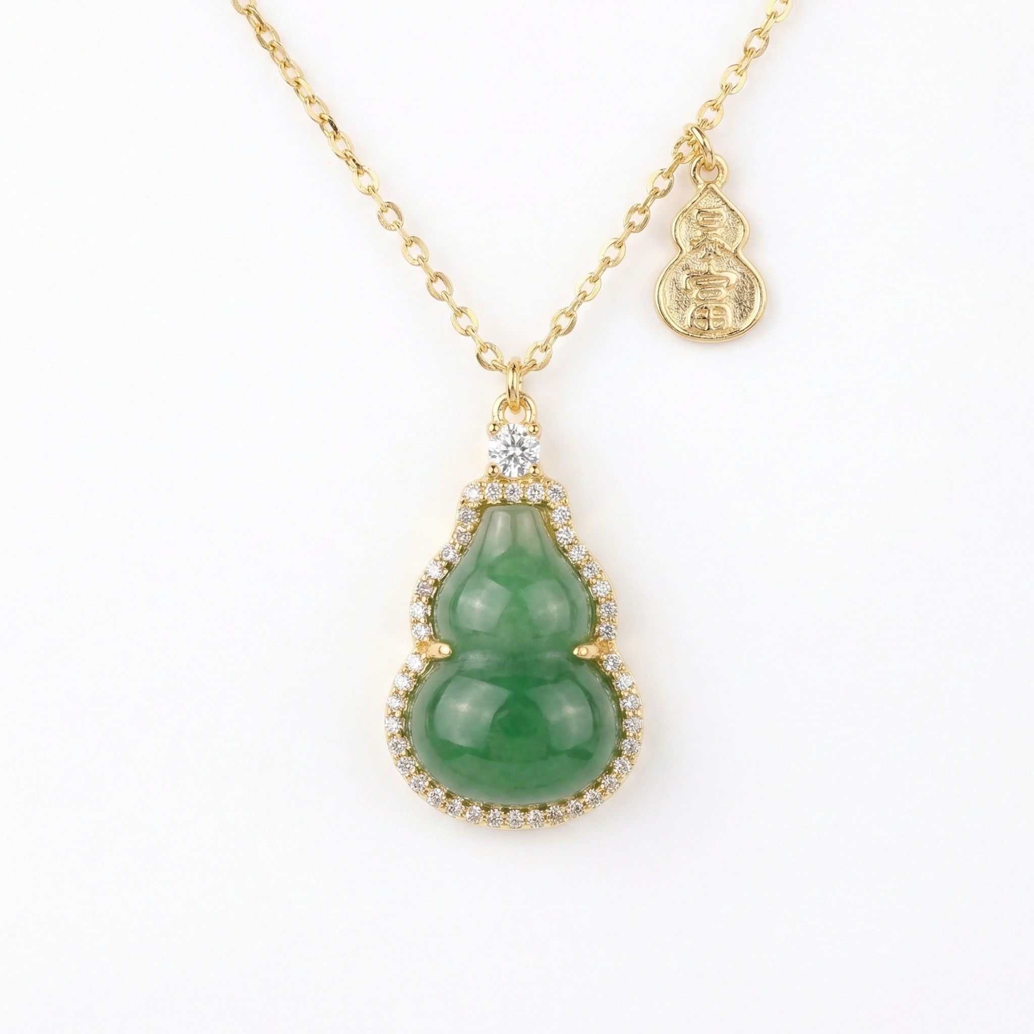 This exquisite necklace features a vibrant green jadeite pendant carved into the traditional hulu or bottle gourd shape, a timeless symbol of longevity, prosperity, and protection. The luscious green stone is beautifully framed by a halo of shimmering brilliant-cut accents that add a touch of modern radiance to the classic design. Hanging gracefully from a delicate chain, the piece is further enhanced by a small pendant charm embossed with auspicious characters, inviting good fortune and abundance. The warm metallic setting complements the deep hues of the jade, creating a sophisticated look suitable for both daily wear and special occasions. Perfect as a meaningful gift or a personal talisman, this piece beautifully combines cultural heritage with elegant craftsmanship. | Brand: jewelryodm