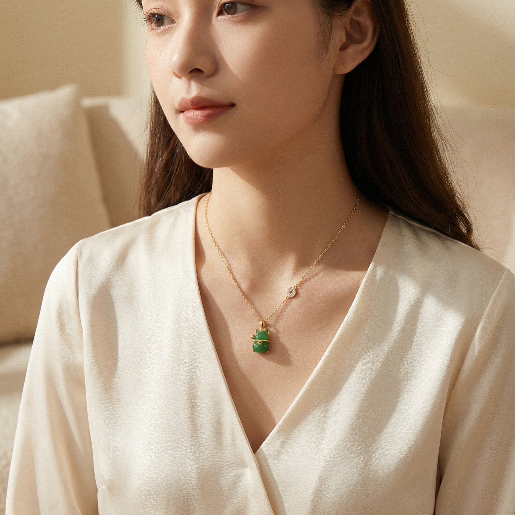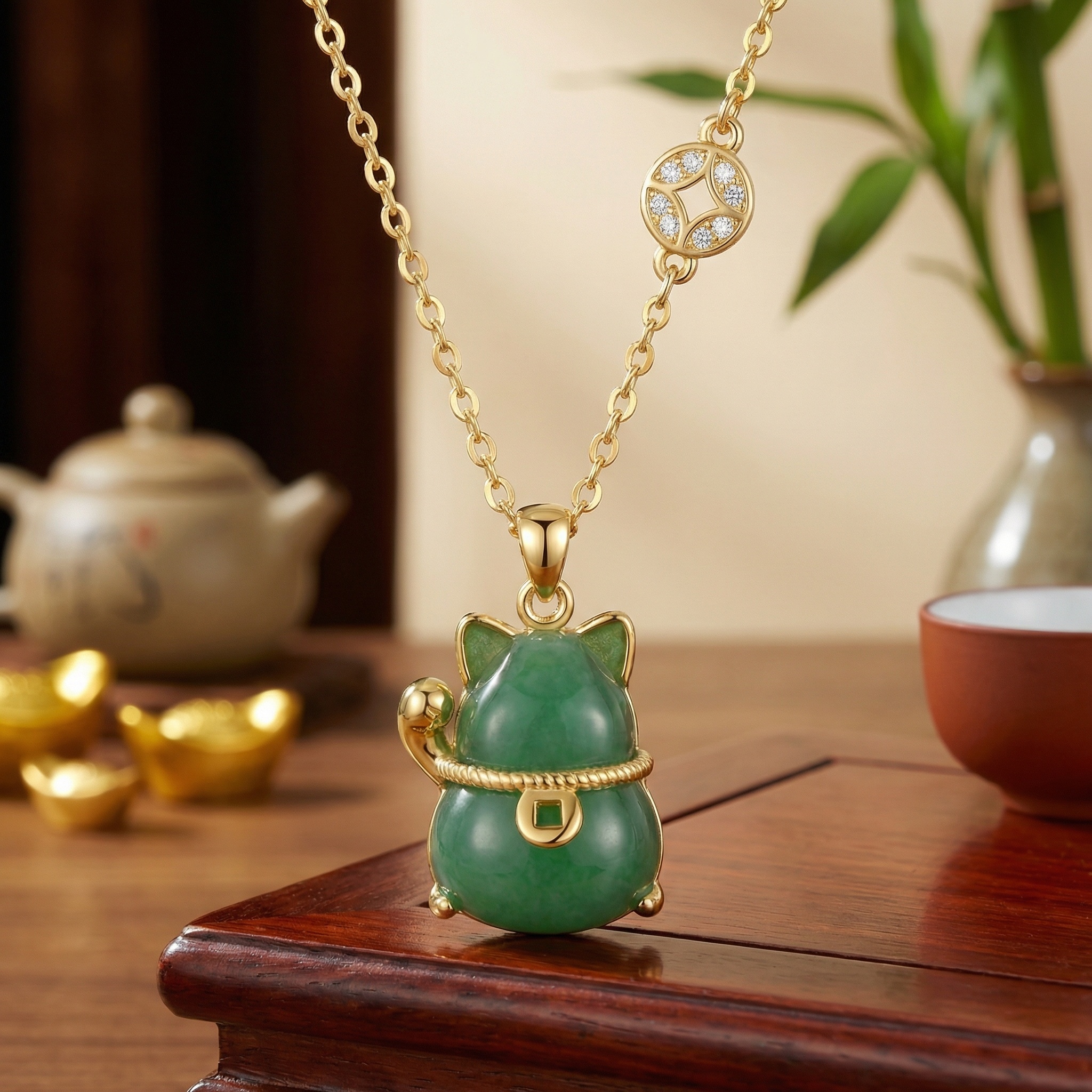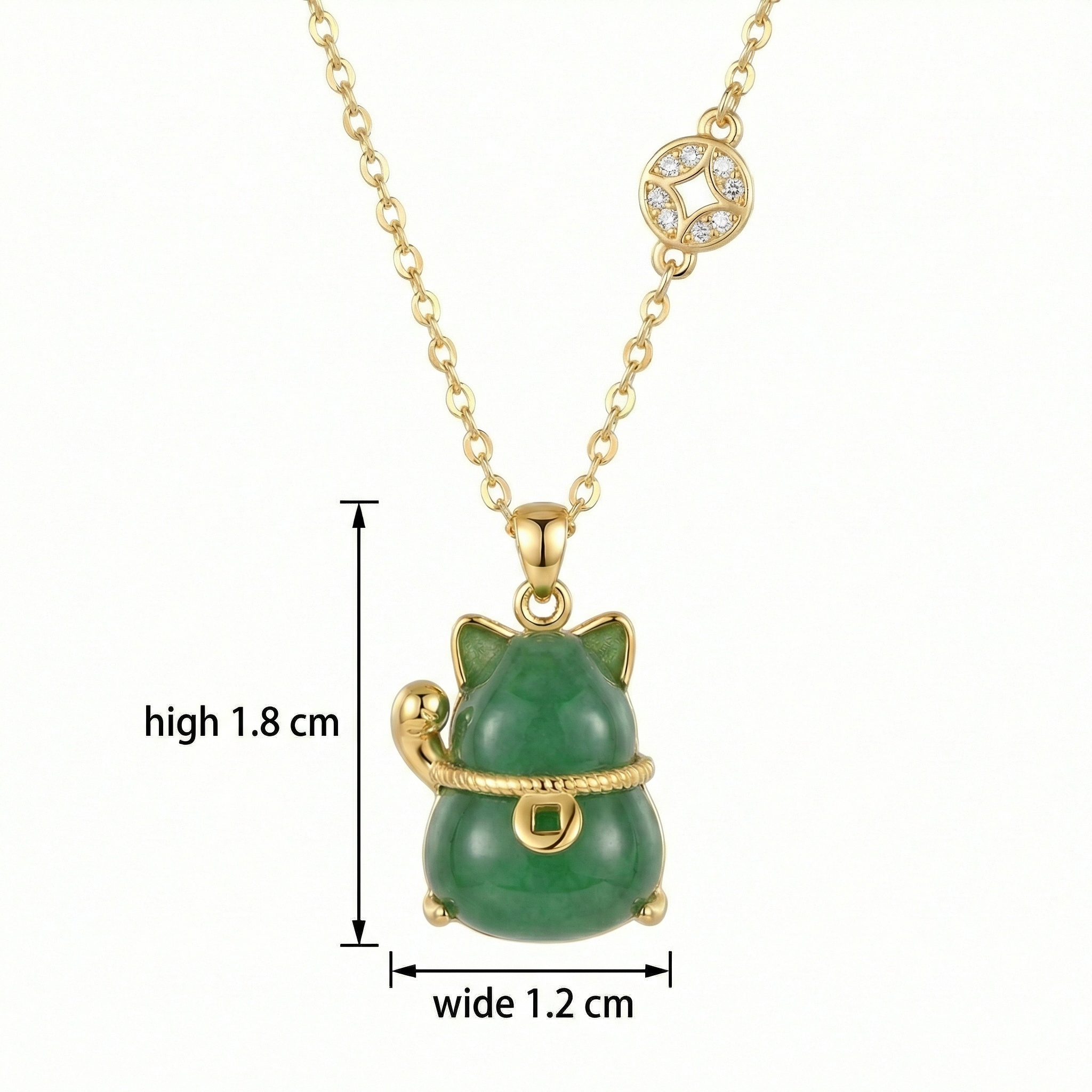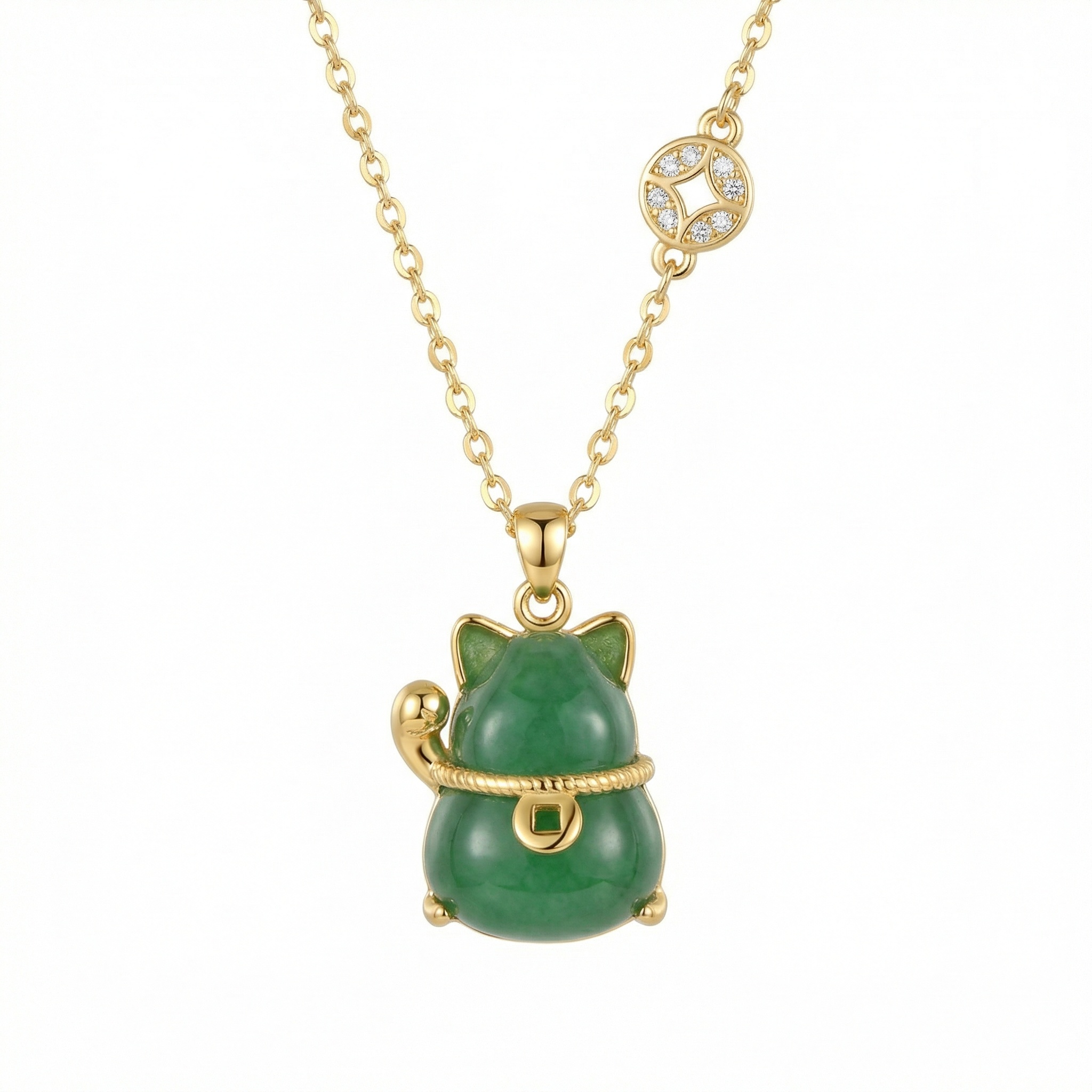 This exquisite necklace features a stunning pendant crafted from rich green jade, meticulously shaped into a charming Lucky Cat silhouette. The jade's vibrant surface is beautifully complemented by polished gold-toned accents, including a textured rope belt and delicate detailing on the ears and paws. The elegant gold chain is further elevated by a unique circular charm set with shimmering small stones, adding a touch of brilliance to the overall design. Blending traditional Eastern symbolism for good fortune and prosperity with sophisticated modern jewelry aesthetics, this piece serves as both a meaningful talisman and a fashionable accessory. The harmonious combination of deep green tones and warm gold creates a timeless look perfect for any occasion. | Brand: jewelryodm