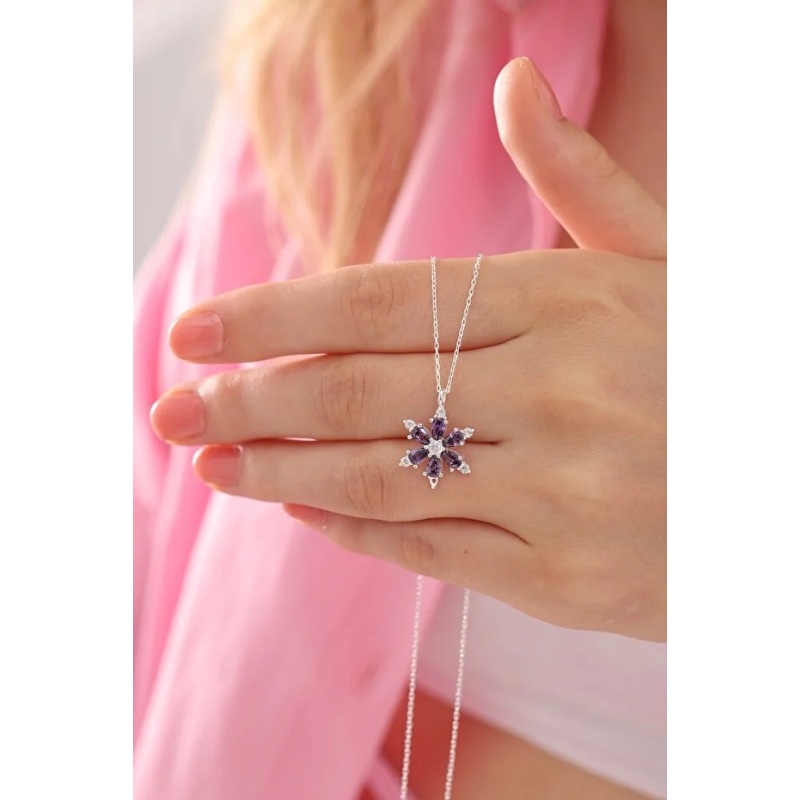 This product features a 925 sterling silver chain with a lotus camellia pendant and an amethyst teardrop stone.