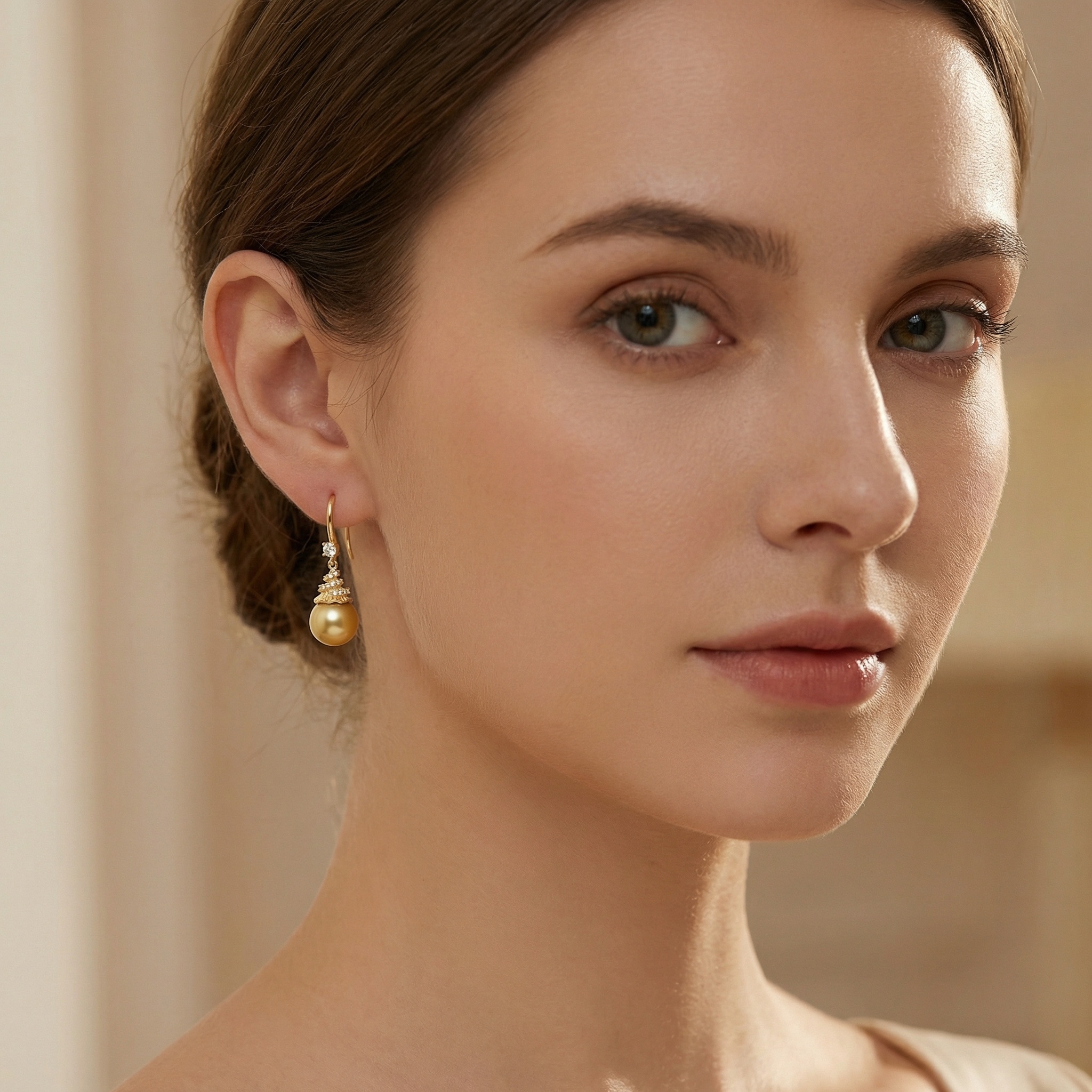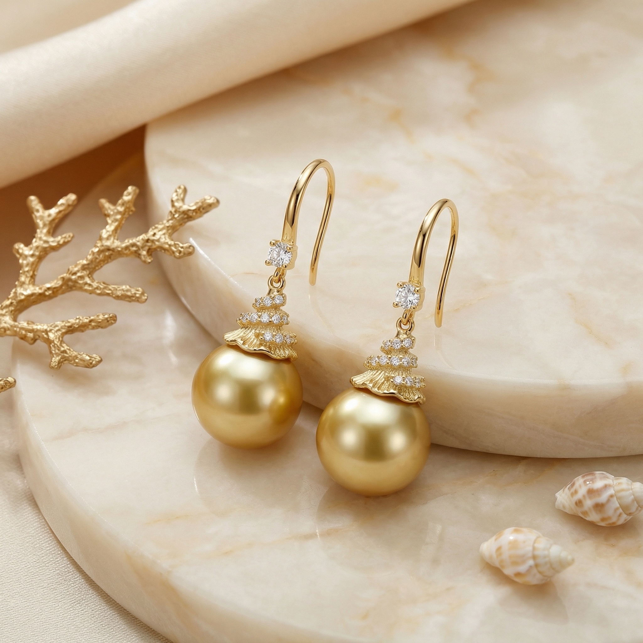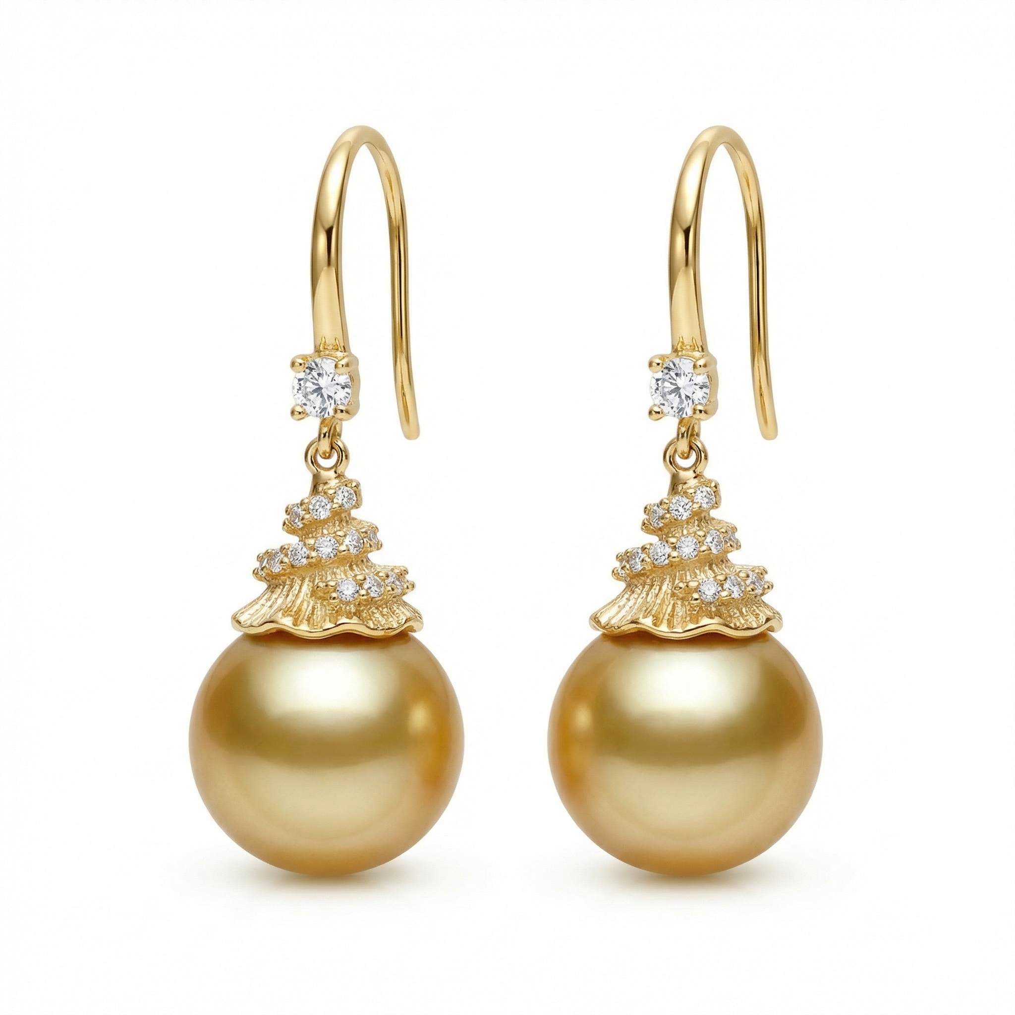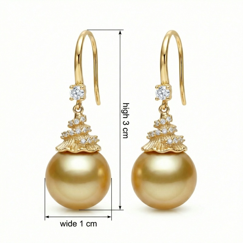 These stunning earrings feature large, high-luster South Sea pearls in a rich honey-toned hue. Suspended from elegant hooks, the pearls are topped with uniquely textured caps that resemble organic waves or delicate shells, intricately set with several small, brilliant-cut diamonds for a touch of shimmer. An additional sparkling diamond is placed just above the decorative cap, enhancing the sophisticated aesthetic. The warm metallic finish beautifully complements the natural radiance of the pearls, making these pieces ideal for formal events or elegant evening wear. Showcasing exceptional craftsmanship, this pair blends rare organic gems with glittering stones to create a captivating visual harmony. These timeless treasures offer a luxurious and refined addition to any jewelry collection, perfect for celebrating life’s special moments. | Brand: jewelryodm