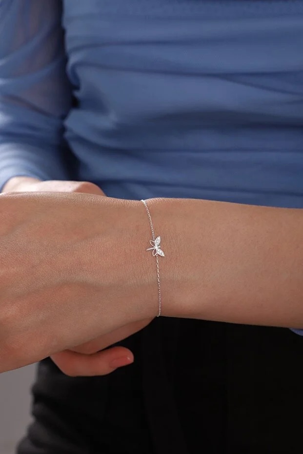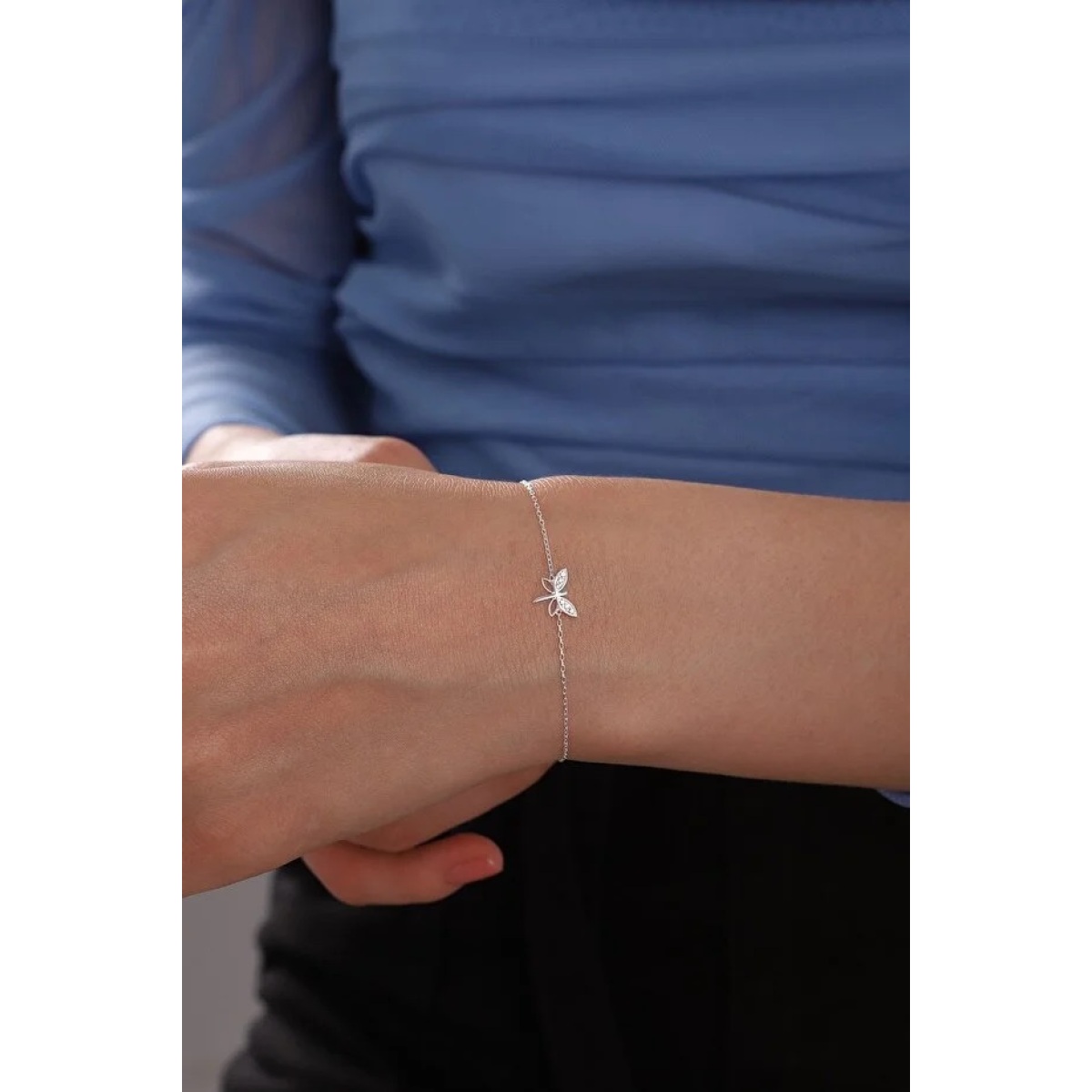 This product features a 925 sterling silver chain bracelet with a white stone dragonfly pendant.
