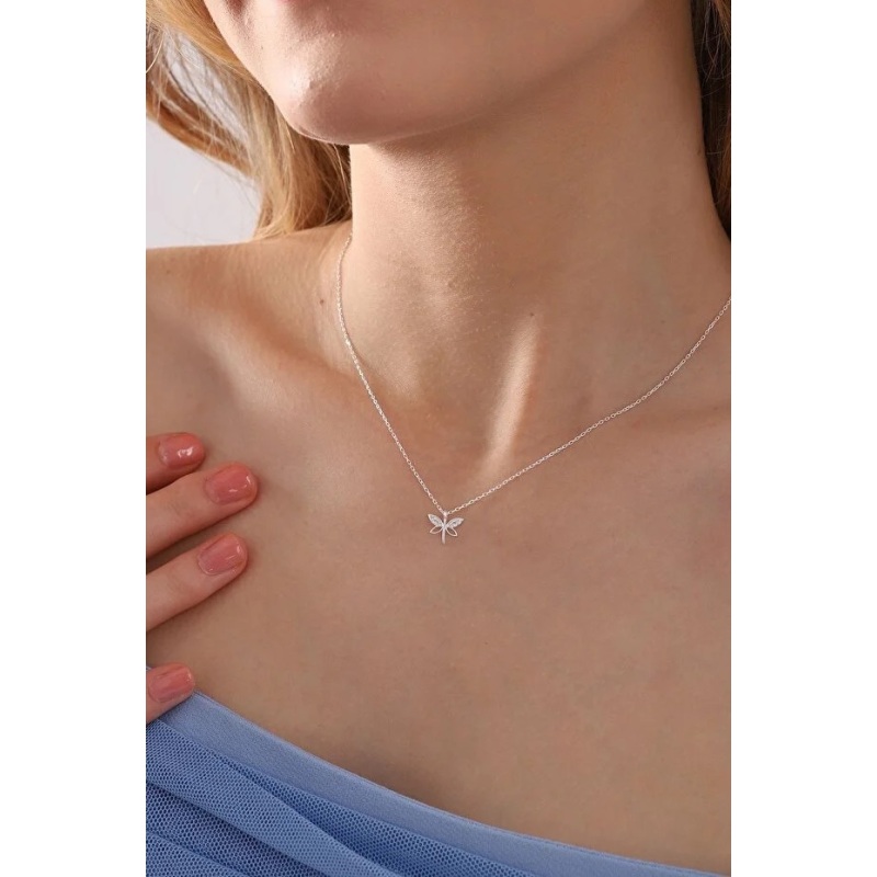 This product features a 925 sterling silver chain with a white zircon stone dragonfly pendant.