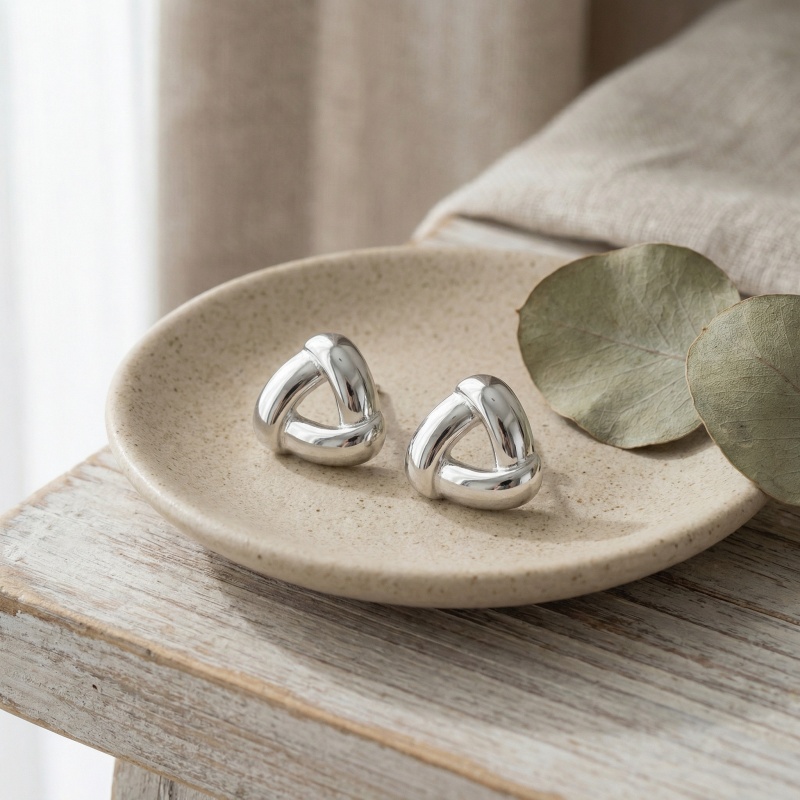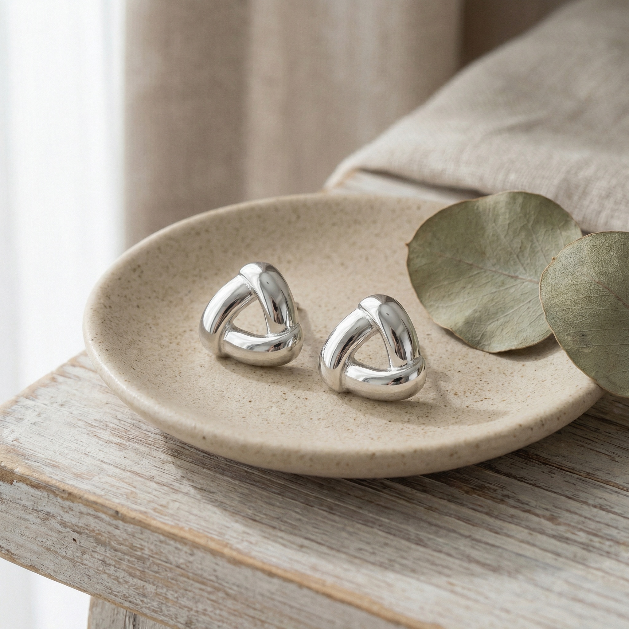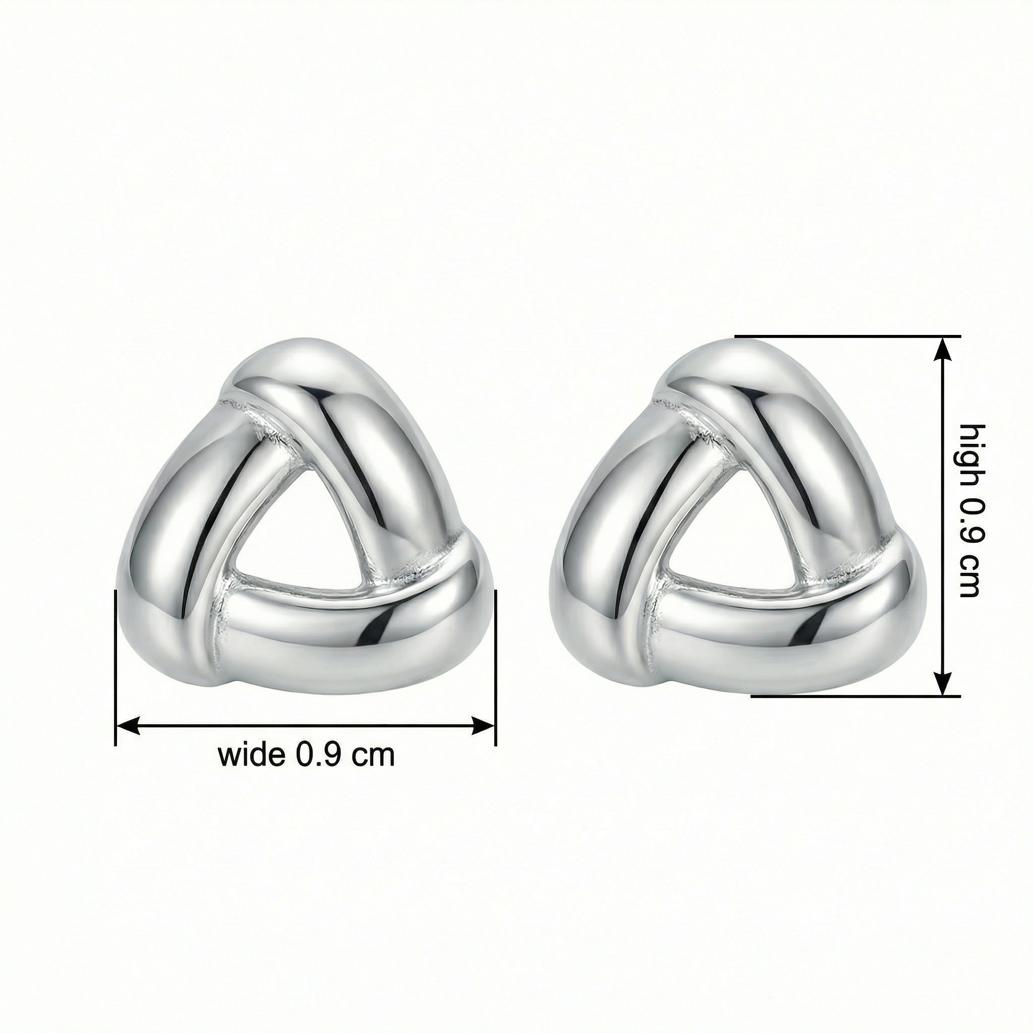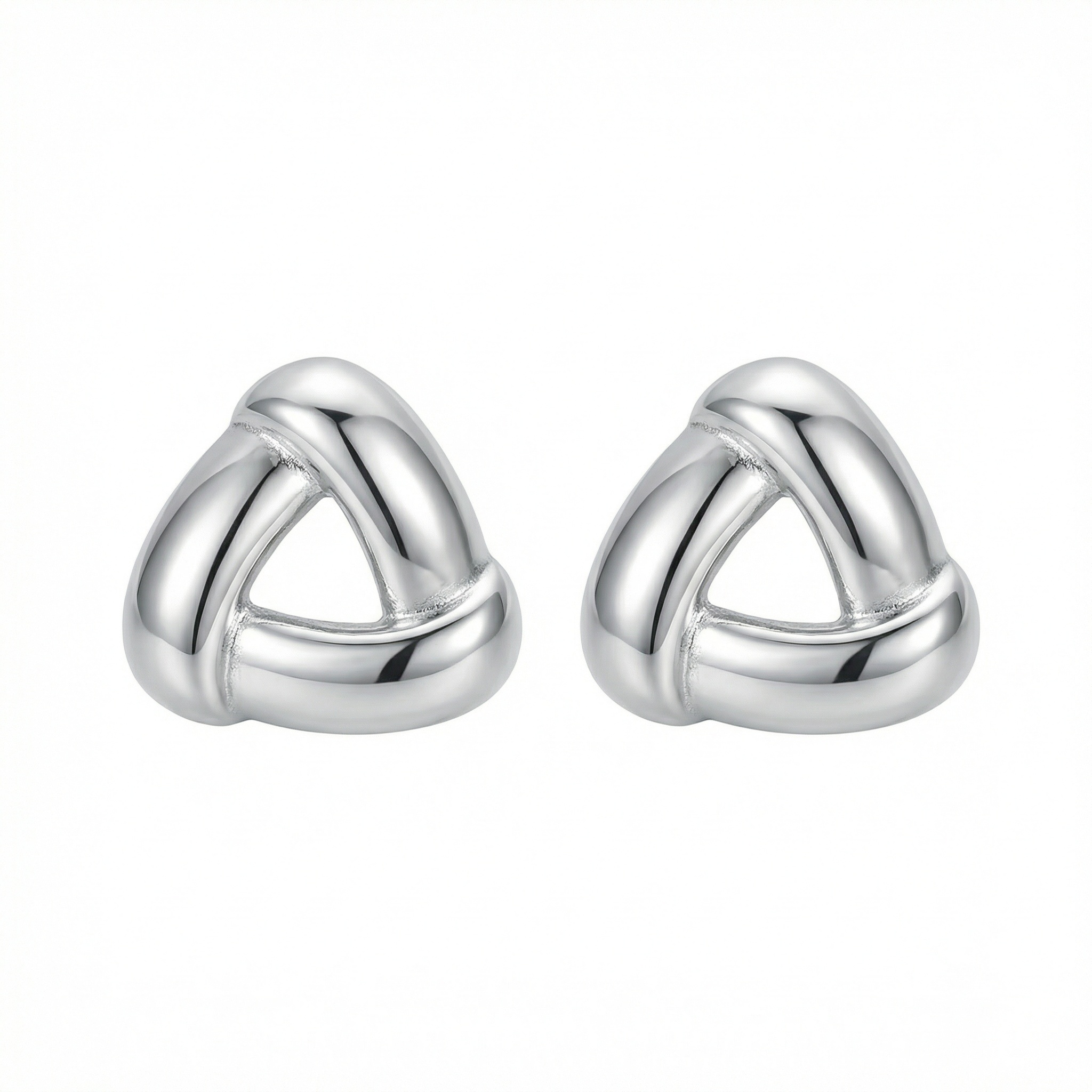 These elegant stud earrings feature a unique interlocking triangular knot design, crafted from high-quality polished silver for a radiant, mirror-like finish. The sleek, modern silhouette combines minimalist aesthetics with a touch of sophisticated detail, making them a versatile addition to any jewelry collection. Perfect for everyday wear or special occasions, these earrings offer a comfortable fit and a timeless look that effortlessly complements any outfit. Their symbolic knot design adds a meaningful touch, making them an ideal gift for yourself or a loved one. The clean lines and reflective surface ensure they catch the light beautifully from every angle. | Brand: jewelryodm