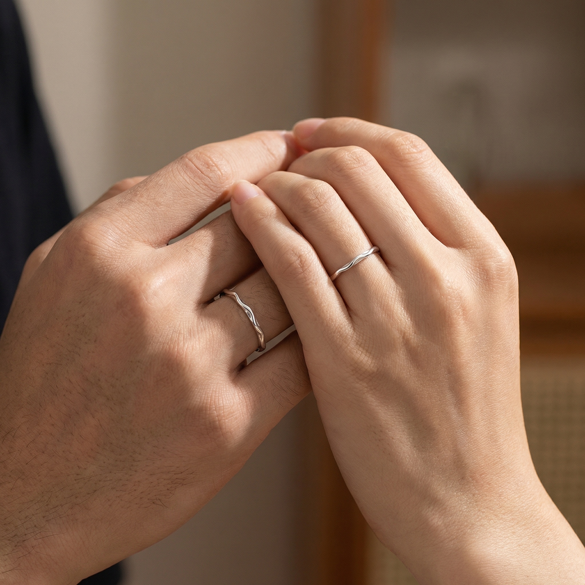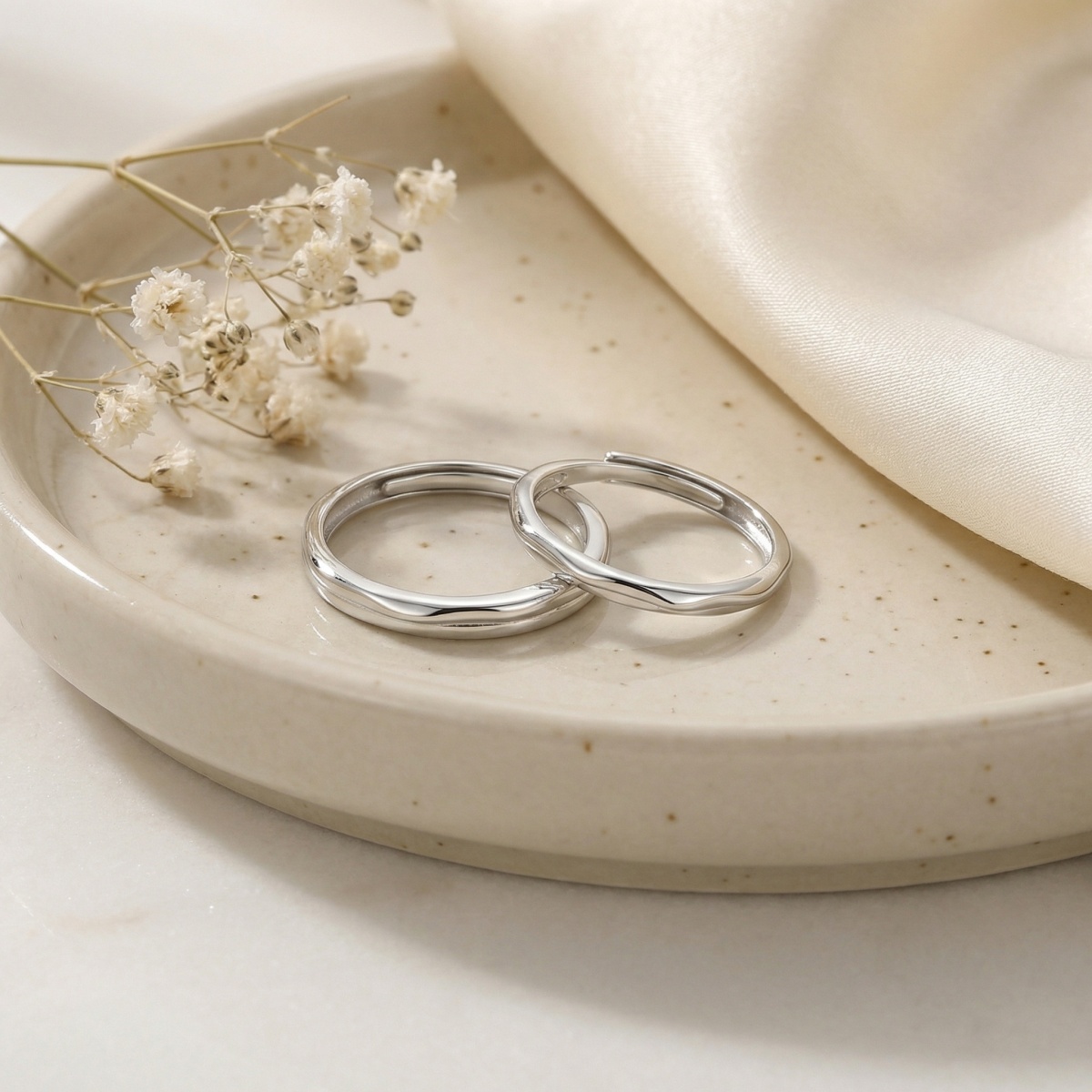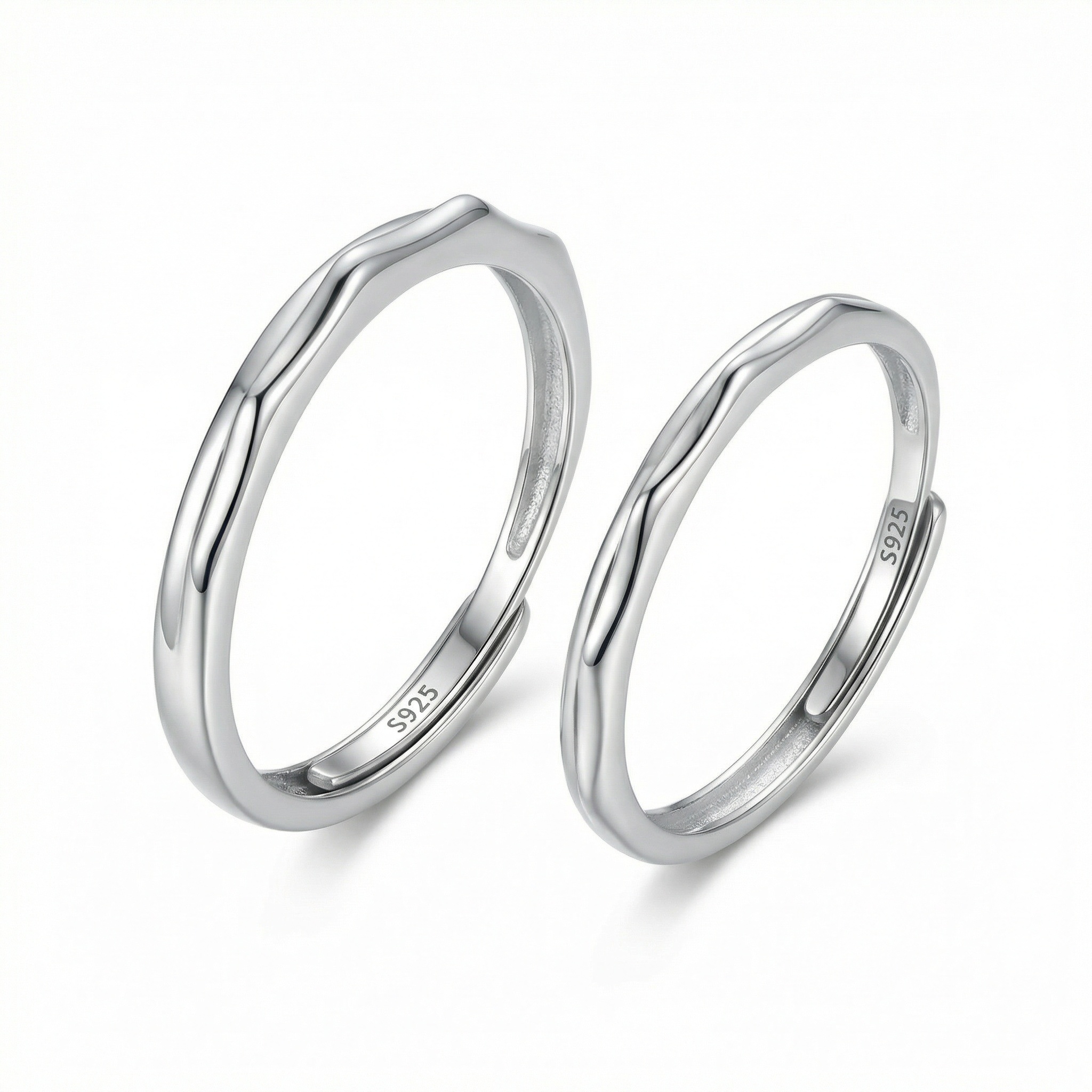 These elegant rings are crafted from high-quality S925 sterling silver, featuring a unique wavy, undulating texture that offers a modern, organic twist on the classic band. The open-back design allows for easy size adjustment, ensuring a comfortable and perfect fit for anyone. This matching set symbolizes a beautiful connection, making it an ideal choice for promise rings, wedding bands, or a thoughtful anniversary gift. With their sleek, minimalist aesthetic and high-polish finish, these rings effortlessly complement any outfit, providing a touch of sophisticated style for both daily wear and special occasions. Timeless and refined, this jewelry set is a perfect testament to understated elegance and quality craftsmanship. | Brand: jewelryodm