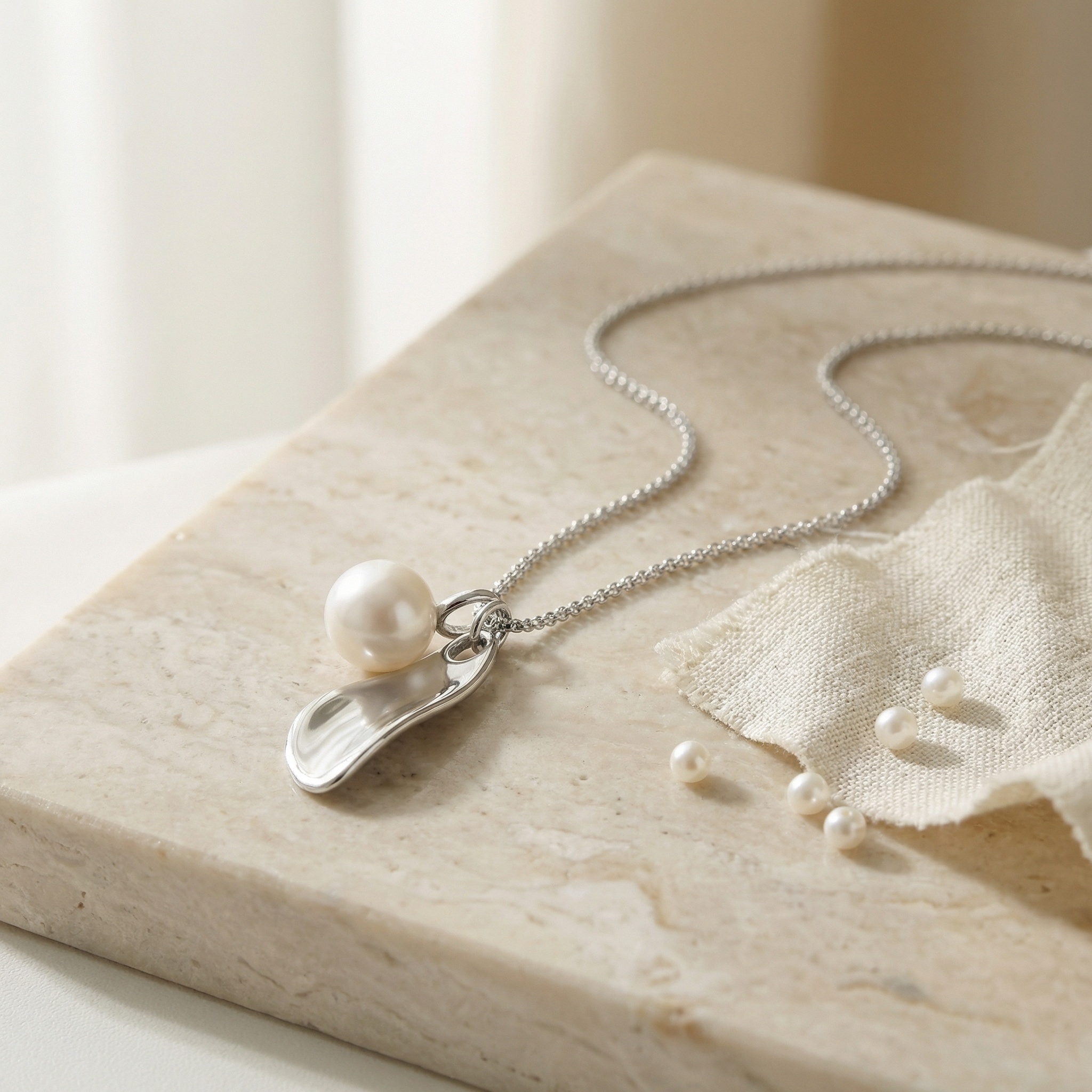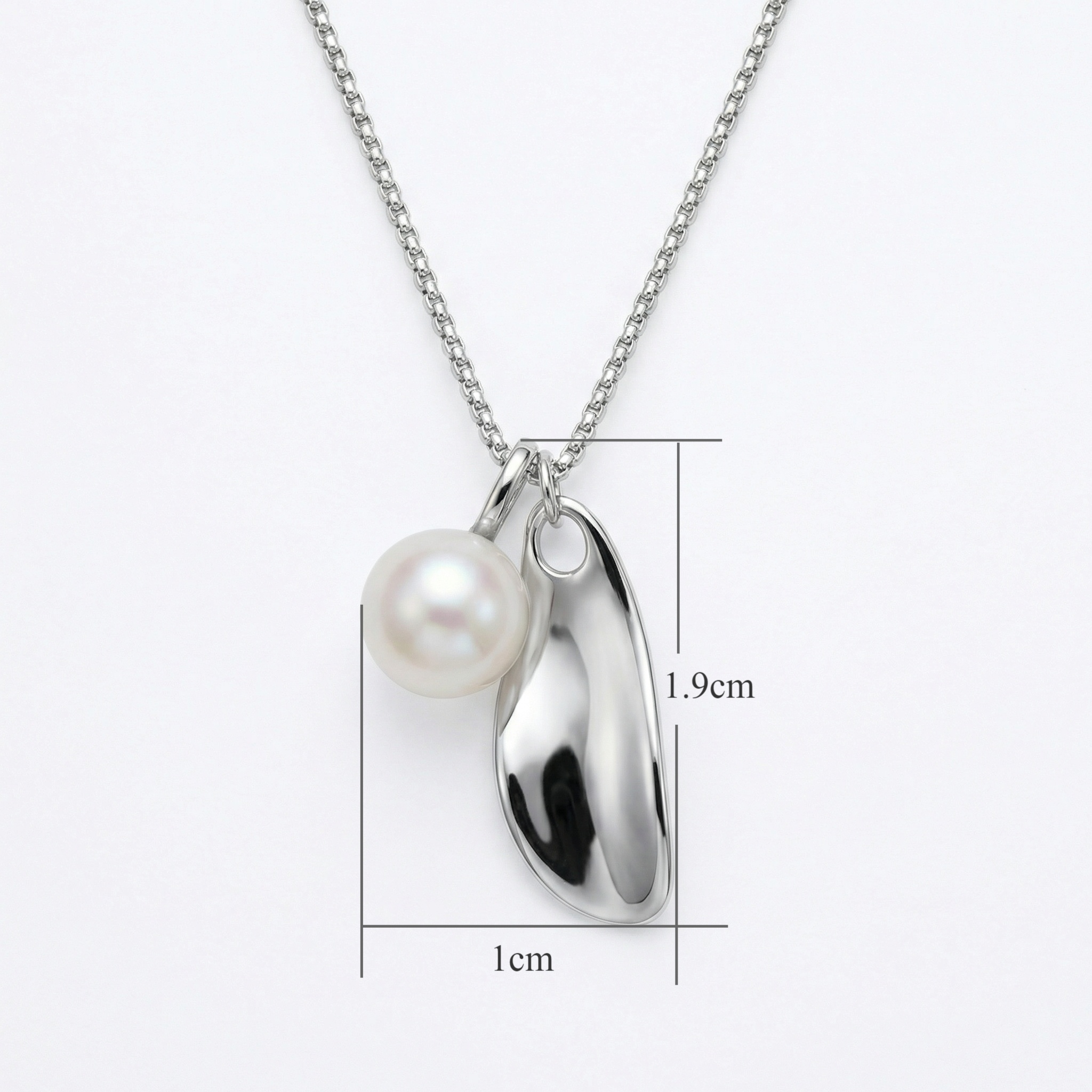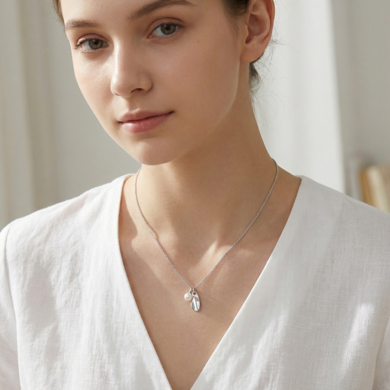 This elegant necklace showcases a sophisticated blend of classic and contemporary design. Suspended from a delicate silver-toned chain are two distinct charms: a perfectly spherical, luminous white pearl and a sleek, organically shaped metal pendant. The high-polish finish of the silver element reflects light beautifully, providing a striking contrast to the soft, iridescent glow of the pearl. Together, these elements create a balanced and artistic aesthetic that embodies modern luxury. Its understated yet eye-catching silhouette makes it a versatile accessory, perfect for adding a touch of refined grace to professional attire or enhancing a formal evening look. This piece is a testament to minimalist beauty and thoughtful craftsmanship, making it a timeless addition to any jewelry collection. | Brand: jewelryodm