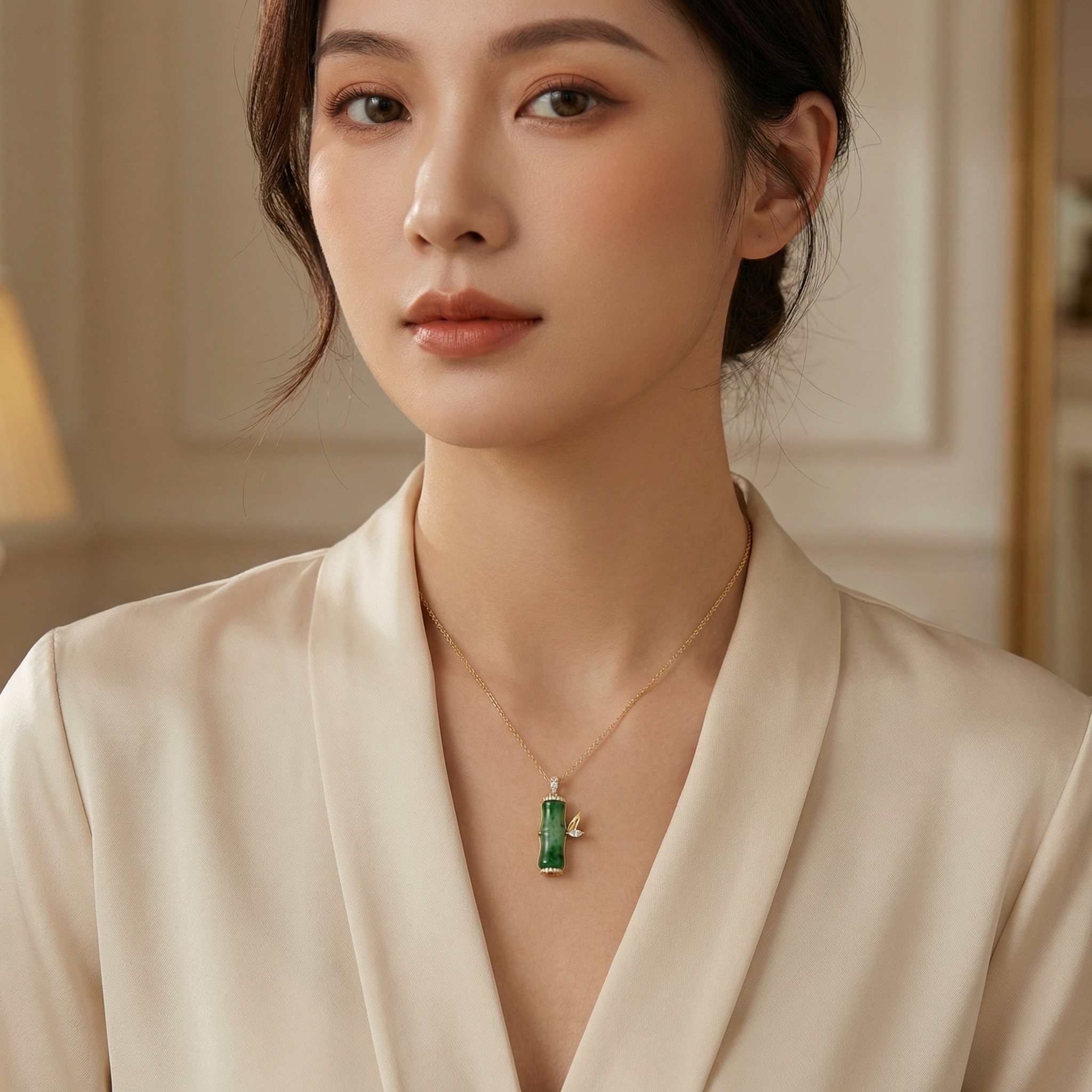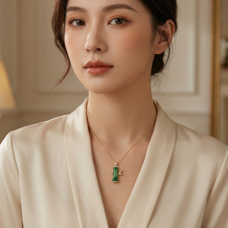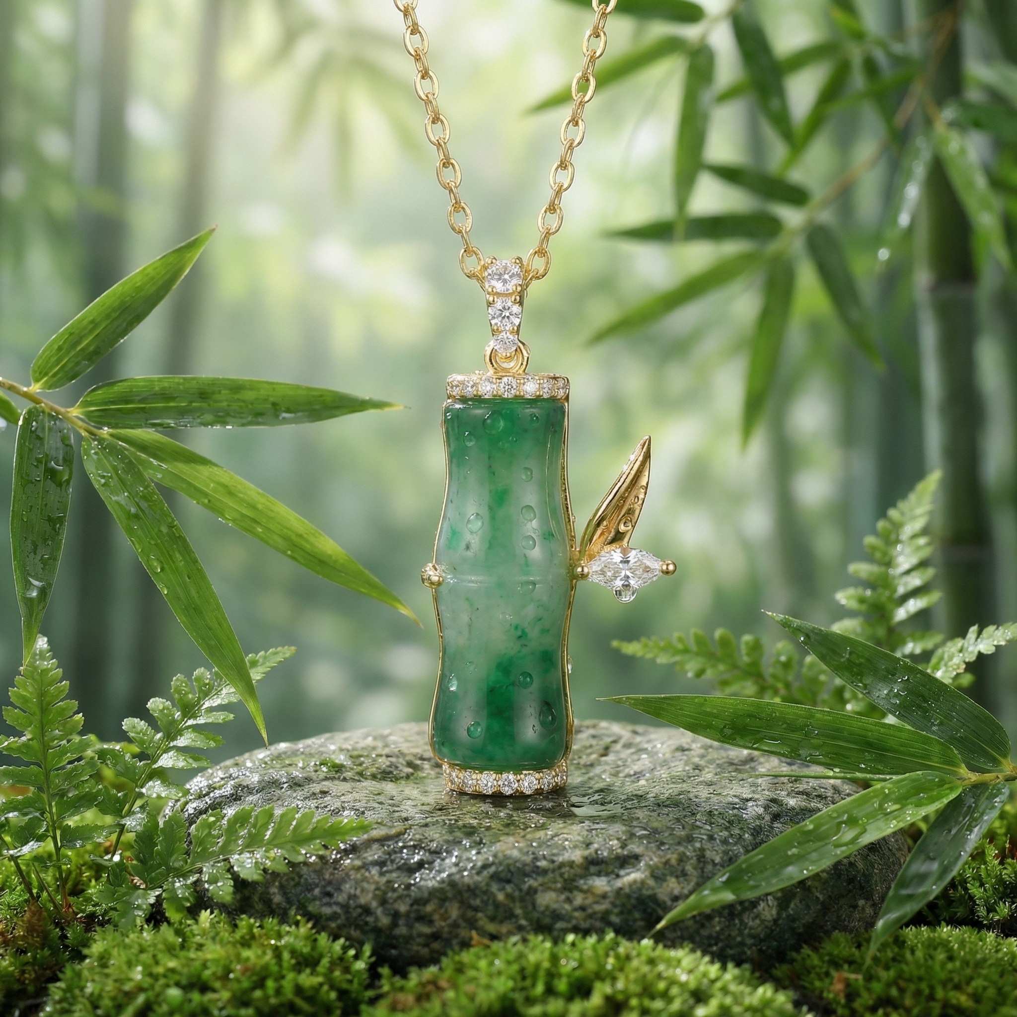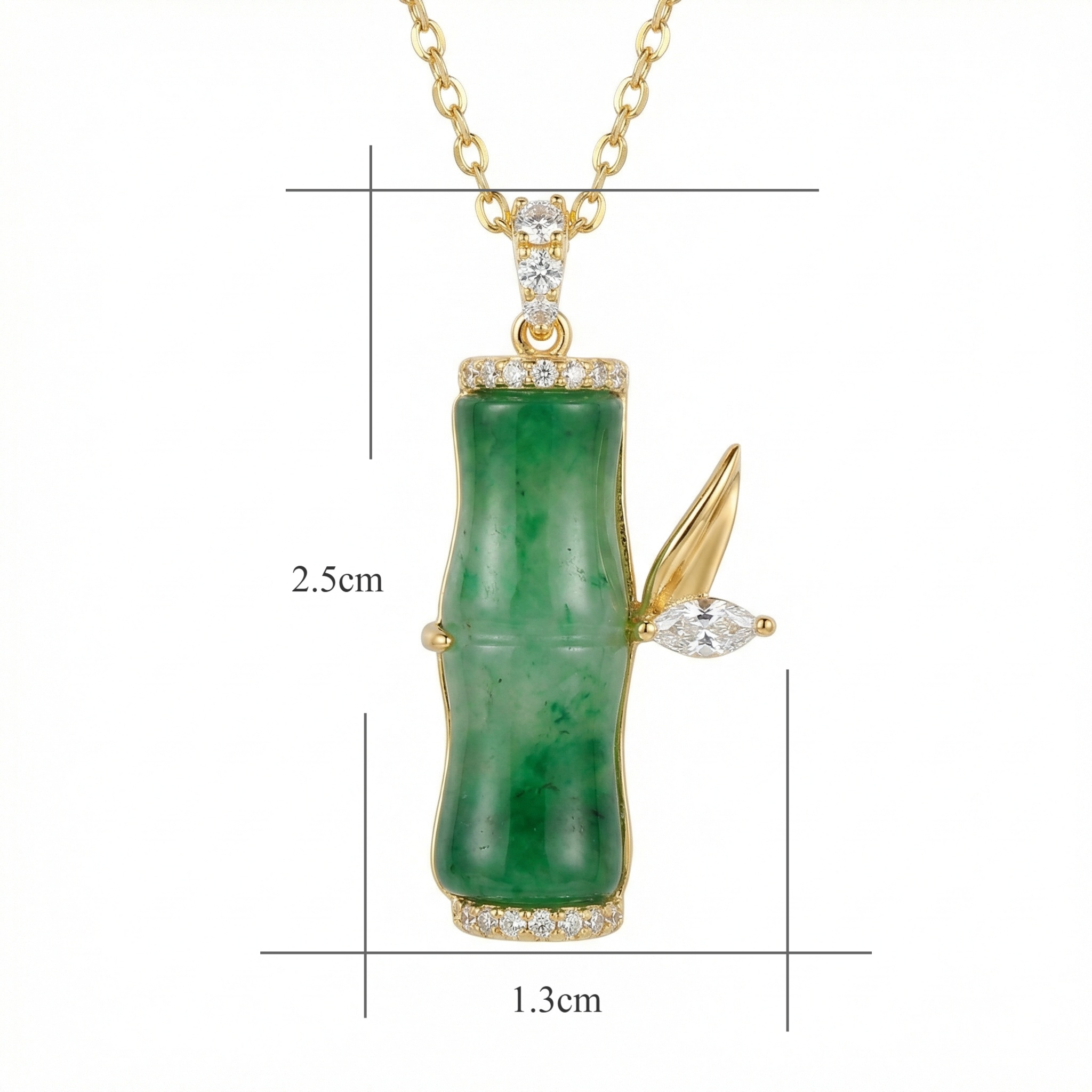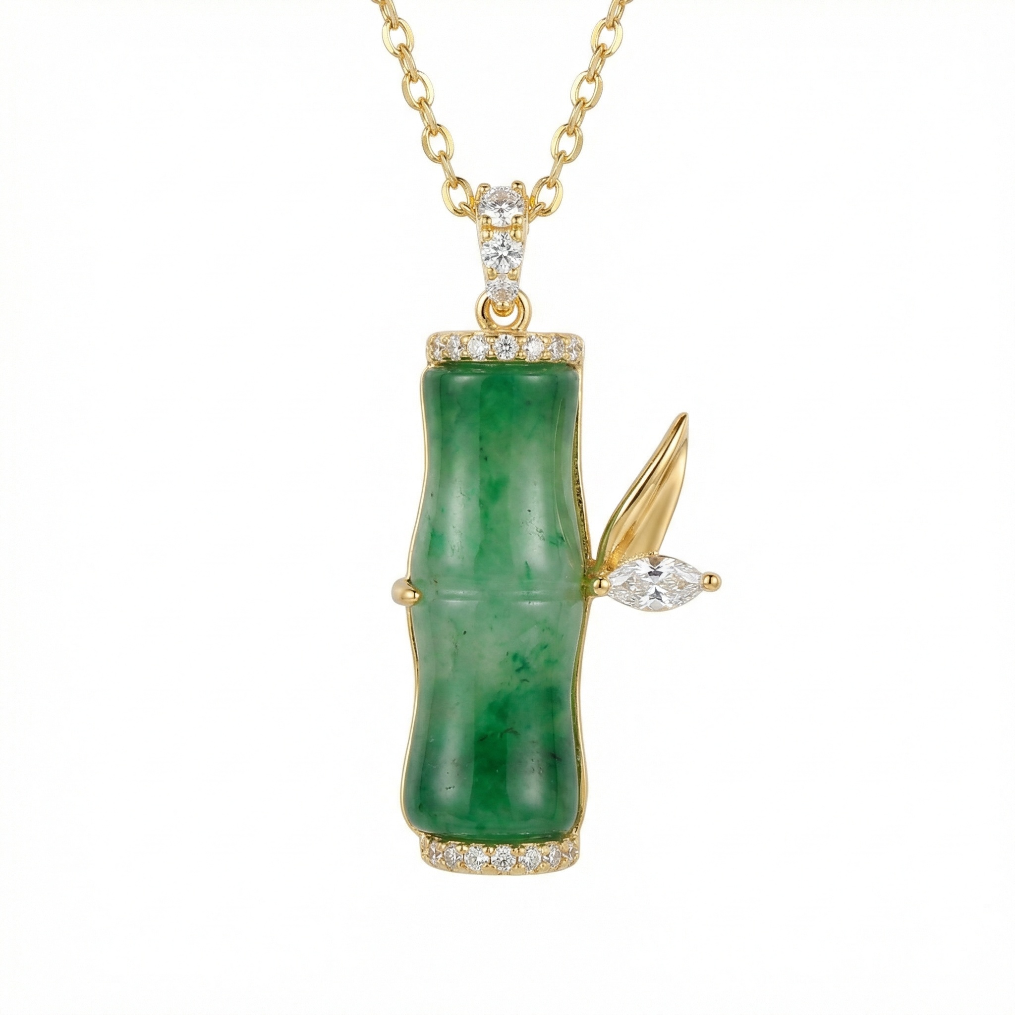 This exquisite pendant showcases a vibrant green jade stalk meticulously carved into a bamboo joint, symbolizing growth and resilience. The piece is elegantly framed with brilliant-cut diamonds at the top and bottom, adding a touch of sophisticated radiance. To the side, a delicate leaf crafted from polished metal and a marquise-cut diamond creates a naturalistic charm. Suspended from a slender link chain, this jewelry piece blends traditional cultural motifs with modern luxury. The rich emerald hues of the jade contrast beautifully with the shimmering accents, making it a perfect accessory for both special occasions and everyday elegance. Its intricate craftsmanship reflects a timeless appeal that celebrates the beauty of nature and fine artistry. | Brand: jewelryodm