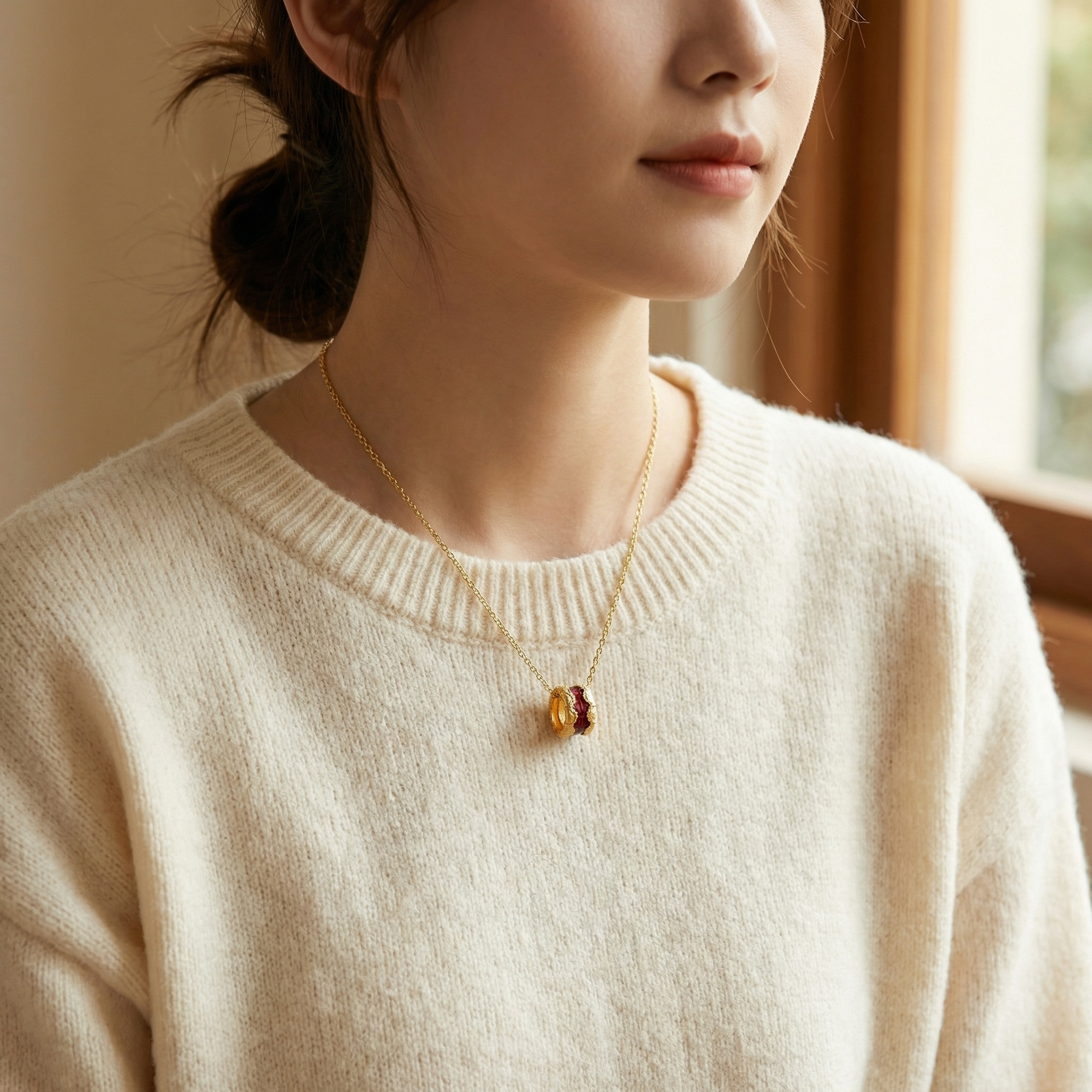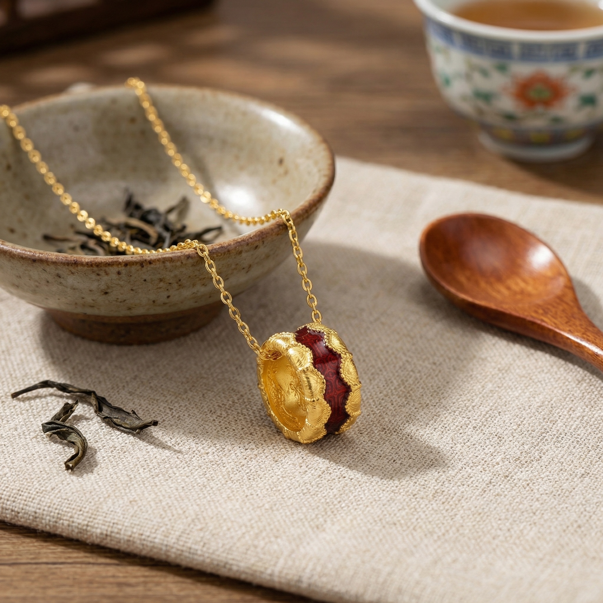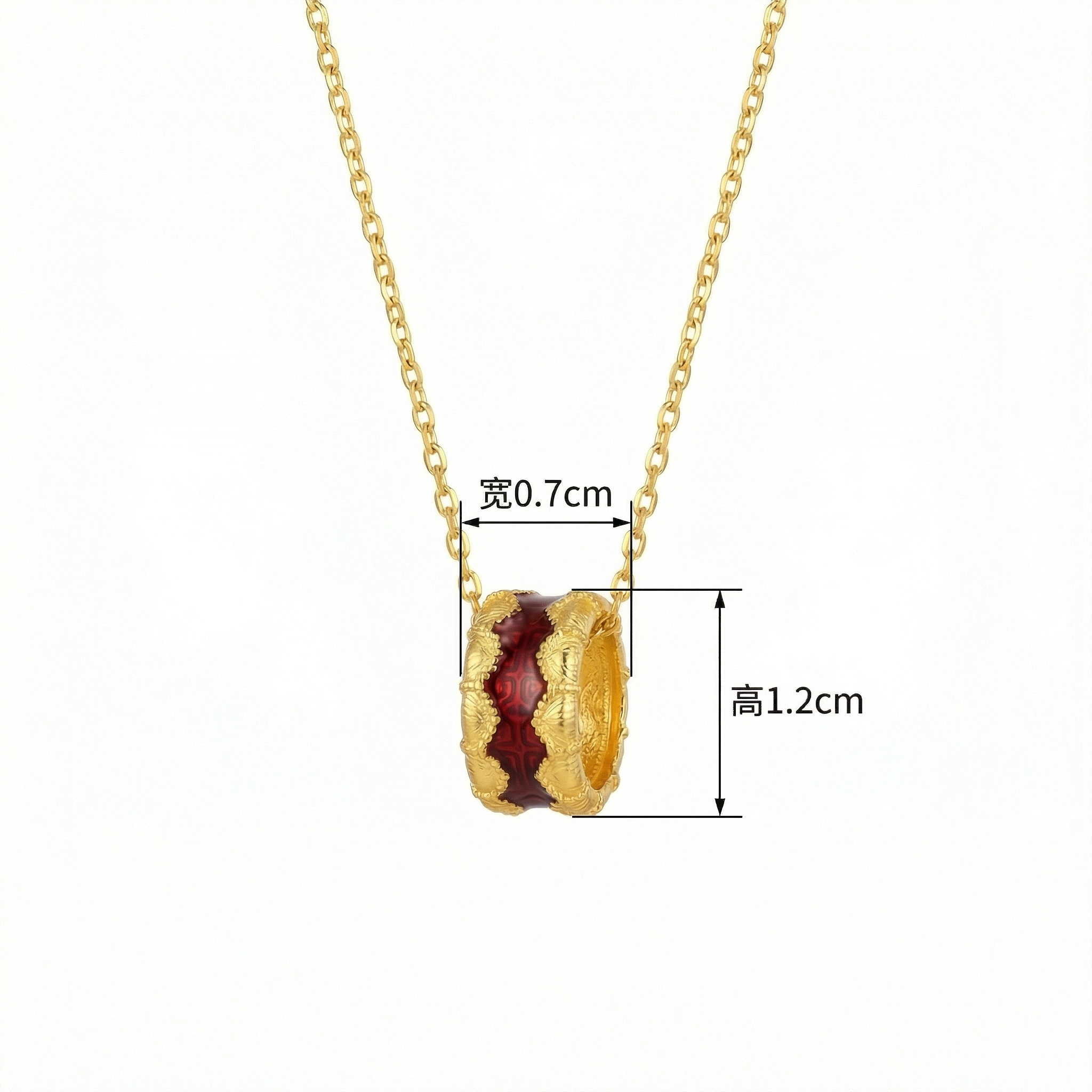 This exquisite necklace features a barrel-shaped pendant meticulously crafted with intricate metallic detailing and vibrant red enamel. The central band showcases a deep crimson hue adorned with subtle geometric patterns, sandwiched between two ornate, scalloped borders that radiate a brilliant metallic sheen. Each edge is textured with fine filigree-like carvings, adding a touch of vintage elegance to the modern sliding design. Suspended from a delicate cable chain, the pendant serves as a sophisticated focal point, perfect for adding a pop of color and classical artistry to any ensemble. Whether worn for a special occasion or as a daily statement piece, its timeless appeal and detailed workmanship make it a standout addition to any jewelry collection. | Brand: jewelryodm
