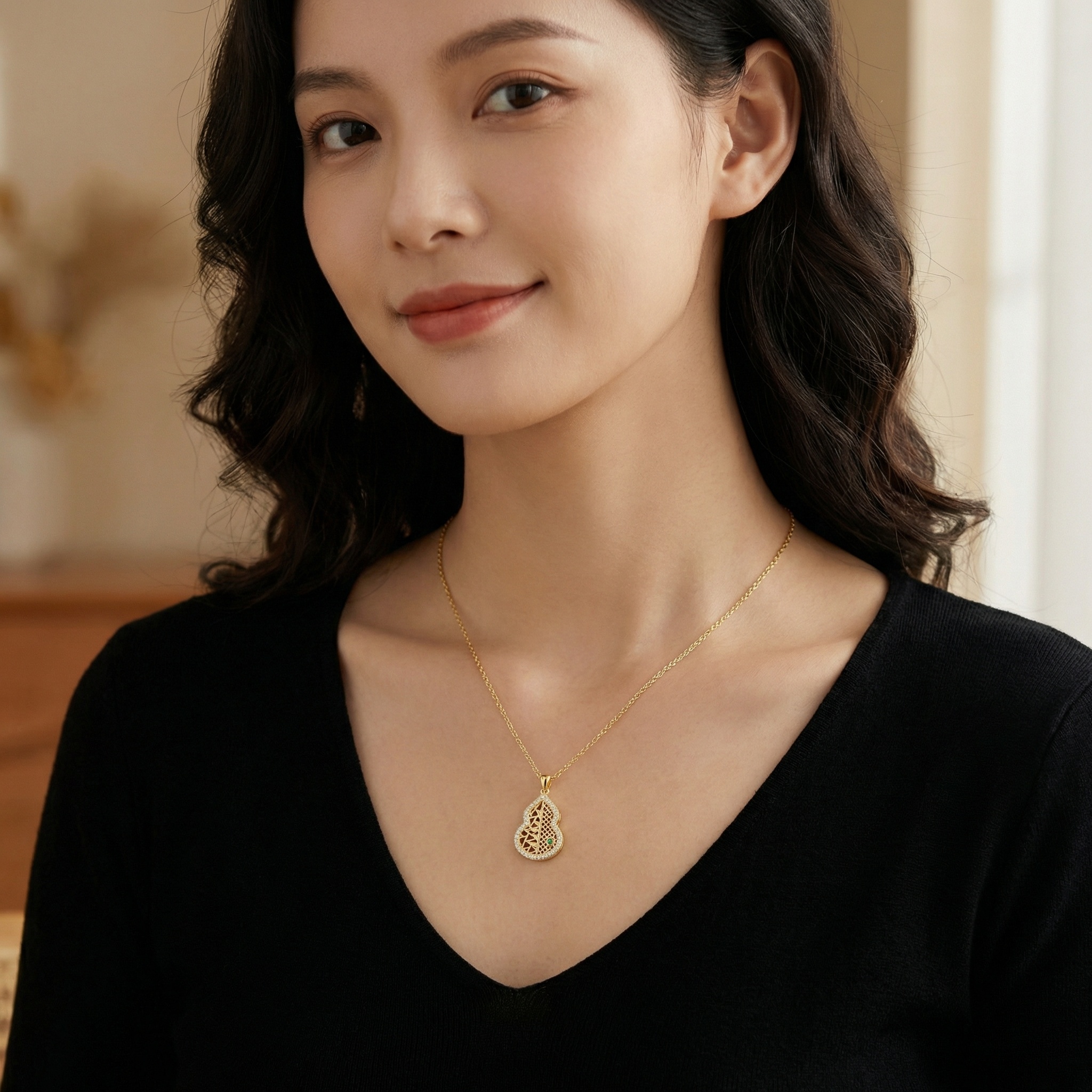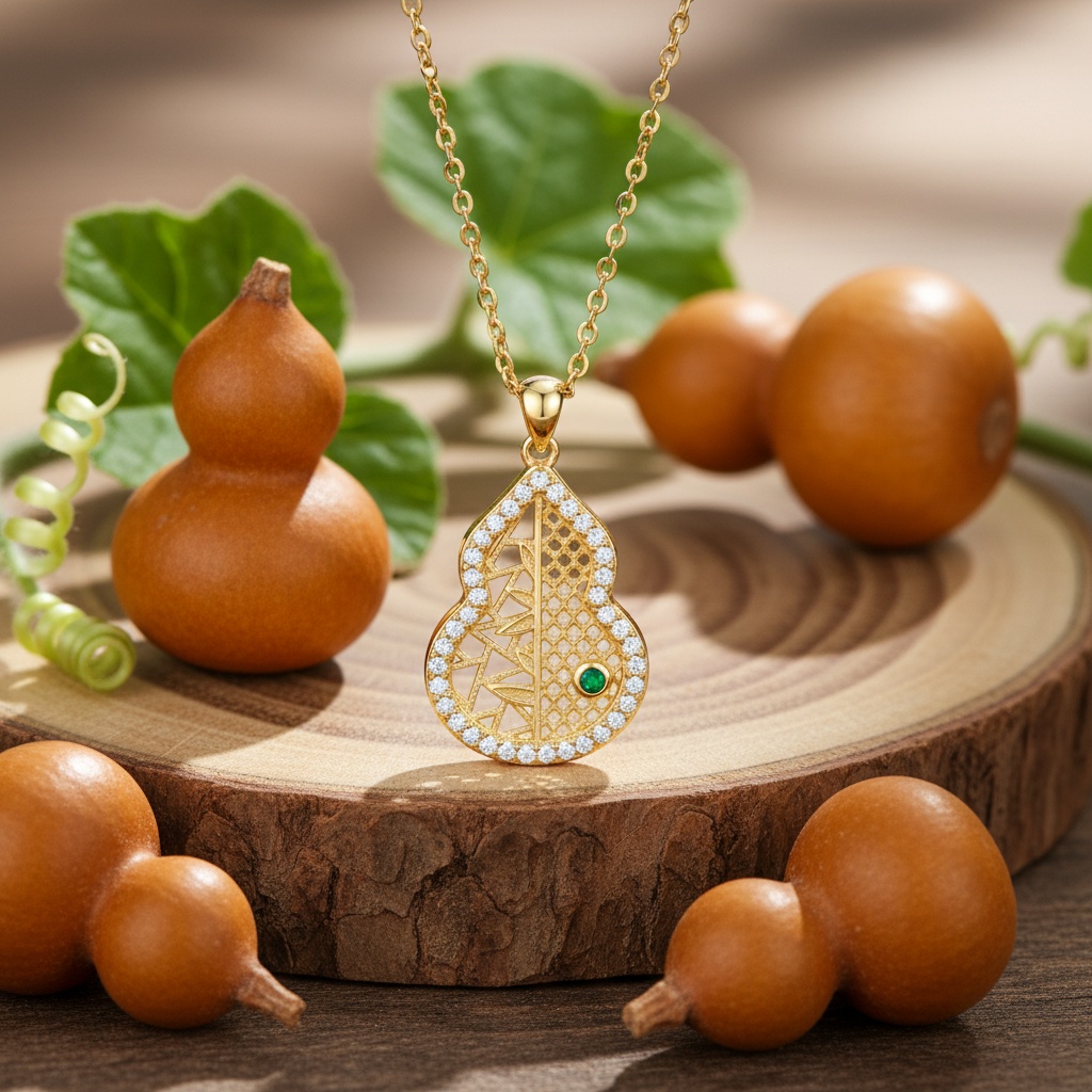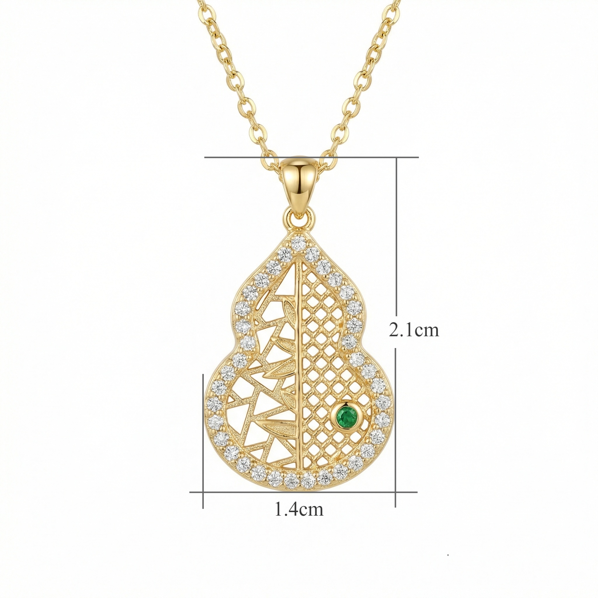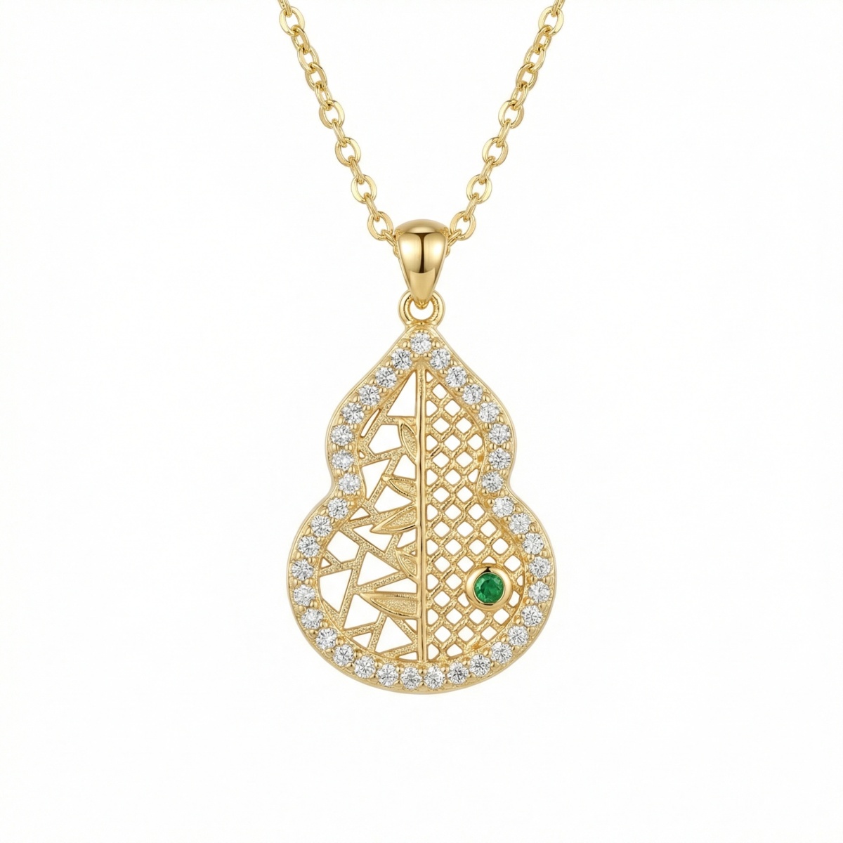 This exquisite necklace features a beautifully crafted gourd-shaped pendant, a symbol of prosperity and well-being. The pendant showcases a unique split design: one side boasts an intricate geometric lattice, while the other features delicate leaf-like patterns. Encircled by a halo of brilliant clear stones that catch the light from every angle, the piece is further elevated by a single, striking green gemstone nestled within the filigree. Hanging from a delicate link chain, this warm-toned accessory blends traditional cultural symbolism with contemporary elegance. Perfect for adding a touch of sophisticated charm to any ensemble, this piece reflects meticulous attention to detail and artistic flair. Whether worn as a statement piece or a daily charm, its timeless design and radiant finish make it a versatile addition to any jewelry collection. | Brand: jewelryodm