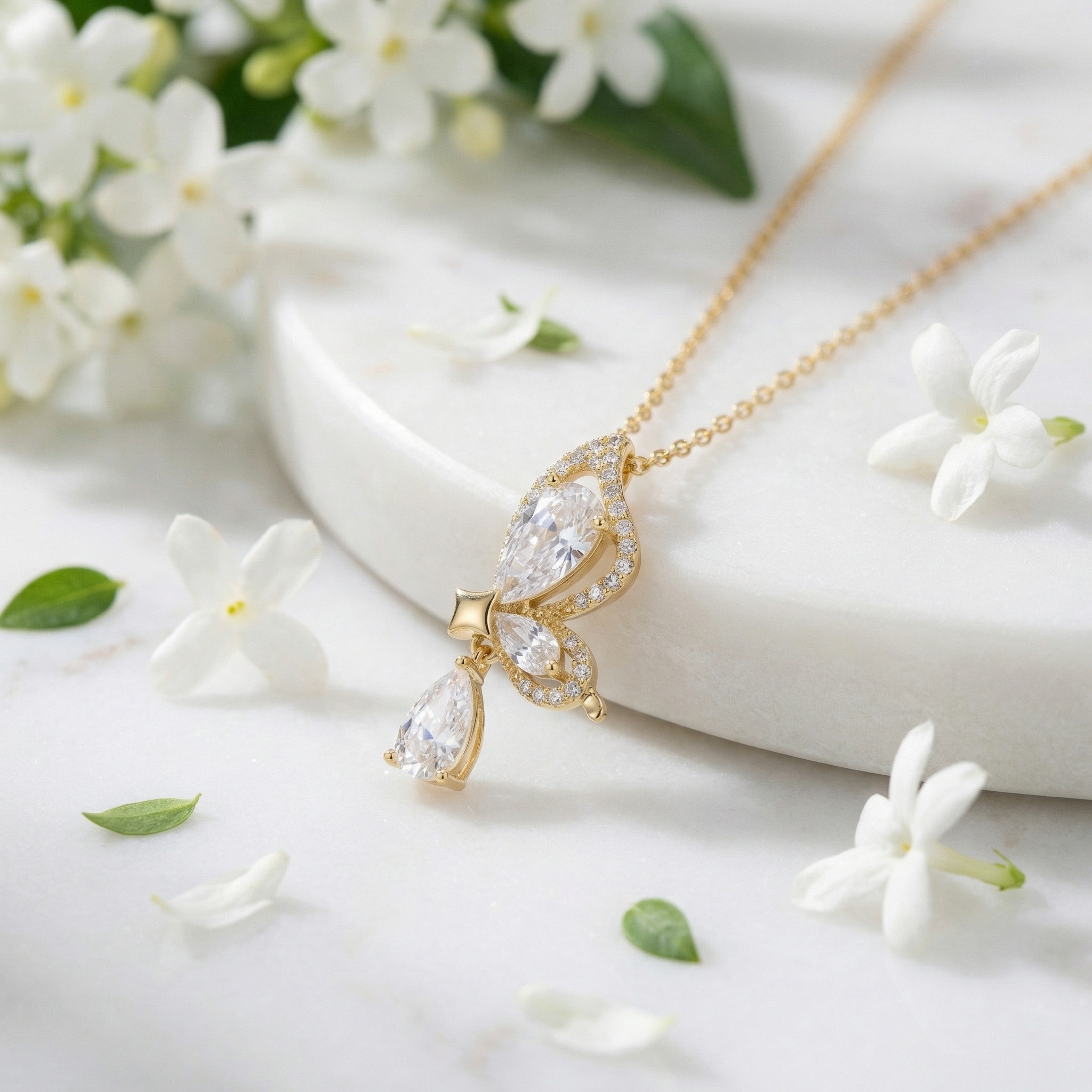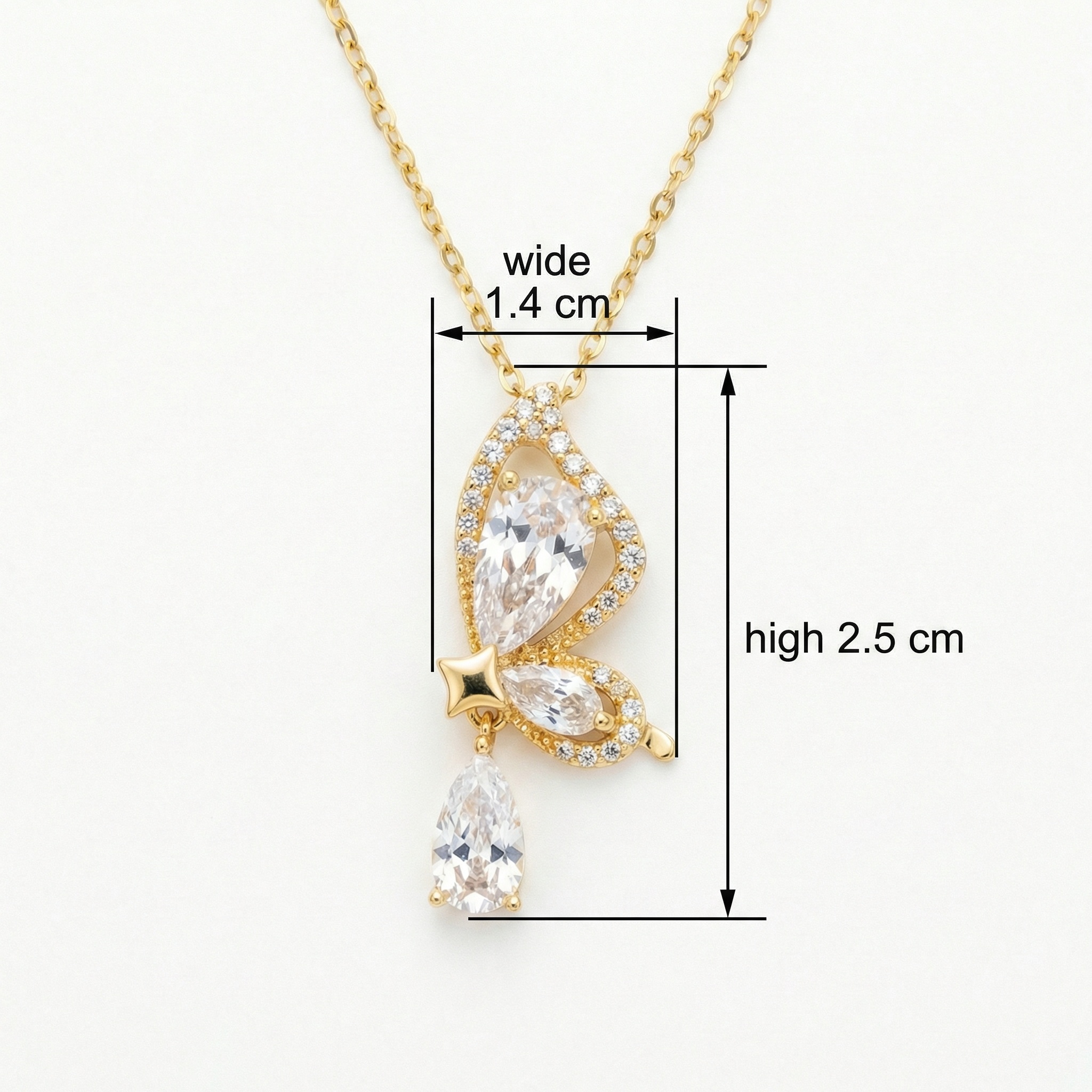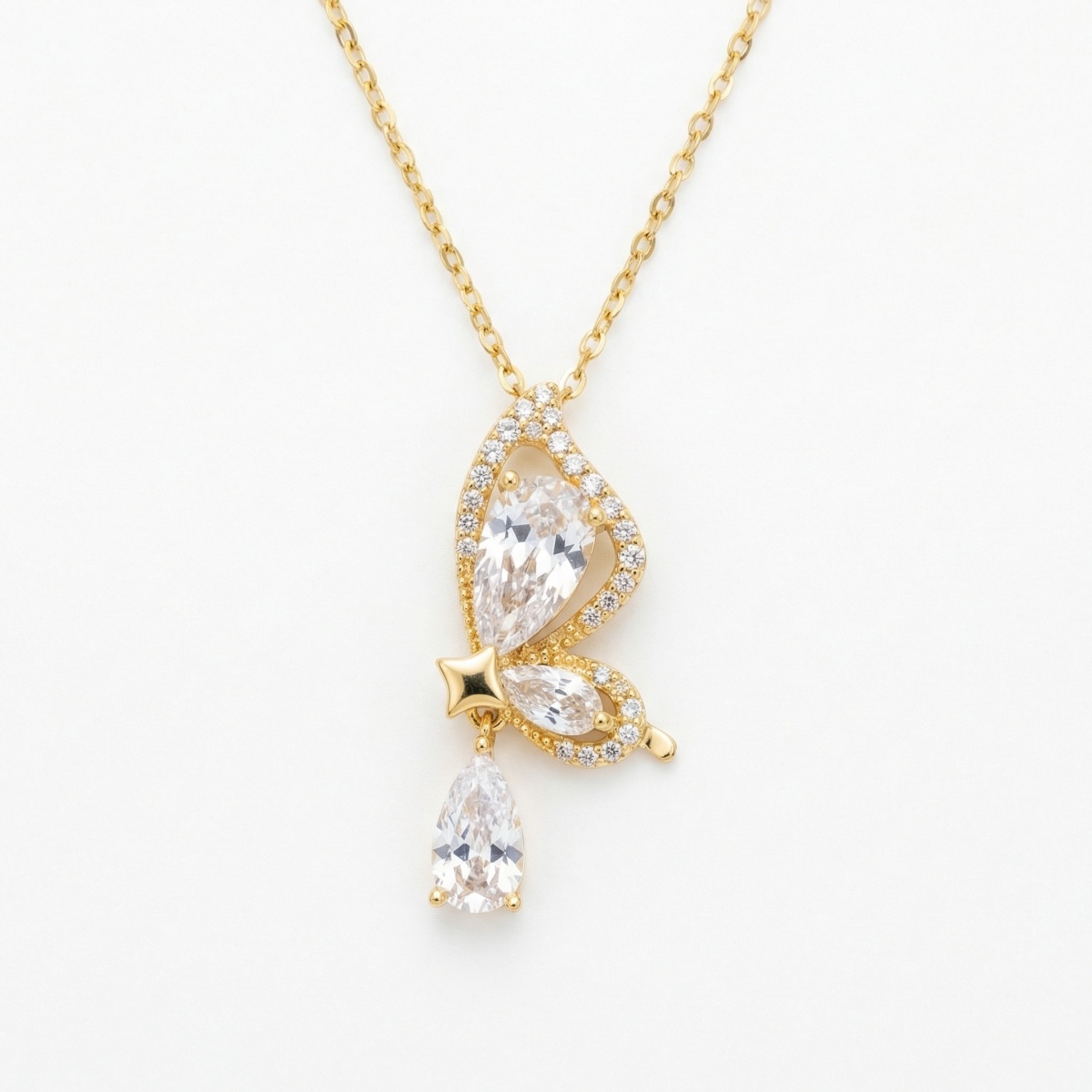 This elegant necklace features a beautifully detailed butterfly pendant with a warm metallic luster. The design includes three striking pear-cut clear stones: two serve as the butterfly's wings, while the third hangs as a shimmering teardrop charm. Sparkling pavé accents line the butterfly's delicate wings, catching the light from every angle. A small star-shaped detail sits at the center, connecting the charm to the pendant. Suspended from a dainty link chain, this piece offers a refined and whimsical look inspired by nature. Its brilliant stones and intricate craftsmanship make it a versatile accessory for adding a touch of sophisticated glamour to any outfit, symbolizing grace and transformation. | Brand: jewelryodm