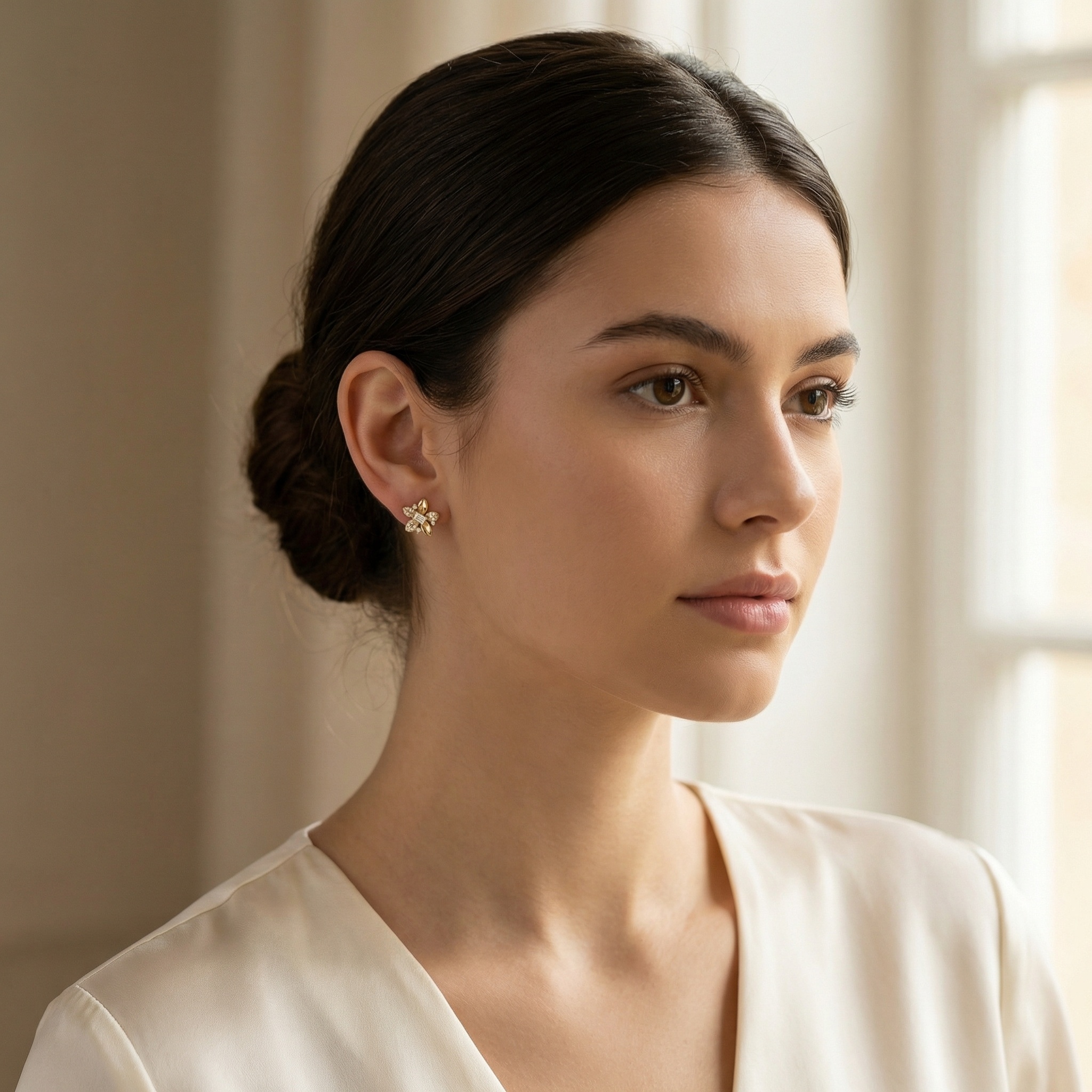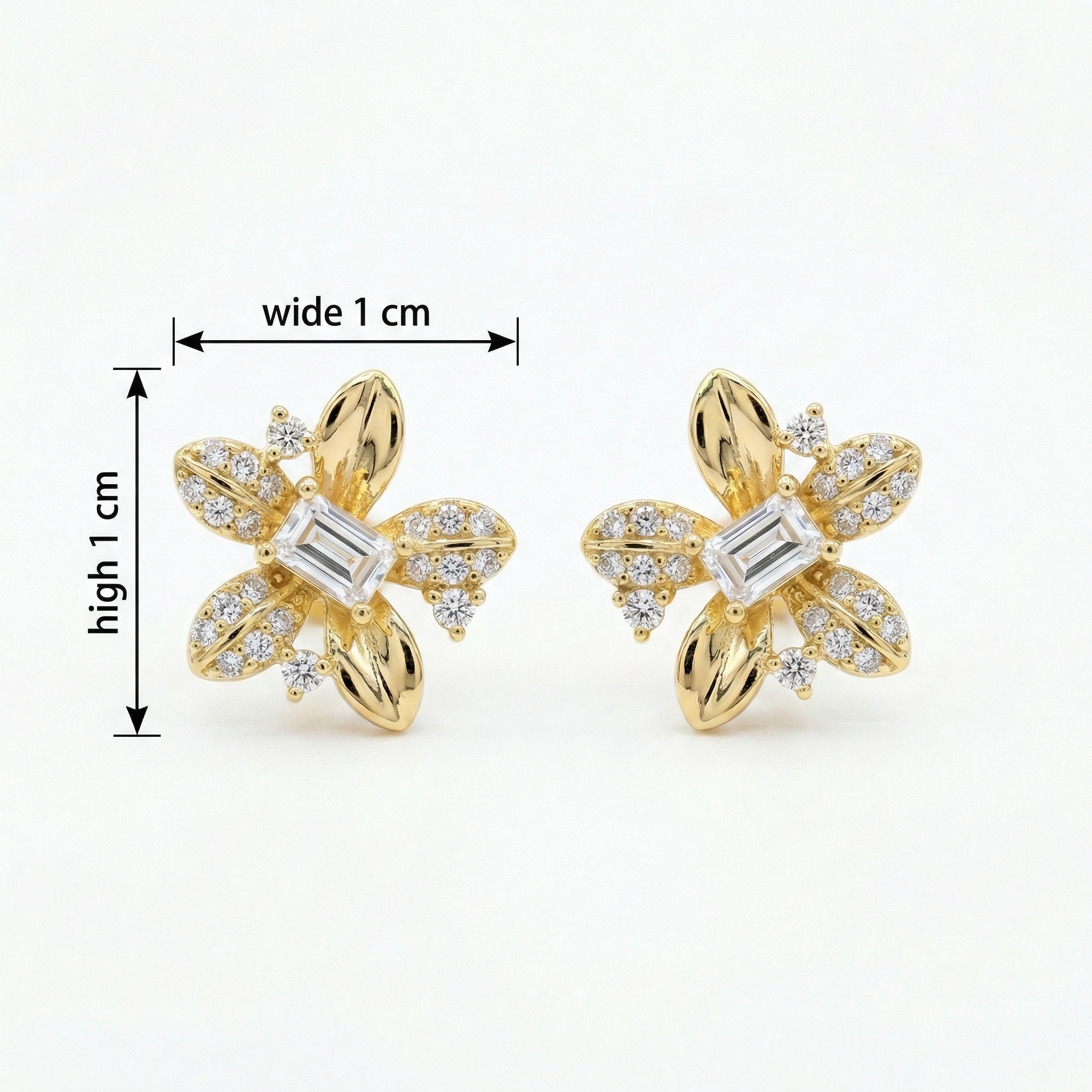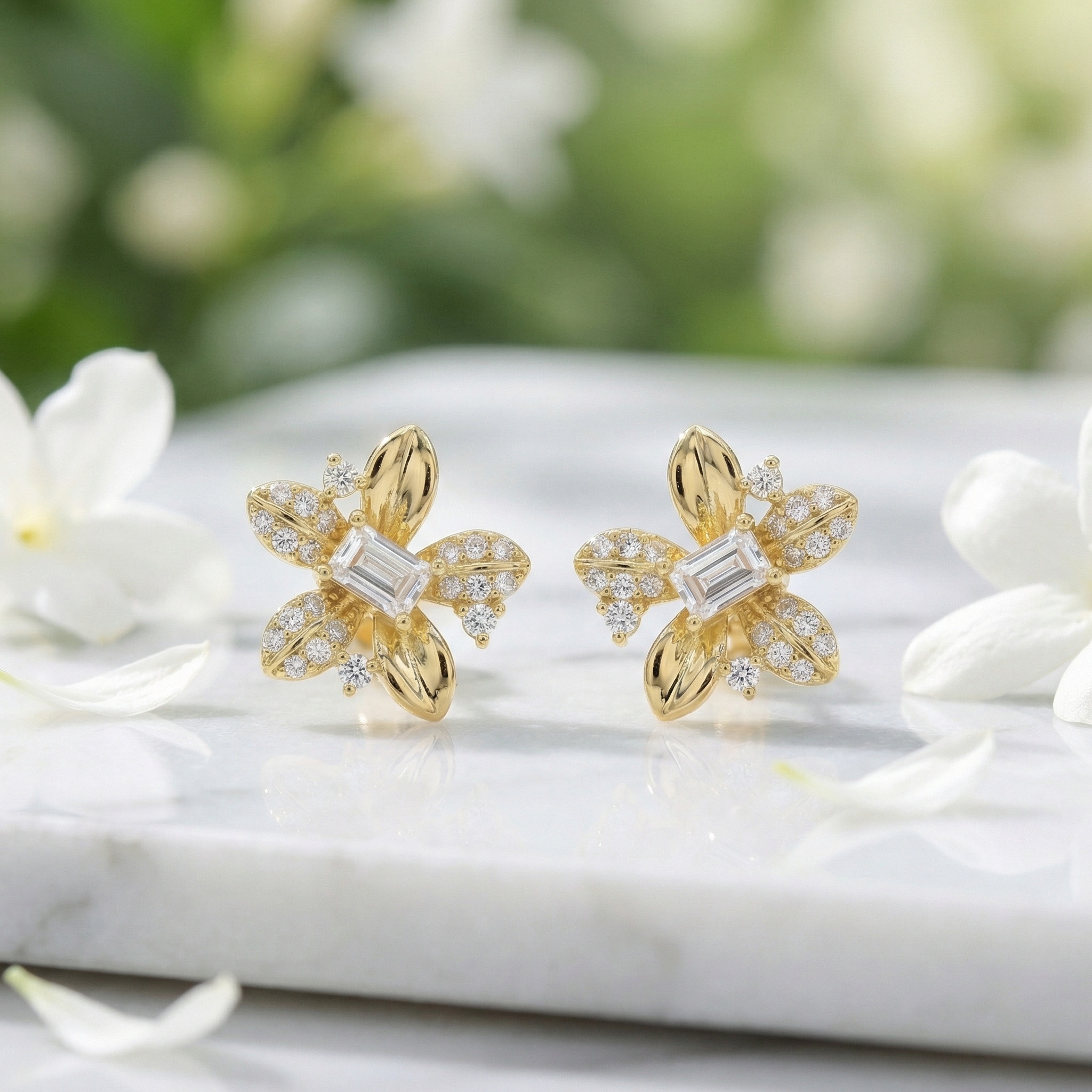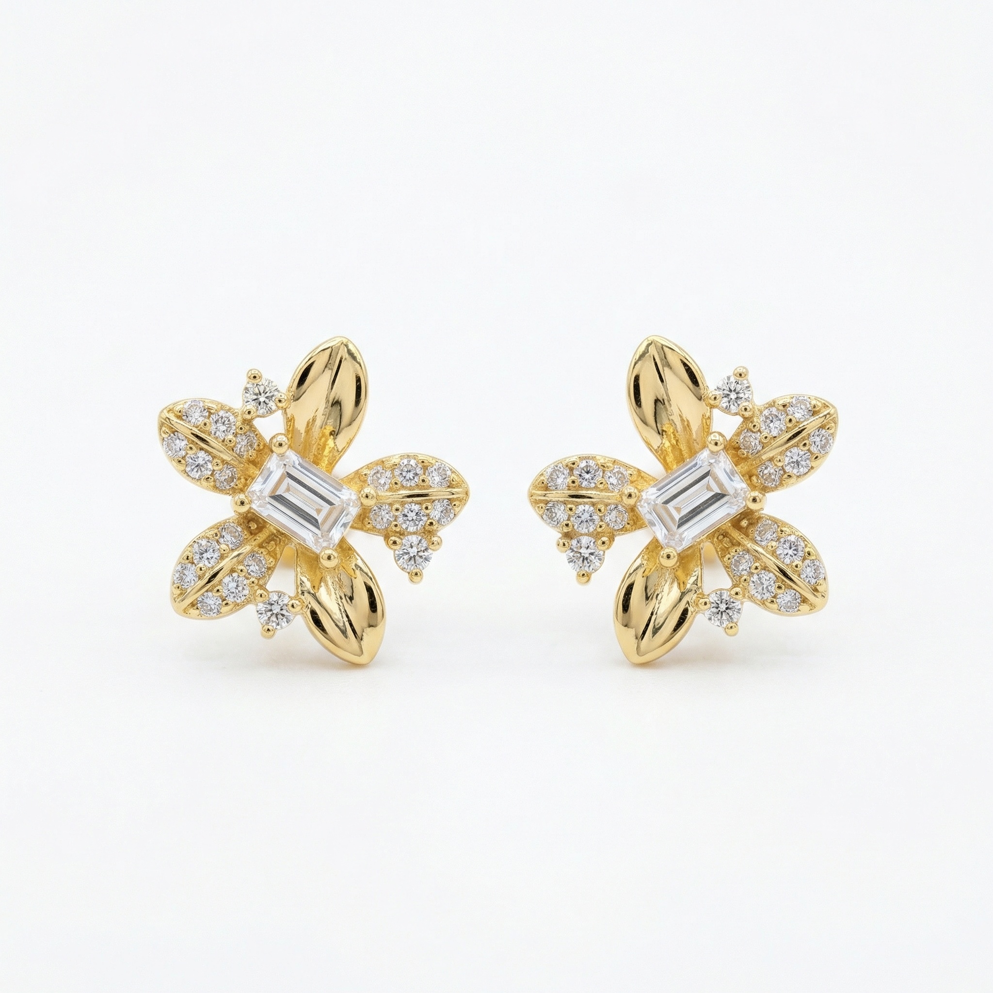 These exquisite earrings capture the essence of a blooming lily, blending classic elegance with contemporary brilliance. Each stud features a striking emerald-cut stone at its center, surrounded by meticulously crafted petals. The design showcases a beautiful contrast between polished warm-toned metal and shimmering pavé-set round diamonds. Two smooth petals catch the light with a mirror-like finish, while the others are encrusted with sparkling accents that enhance the overall radiance. Additional diamond clusters between the petals add a touch of intricate detail, making these pieces a true statement of craftsmanship. Designed for those who appreciate nature-inspired luxury, these earrings offer a sophisticated silhouette that transitions effortlessly from day to night. Perfectly balanced and timeless, they are a radiant addition to any fine jewelry collection. | Brand: jewelryodm