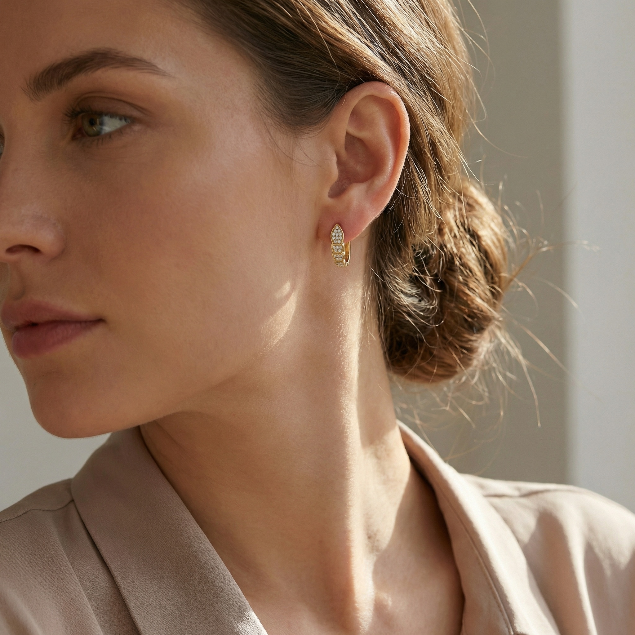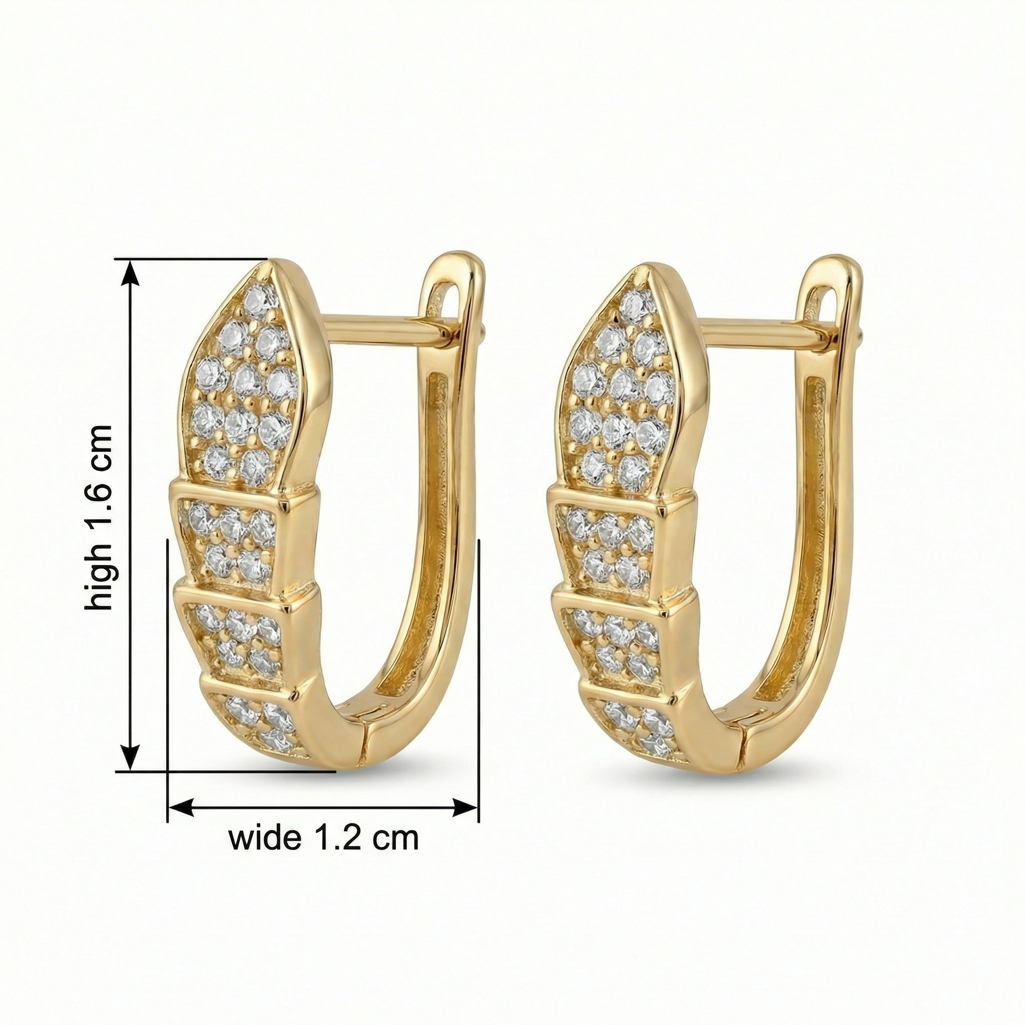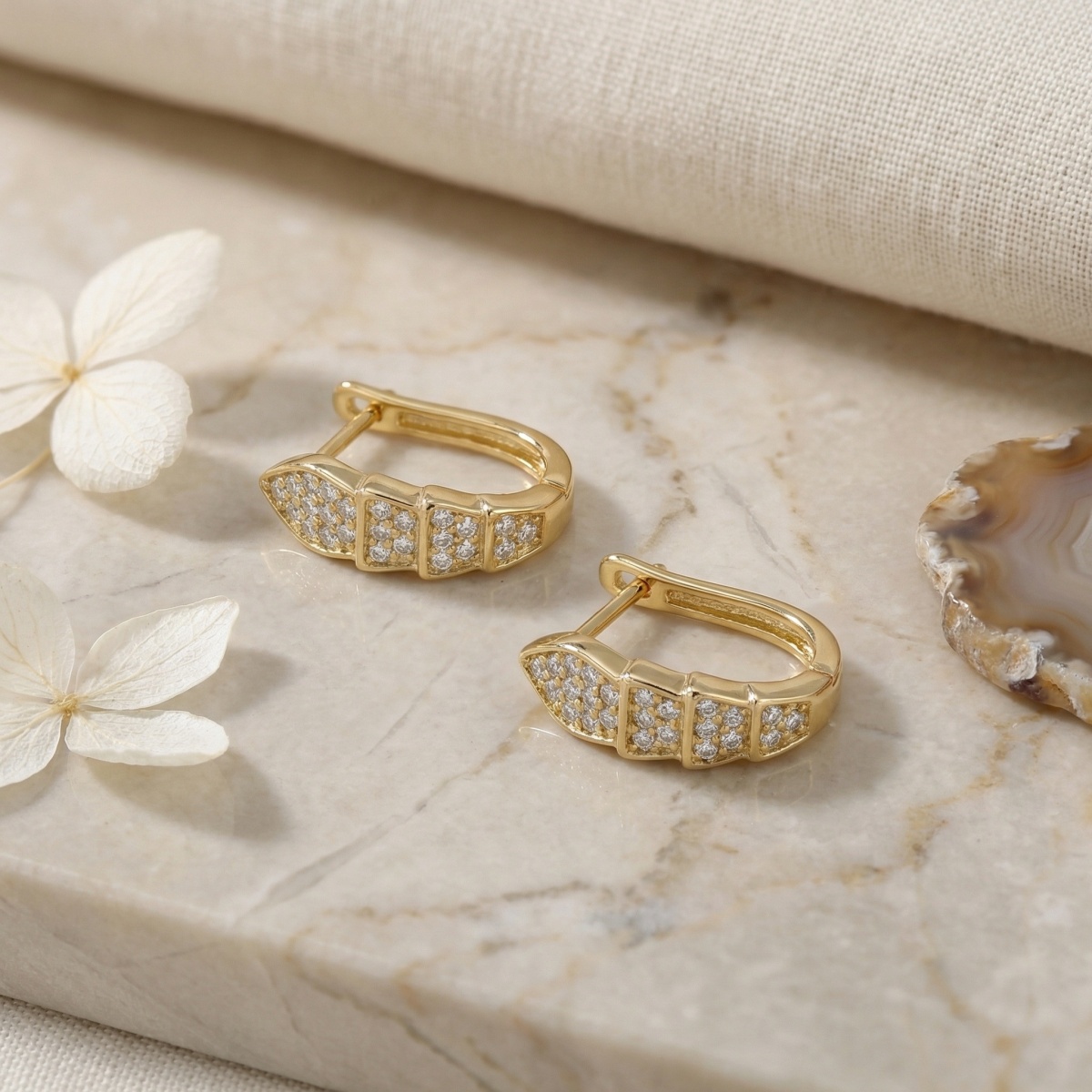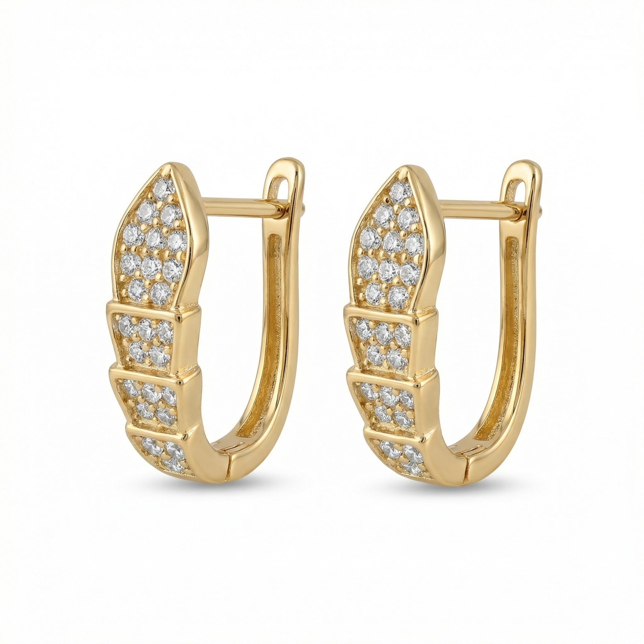 Elevate your style with these stunning hoop earrings, designed for a modern and sophisticated look. Each earring features a unique segmented design with an organic texture, adding a bold yet elegant touch to your ensemble. Adorned with rows of brilliant clear stones in a meticulous pavé setting, they capture and reflect light beautifully from every angle. The warm-toned metallic finish provides a rich glow that complements any skin tone. Equipped with a secure hinged snap closure, these earrings offer both comfort and security for everyday wear or special evening events. Perfect as a thoughtful gift or a luxurious personal treat, these hoops blend timeless glamour with contemporary artistry to create a versatile accessory for any wardrobe. | Brand: jewelryodm