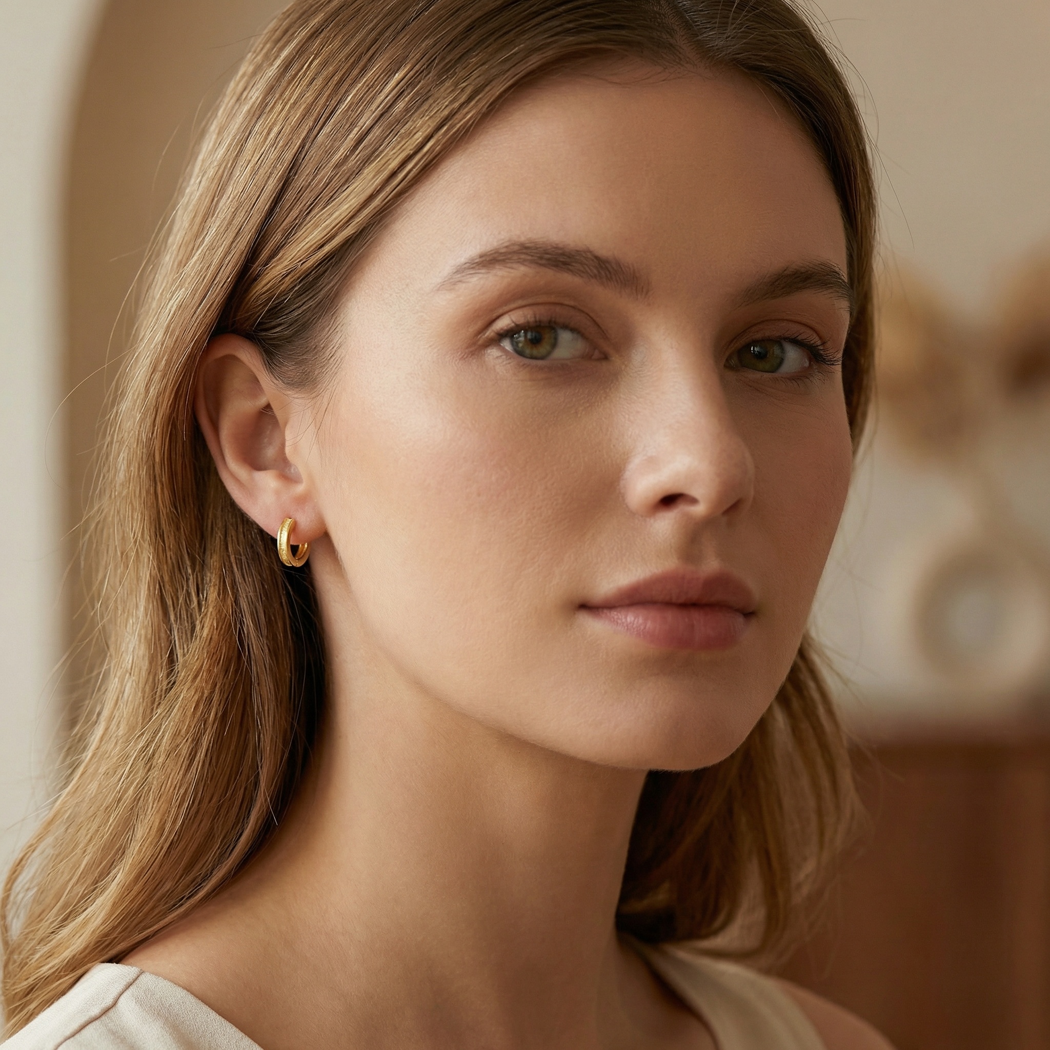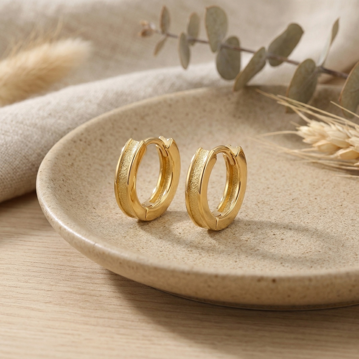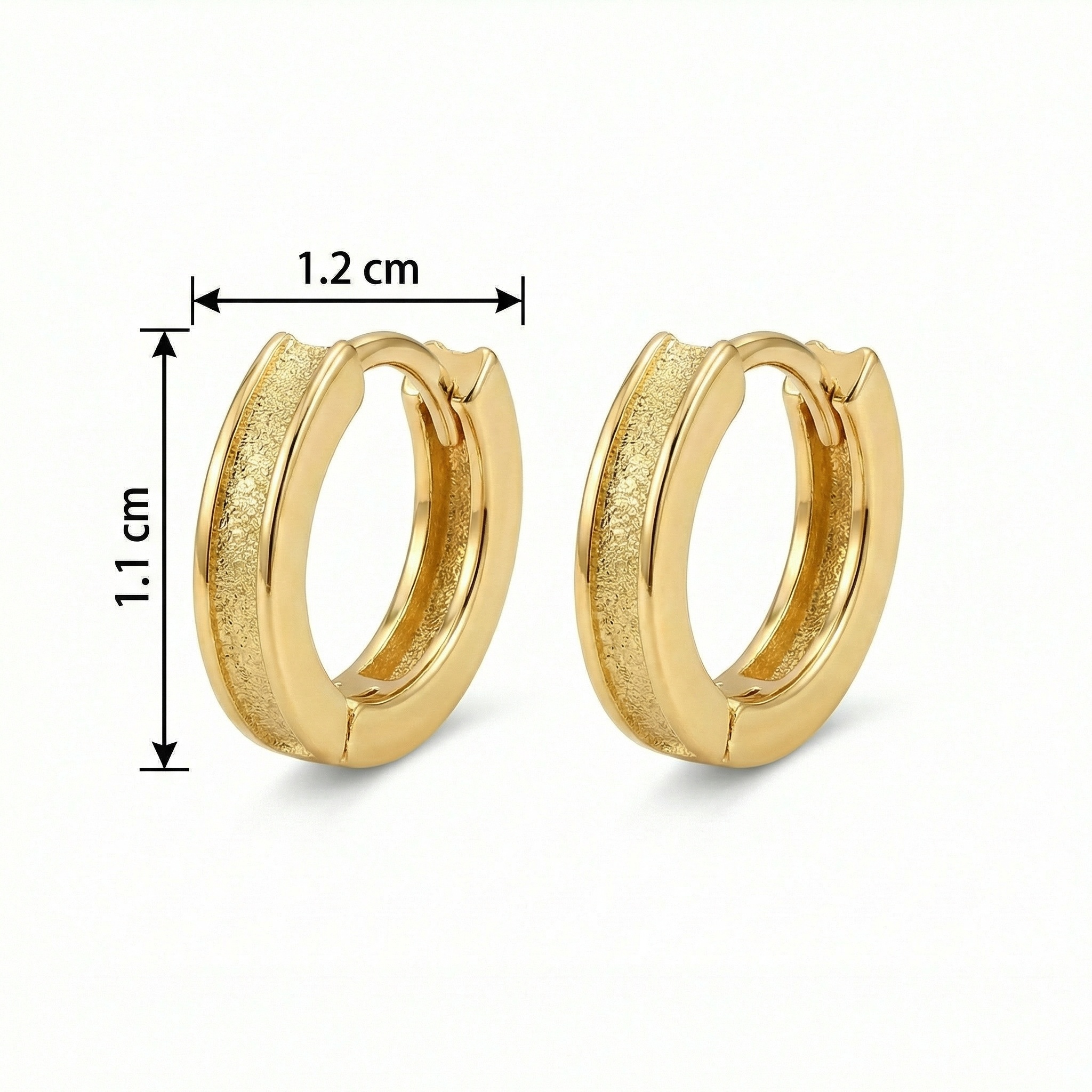 Elevate your everyday style with these exquisite huggie hoop earrings. Crafted with meticulous attention to detail, each earring features a striking contrast between the textured sandblasted center and the gleaming polished borders. The unique dual-finish design adds a modern touch to a classic silhouette, making them perfect for both casual and formal occasions. These small yet impactful hoops are designed for comfort and ease of wear, featuring a secure hinged closure that clicks into place. The warm metallic hue captures the light beautifully, providing a subtle shimmer that complements any skin tone. Whether worn alone or layered with other studs, these versatile earrings are a must-have addition to any jewelry collection. Experience the perfect blend of contemporary artistry and timeless elegance with this sophisticated pair. | Brand: jewelryodm