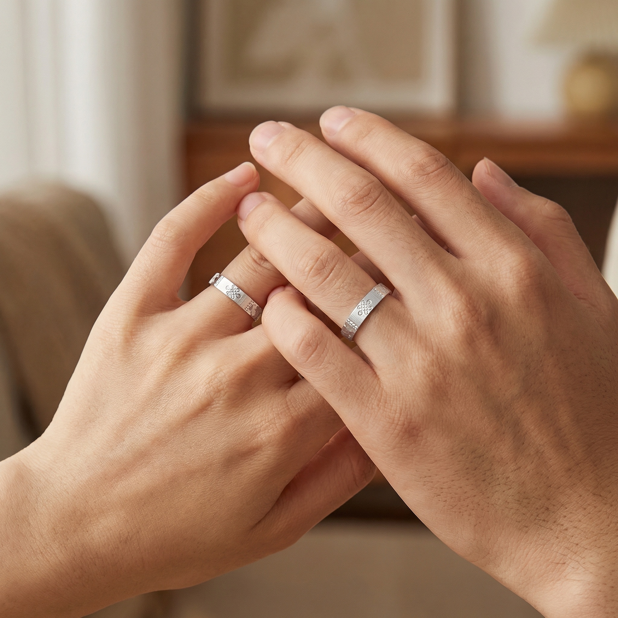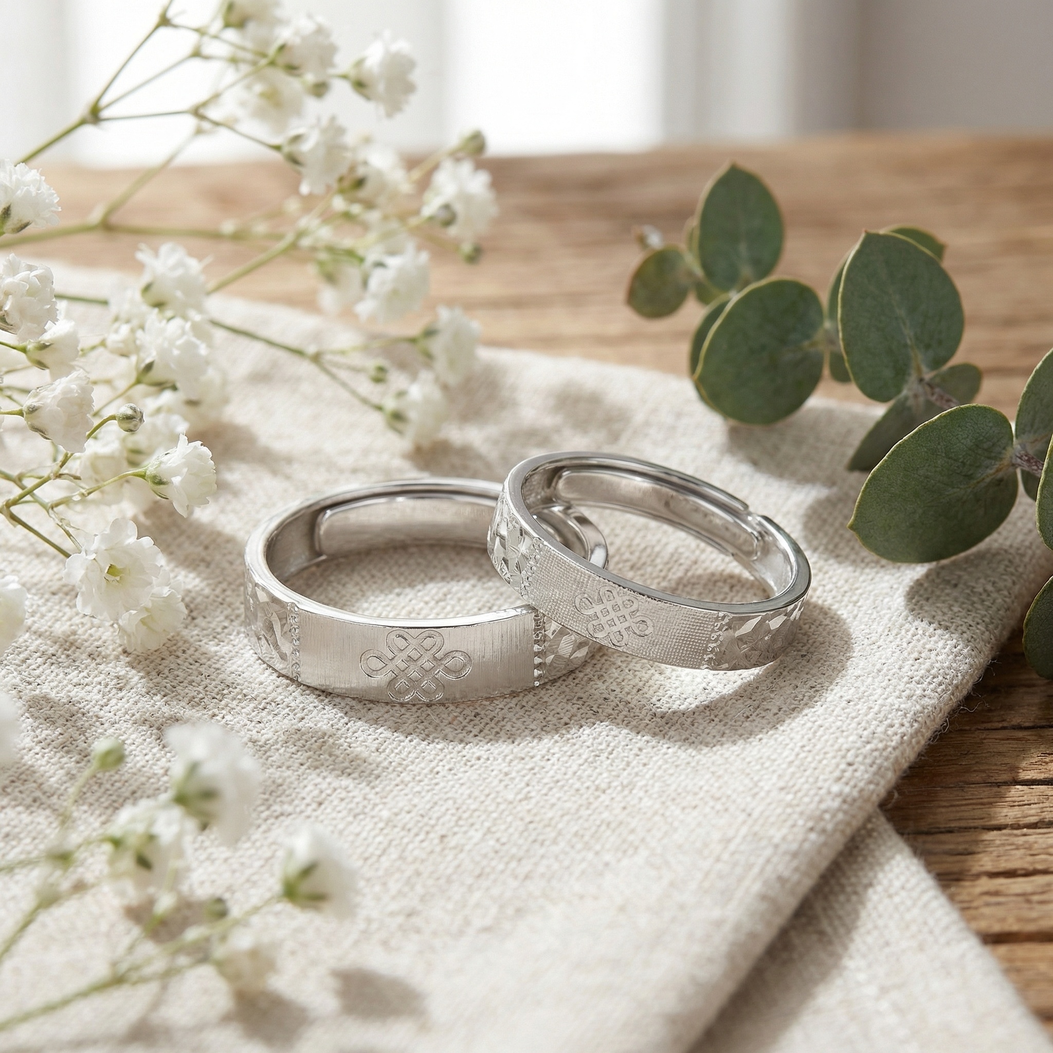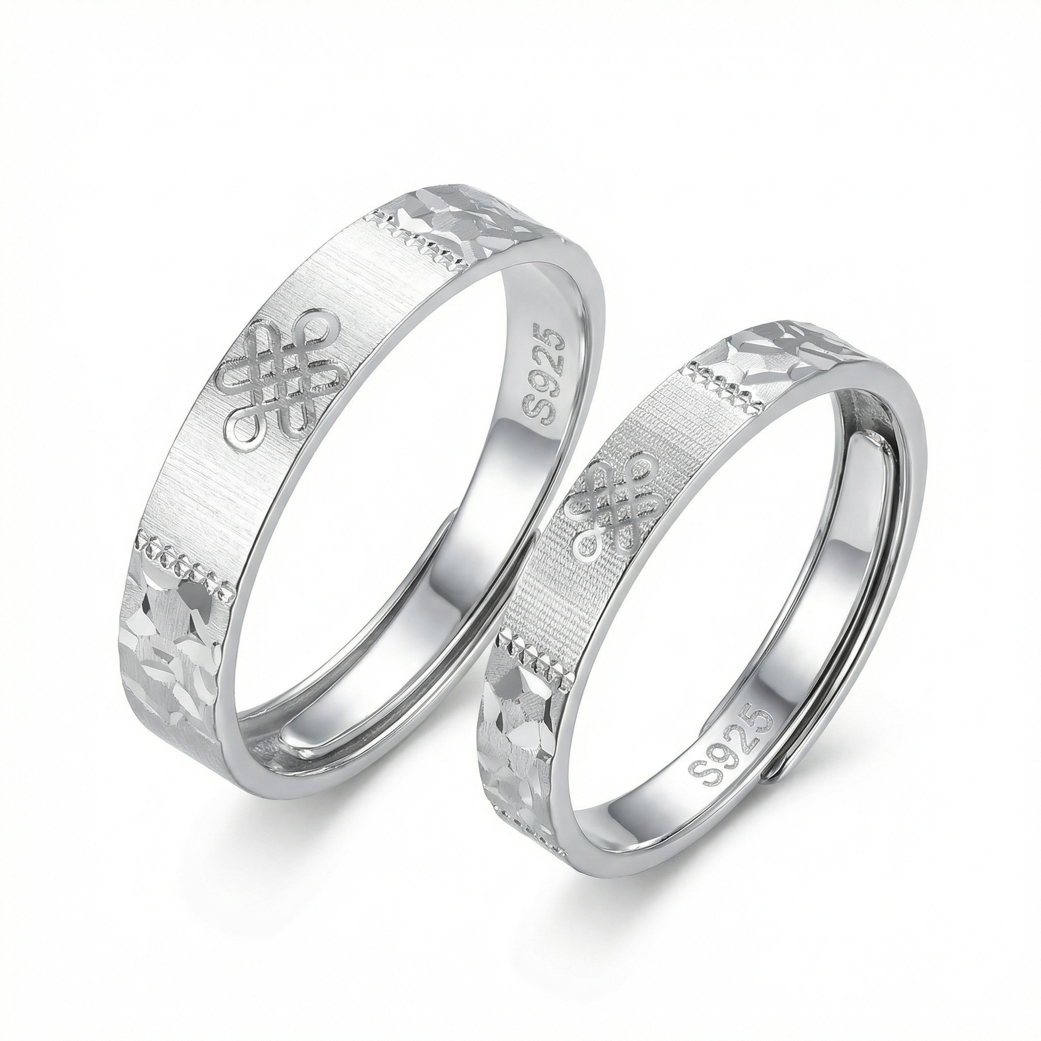 These elegant matching rings are crafted from high-quality S925 sterling silver, ensuring durability and a brilliant shine. The design features a beautifully engraved endless knot, symbolizing eternal love and connection. Each ring showcases a unique combination of a fine brushed matte texture on the central band and a sparkling faceted hammered pattern along the edges, creating a sophisticated contrast. The adjustable open-ended design provides a comfortable, custom fit for any finger size, making them a perfect gift for anniversaries, engagements, or daily wear. Whether as a promise ring or a wedding band set, these pieces offer a timeless and meaningful aesthetic for couples who cherish both style and symbolism. | Brand: jewelryodm