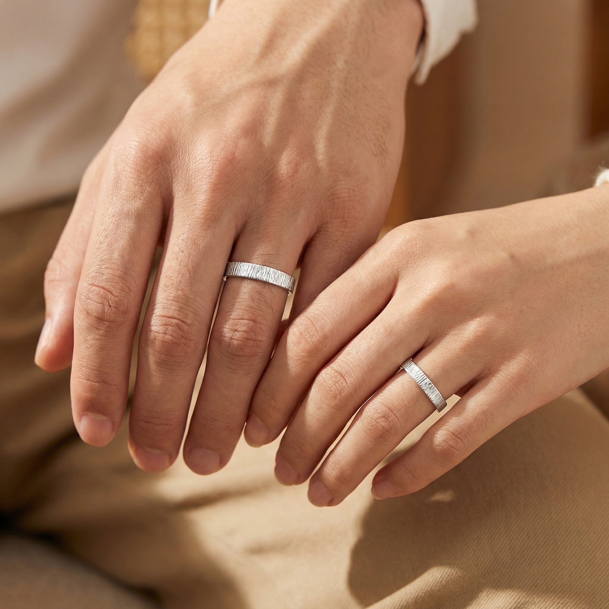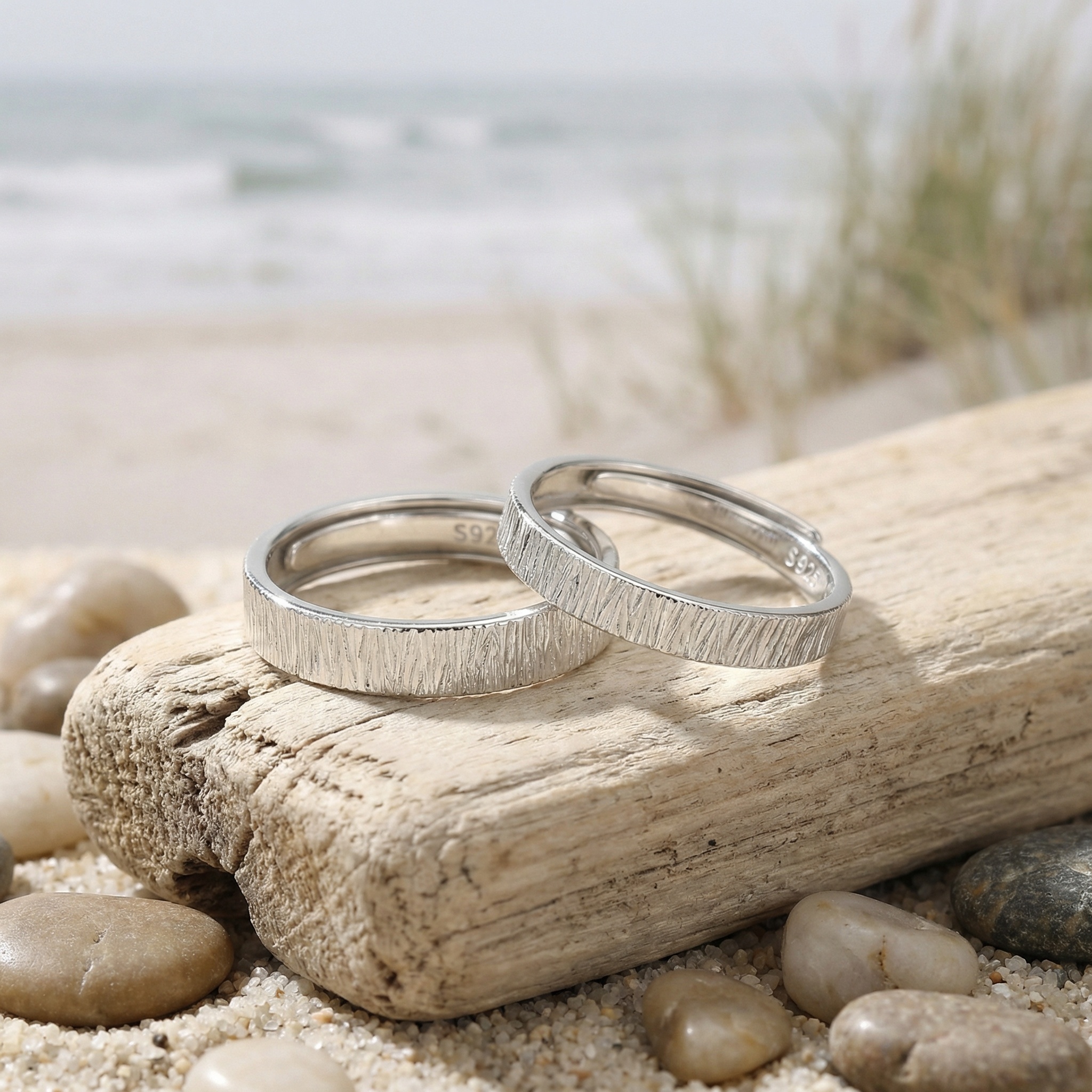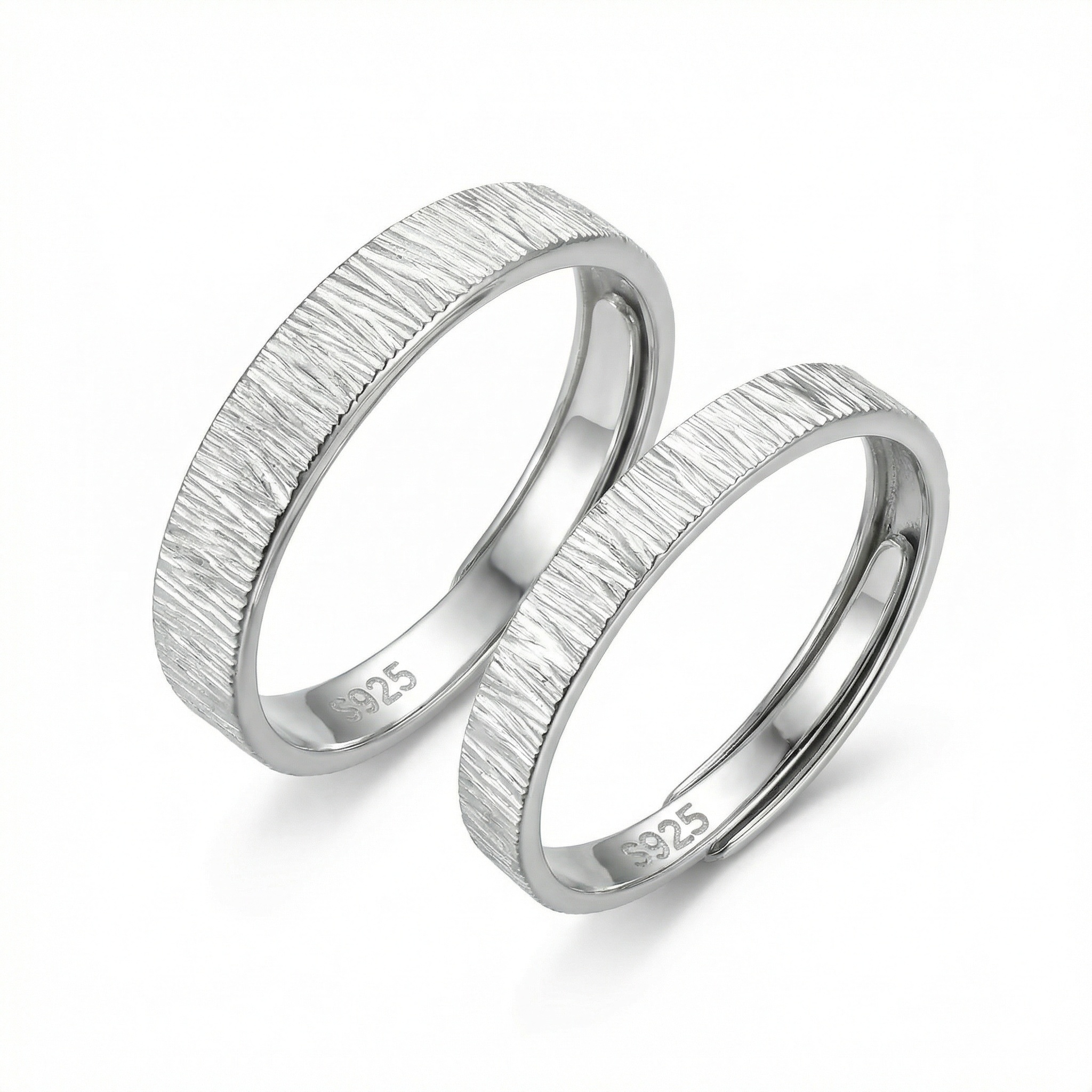 This exquisite pair of matching rings is crafted from high-quality S925 sterling silver, ensuring durability and a brilliant shine. The highlight of these bands is the unique tree bark texture engraved on the exterior, offering an organic, nature-inspired aesthetic that symbolizes growth and strength. Both rings feature an adjustable open-band design, providing a comfortable and flexible fit for various finger sizes without the need for precise sizing. The inside of each band is discreetly stamped with "S925," certifying the authenticity of the precious metal. Elegant yet rustic, this couple's set serves as a perfect romantic gift for anniversaries, engagements, or special occasions, celebrating a bond as enduring and natural as the forest. | Brand: jewelryodm