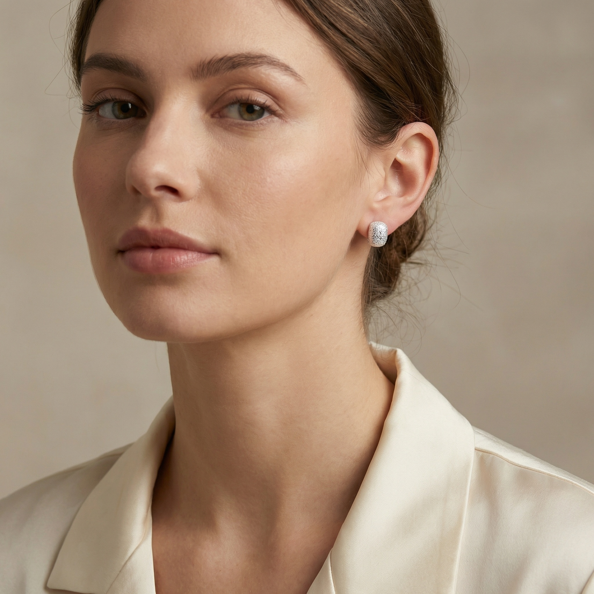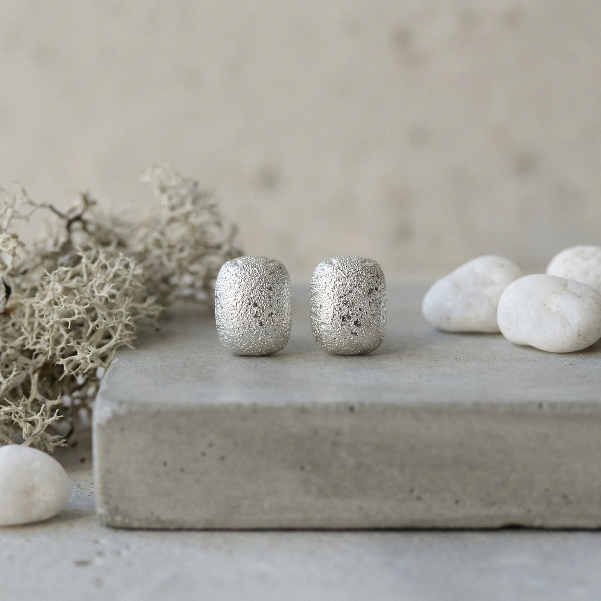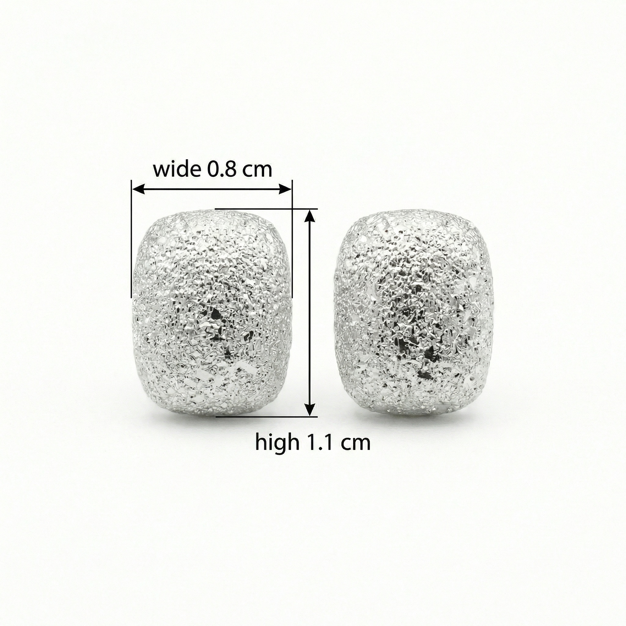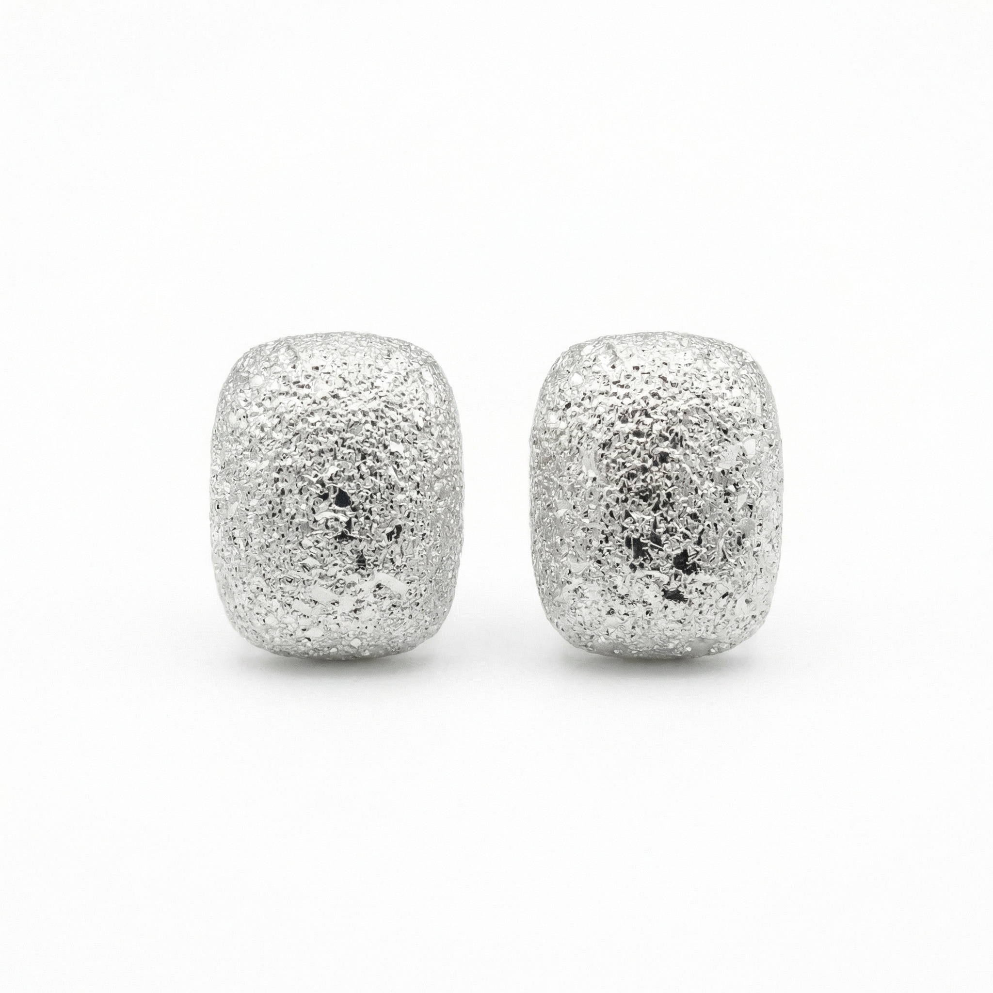 These elegant stud earrings feature a unique "stardust" or frosted texture that catches the light from every angle, creating a shimmering effect. Crafted in a modern cushion-rectangular shape, they offer a sophisticated take on minimalist jewelry. The bright silver-toned finish provides a versatile look, making them suitable for both everyday wear and special occasions. Lightweight and stylish, these earrings add a subtle touch of glamour and tactile interest to any ensemble. | Brand: jewelryodm