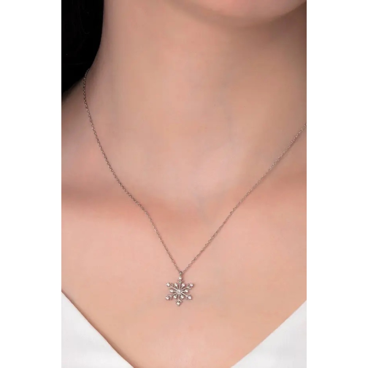 This product features a 925 sterling silver chain with a white stone snowflake pendant.