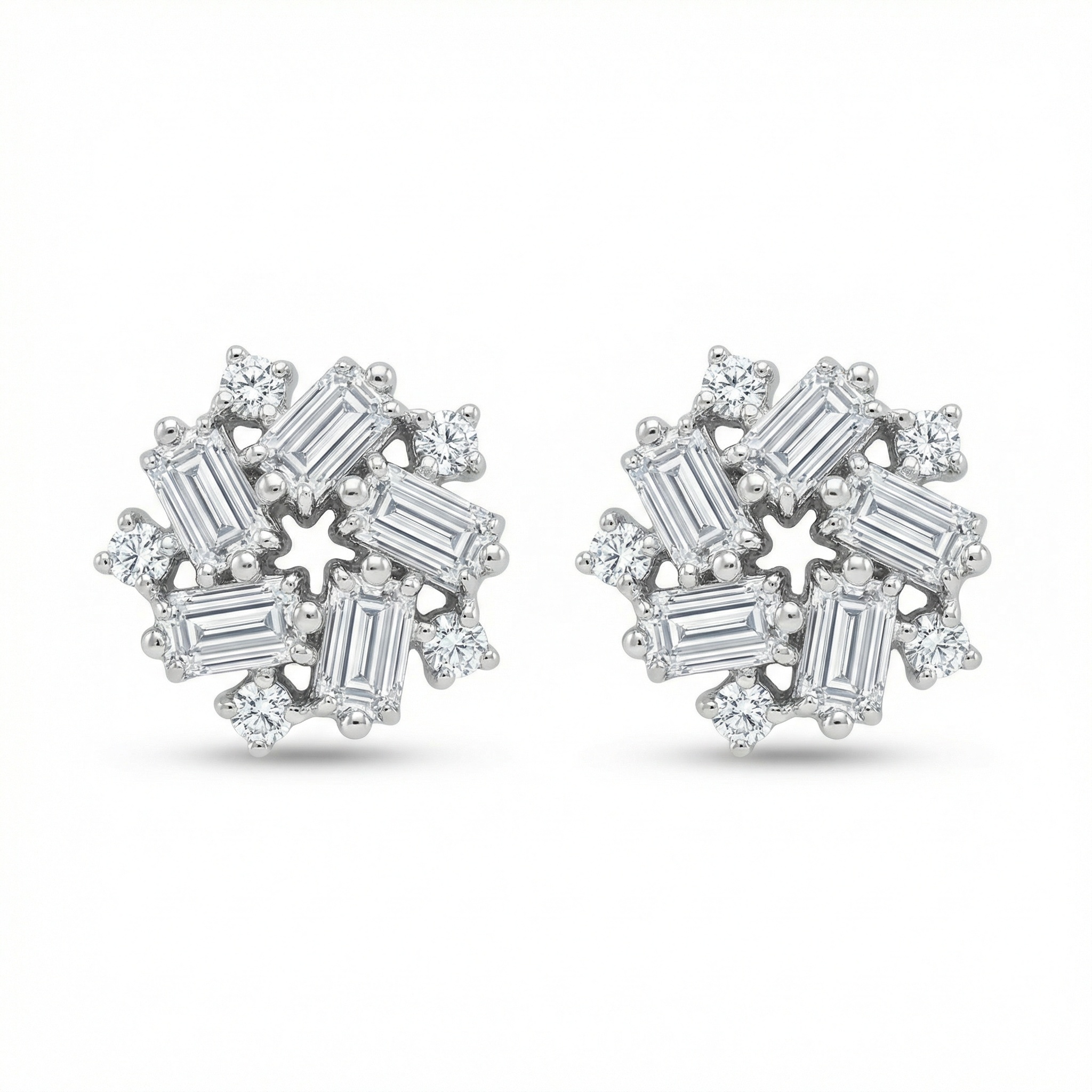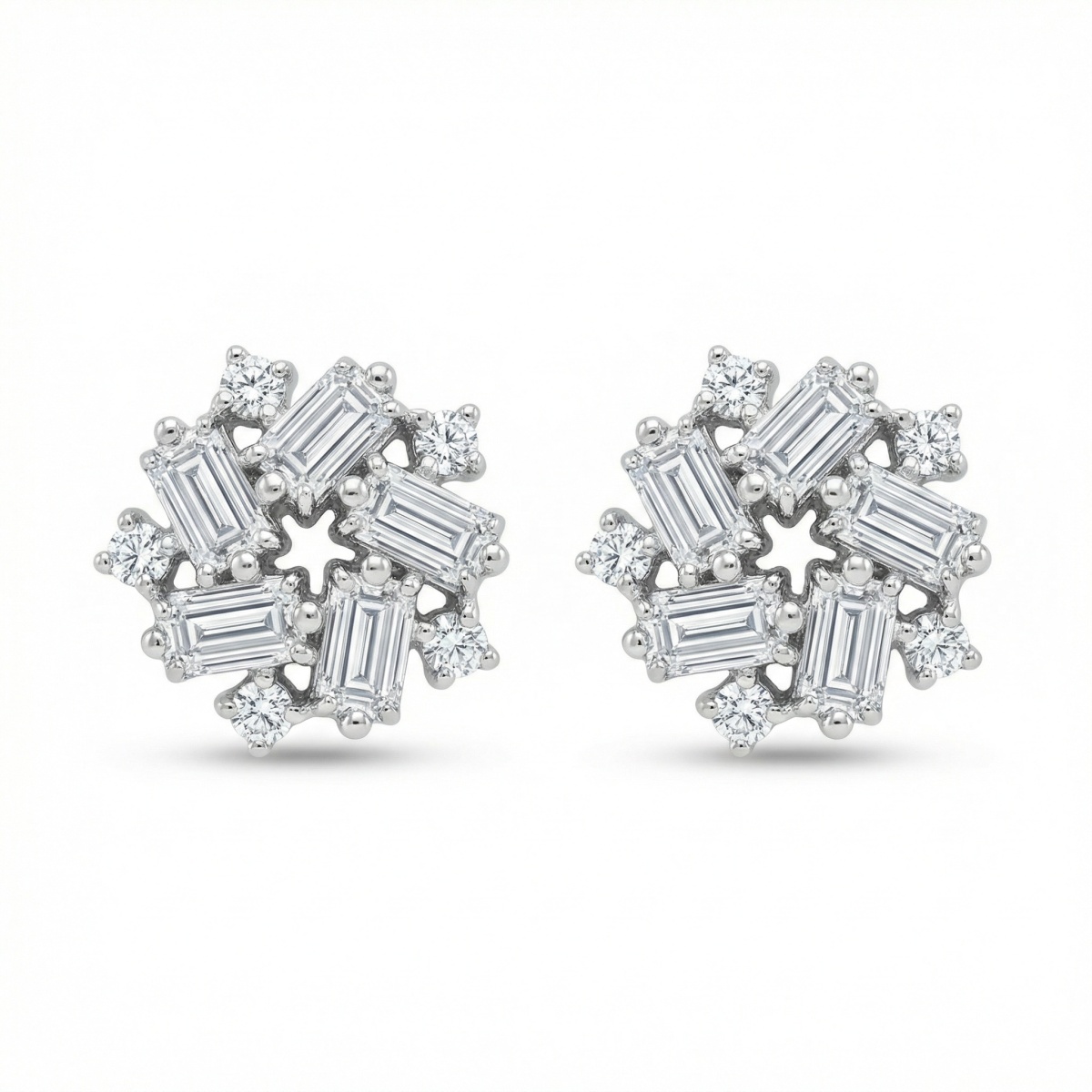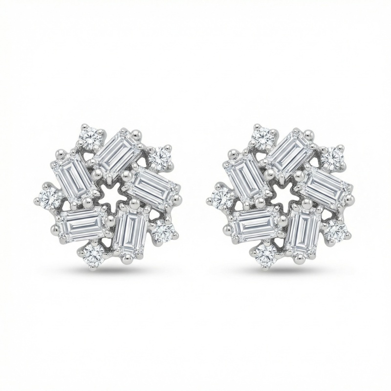 This exquisite pair of stud earrings features a sophisticated snowflake-inspired design, meticulously crafted to catch the light from every angle. Each earring showcases a central arrangement of five baguette-cut diamonds set in a striking pinwheel formation, surrounding a delicate open-star center. Enhancing the brilliance, shimmering round-cut diamonds are strategically placed between the baguettes and along the outer edges, creating a multi-dimensional starburst effect. Set in a lustrous white metal, these earrings offer a seamless blend of modern elegance and timeless charm. The unique combination of geometric baguette cuts and classic round brilliants provides exceptional texture and extraordinary fire. Perfect for adding a touch of glamour to any ensemble, these versatile cluster studs are an ideal choice for weddings, special anniversaries, or as a luxurious everyday statement piece that exudes refinement and grace. | Brand: jewelryodm