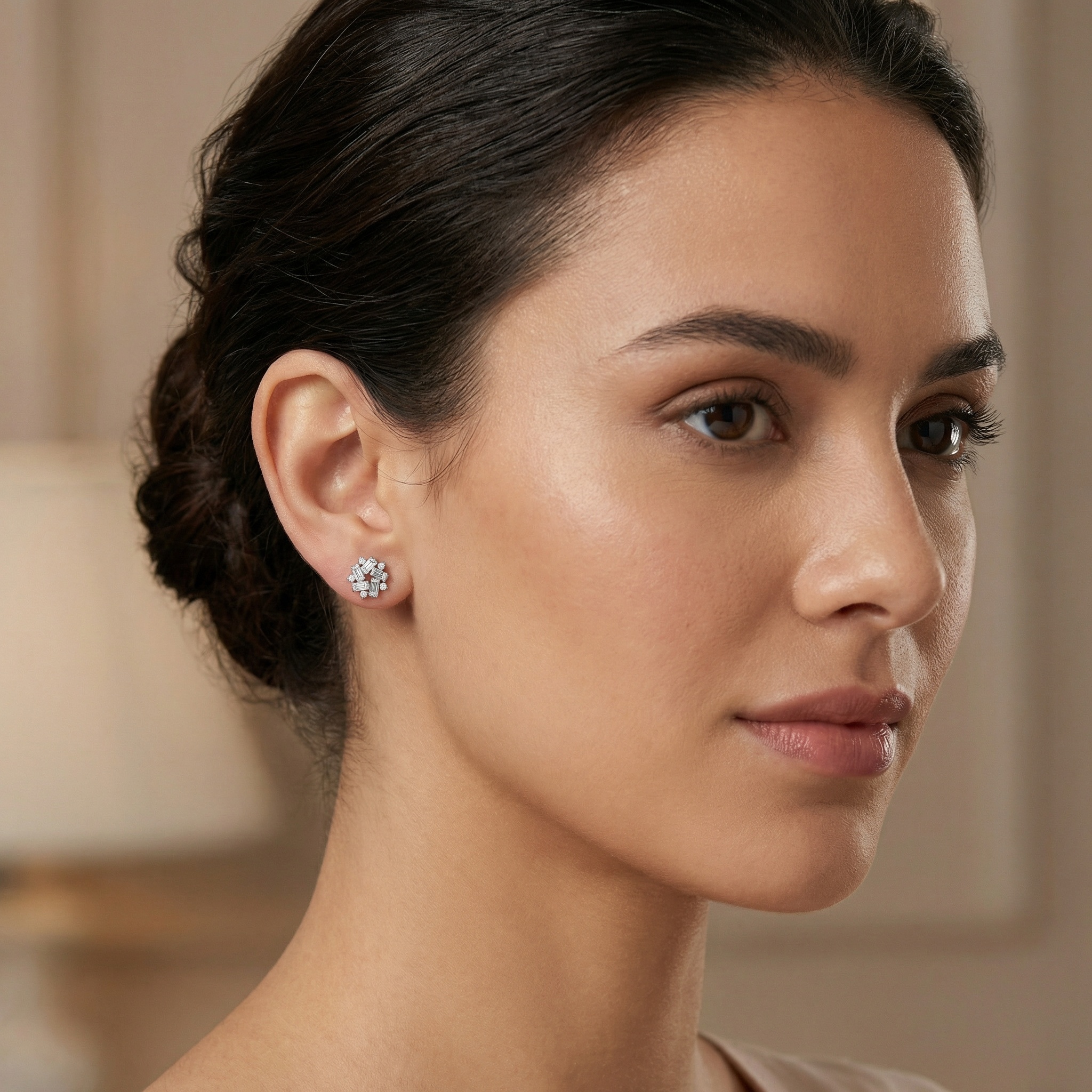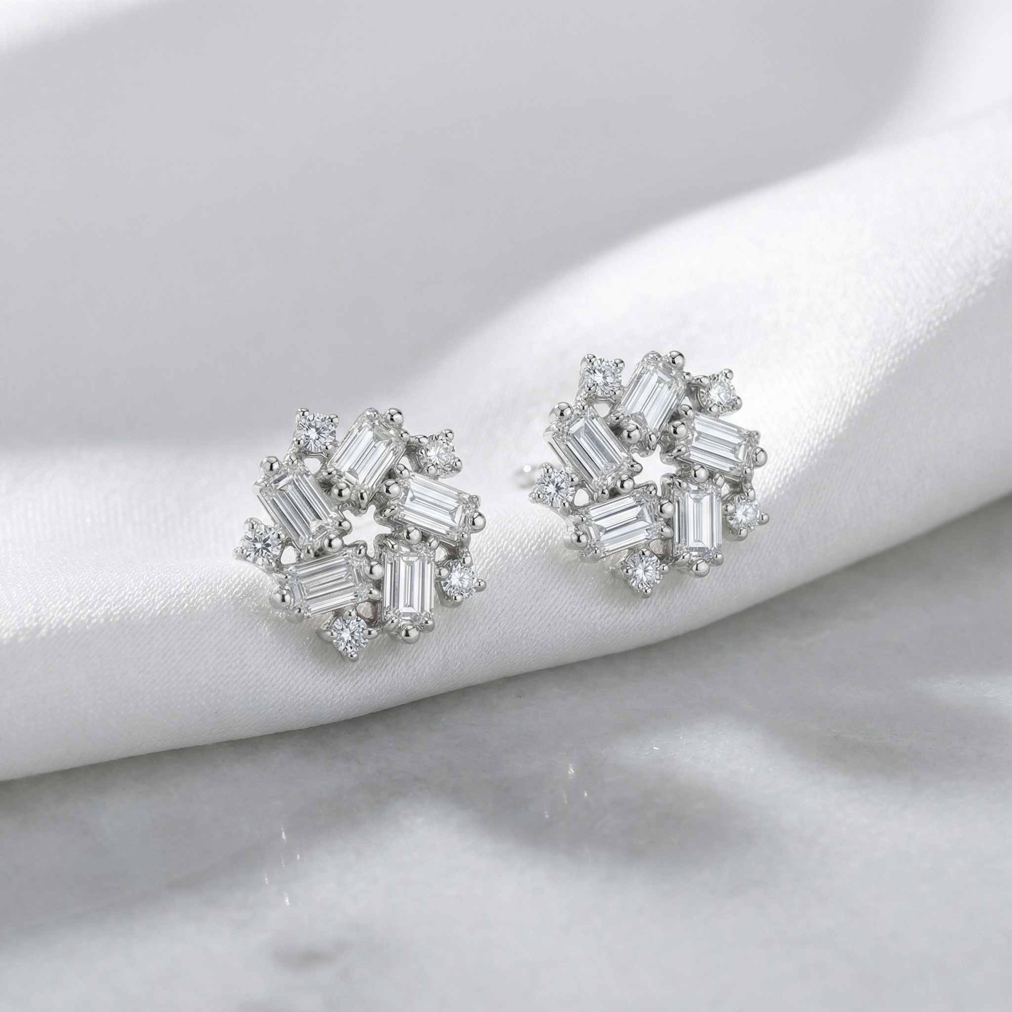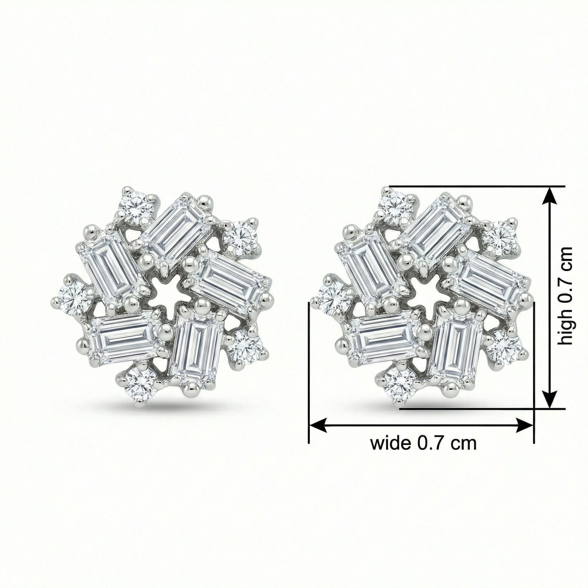 This exquisite pair of stud earrings features a sophisticated snowflake-inspired design, meticulously crafted to catch the light from every angle. Each earring showcases a central arrangement of five baguette-cut diamonds set in a striking pinwheel formation, surrounding a delicate open-star center. Enhancing the brilliance, shimmering round-cut diamonds are strategically placed between the baguettes and along the outer edges, creating a multi-dimensional starburst effect. Set in a lustrous white metal, these earrings offer a seamless blend of modern elegance and timeless charm. The unique combination of geometric baguette cuts and classic round brilliants provides exceptional texture and extraordinary fire. Perfect for adding a touch of glamour to any ensemble, these versatile cluster studs are an ideal choice for weddings, special anniversaries, or as a luxurious everyday statement piece that exudes refinement and grace. | Brand: jewelryodm