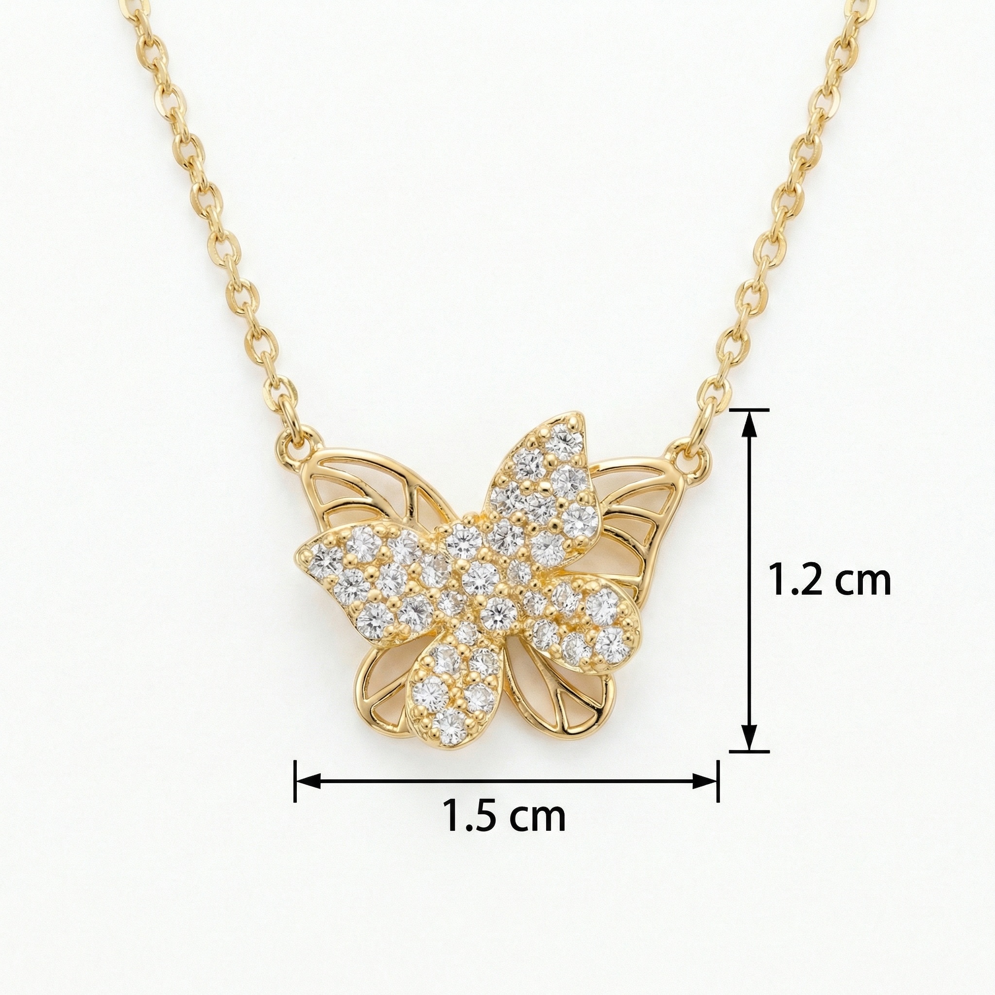This exquisite necklace features a beautifully crafted butterfly pendant that captures the essence of grace and nature. The butterfly wings are detailed with a mix of intricate cut-outs and shimmering pavé-set crystals, designed to catch and reflect light brilliantly. Suspended on a classic cable chain, the pendant sits elegantly against the skin. Its lustrous yellow finish enhances the sparkle of the stones, making it a perfect accessory for both casual and formal attire. Symbolizing transformation and freedom, this butterfly piece is a thoughtful gift for a loved one or a sophisticated addition to your personal jewelry collection. The meticulous attention to detail ensures a high-end look that remains timeless and versatile for years to come. | Brand: jewelryodm