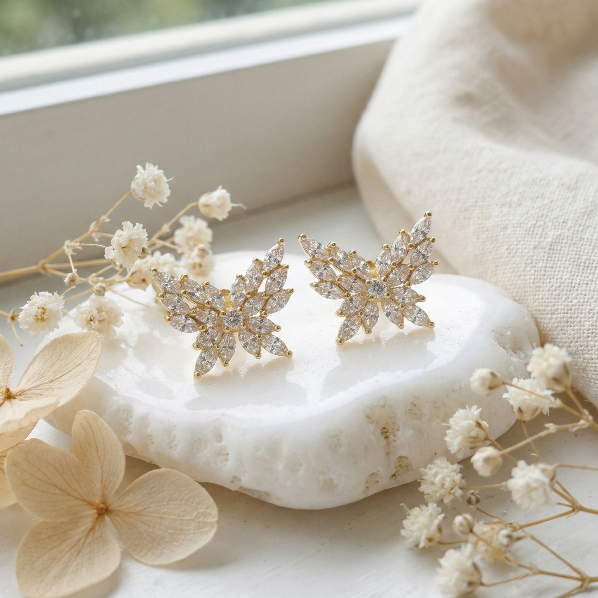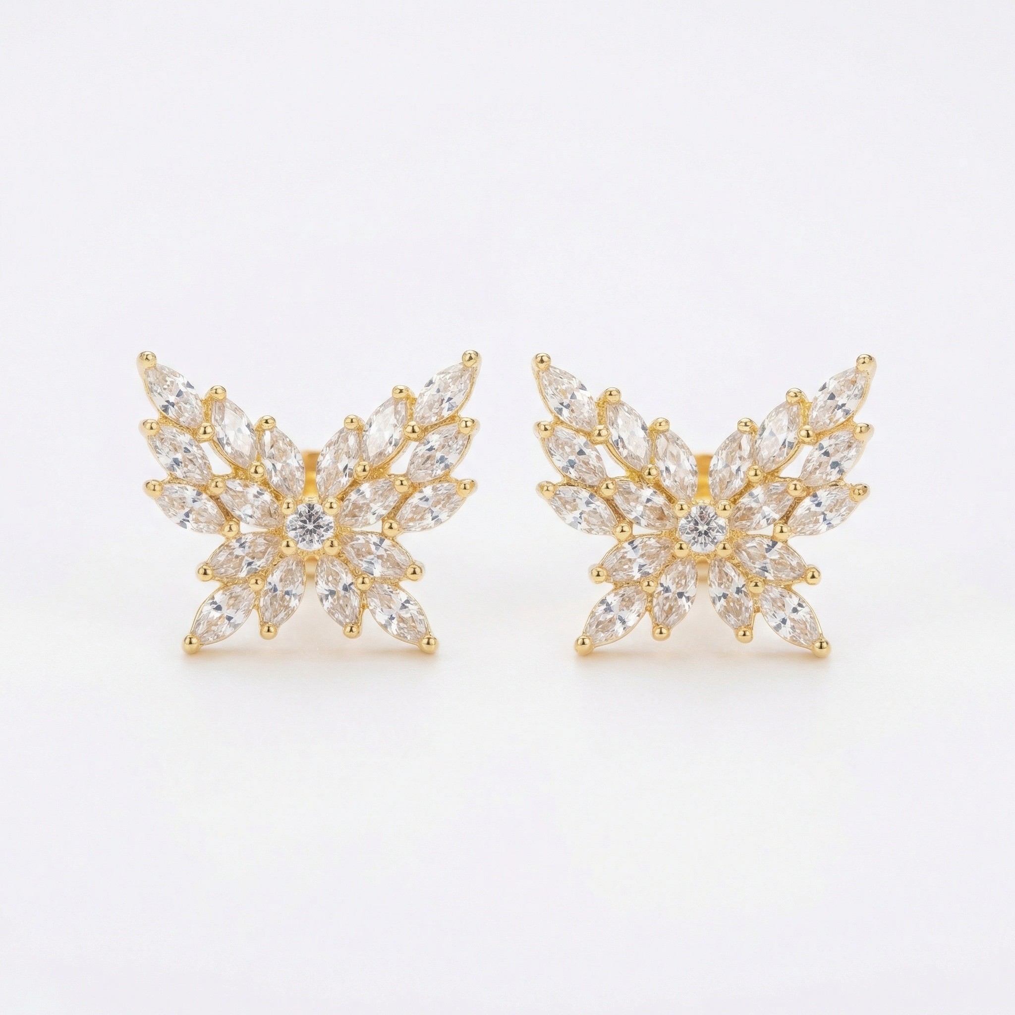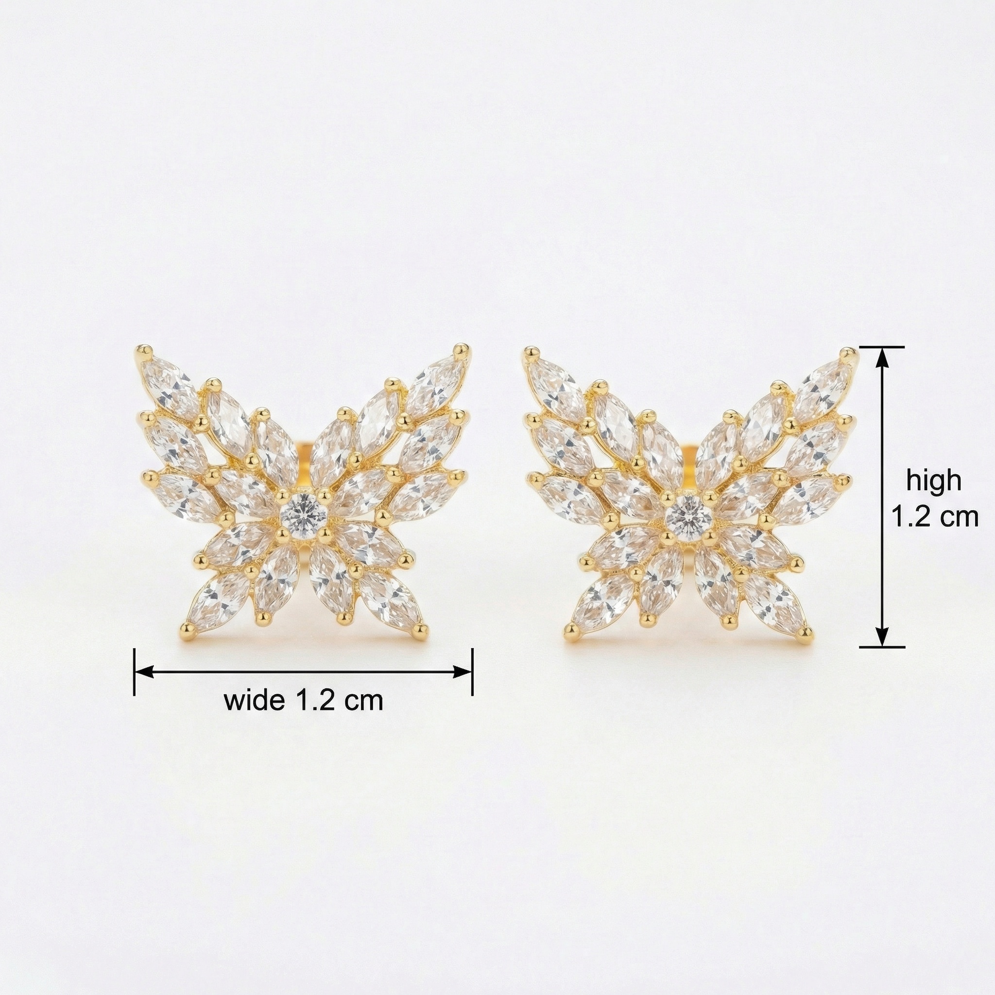 Elevate your jewelry collection with these exquisite butterfly stud earrings. Each piece is meticulously crafted to resemble a delicate butterfly in flight, featuring a series of brilliant marquise-cut gemstones that form the intricate wing patterns. A singular round-cut stone serves as the shimmering heart of the design, catching the light from every angle. Set in a lustrous yellow-toned metallic finish, these earrings offer a timeless appeal that blends nature-inspired whimsy with sophisticated glamour. Perfect for adding a sparkle to your everyday attire or completing a formal look, these lightweight studs provide both comfort and style. Whether treated as a personal indulgence or a thoughtful gift, these enchanting butterfly earrings are sure to become a cherished favorite. | Brand: jewelryodm
