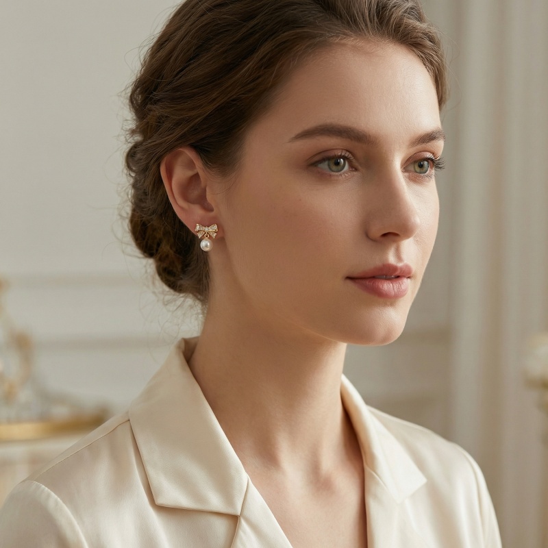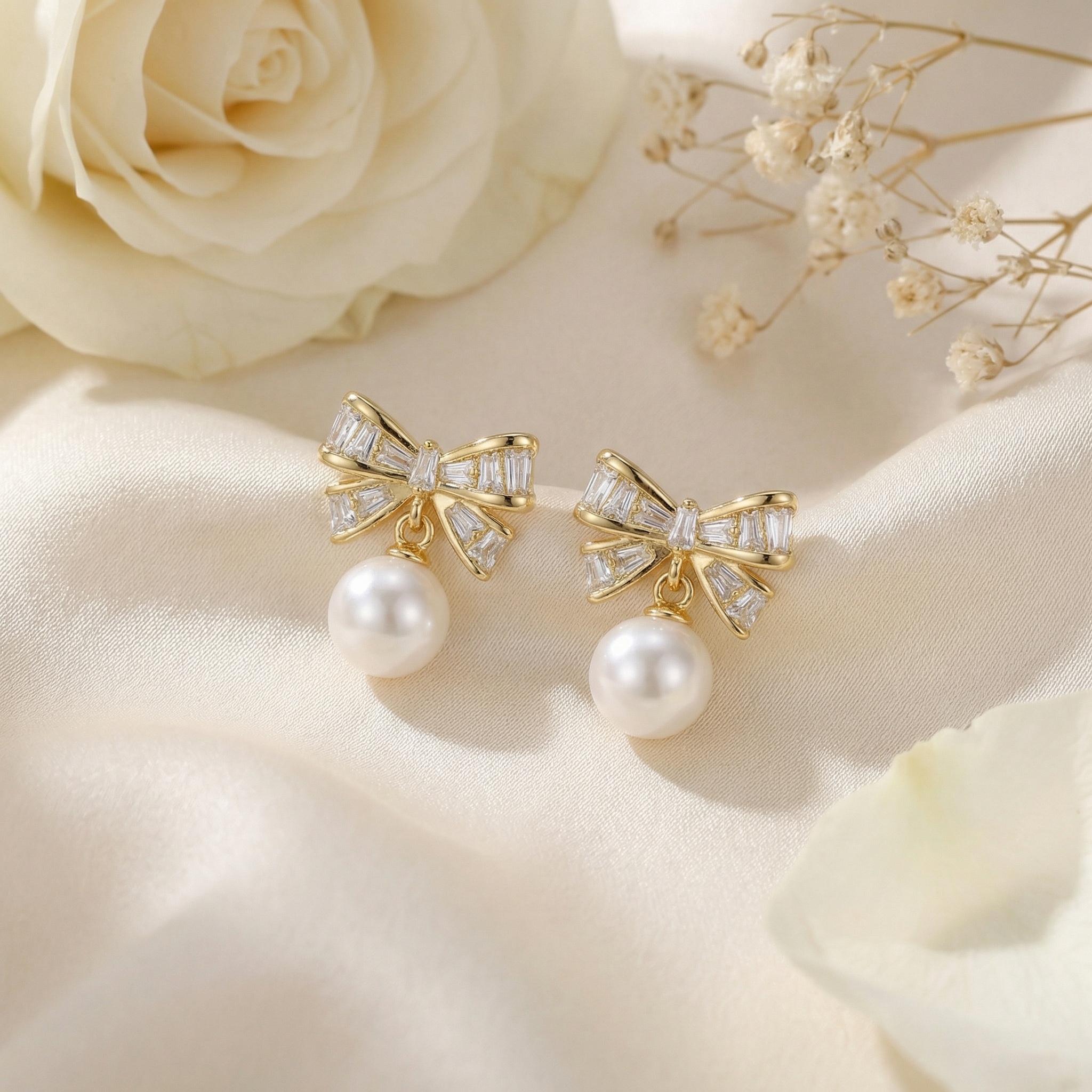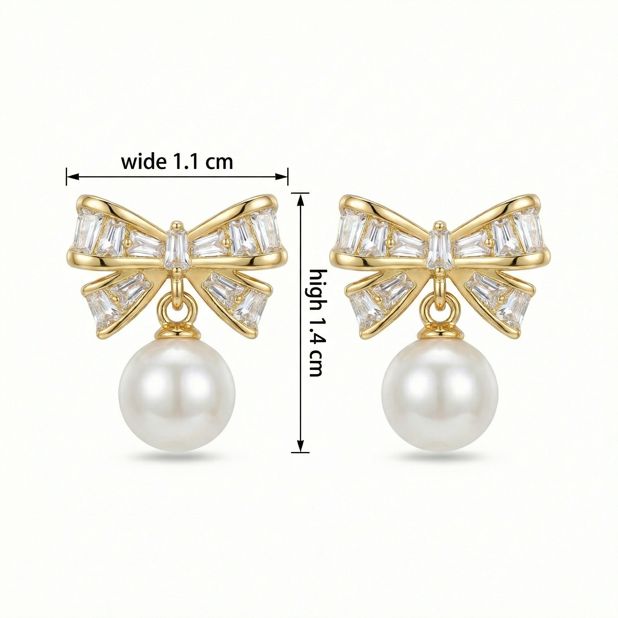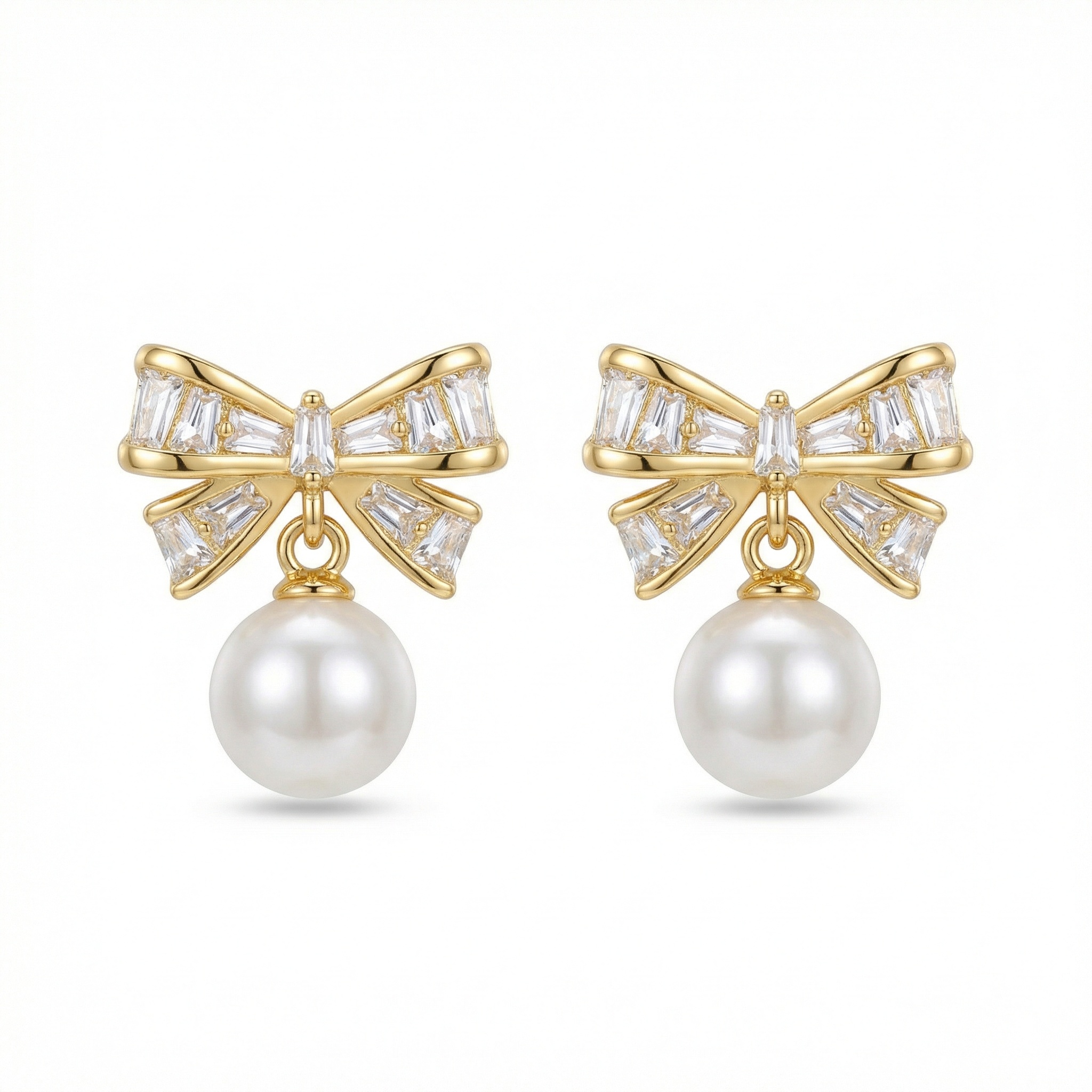 These exquisite earrings feature a charming bow design meticulously set with shimmering baguette-cut crystals that capture light from every angle. At the heart of each ribbon sits a single baguette stone, adding a touch of refined brilliance. Hanging gracefully from the center of each bow is a single, perfectly round white pearl with a luminous sheen. The warm-toned metallic finish beautifully complements the icy sparkle of the crystals and the soft glow of the pearls. Combining classic femininity with modern sophistication, these dangle earrings are the perfect accessory for weddings, special occasions, or adding a touch of glamour to your evening attire. Lightweight and comfortable for all-day wear, they make a stunning gift for someone special or a timeless addition to your own jewelry collection. | Brand: jewelryodm